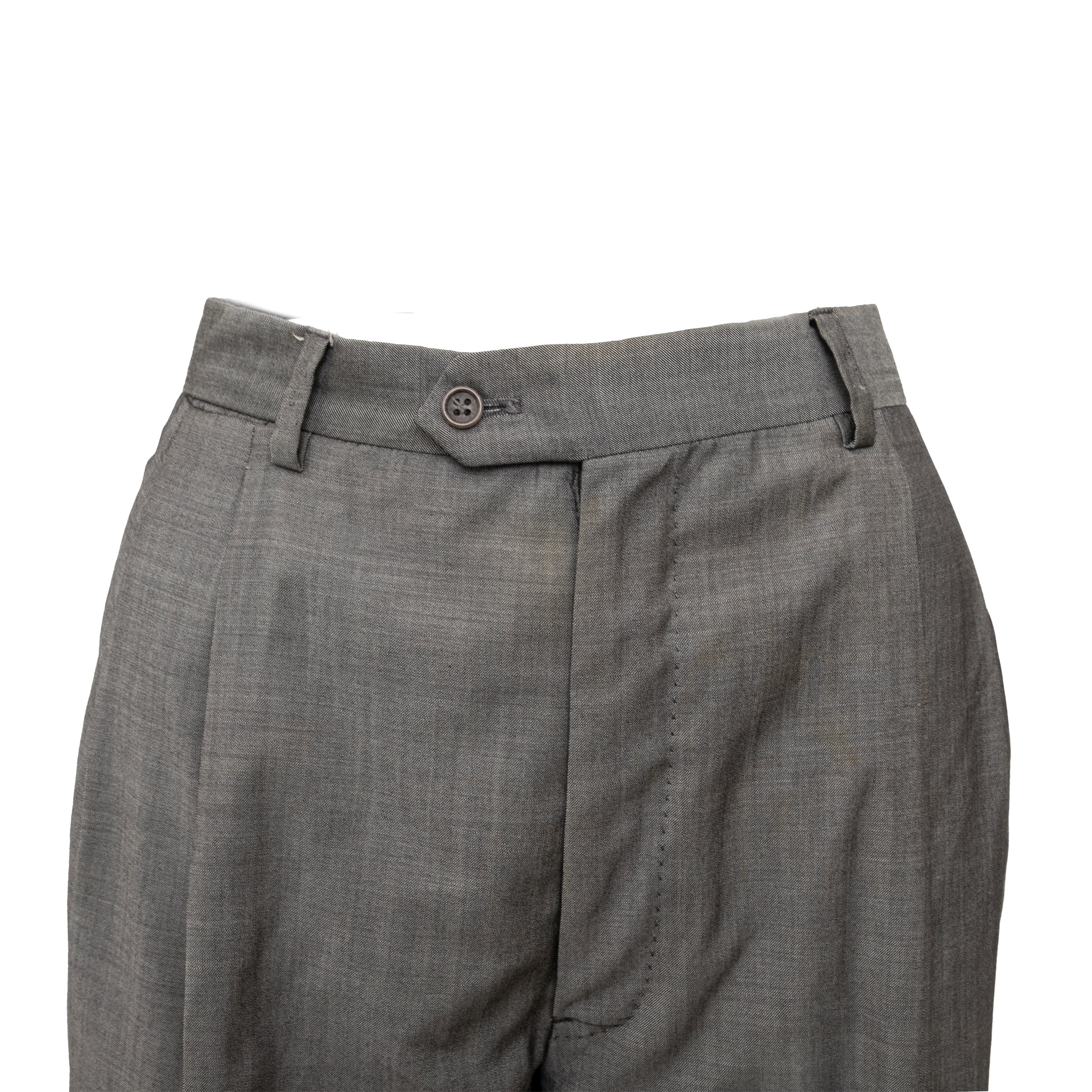 Crafted from premium Super 120 wool, these light grey tailored pants feature a tab and button closure for a personalized silhouette.