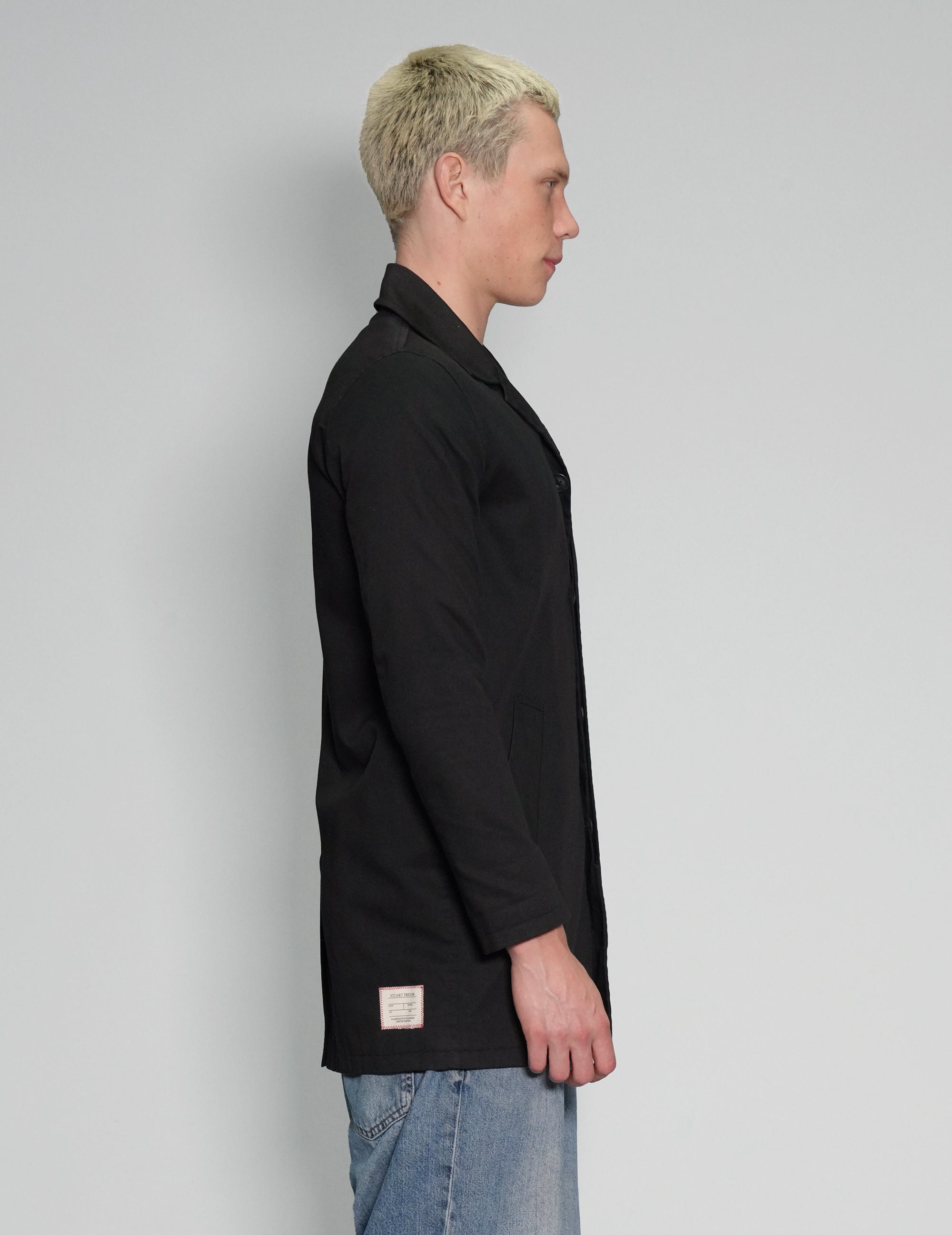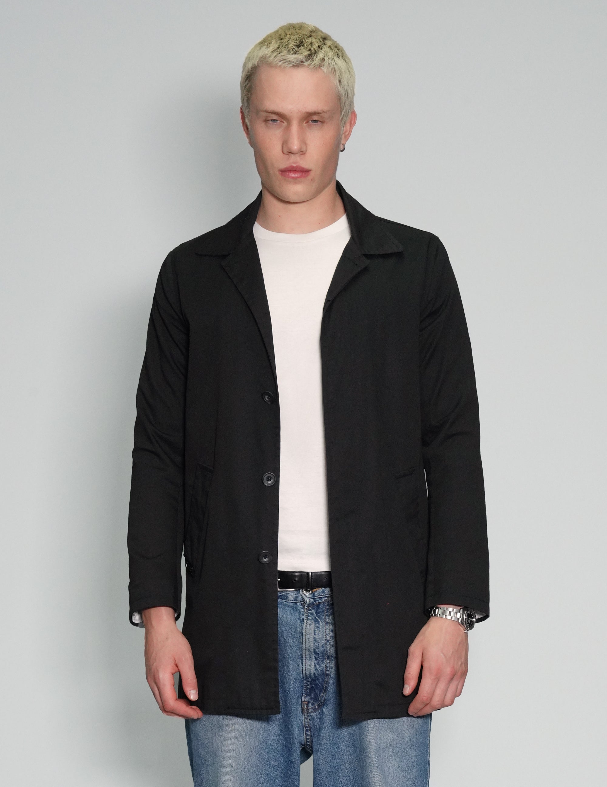 Black vintage Bolongaro Trevor macintosh in black. 100% cotton. Inside breast pocket, slit hip pockets and button fastened front. Bolongaro Trevor is the former brand by Stuart Trevor, having sold it in 2017.