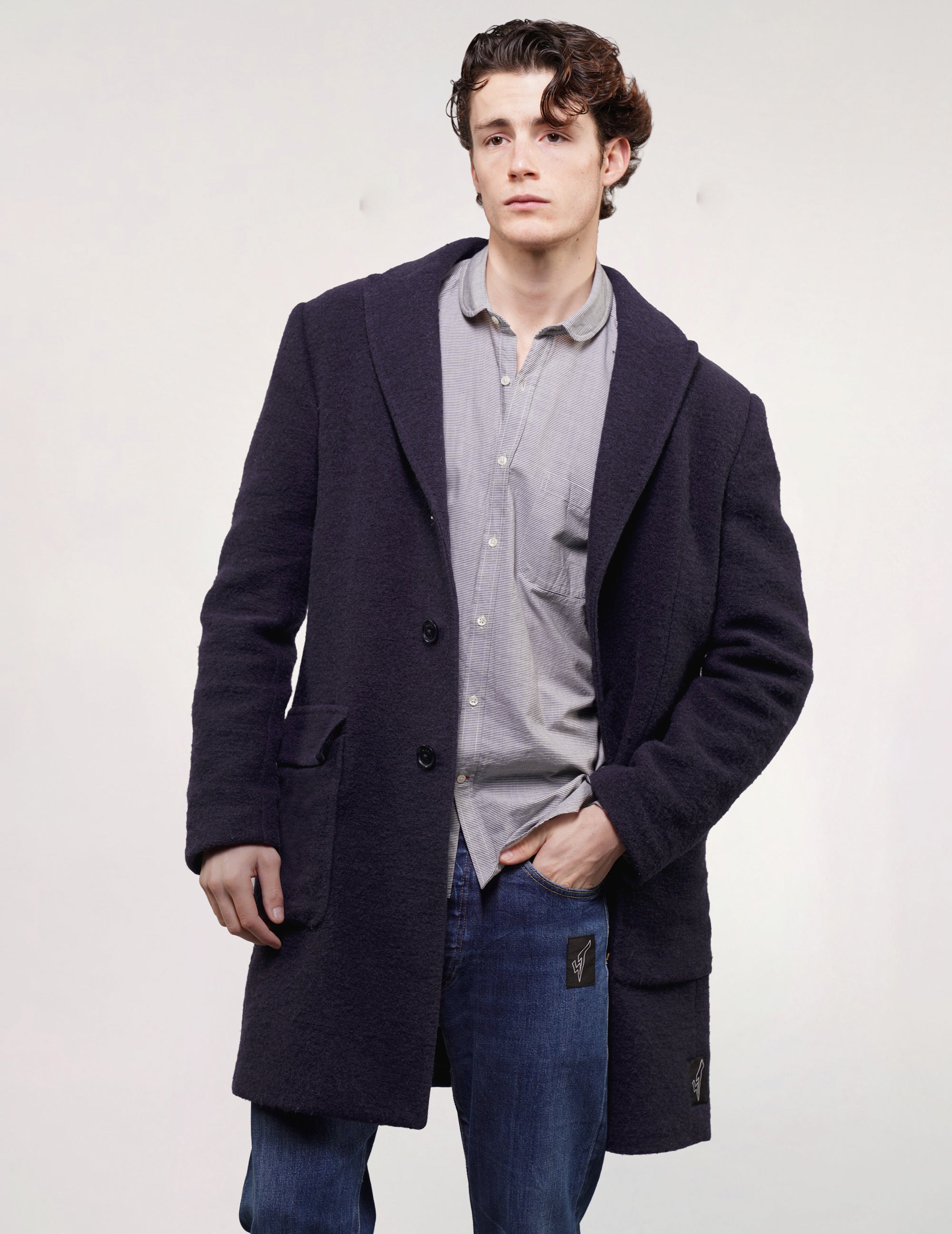 Nigel Hall navy blue single breasted overcoat, composed of the finest wool fabric made in Italy by IN. TES. PRA. Features two large front pockets and navy blue Nigel Hall buttons. Perfect for a sophisticated, tailored look.