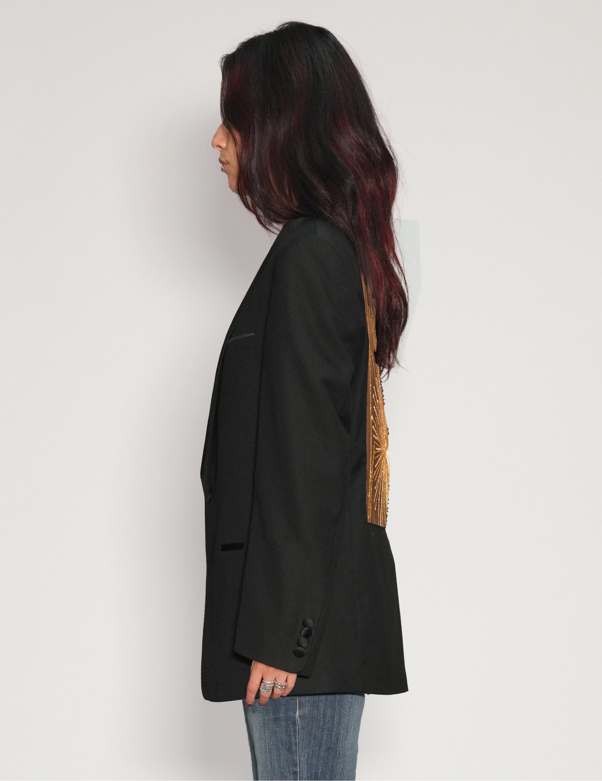 Vintage Tuxedo, customised with ST's iconic, sheer, gold sequin party back.
