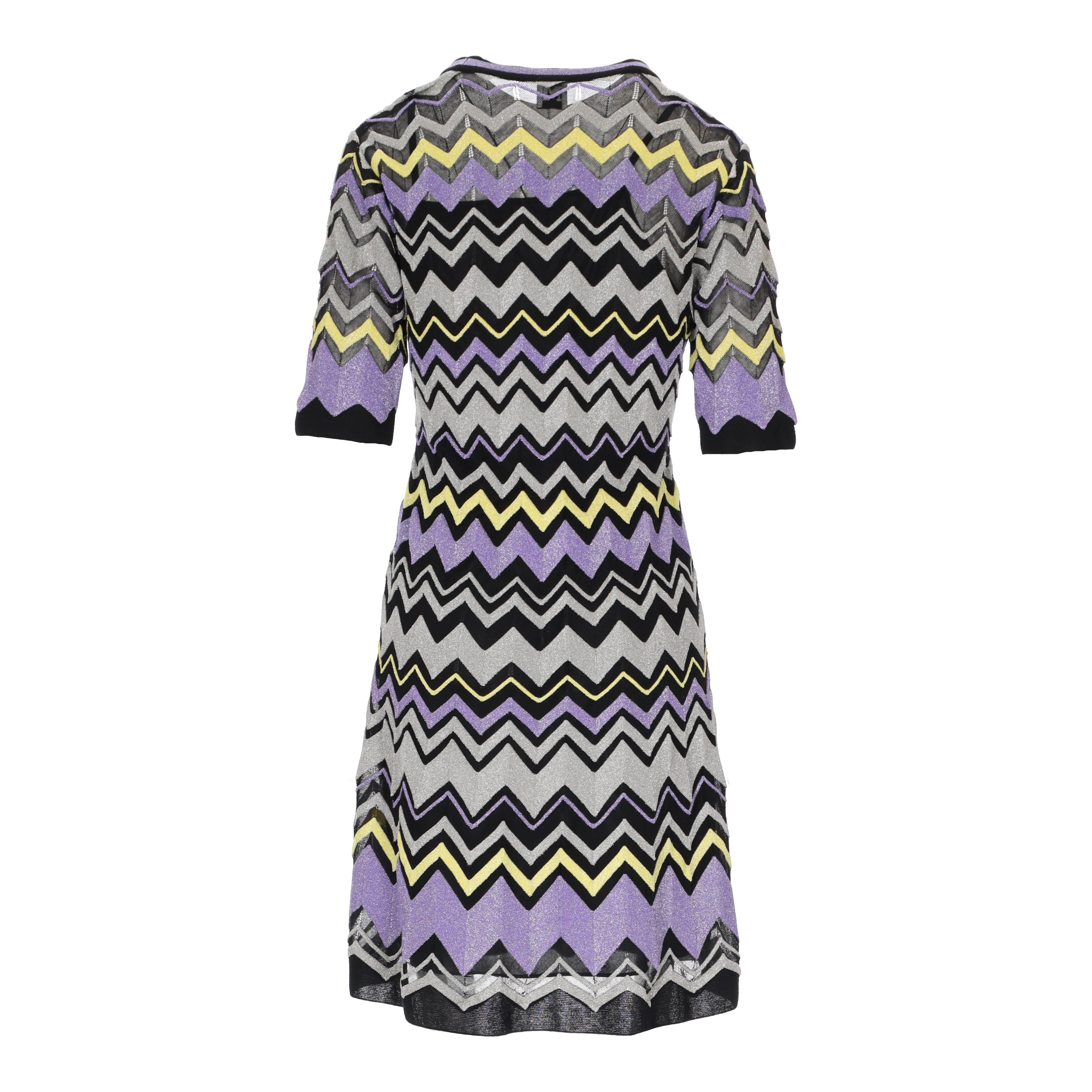 This Missoni chevron dress from the 2000s features the iconic chevron pattern in a bold purple, yellow and grey mix with added shimmer for an eye-catching look. With a black slip-on lining inside, the fit is classic with short sleeves and a deep crew neck, perfect for pairing with white sneakers or some strappy heels for a modern, chic look.