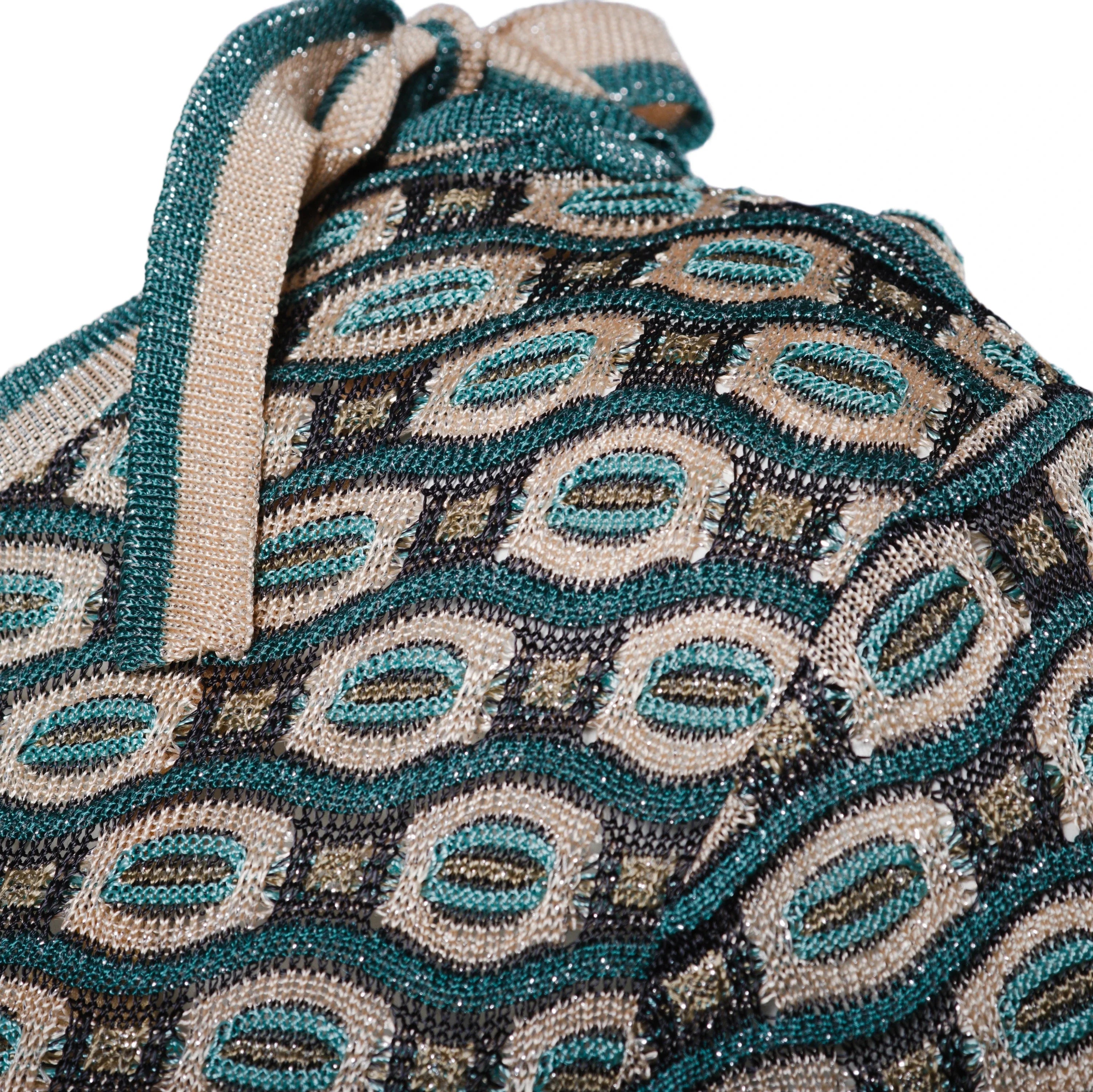 Crafted with the brand’s signature artisanal expertise, this mini dress flatters the figure with its tailored, feminine silhouette. The combination of vibrant green and pastel pink evokes Missoni’s iconic color palette, creating a sophisticated yet playful contrast. This mini dress is a true must-have for those who love to stand out with style and color.