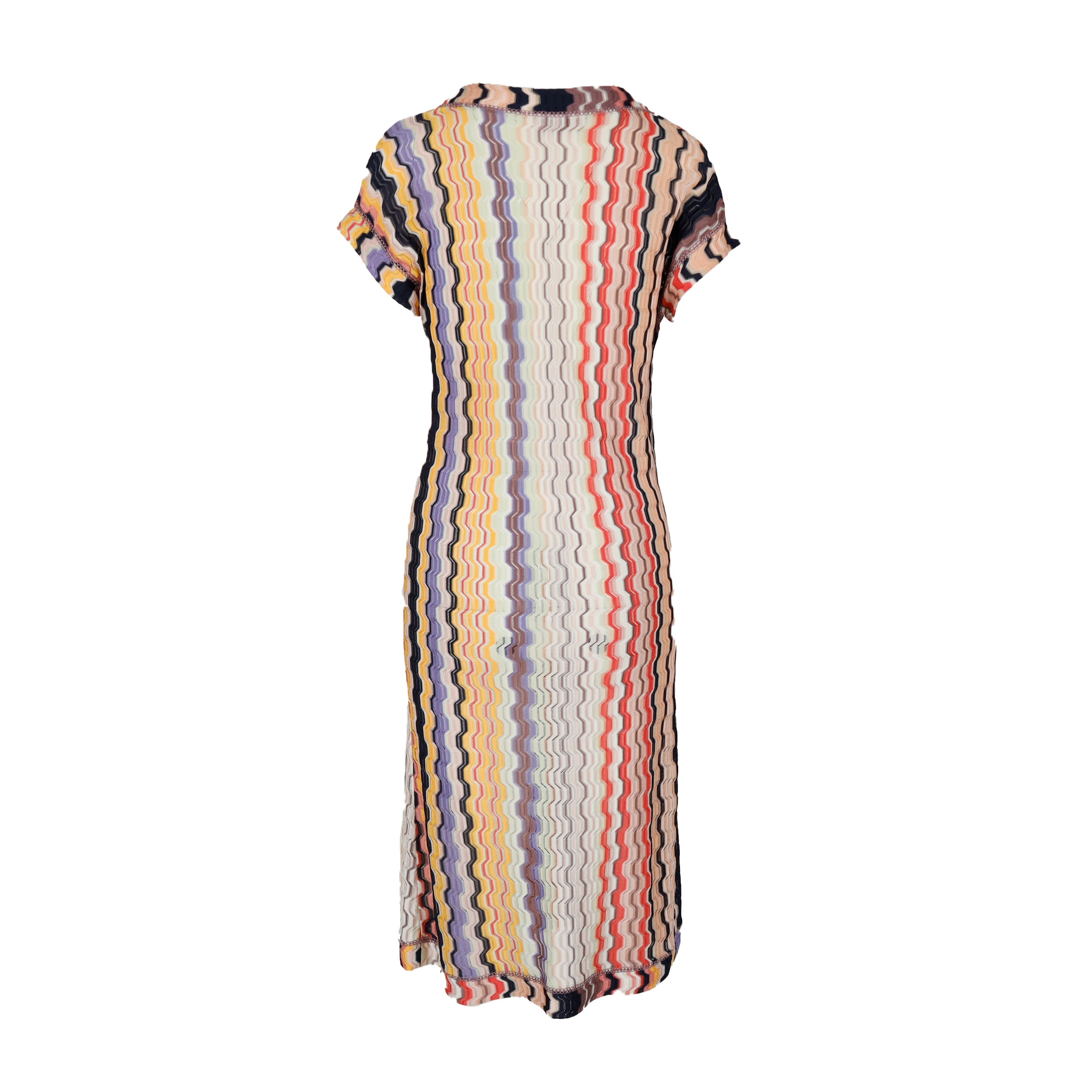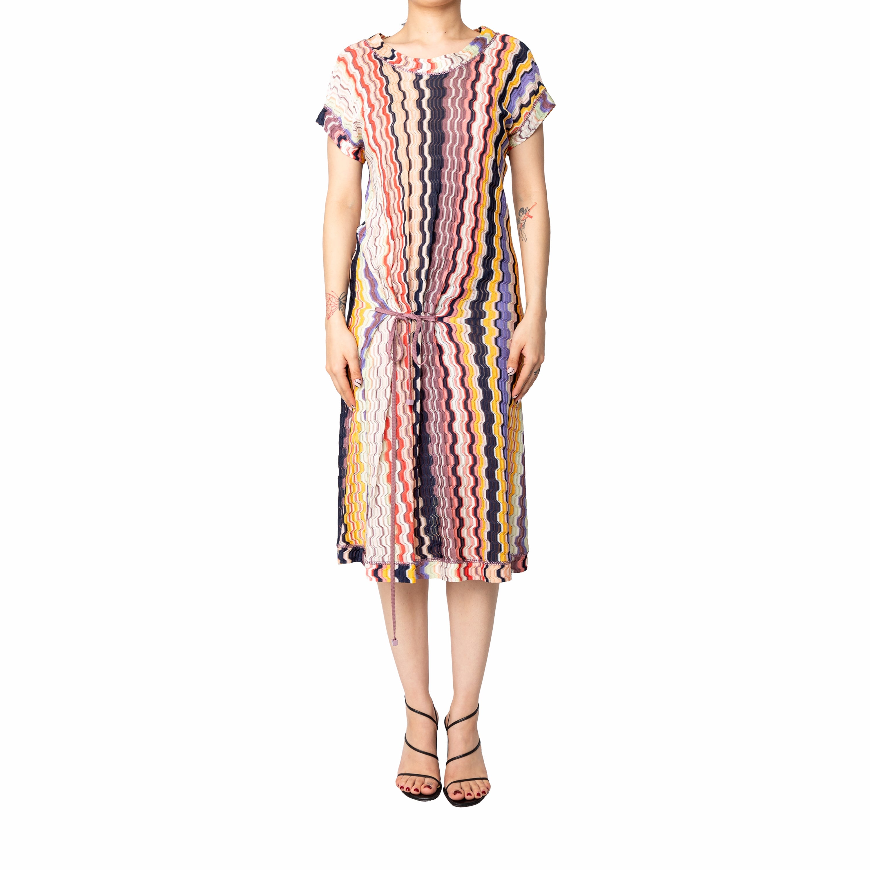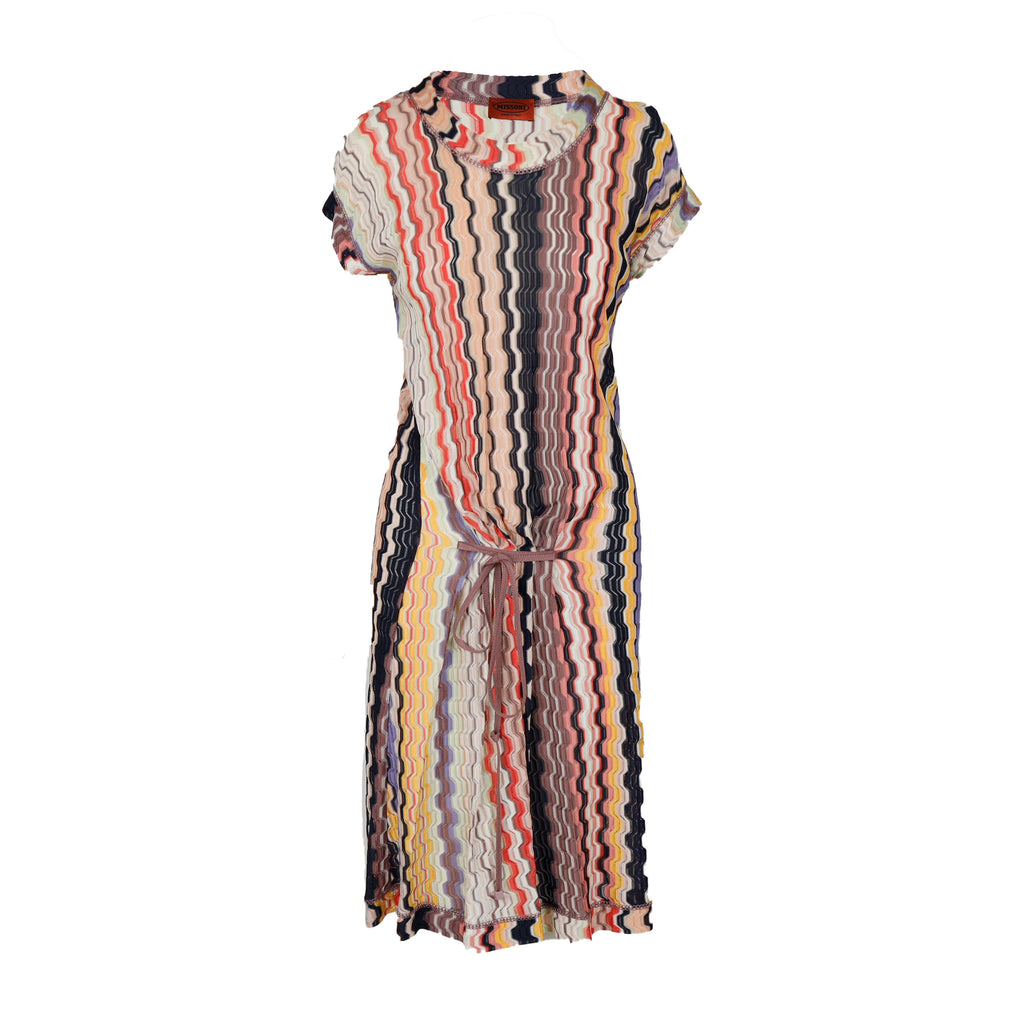 This knee-length dress features Missoni's signature multi-colored pattern, a relaxed-fit with a short sleeve that falls over the shoulder. A tie knot on the waist gives a custom fit making it a comfortable yet stylish choice for the summer.