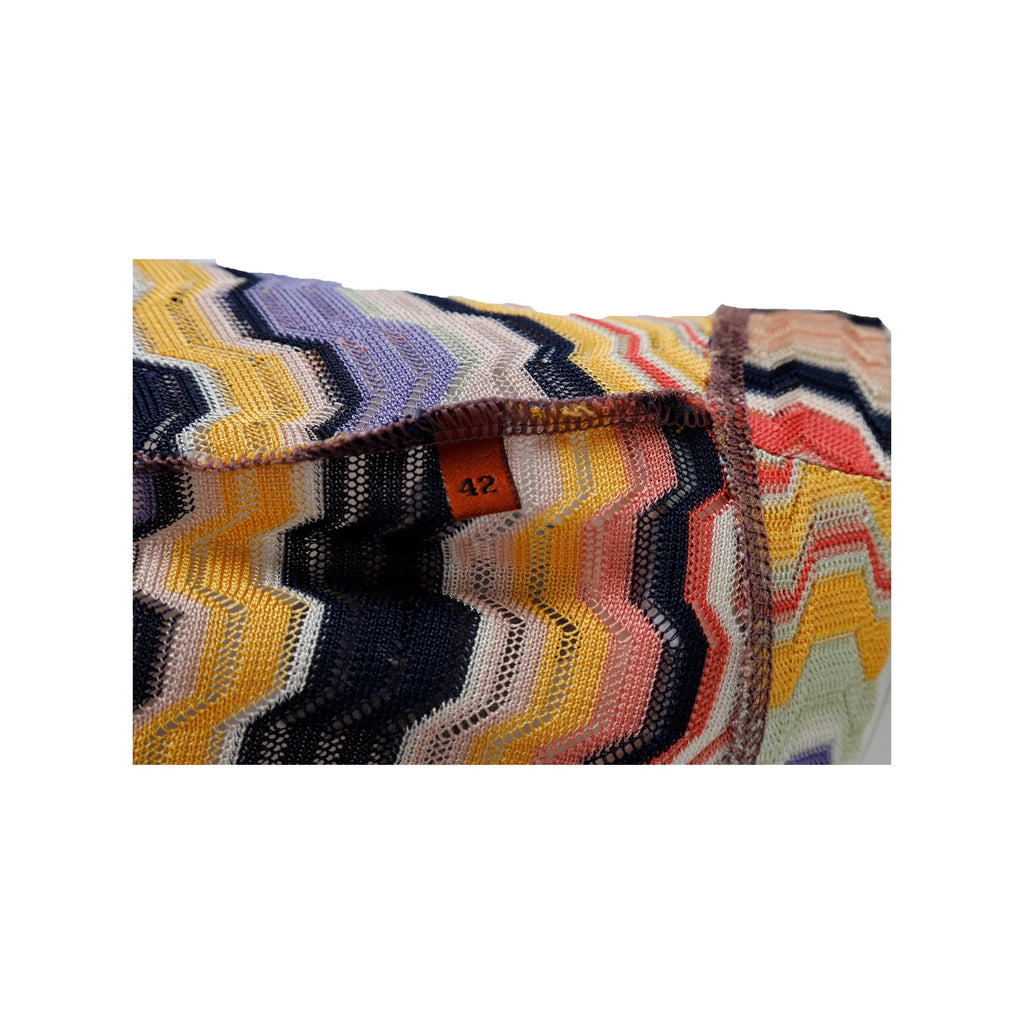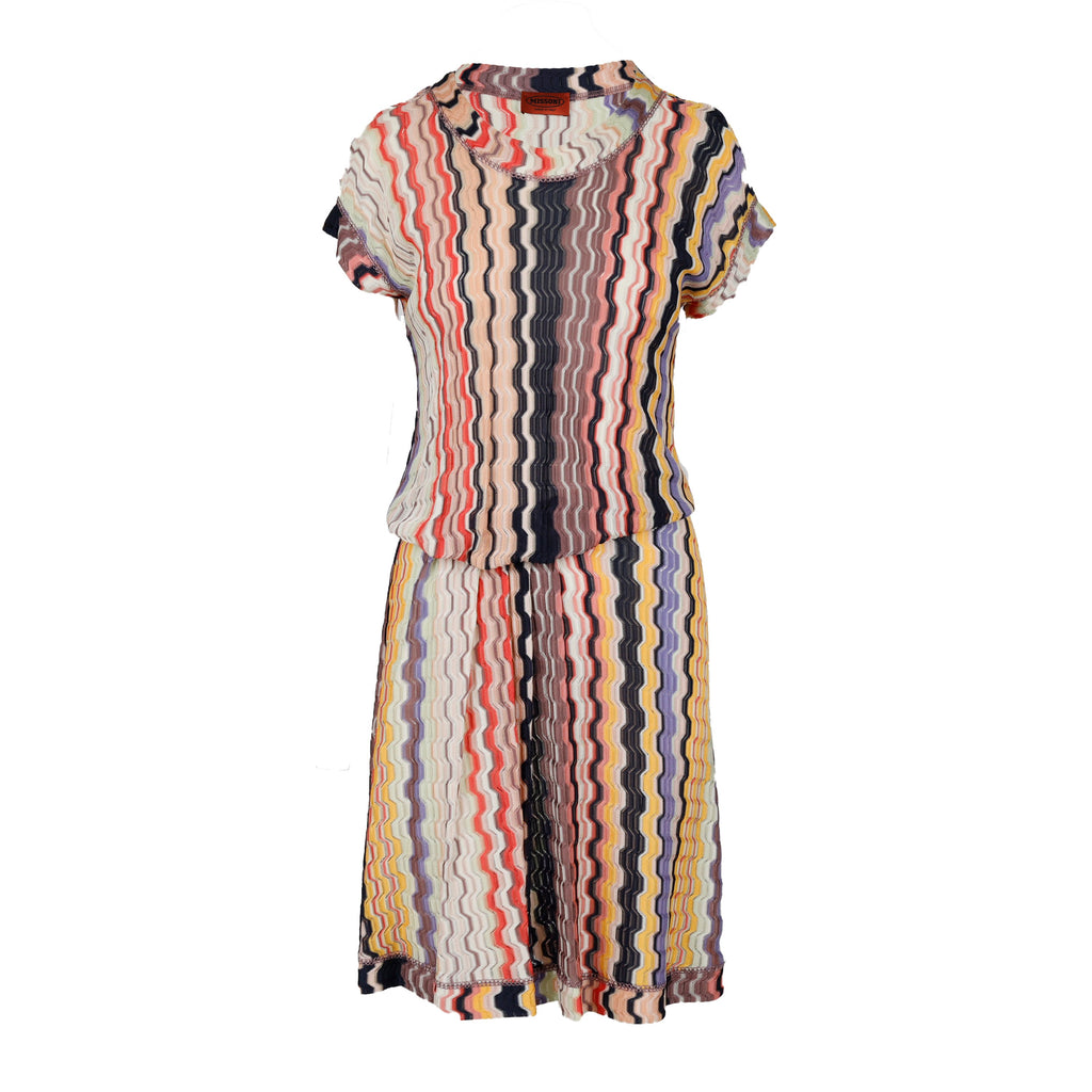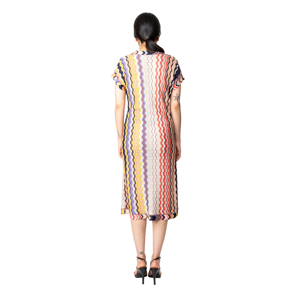This knee-length dress features Missoni's signature multi-colored pattern, a relaxed-fit with a short sleeve that falls over the shoulder. A tie knot on the waist gives a custom fit making it a comfortable yet stylish choice for the summer.