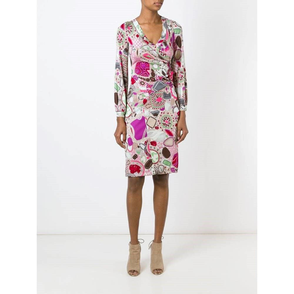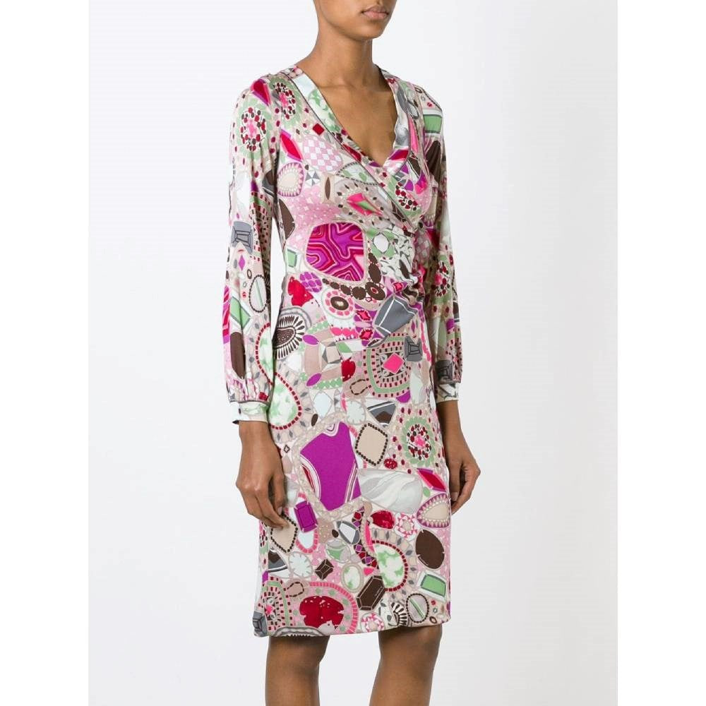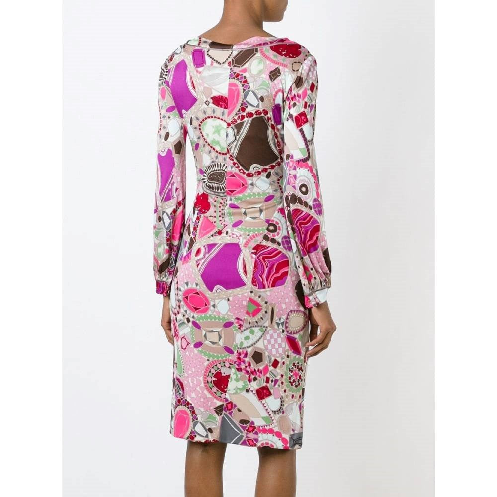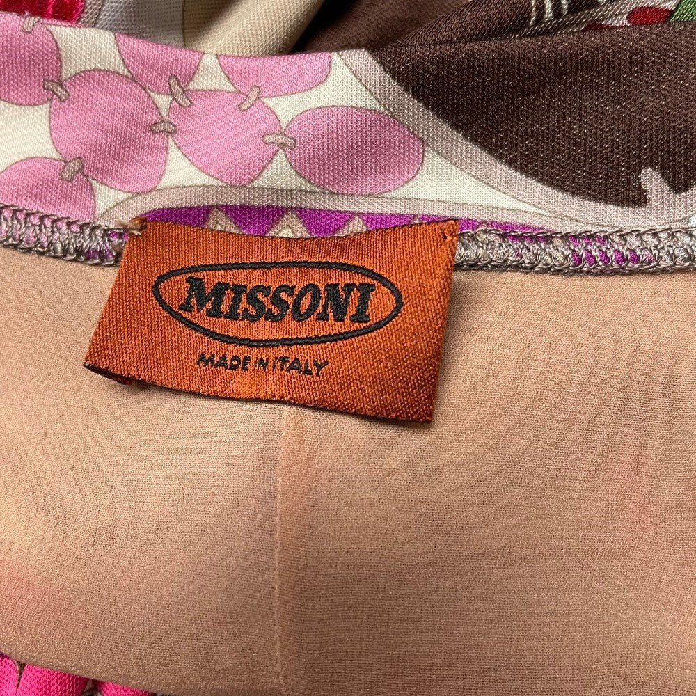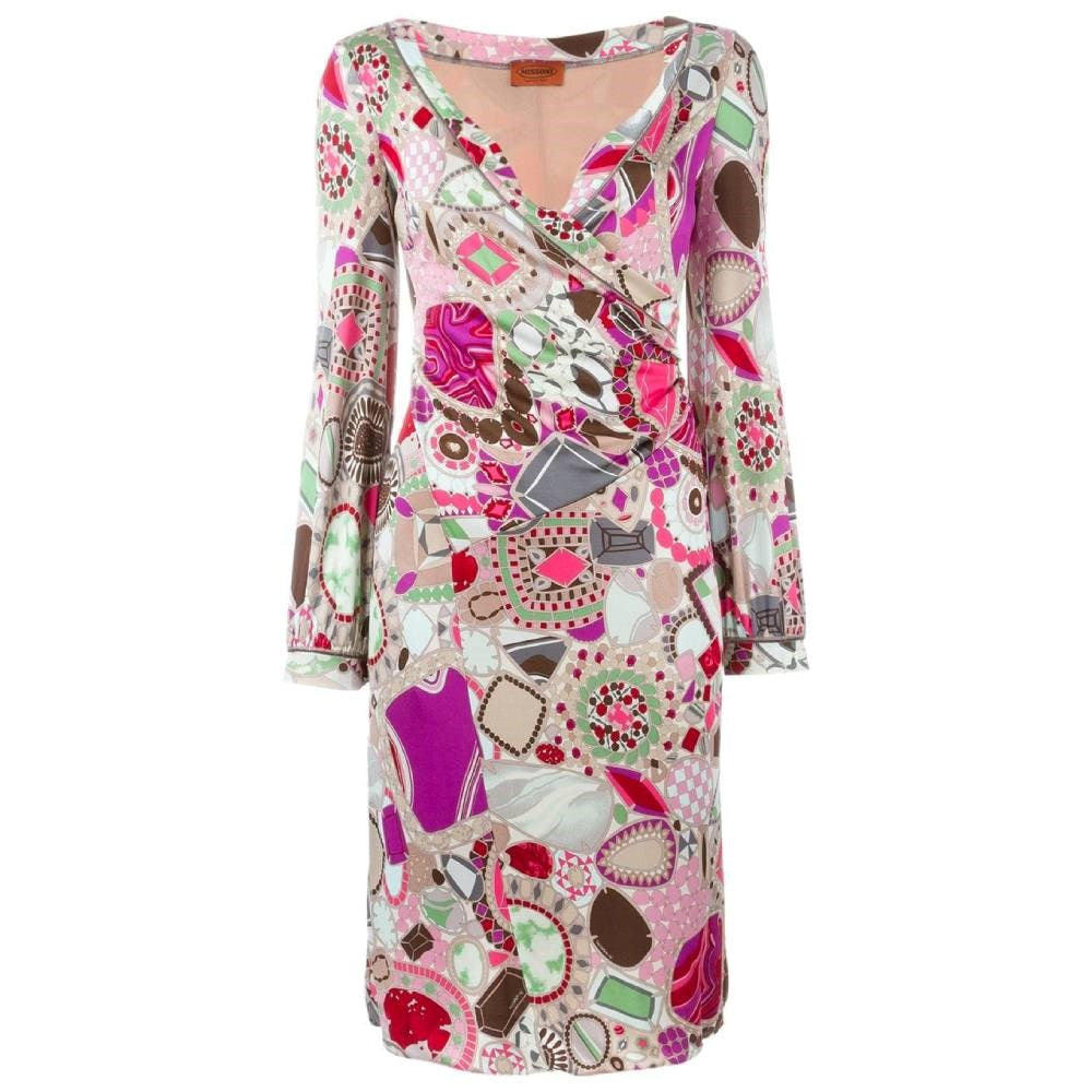 Missoni viscose 2000s midi dress with multicolor prints, deep shawl collar and long sleeves. Side drape and side zip closure.