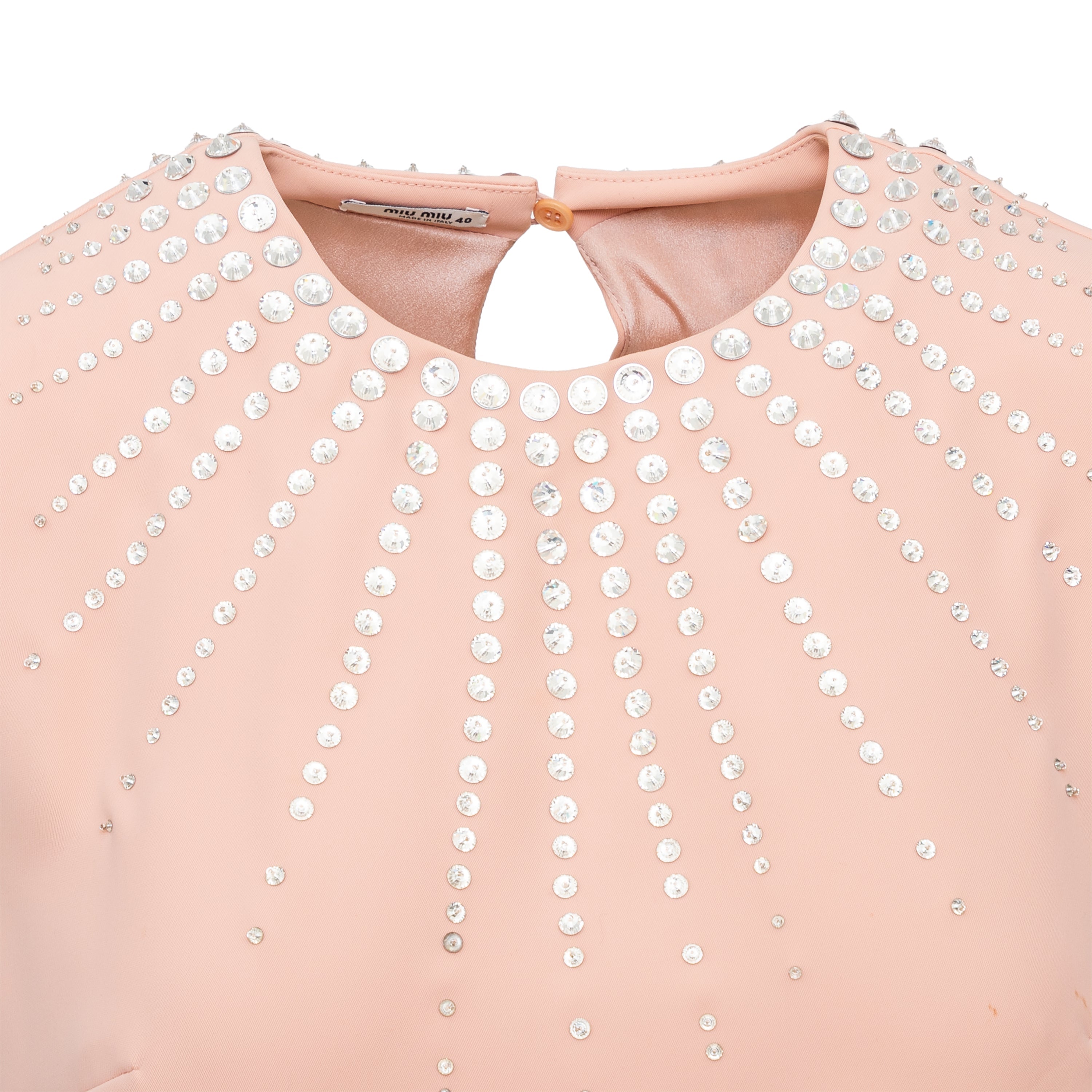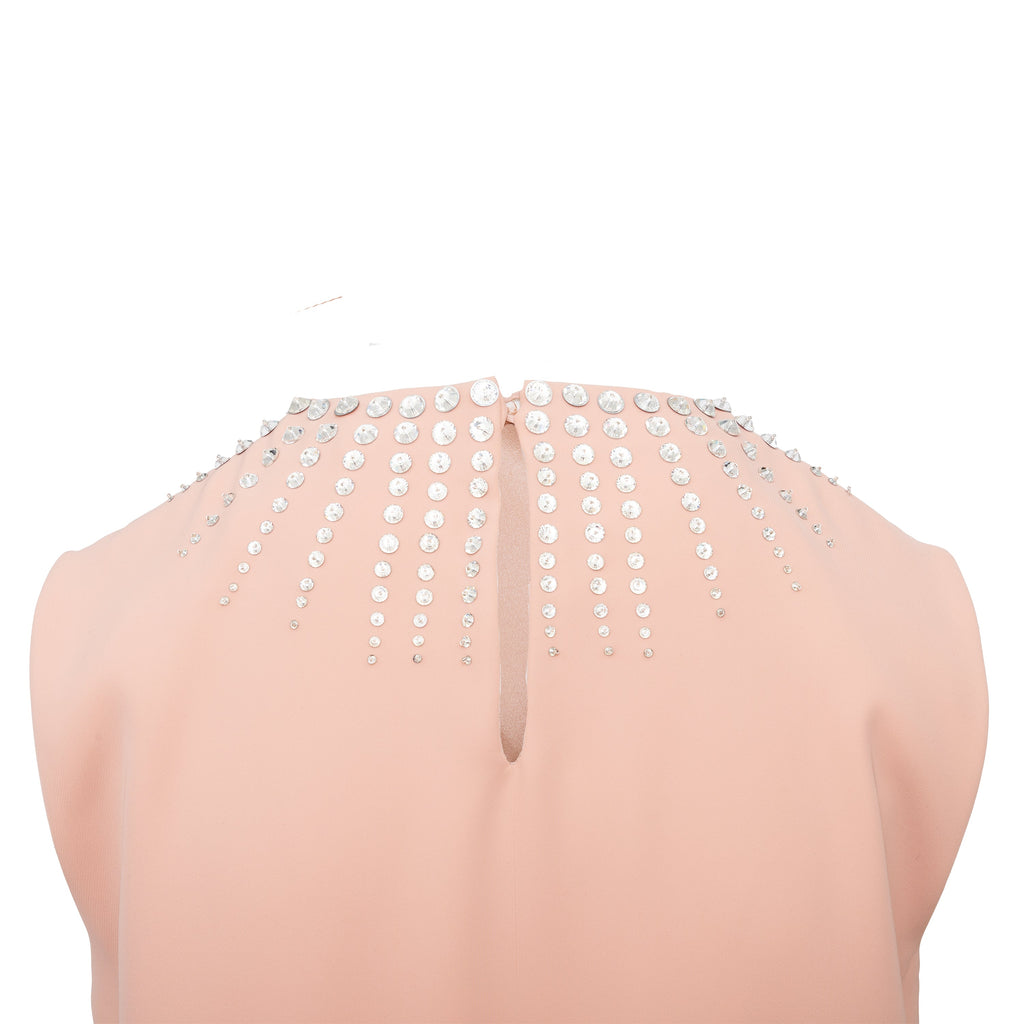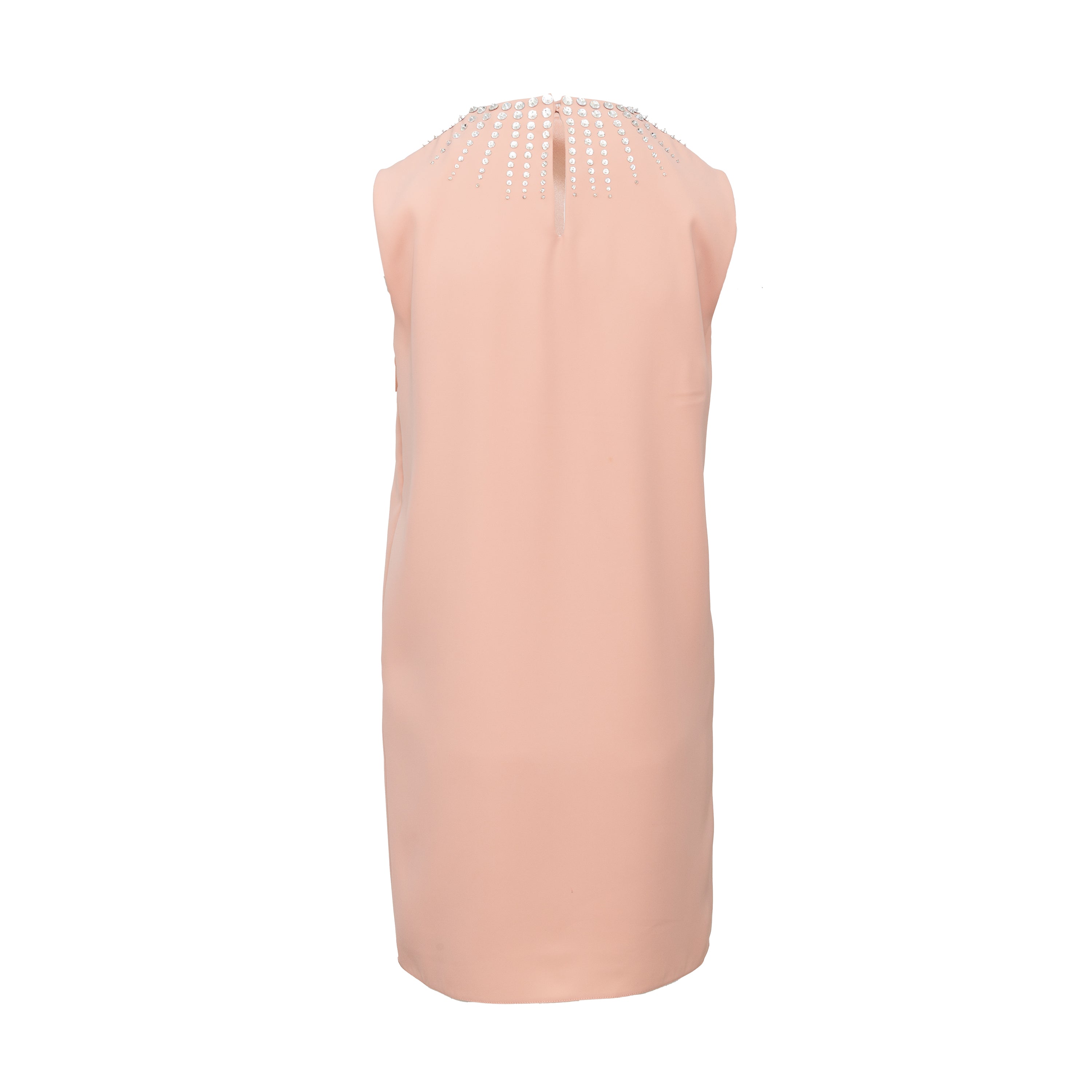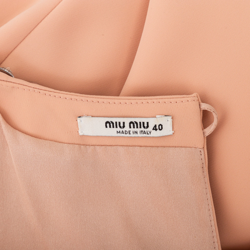 This Miu Miu short dress offers a stylish addition to any wardrobe. Crafted in a luxurious peach hue, it features a sleeveless shift silhouette, a round collar, and a cascade of stone embellishment along its neckline for a hint of sparkle. A concealed zipper closure on the side and a small slit along the back with a button closure complete the design.