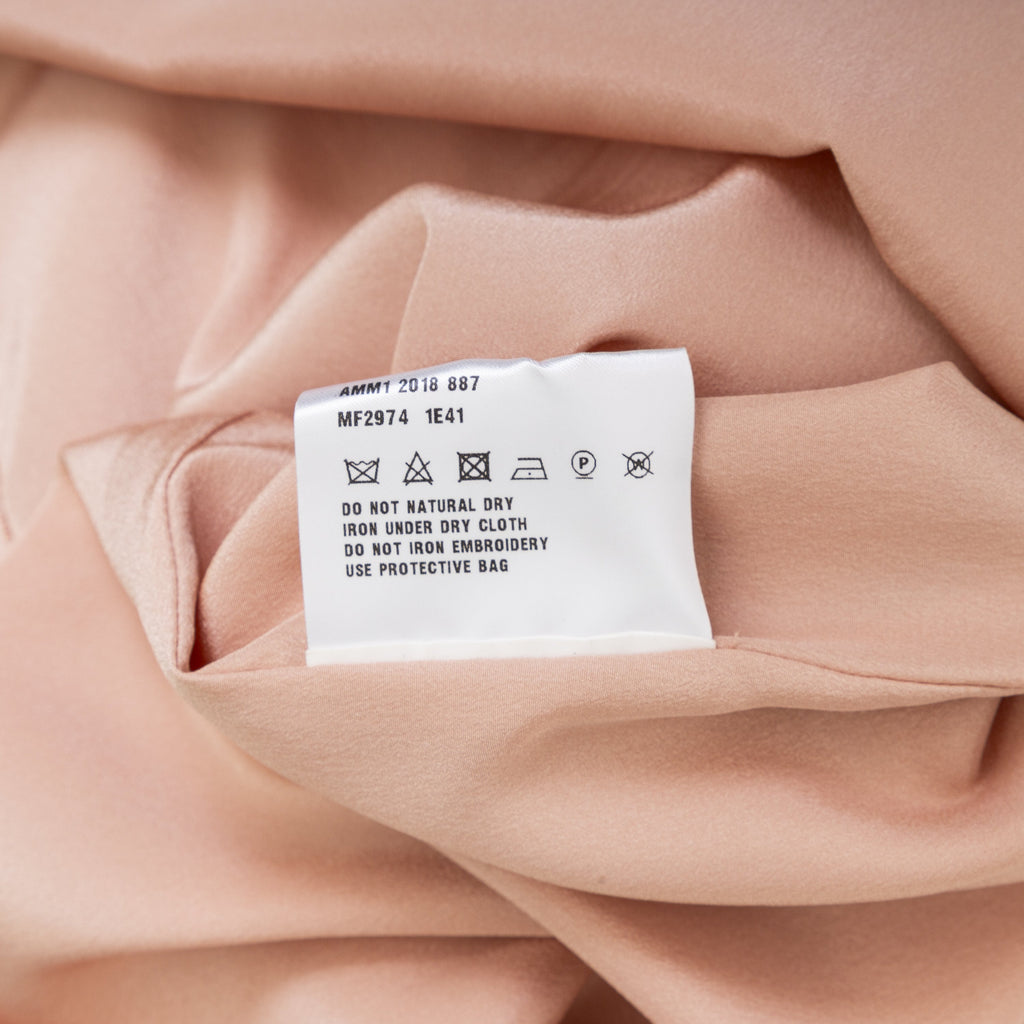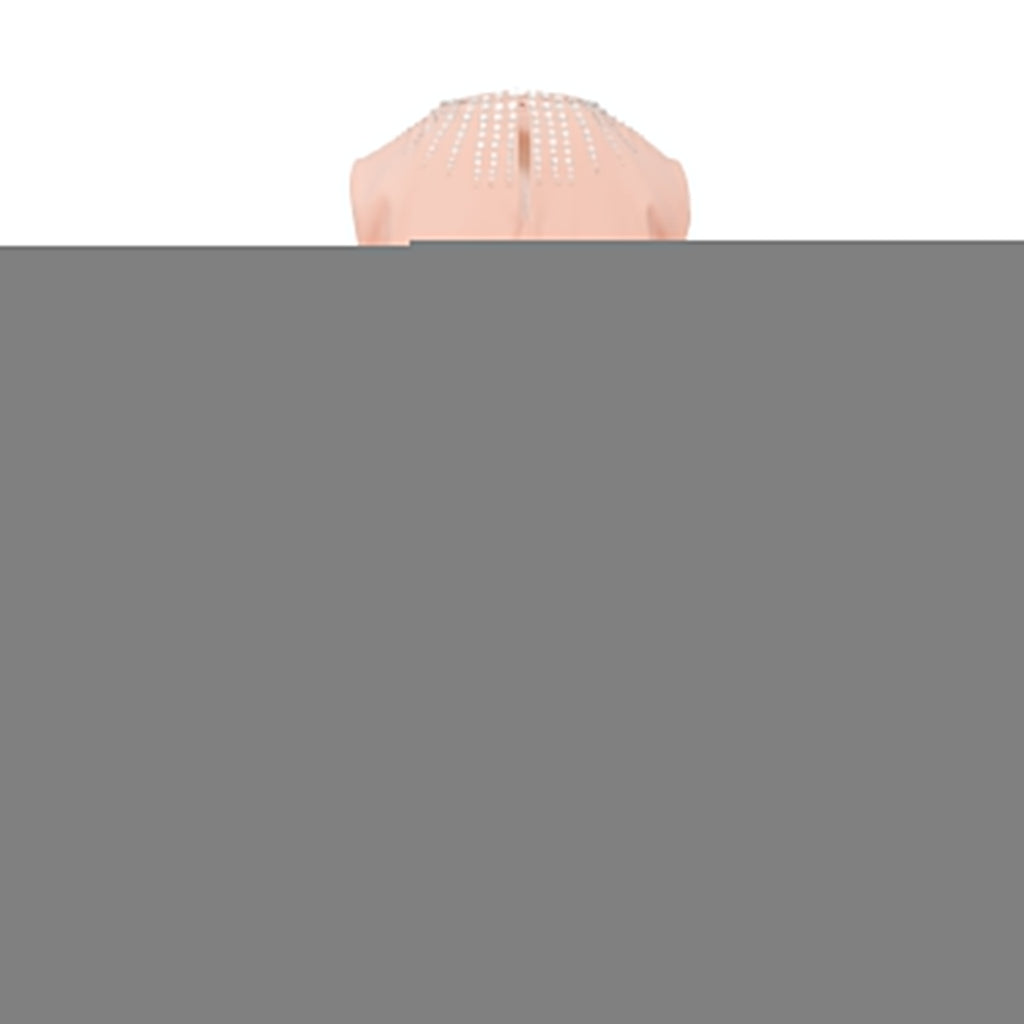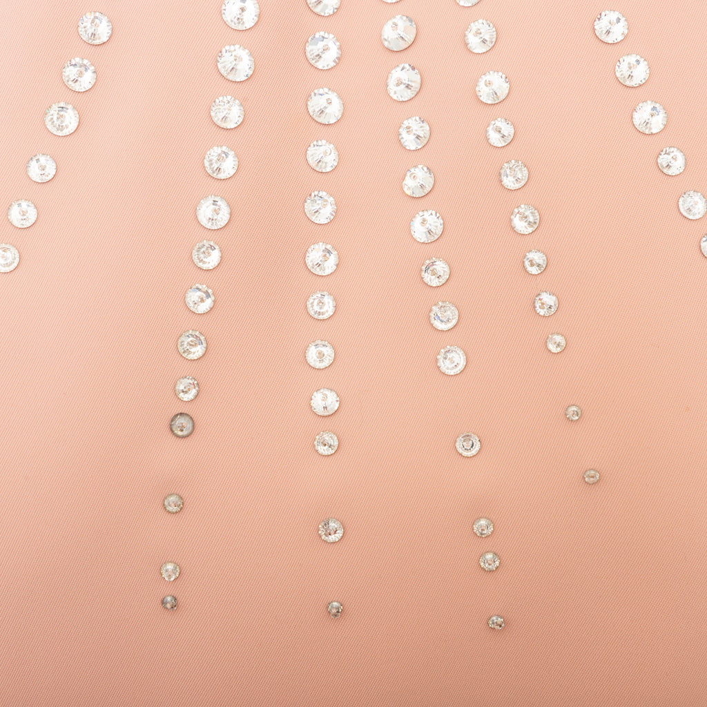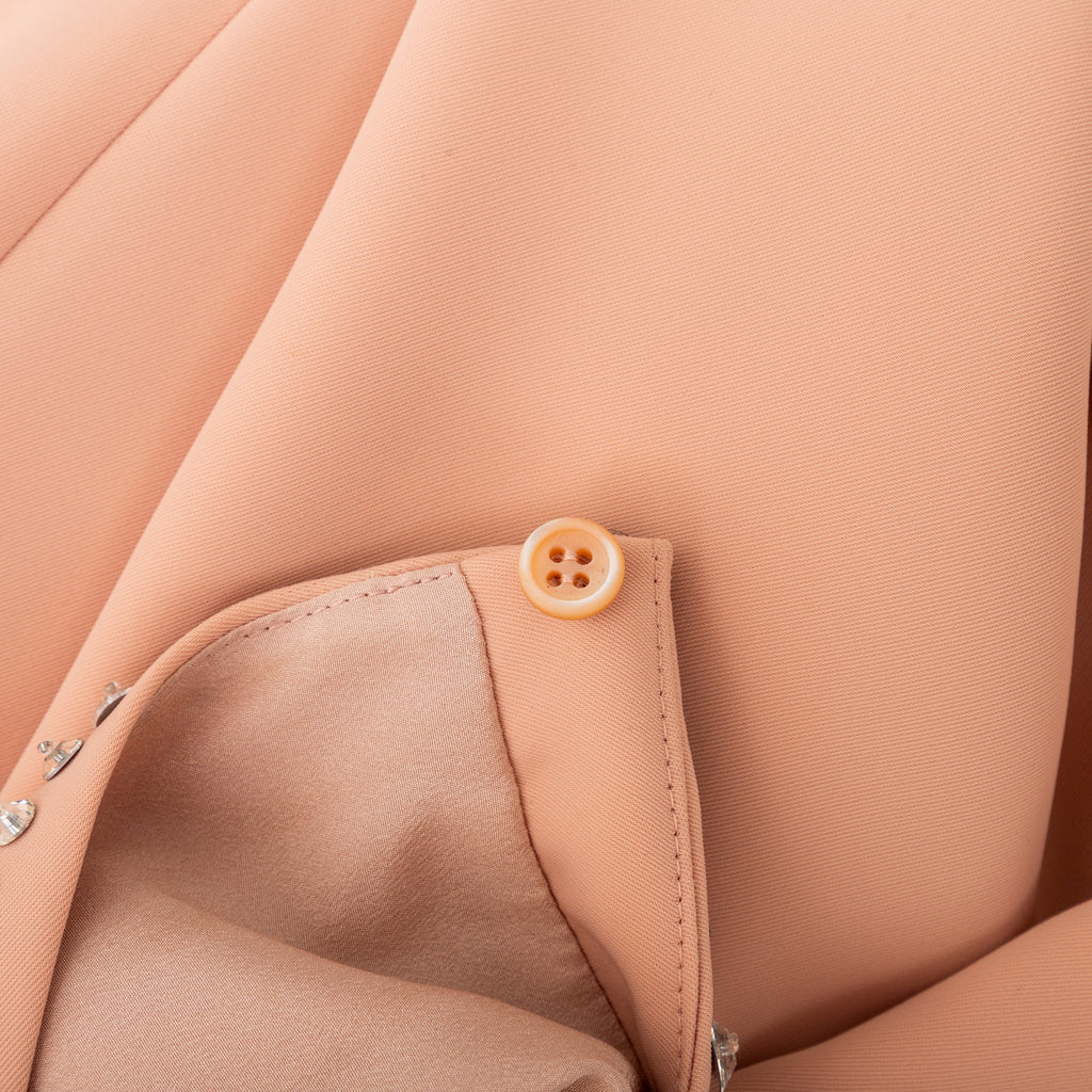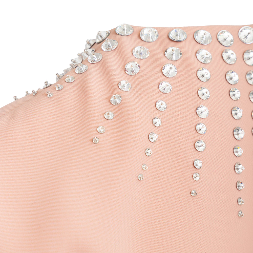 This Miu Miu short dress offers a stylish addition to any wardrobe. Crafted in a luxurious peach hue, it features a sleeveless shift silhouette, a round collar, and a cascade of stone embellishment along its neckline for a hint of sparkle. A concealed zipper closure on the side and a small slit along the back with a button closure complete the design.