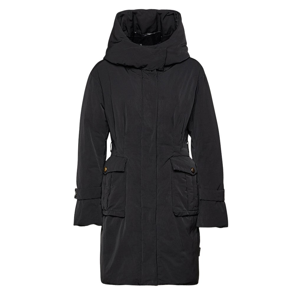Moncler black polyester long 2020s down jacket with hood. Patch pockets with flap and snap button, zip closure and hidden snap buttons. Padding in duvet. The item shows the buttons of the front pockets with slight signs of wear, as shown in the pictures.