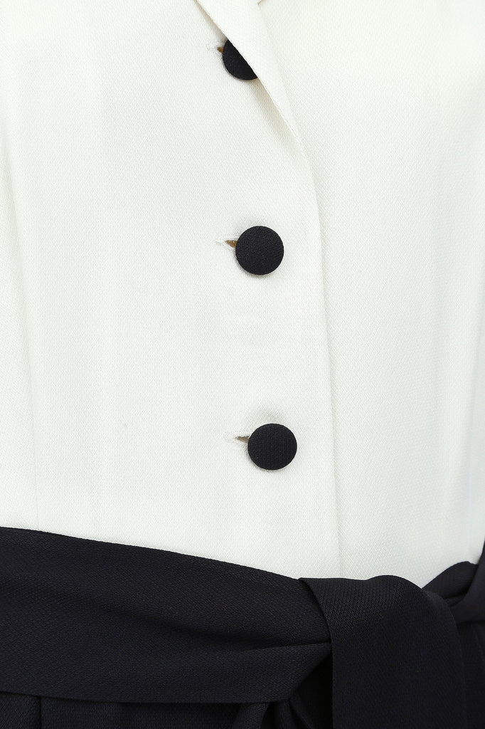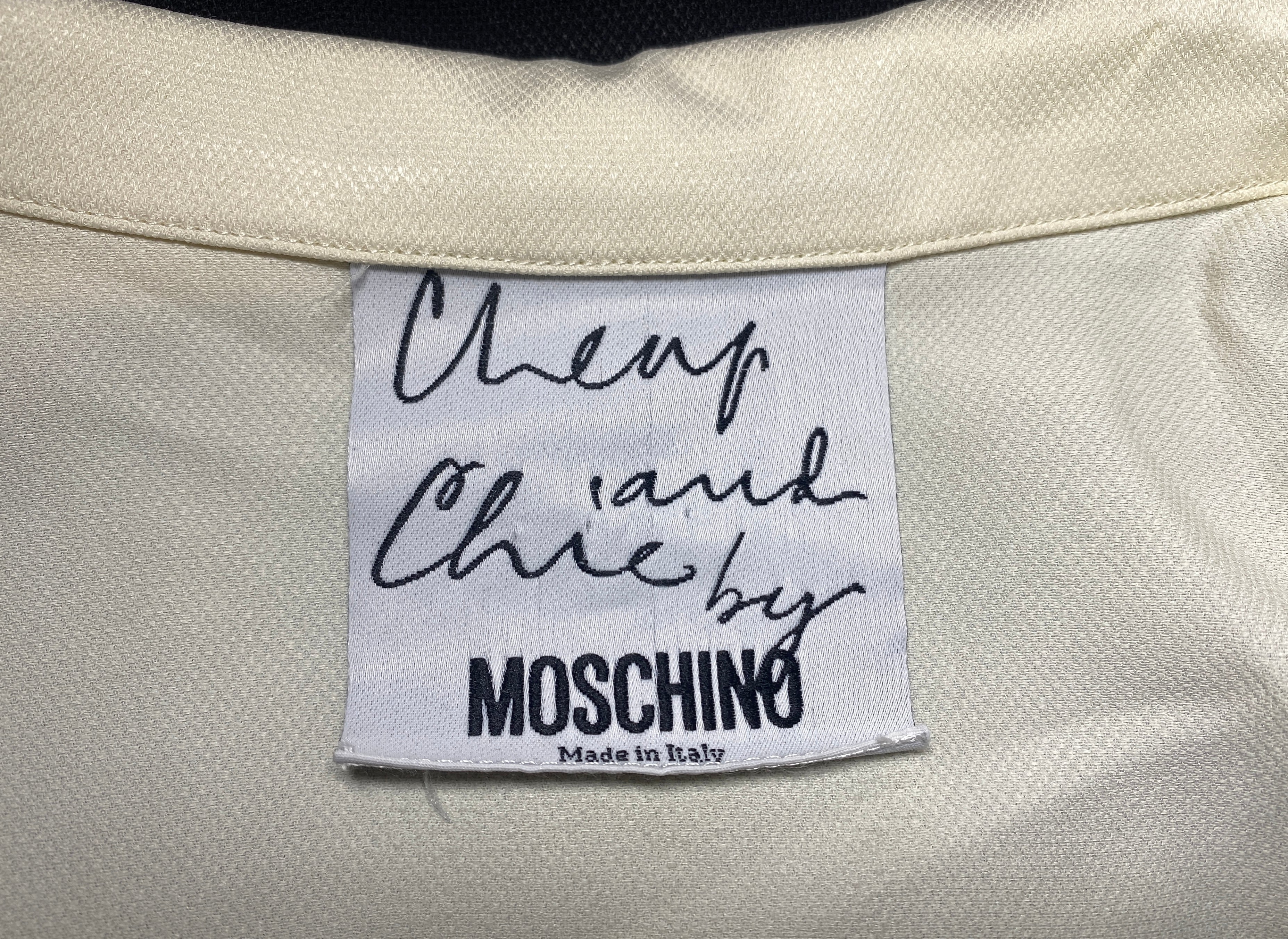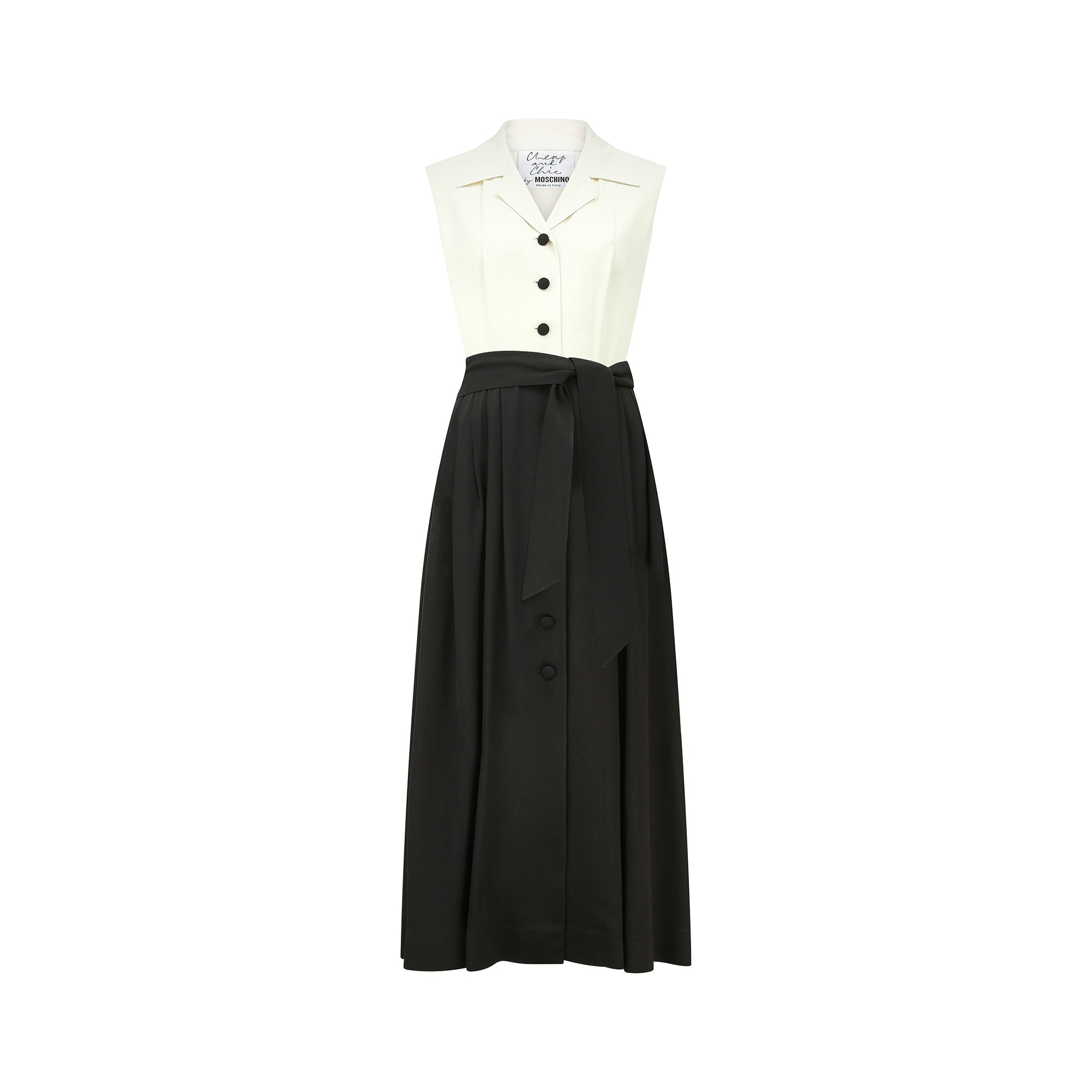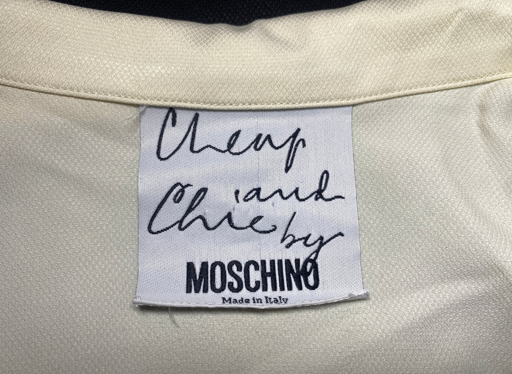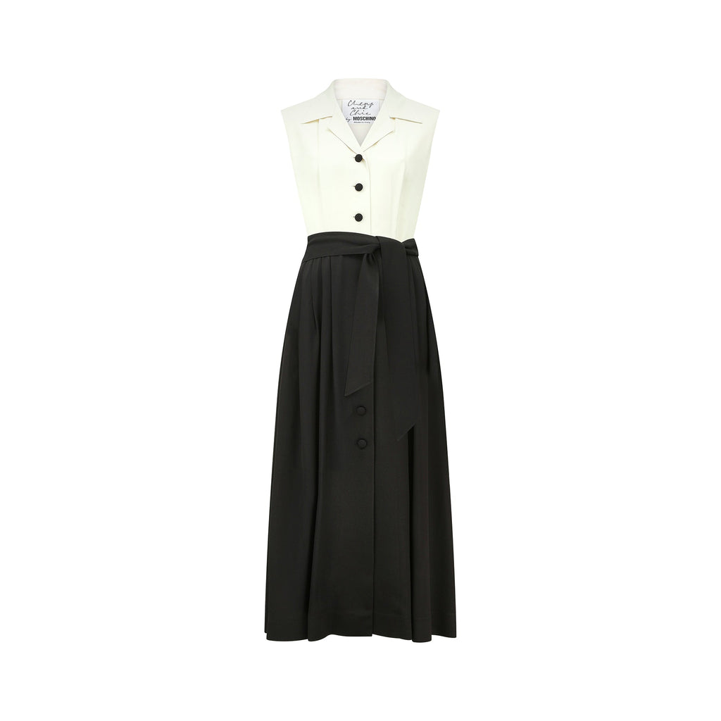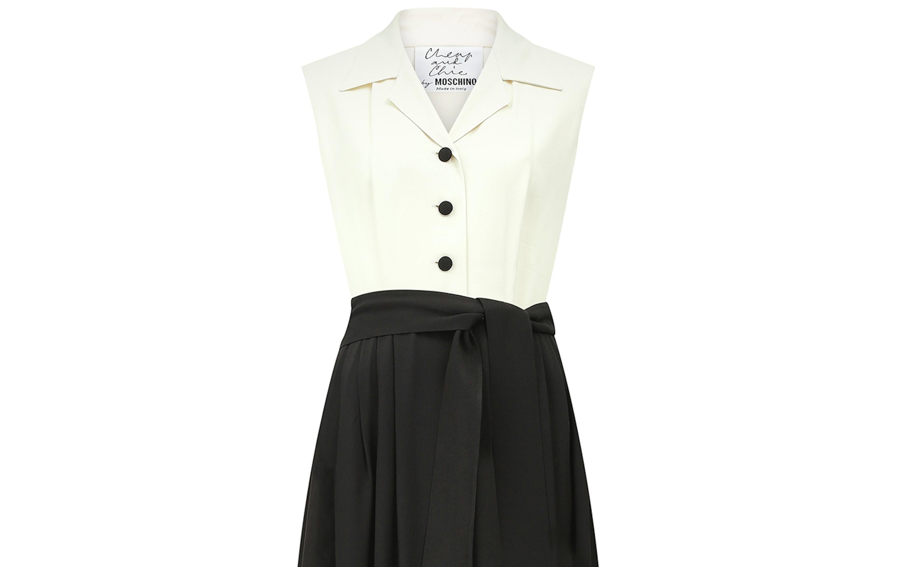 Mid to late 1990s Moschino Cheap and Chic monochrome dress. This is a midi-length dress with a very striking mono print - almost tuxedo like and perfect for more formal dos or a day to night event. A long, front-fastening shirtwaister style with a notched collar; the black fabric buttons contrast with the cream sleeveless bodice. It has belt loops and a fabric tie belt. Made in Italy from a high quality acetate/rayon blended fabric that has been texturized to give the dress a pleasing weight. The sizing label is no longer present but we estimate this is good fit for up to UK size 12 UK, US size 8. In great vintage condition; gently worn with absolutely no issues and seen here on the television presenter Francesca Cumani.