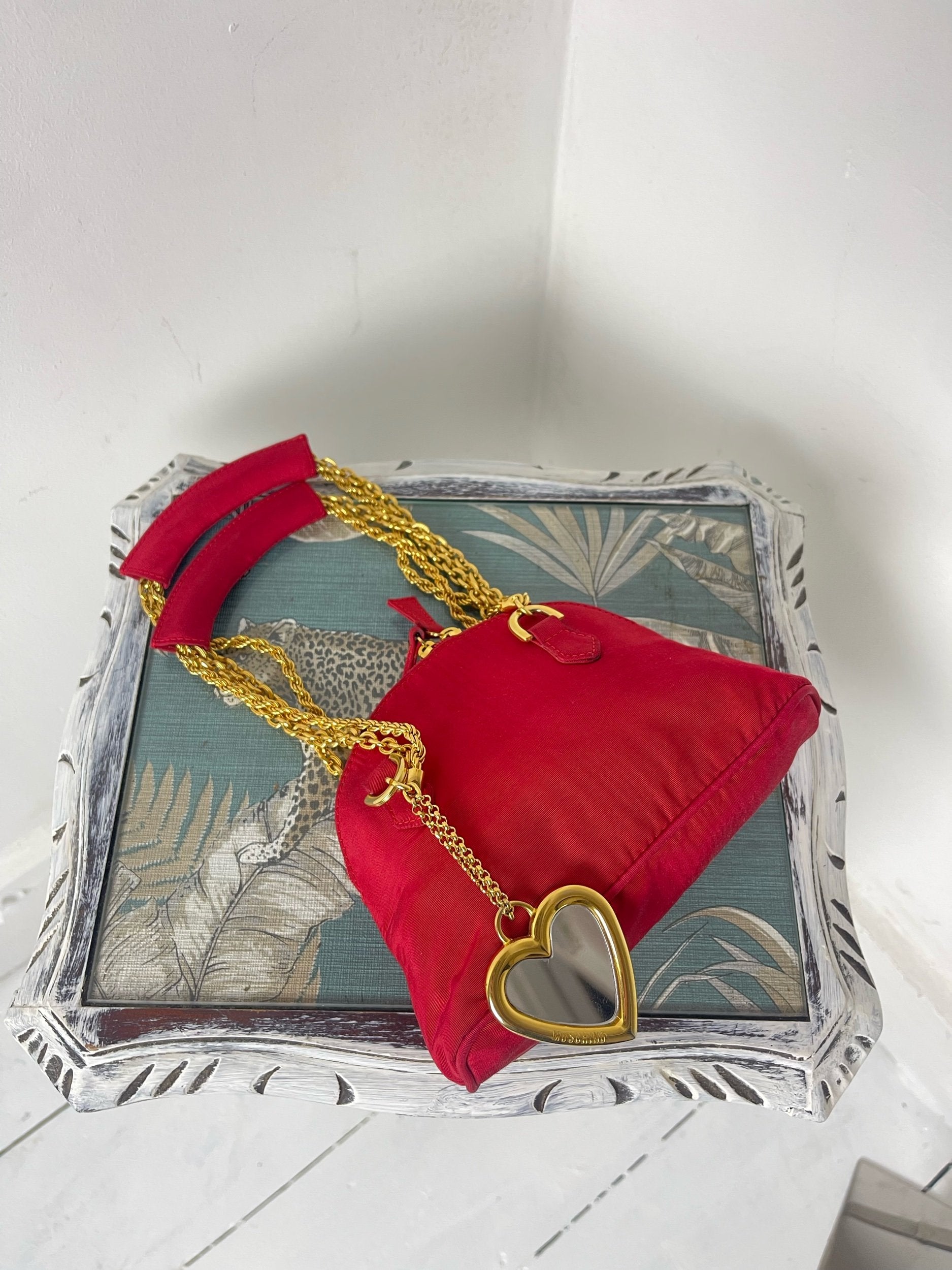 Bring a touch of Moschino’s iconic whimsy to your wardrobe or collection with this authentic 1990s Moschino by Redwall mini evening bag. Designed in a striking vibrant red fabric, this petite piece captures the playful spirit of the era with its gold-tone chain straps and the standout heart-shaped mirrored charm—a signature Moschino detail that makes the bag instantly irresistible.