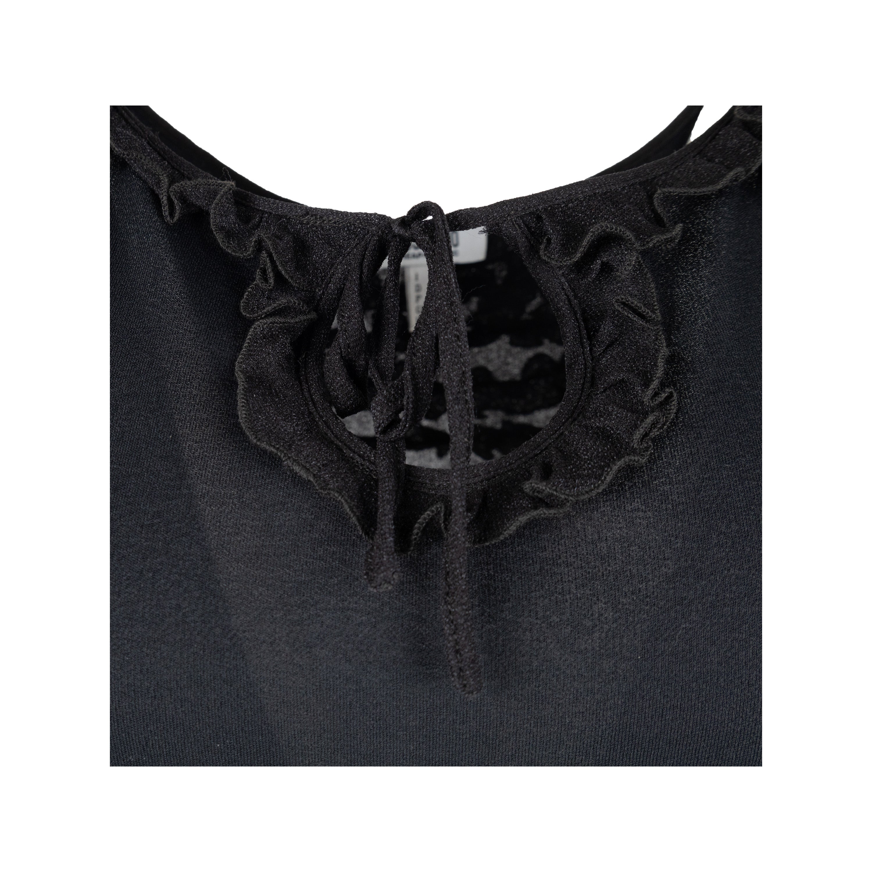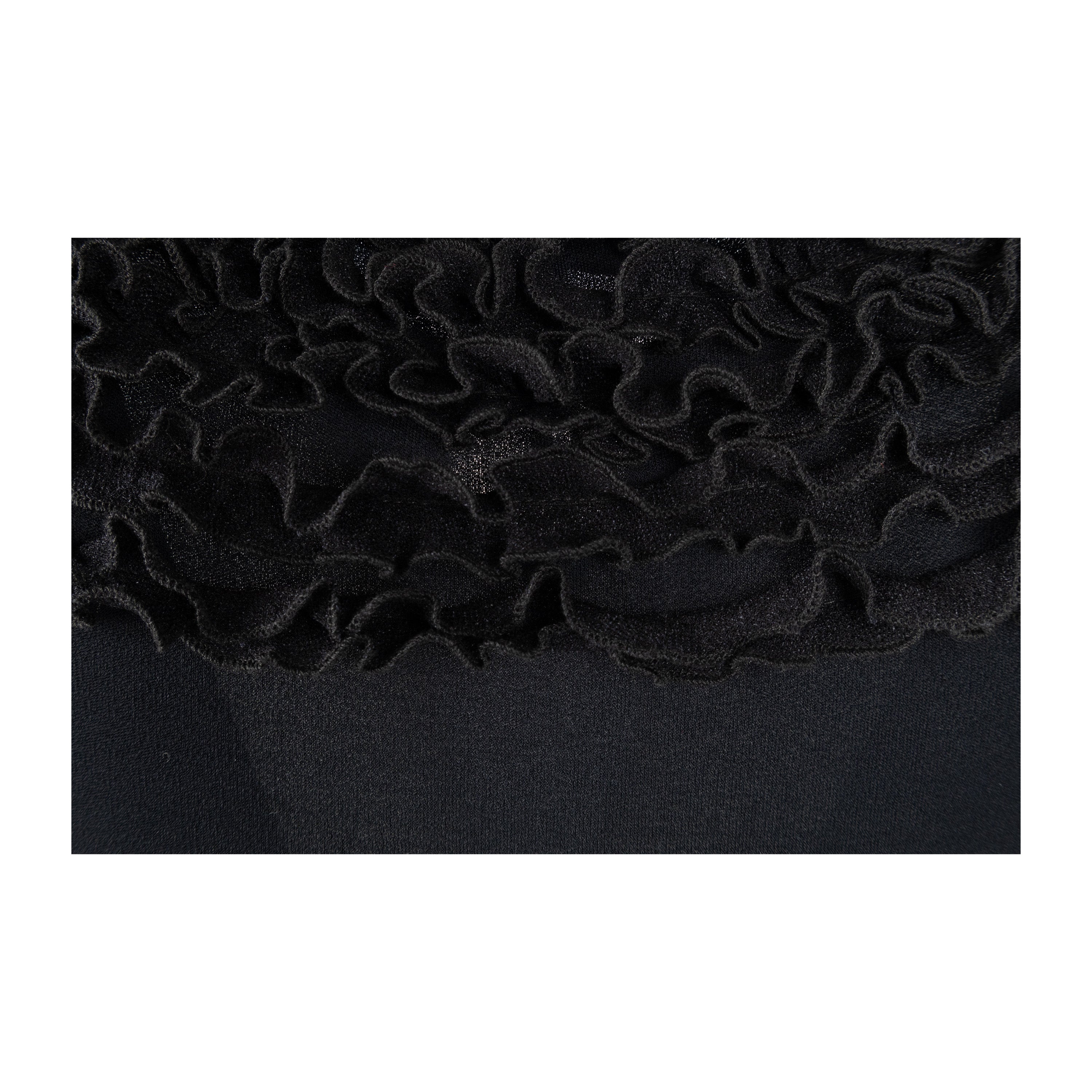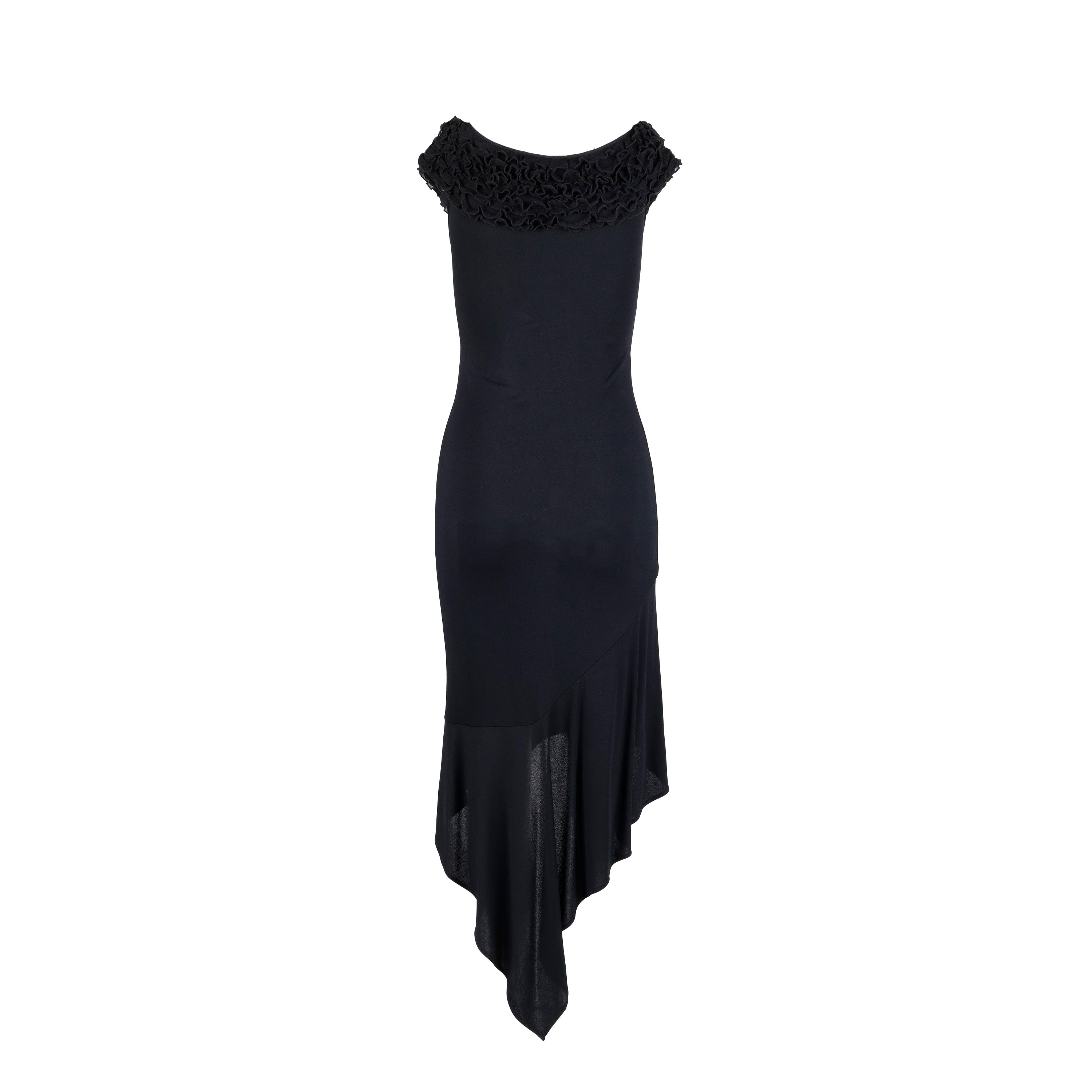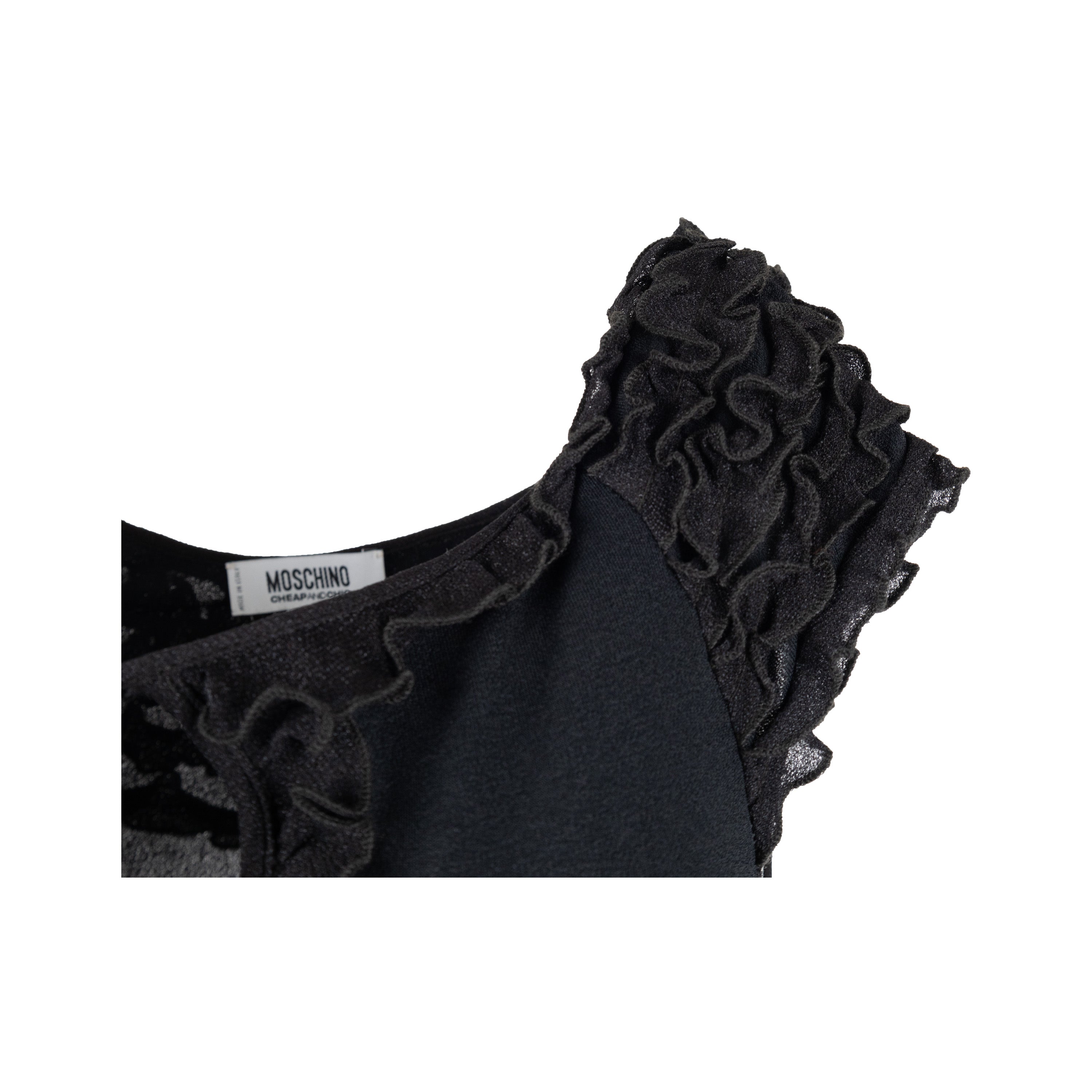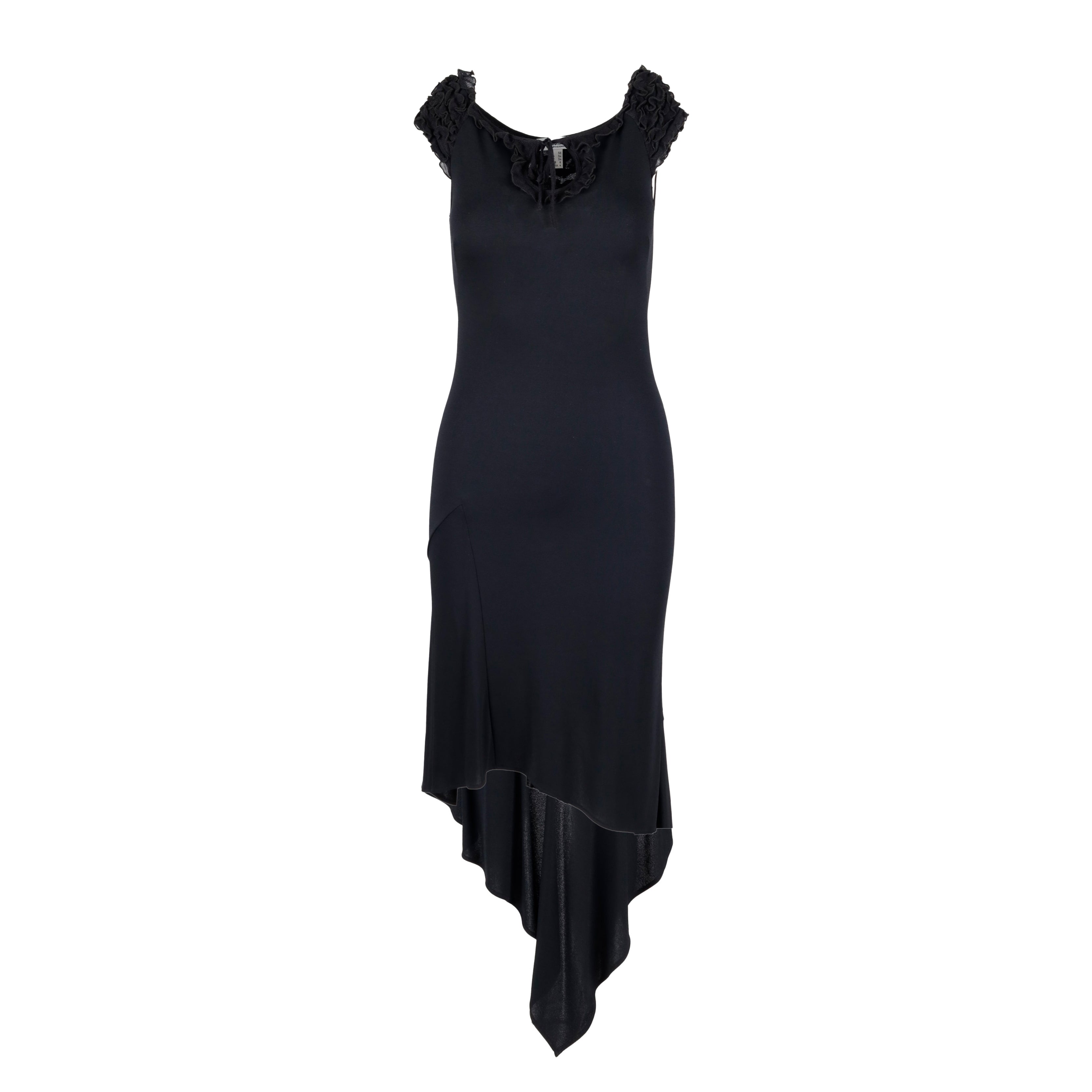 This vintage Moschino Cheap and Chic dress features an iconic asymmetric hemline and can be worn as an off-shoulder silhouette. With a scoop neck and ruffle embellishment, this black dress is a versatile and stylish addition to any wardrobe.