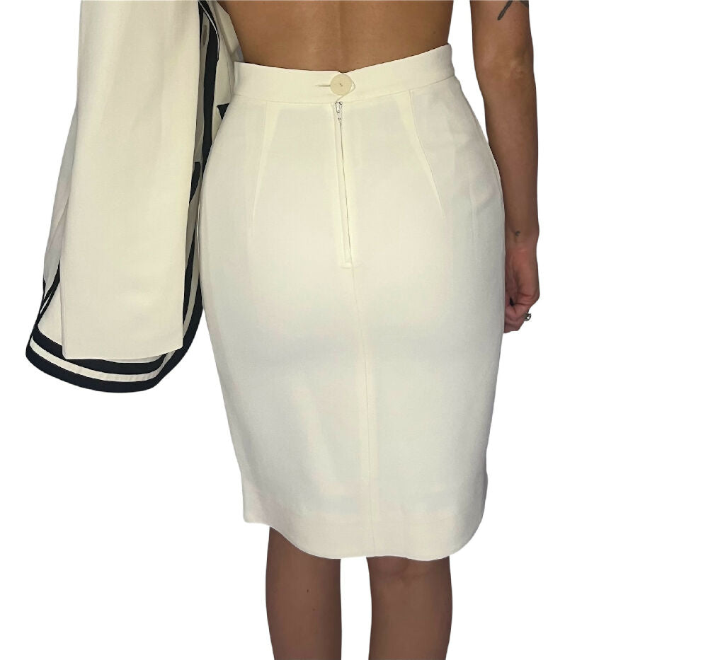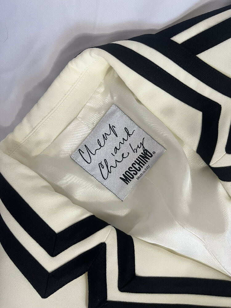 This suit embodies the word chic - a gorgeous piece that displays a classic Franco Moschino style. Produced in one of his last collections before his passing in 1994, this beautifully tailored piece in cream and black features asymmetrical detailing across the sleeves and pockets.