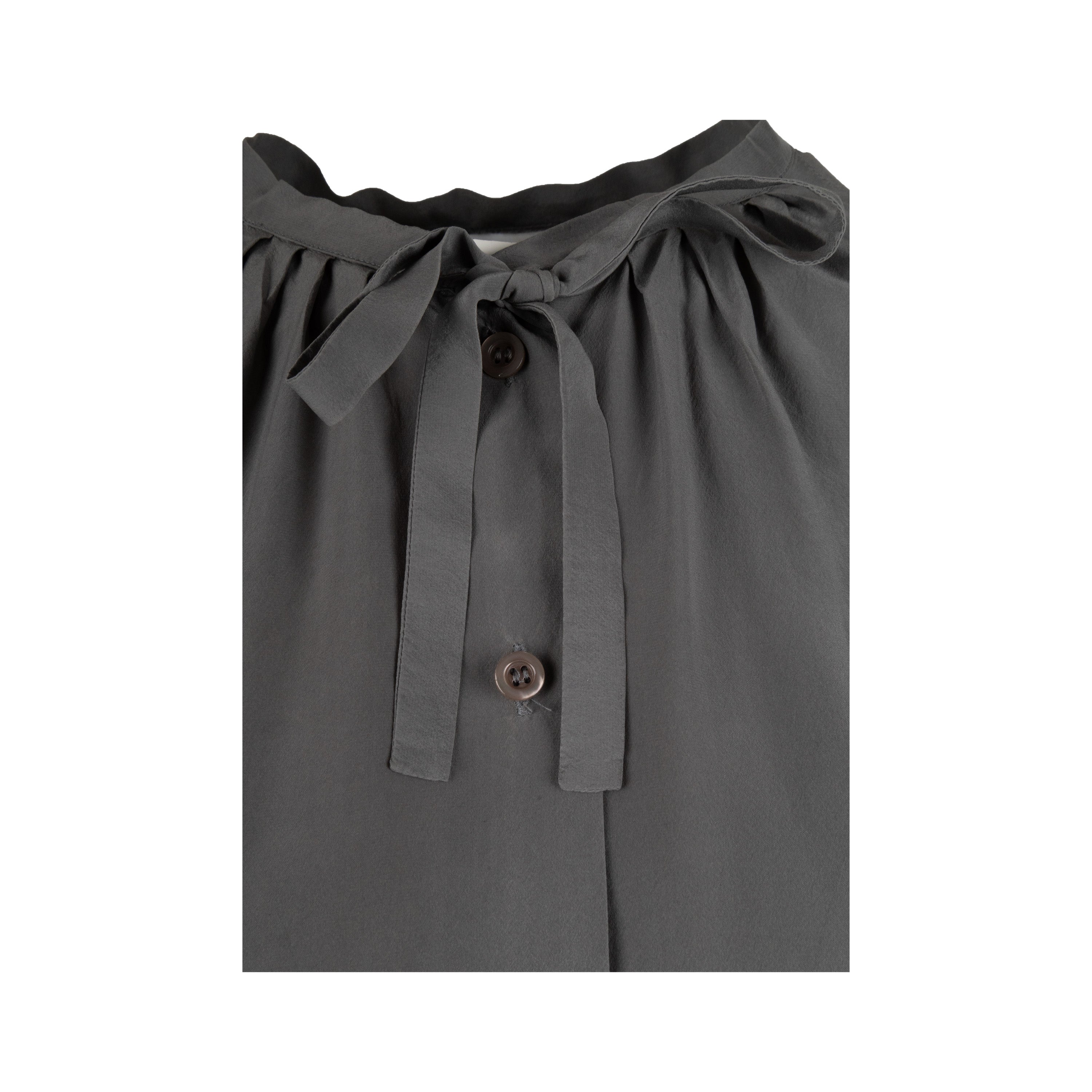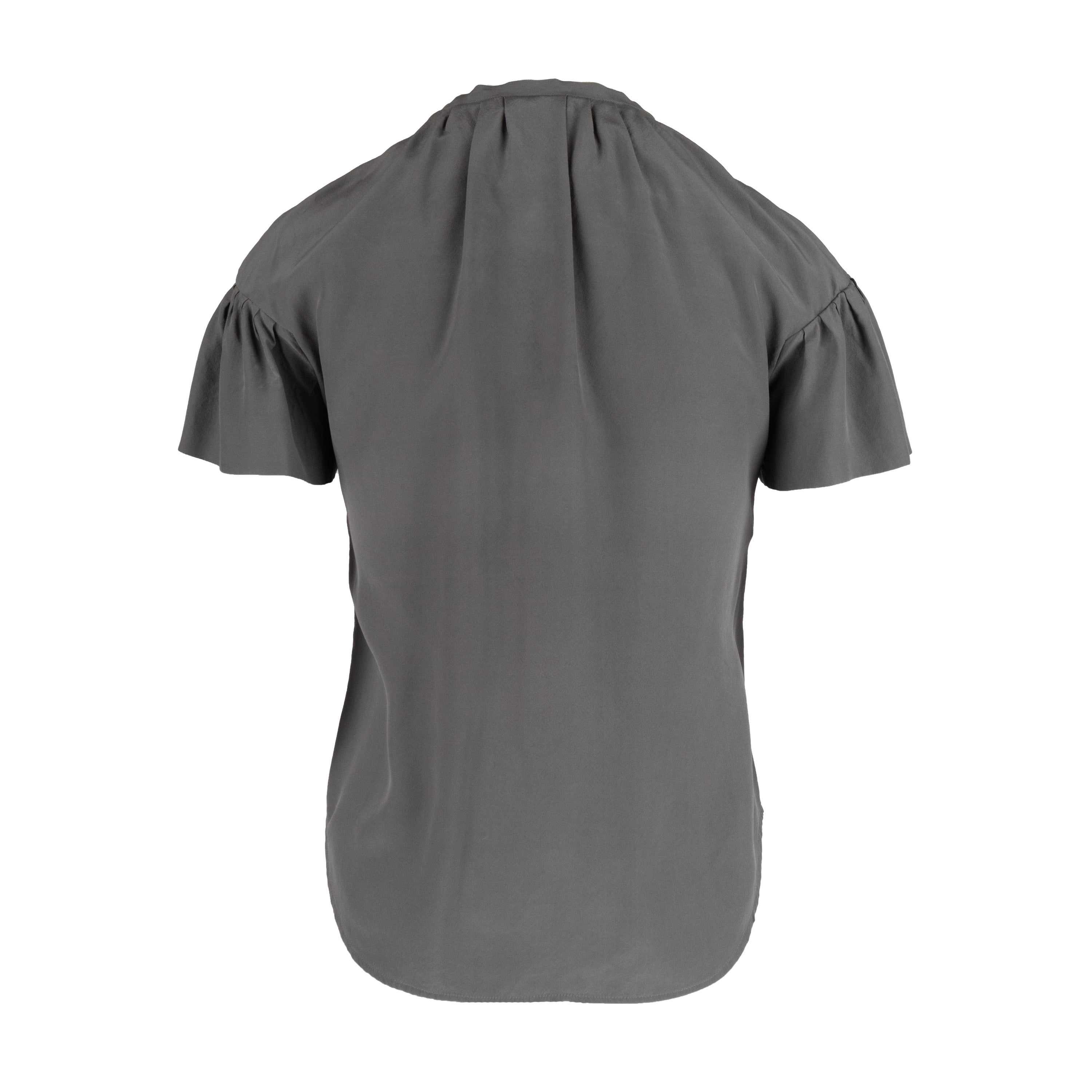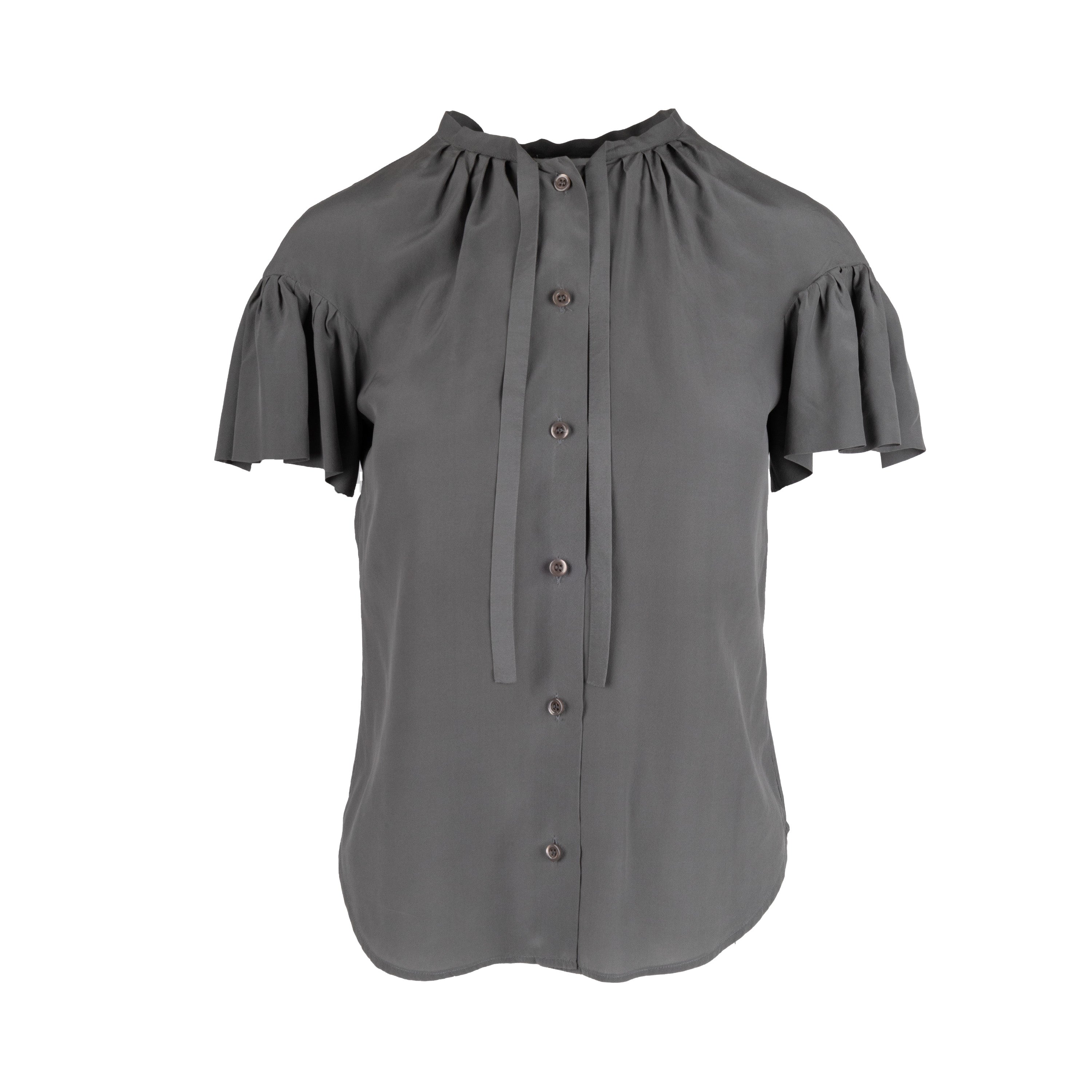 This Moschino top  is made from dark grey silk fabric. Its front button closure allows for easy wear, while the tie-knot neckline offers versatile styling options. The short pleated sleeves add a touch of fullness to this chic top.