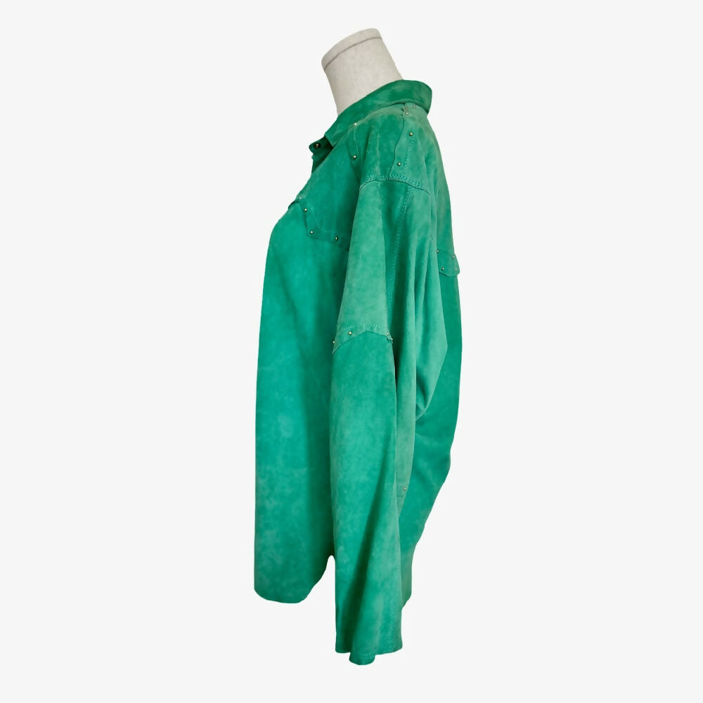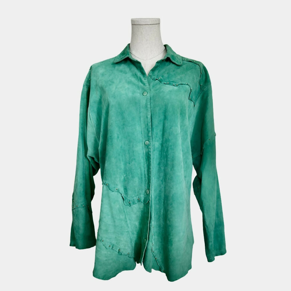 Striking and simple, this 80’s vintage Italian shirt from the 1980s is crafted in soft emerald green suede with gold stud detailing. The soft suede drapes around the body and is a perfect statement piece for a casual day. Wear as a shirt or light jacket over a body, or cowgirl style with a knot.