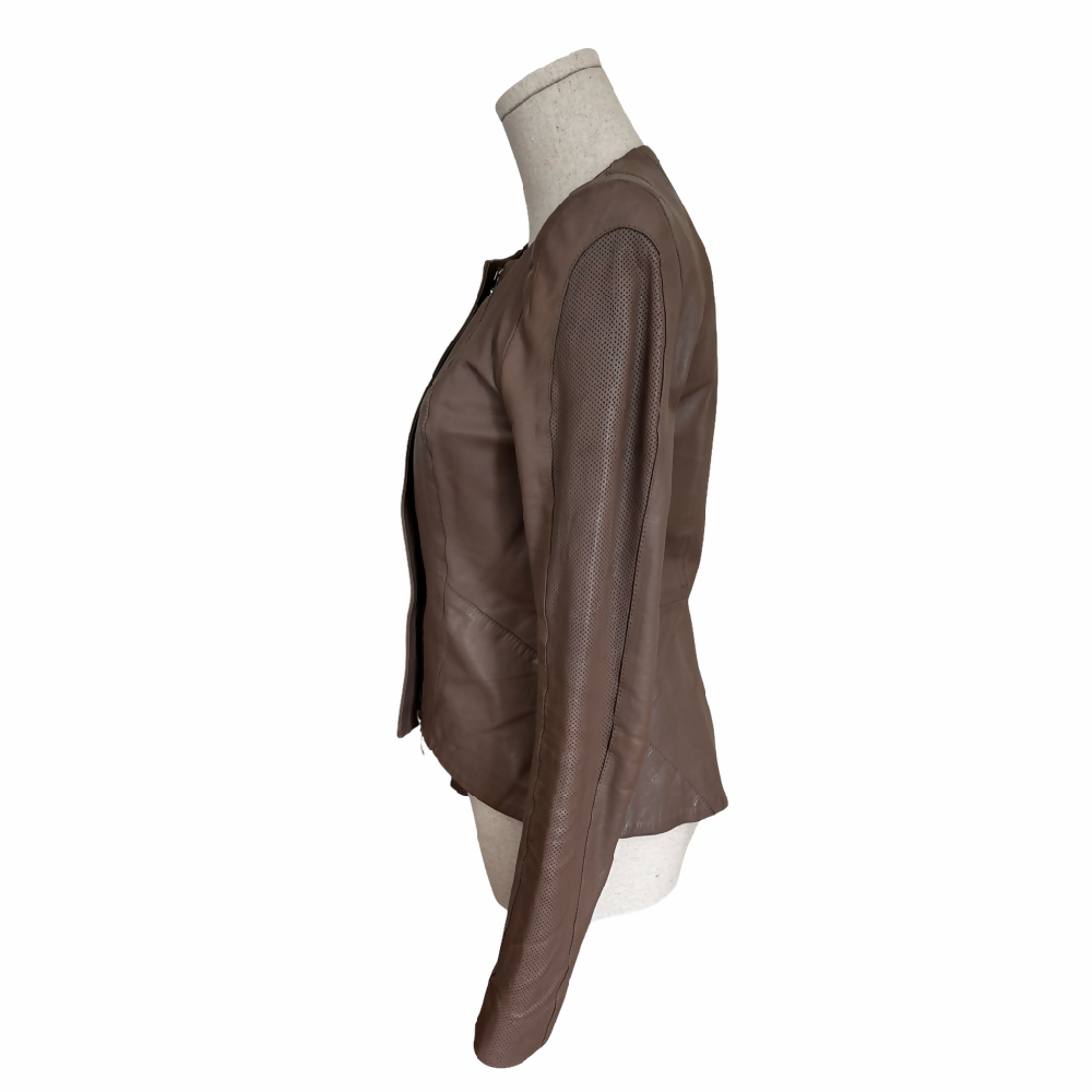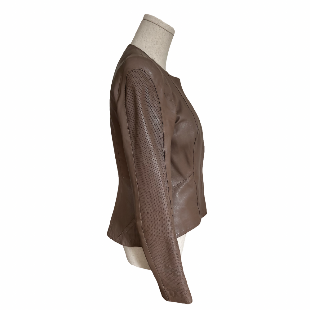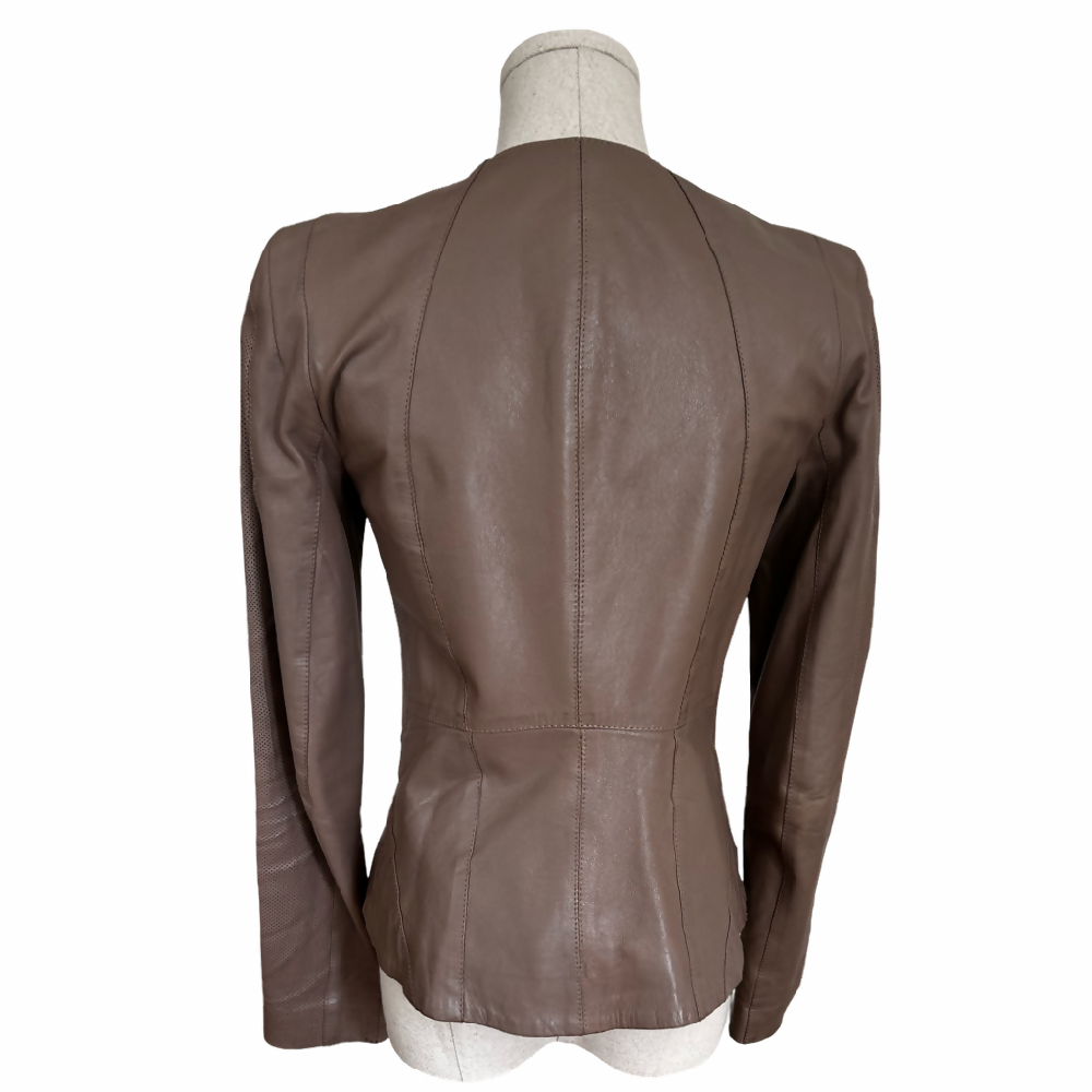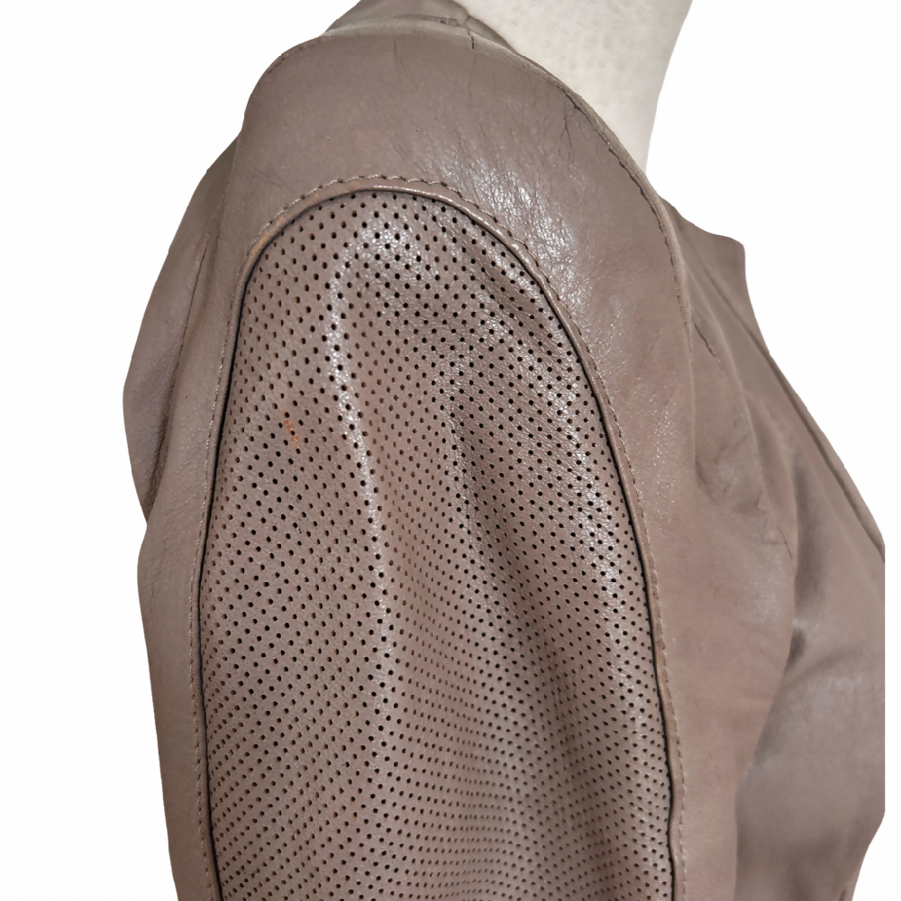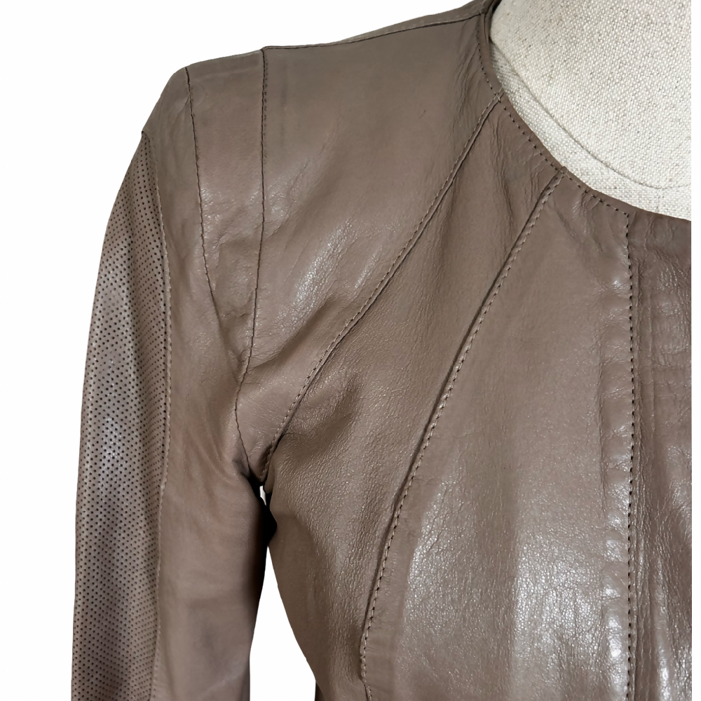 This effortlessly chic taupe leather jacket is cut to with feminine lines to fit perfectly over dresses and skirts and tailored to fit beautifully with trousers. Think understated Italian elegance.