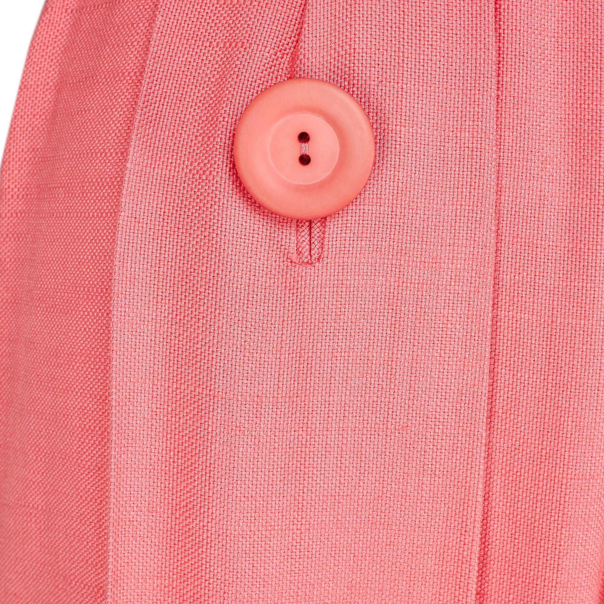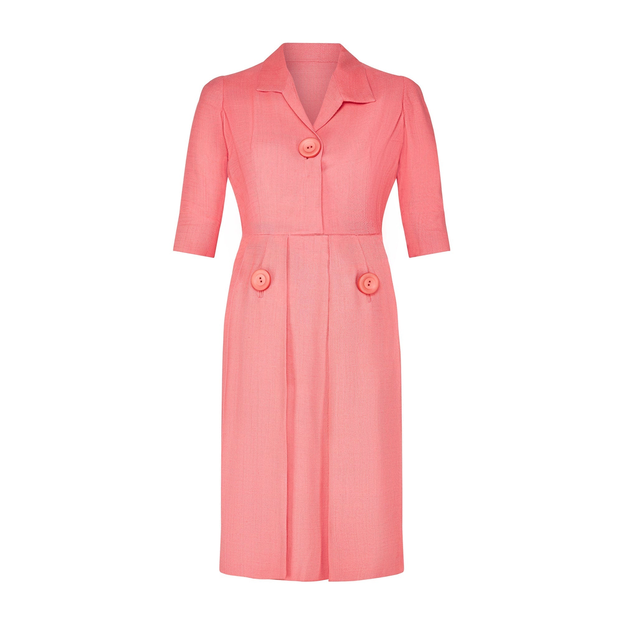 This pretty candy-pink linen dress is tailored to a laid-back day-dress style. It has an open-collar and button down front, secured with a large tonal pink plastic button and hidden hook-and-eye clasps. The sleeves are slightly cropped - perfect for showing off jewellery on the wrist. The skirt is softly pleated and falls to calf length. It is adorned with two large tonal buttons and attached to the top of the dress with hidden hook-and-eye clasps and a hidden zip. The skirt is partially lined with white crepe.