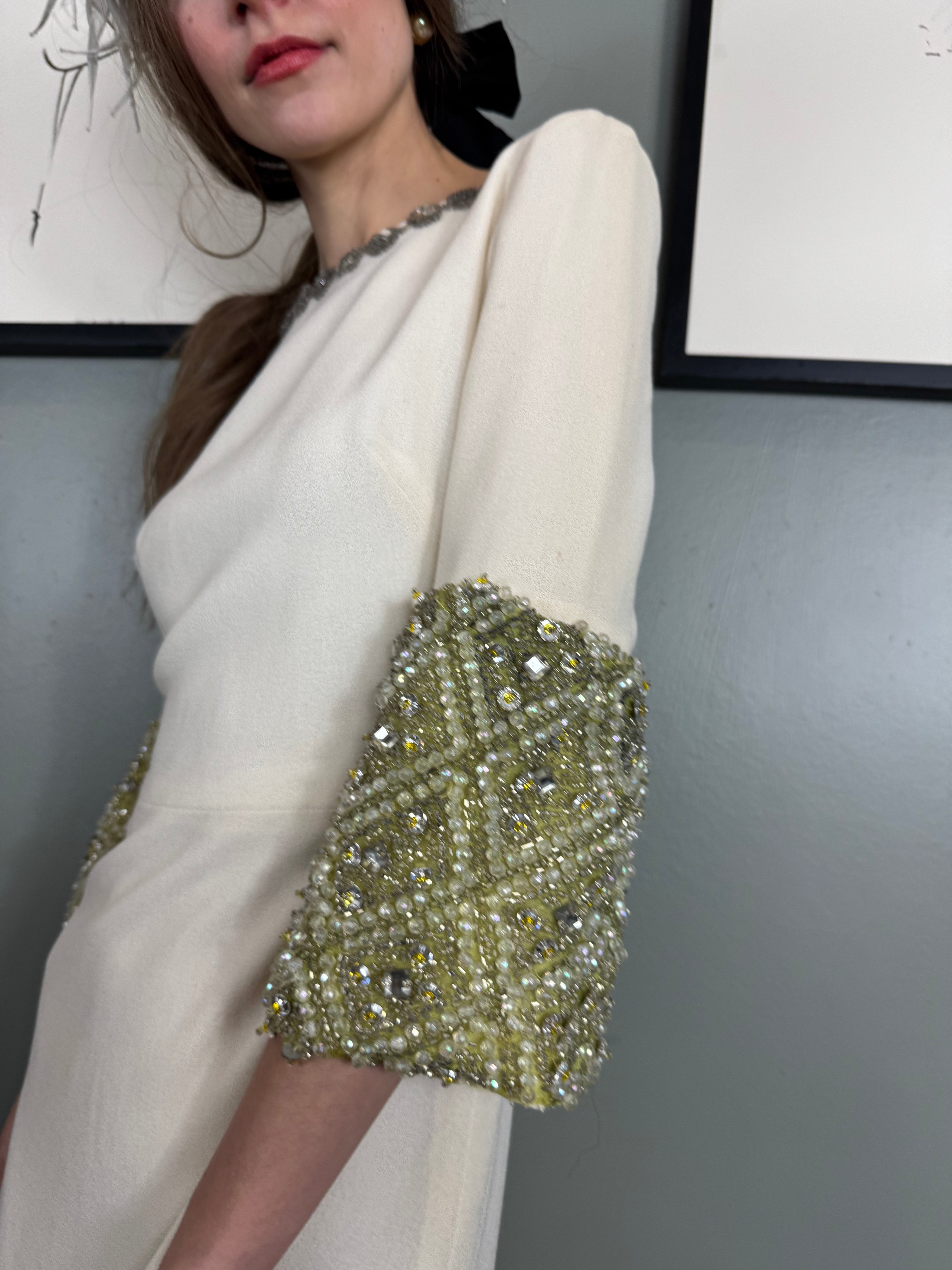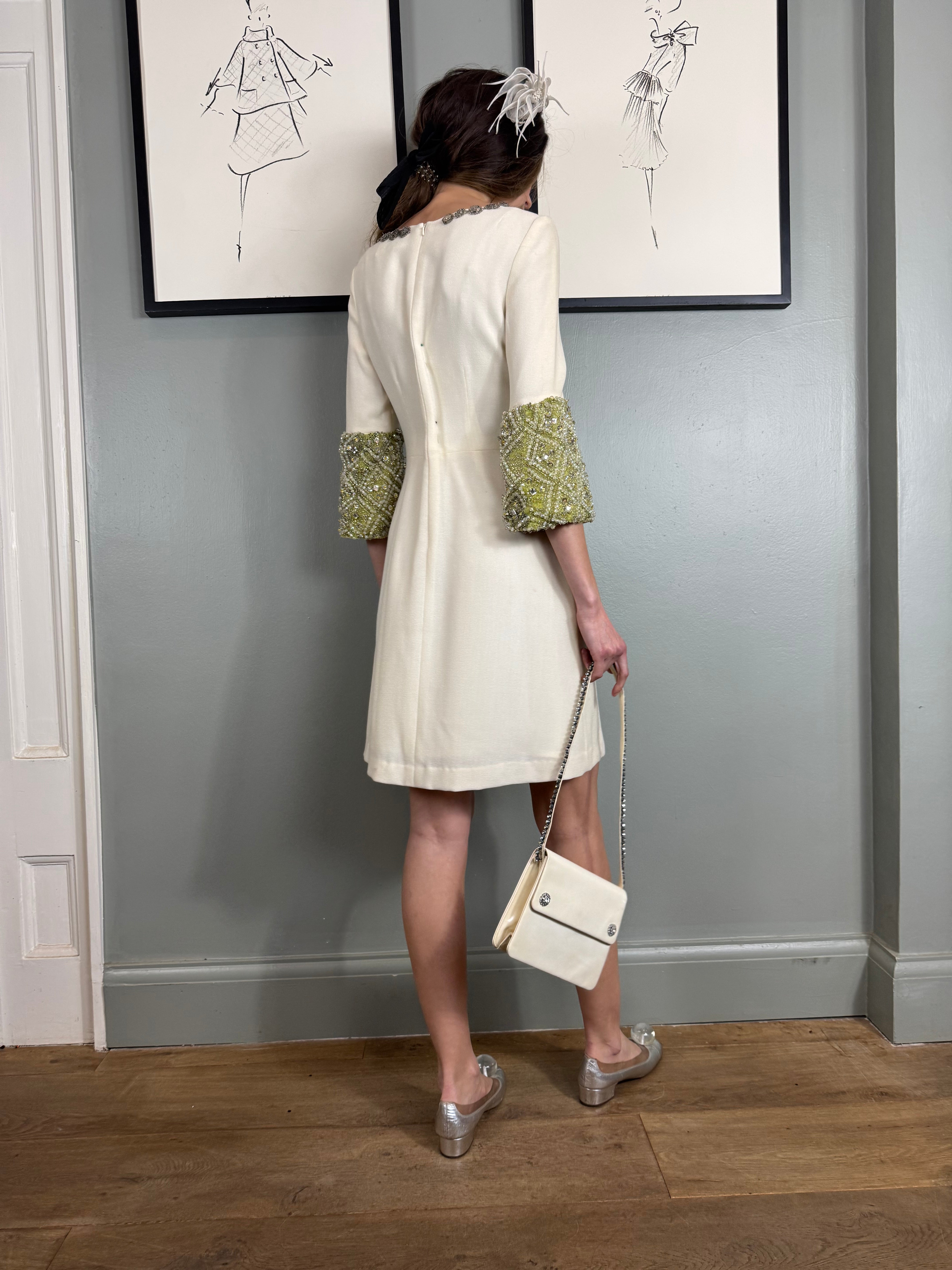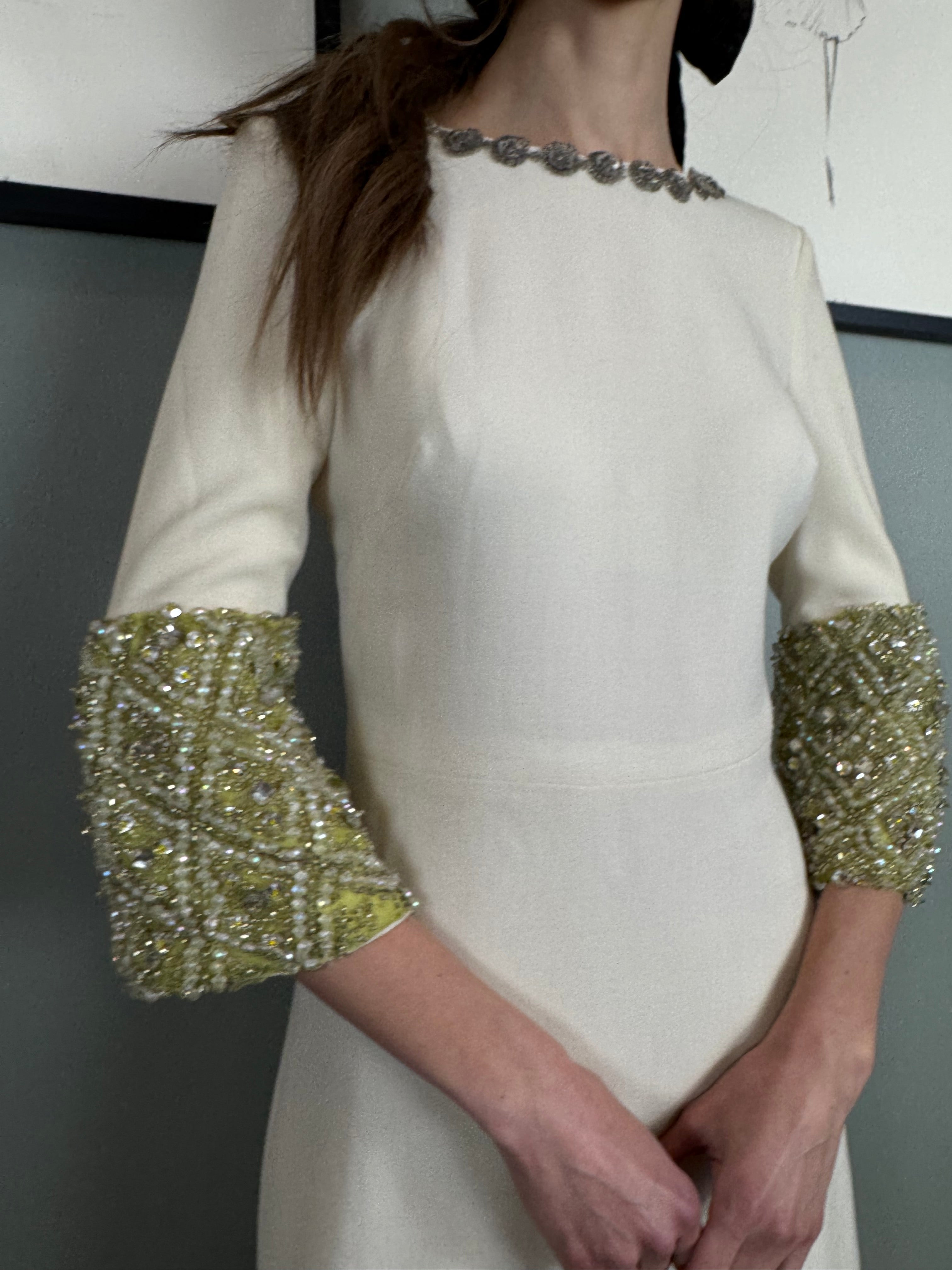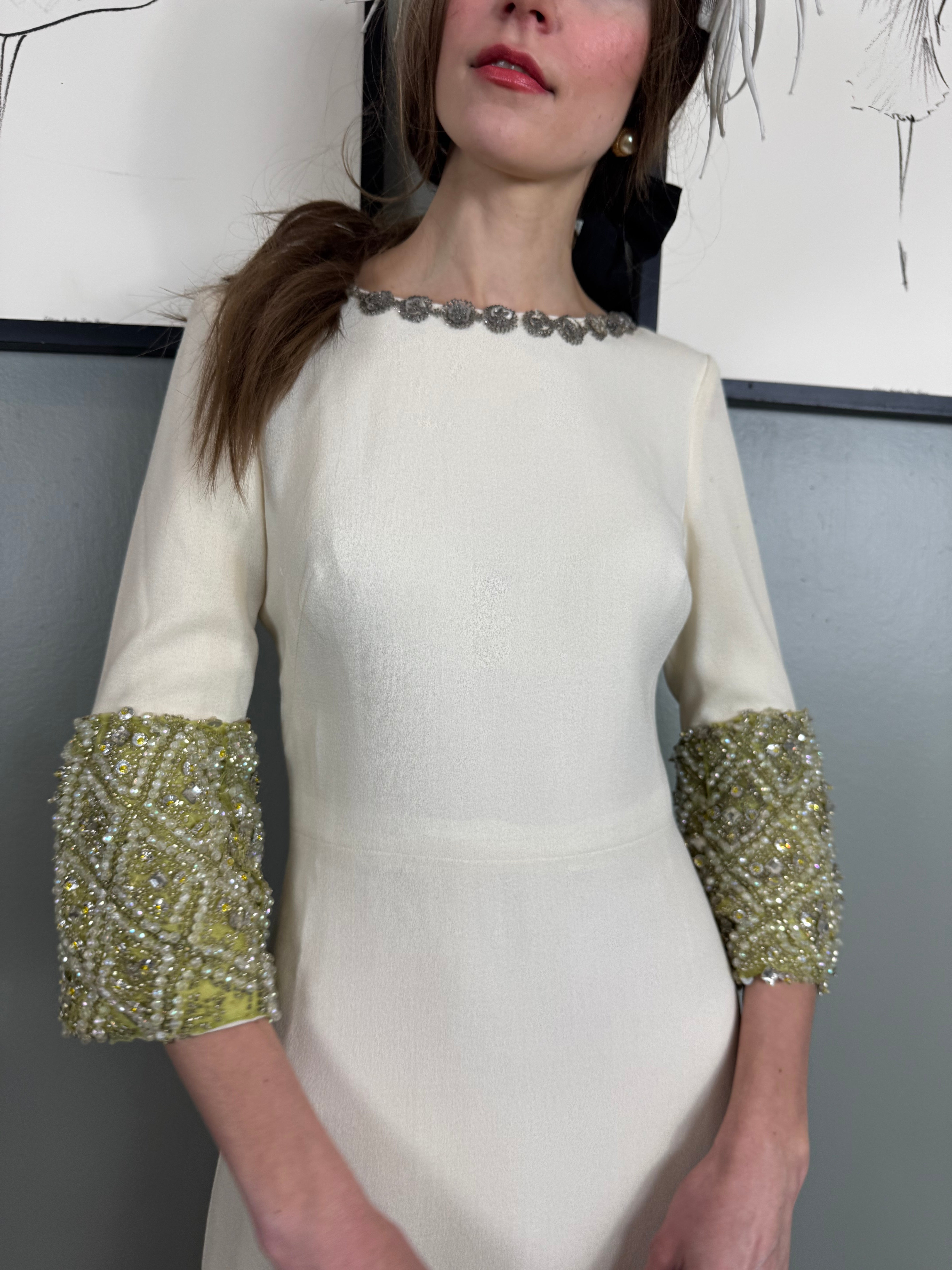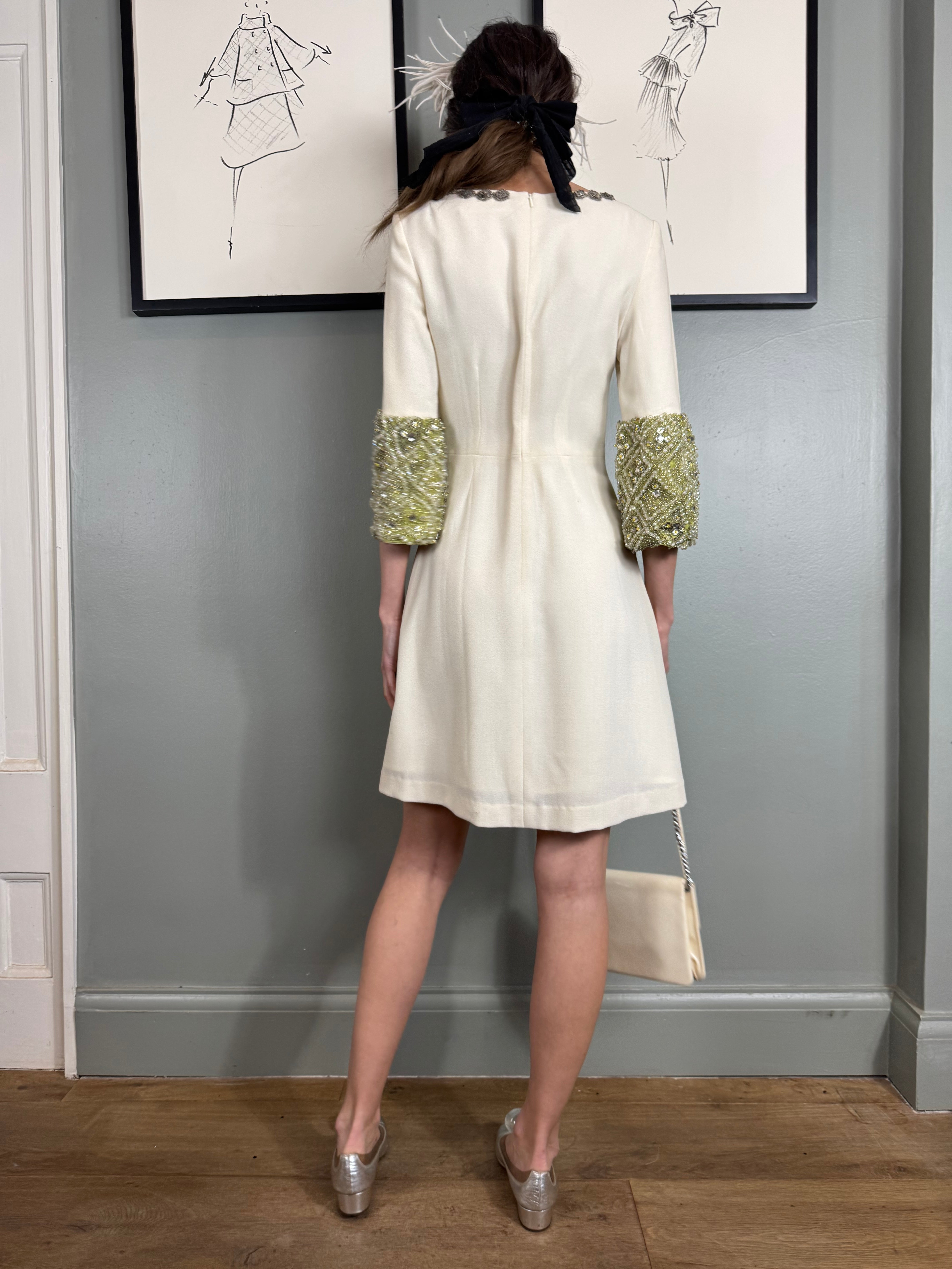 Introducing the Anais, Jane Atelier Dress embellished by One Vintage. This elegant cream A-line dress features retro details such as flared sleeves and a round neckline, elevated by the charming embellishments of 60s bedding on the collar and sleeves. Made from high-quality crepe, this dress is perfect for any special event.