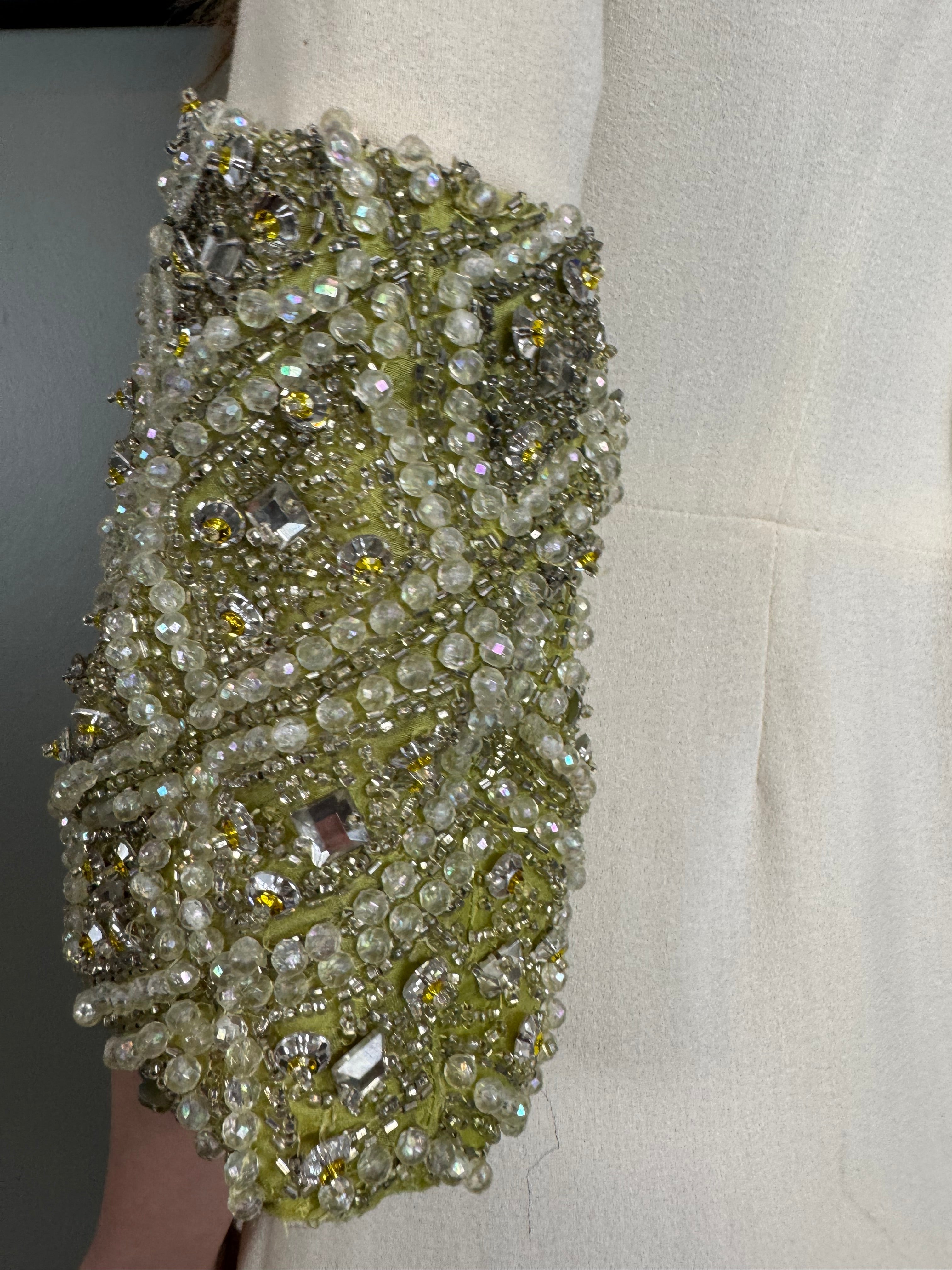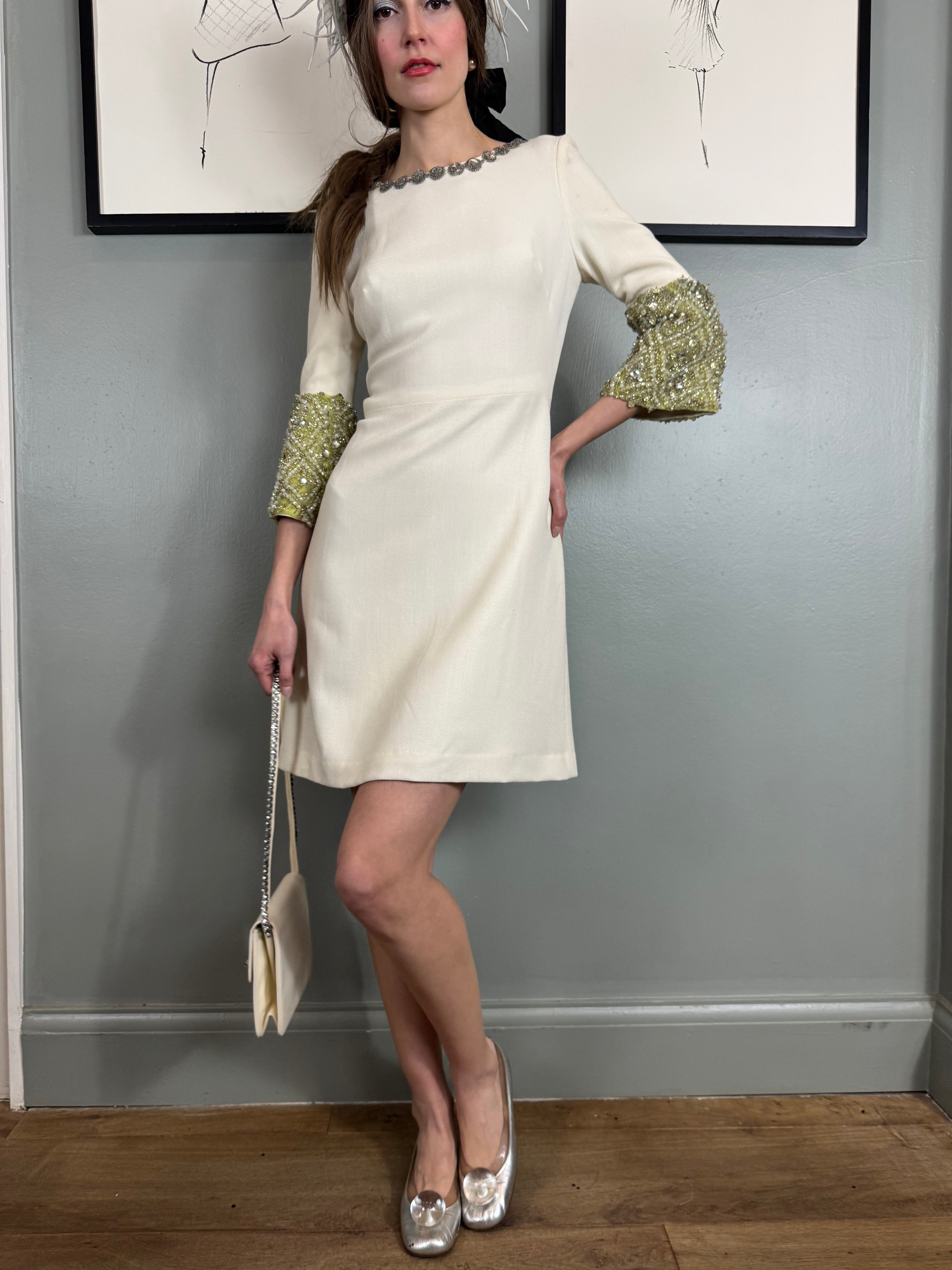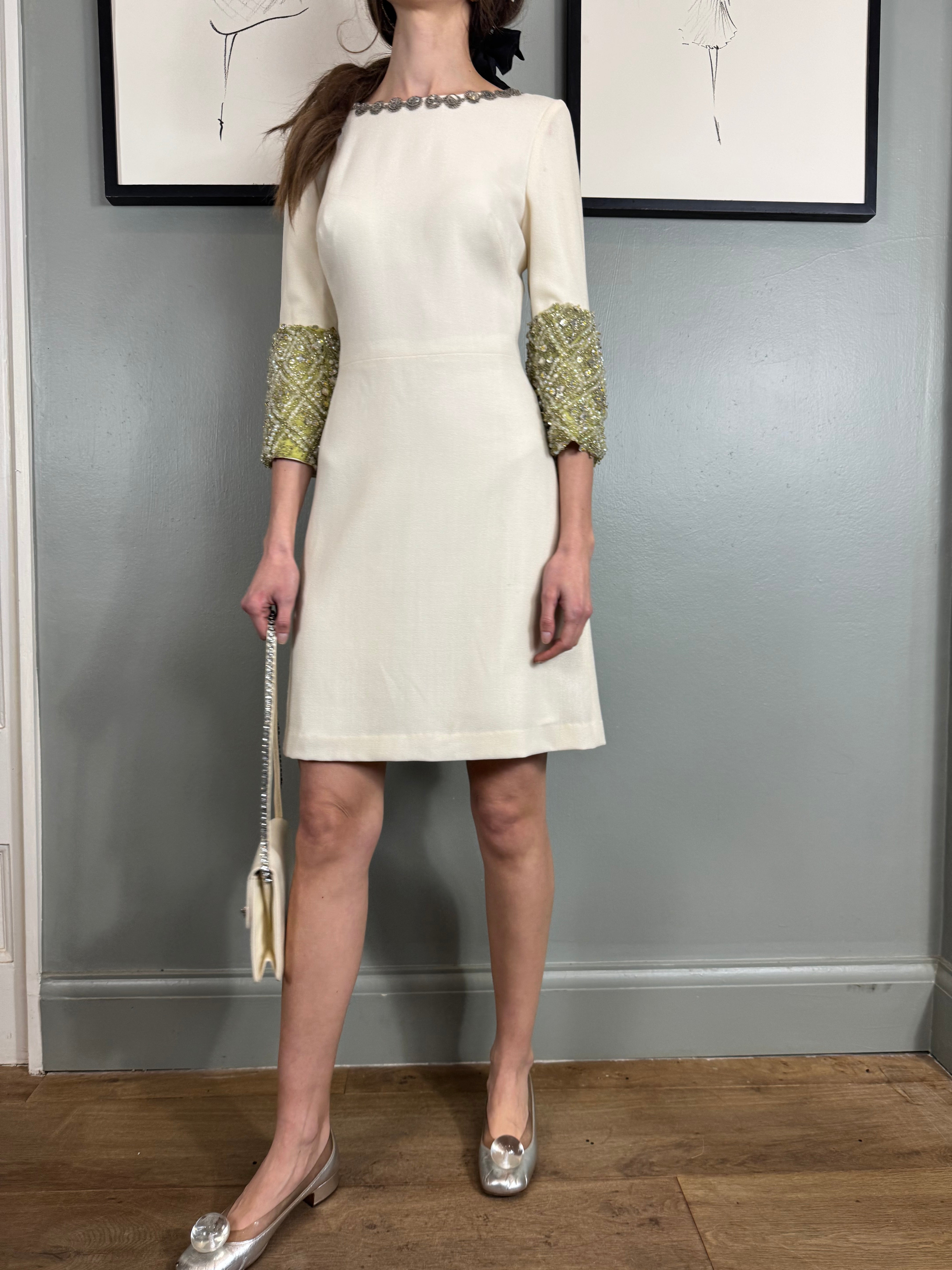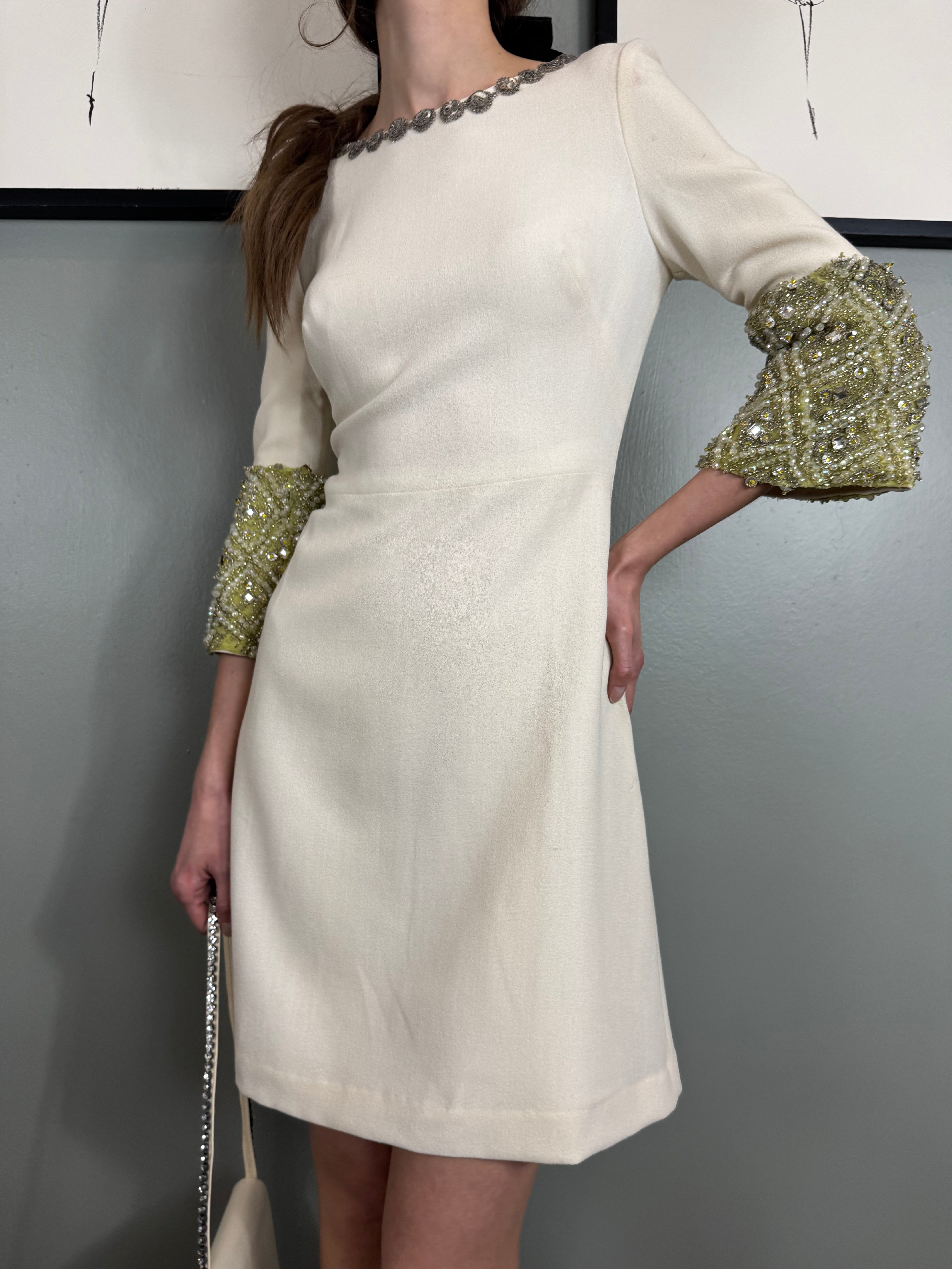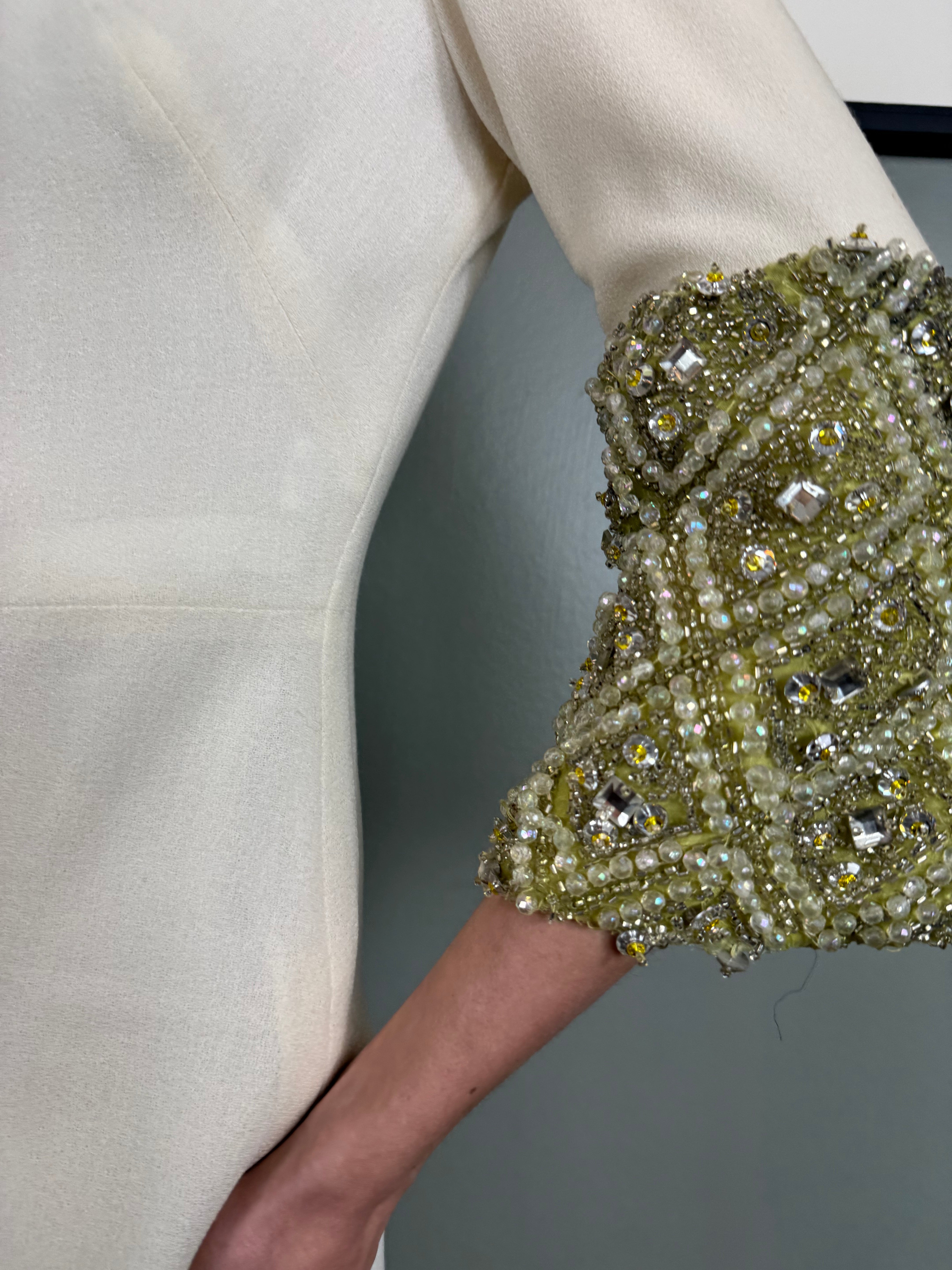 Introducing the Anais, Jane Atelier Dress embellished by One Vintage. This elegant cream A-line dress features retro details such as flared sleeves and a round neckline, elevated by the charming embellishments of 60s bedding on the collar and sleeves. Made from high-quality crepe, this dress is perfect for any special event.