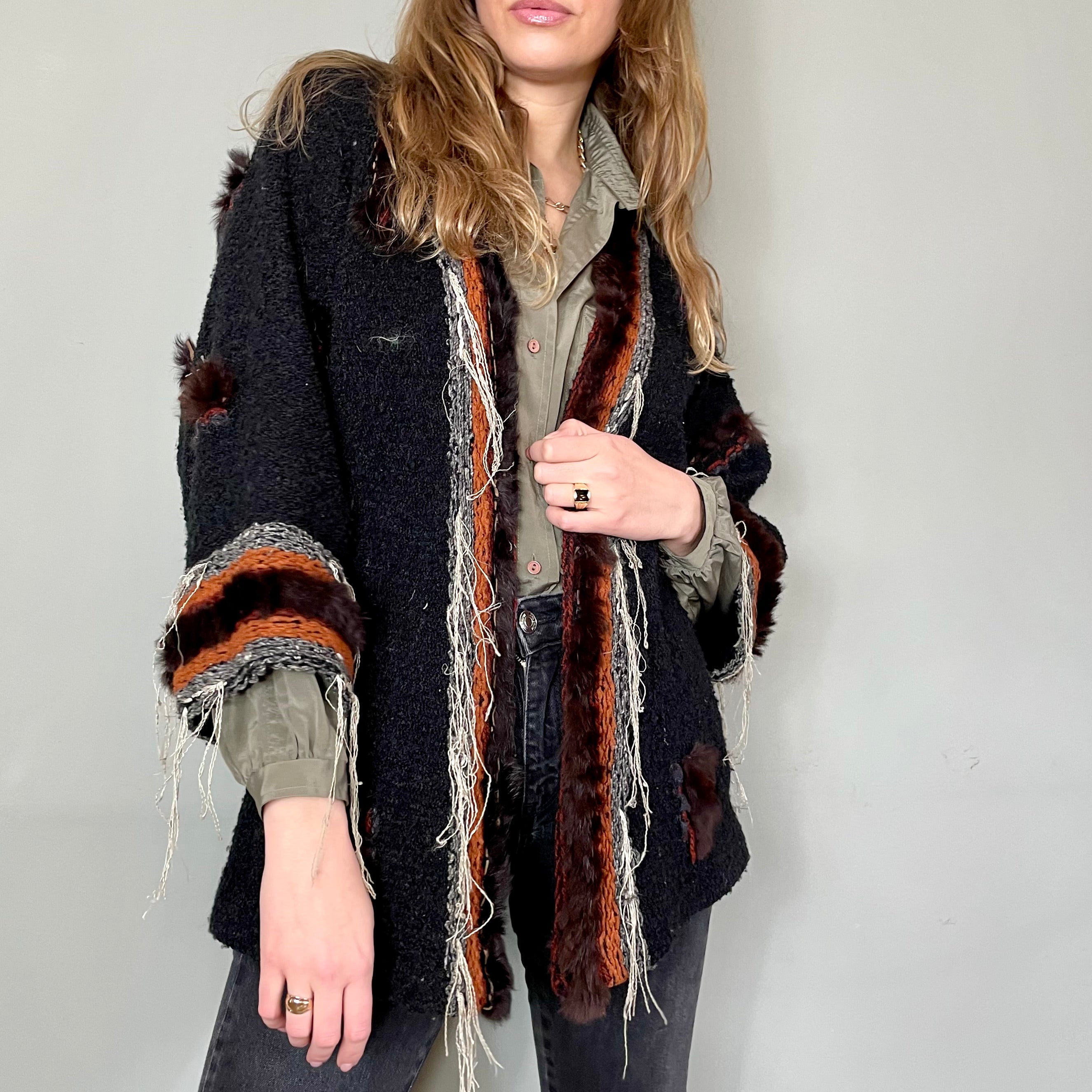 Incredible vintage cardigan made from soft wool, cashmere and faux fur trim. This design is a handmade vintage modernist dream. Has a loose fitted tassel fringe throughout and woven faux fur trim. Has two side pockets and looks wonderful paired down and belted. A true one off.