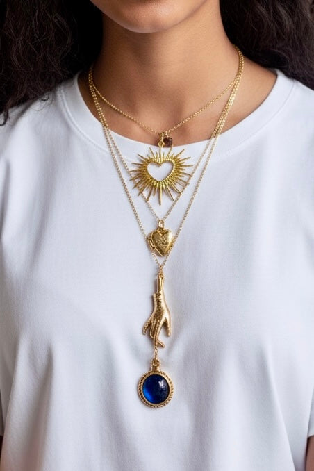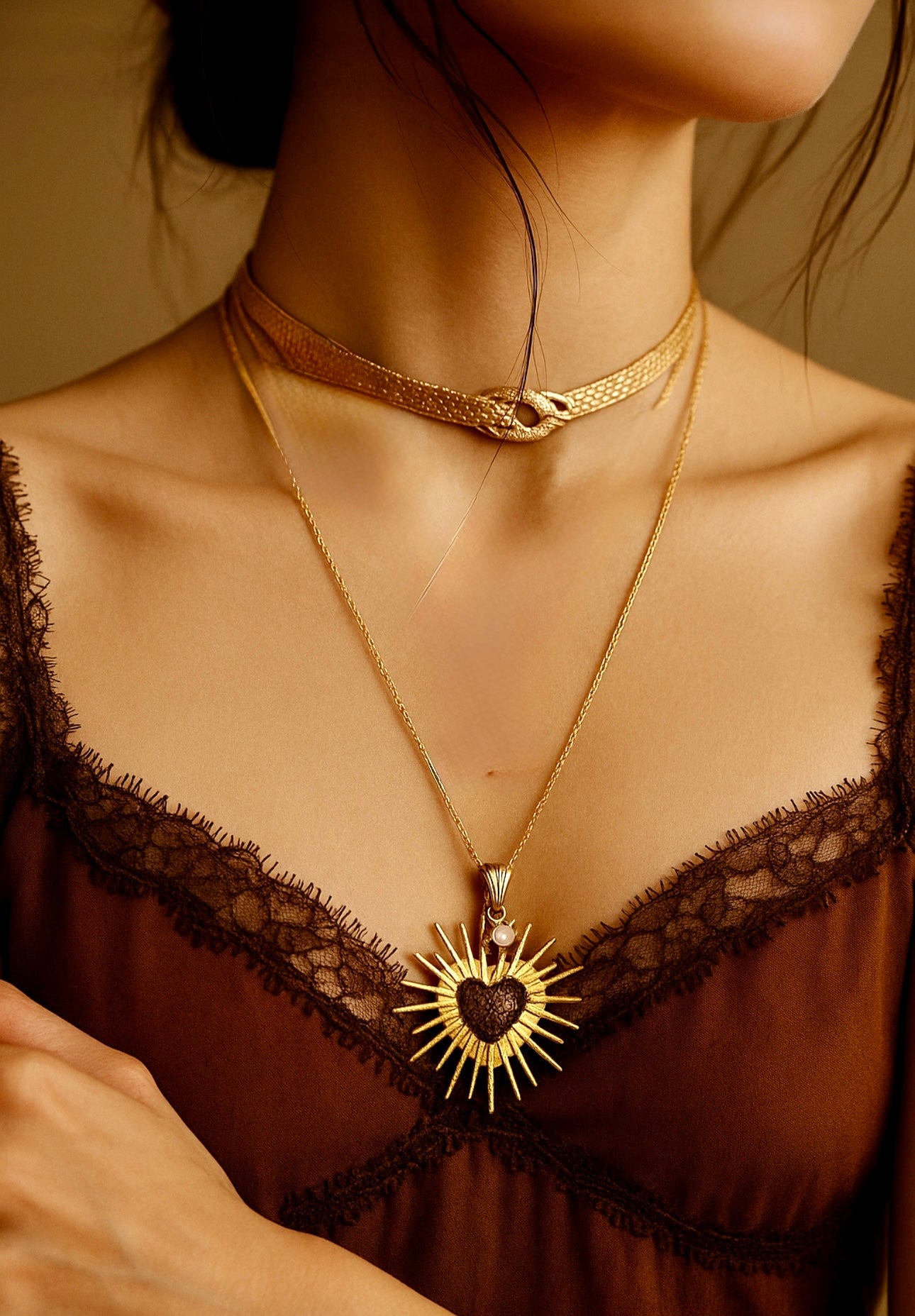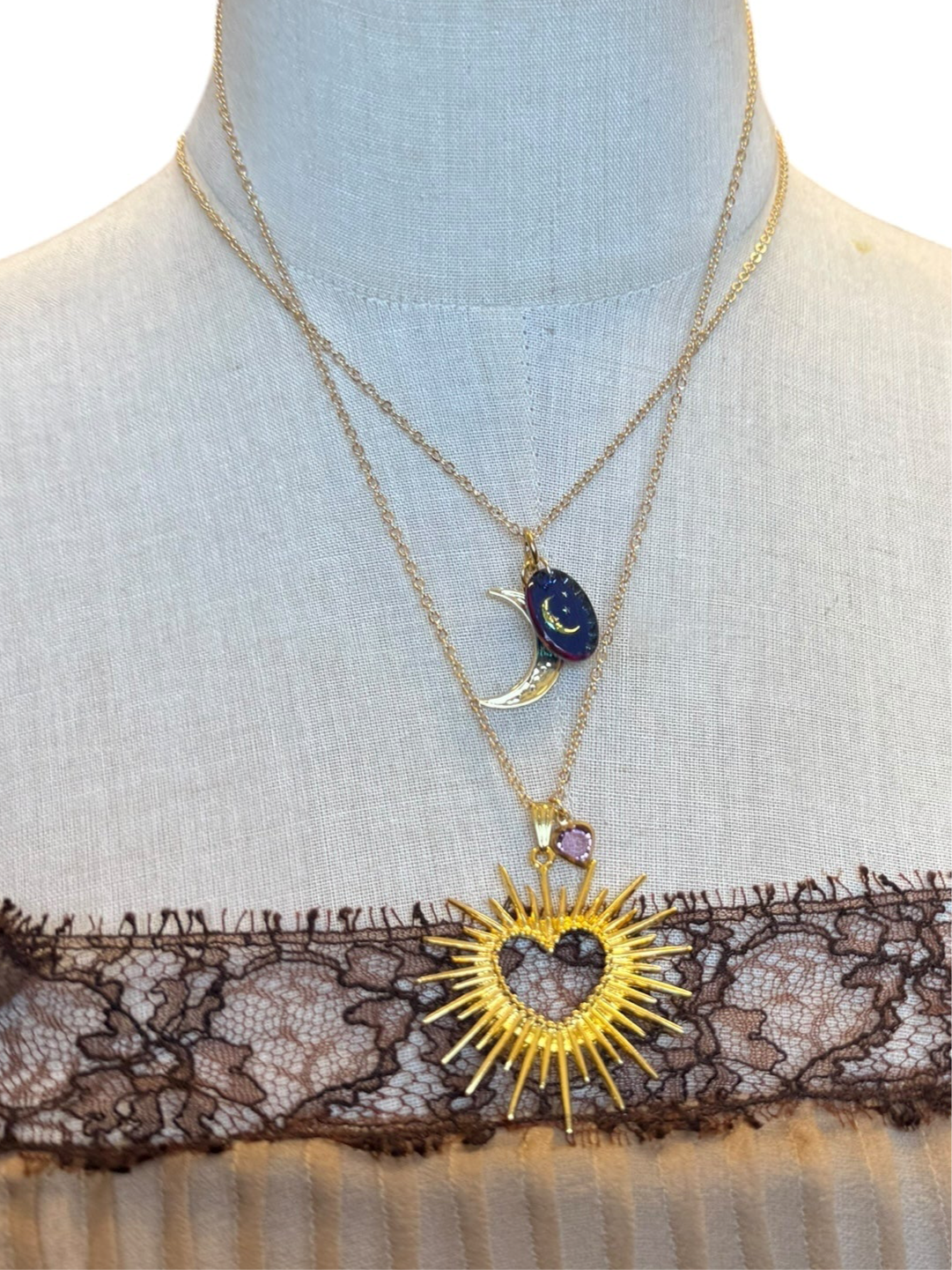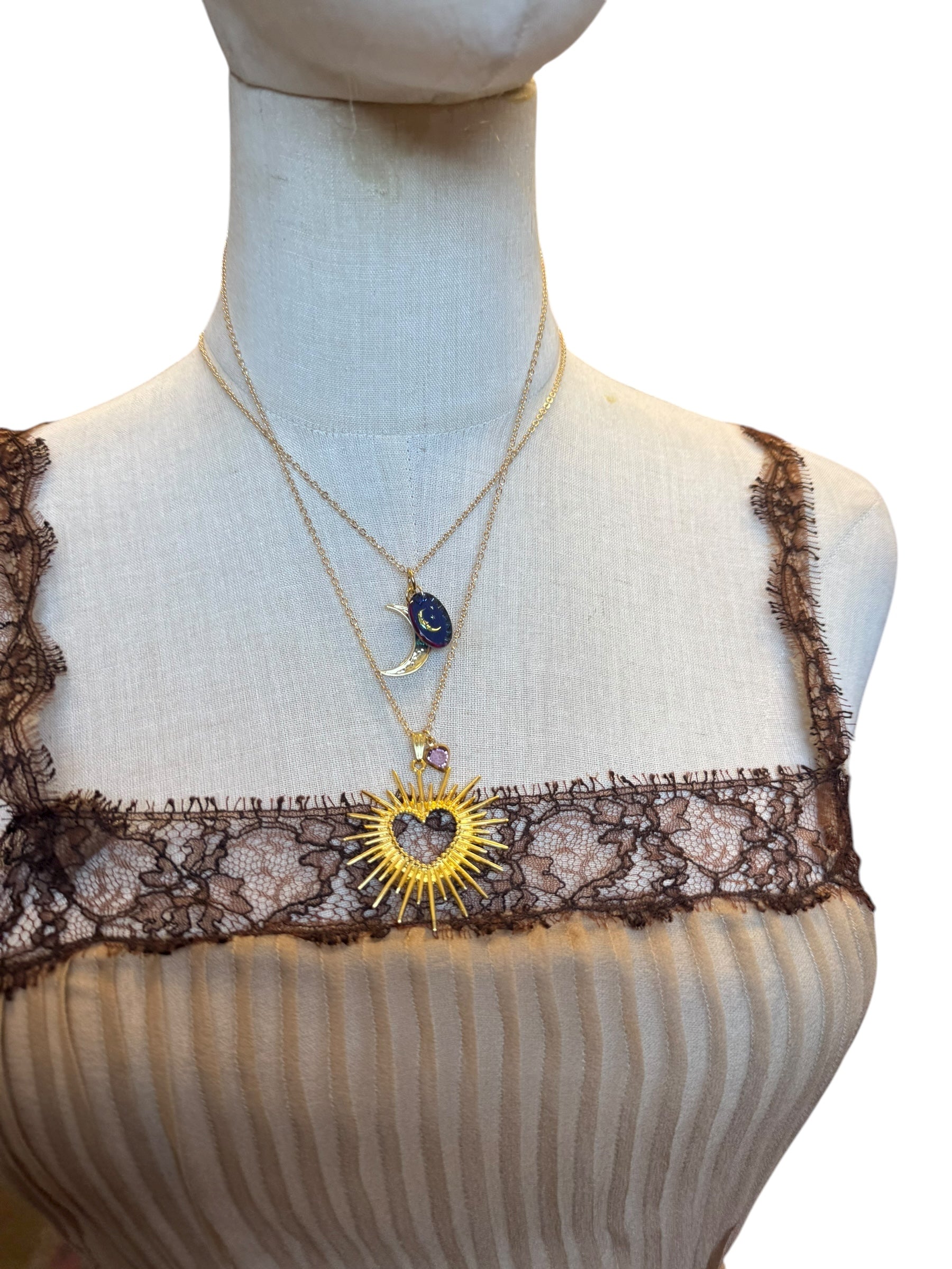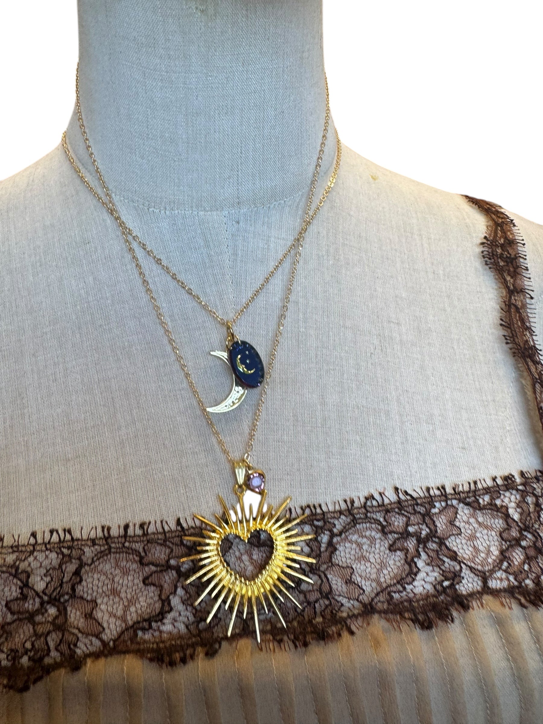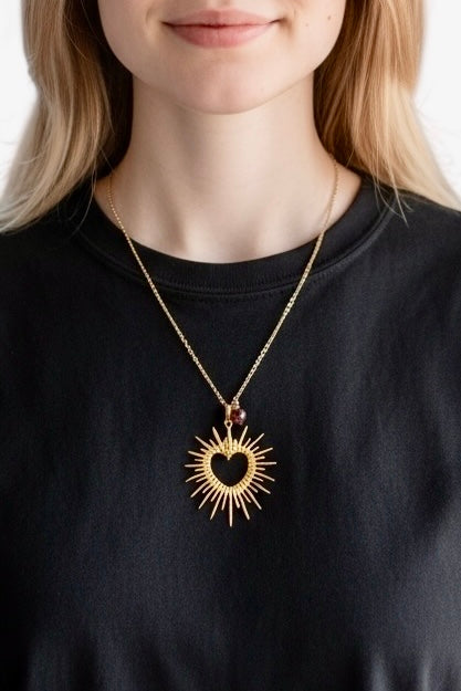 Introducing a stunning handpicked vintage 14 carat gold plated heart burst charm necklace. With a charming  delicate gold droplet, it makes the perfect addition to your jewelry stacking. The adjustable 14 carat gold chain allows for versatile styling options.