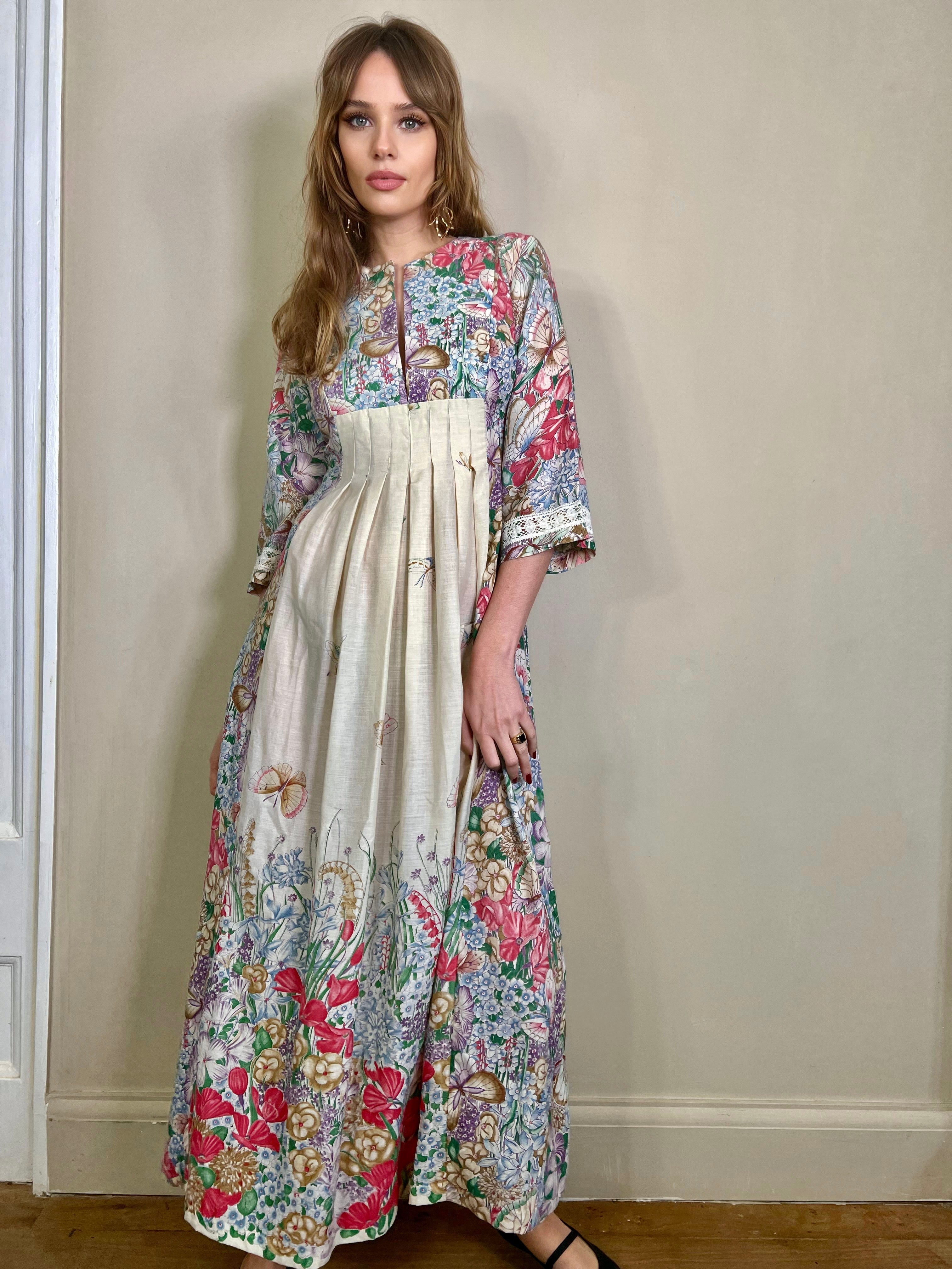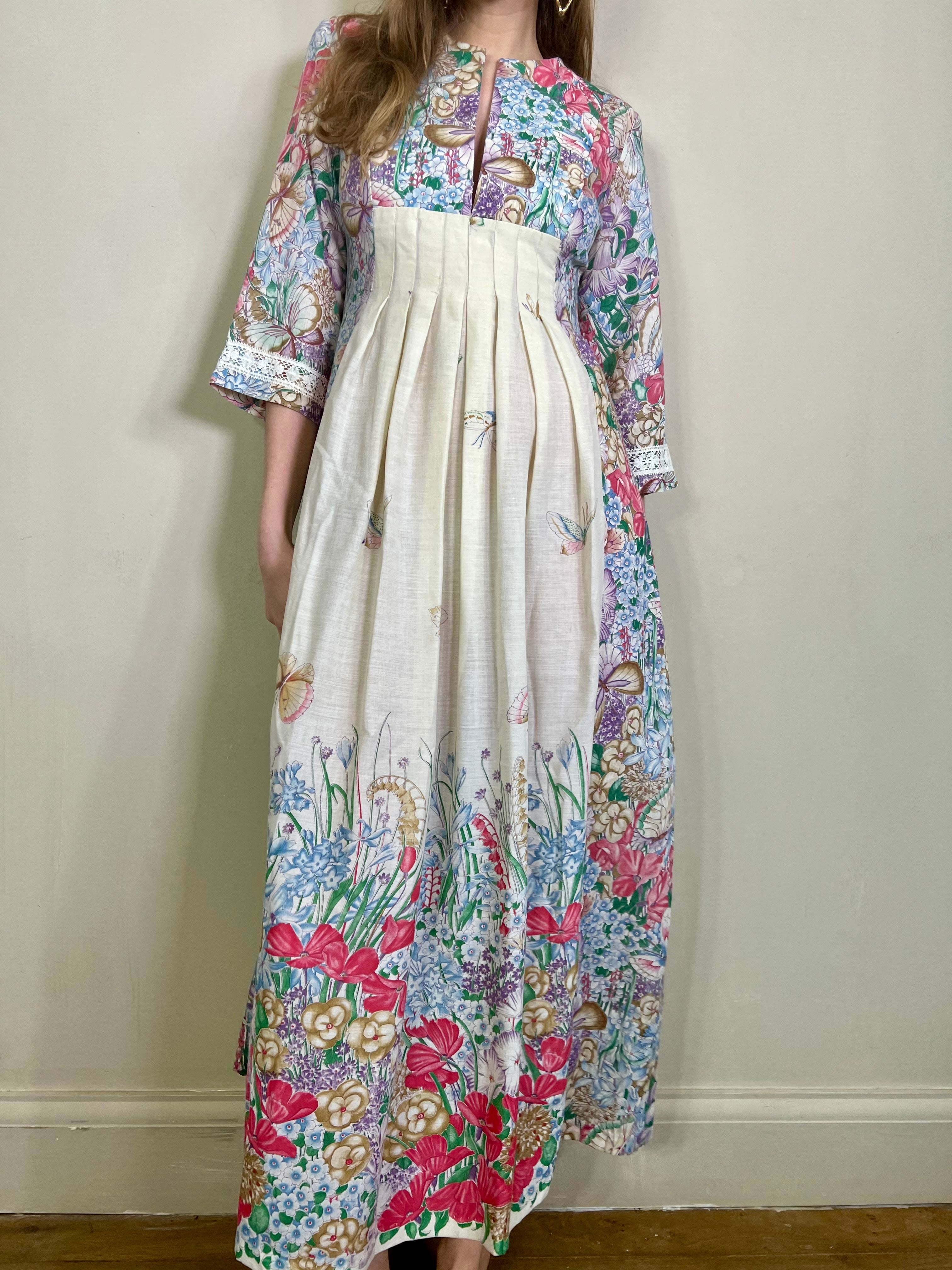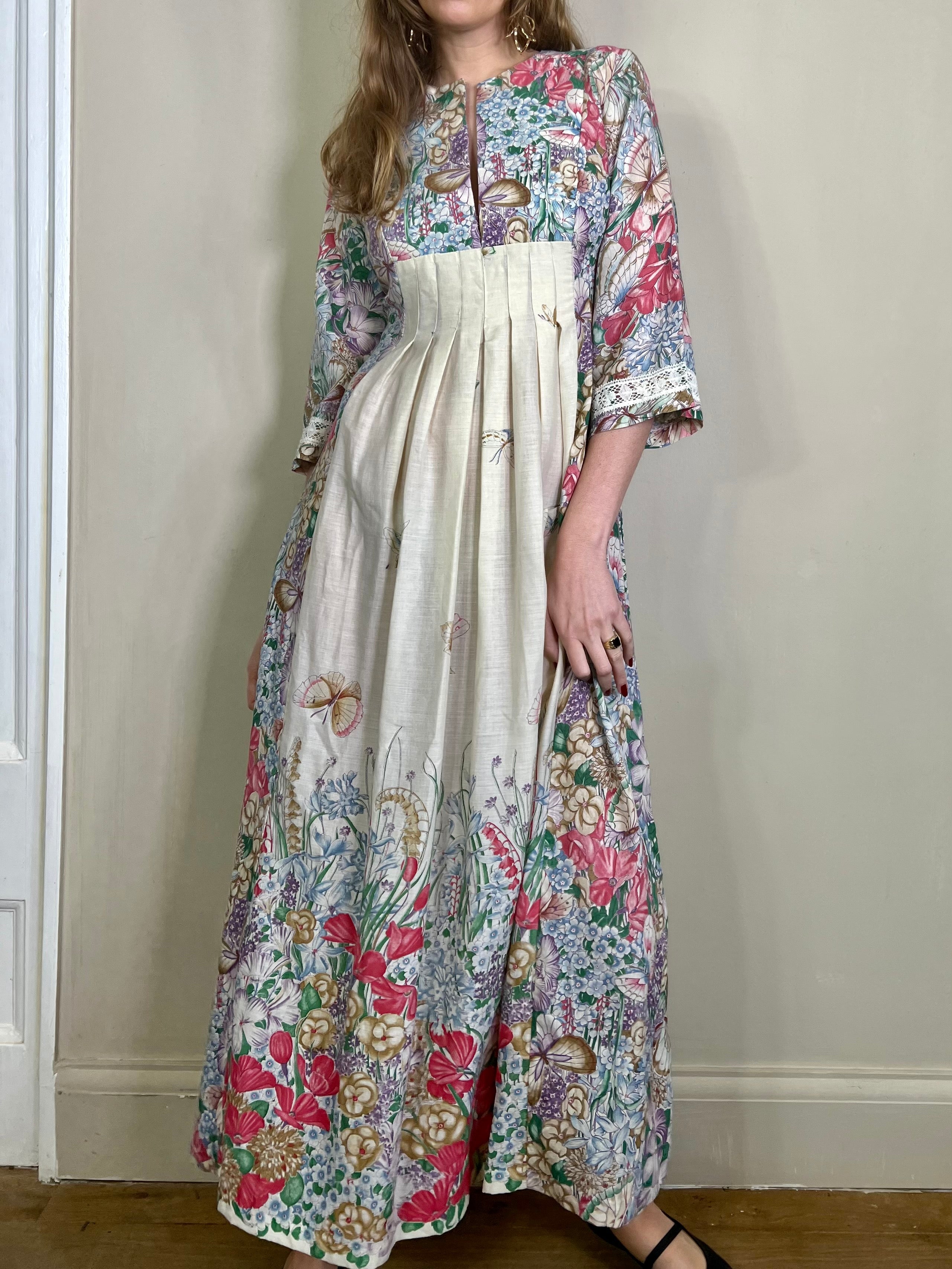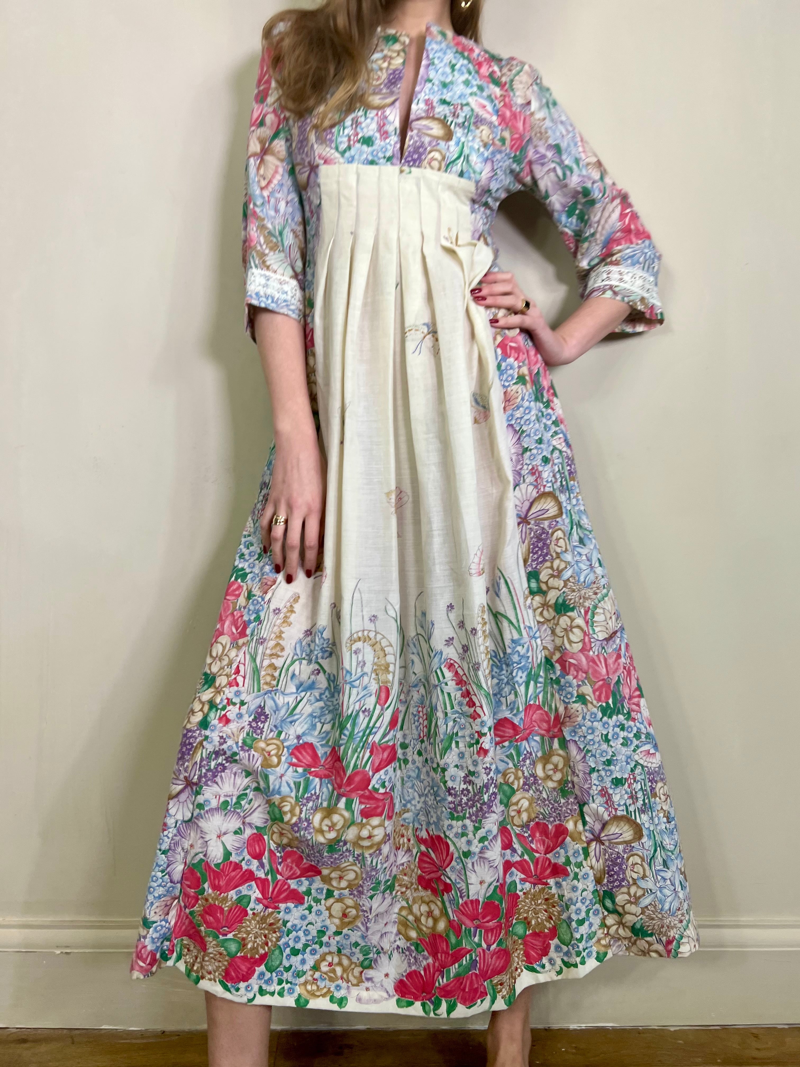 Incredible 70s cotton dress in the most glorious placement of floral print I've ever seen. Has a dense floral print bust, full back and bottom hem, slowly blooming up the front of the dress. Really quite something depicting a magic garden with flying butterflies. Has 3/4 length sleeves. The fit is snug on the bust and waist with a sewn down pleated design on the front. Zips on the back and falls to the floor.