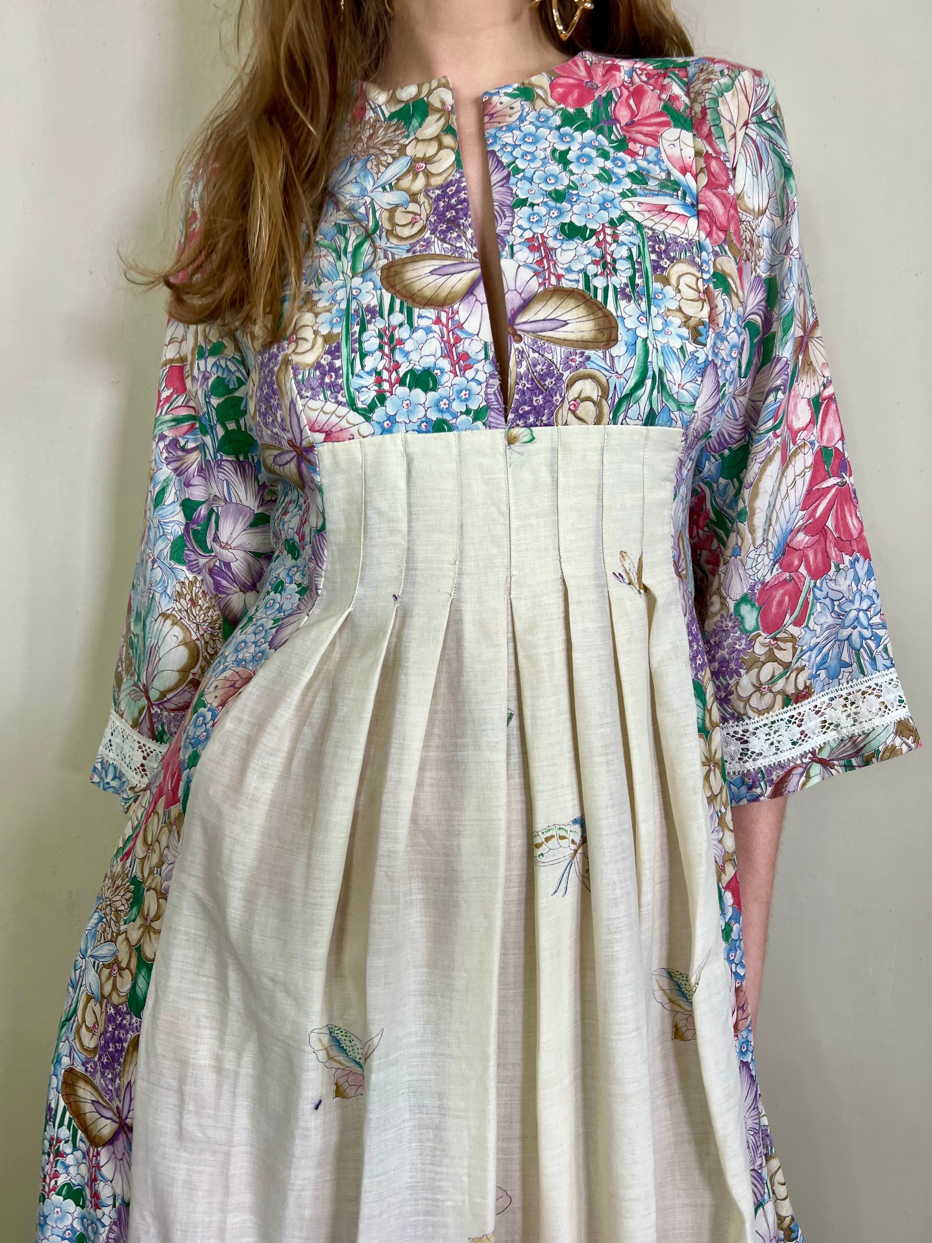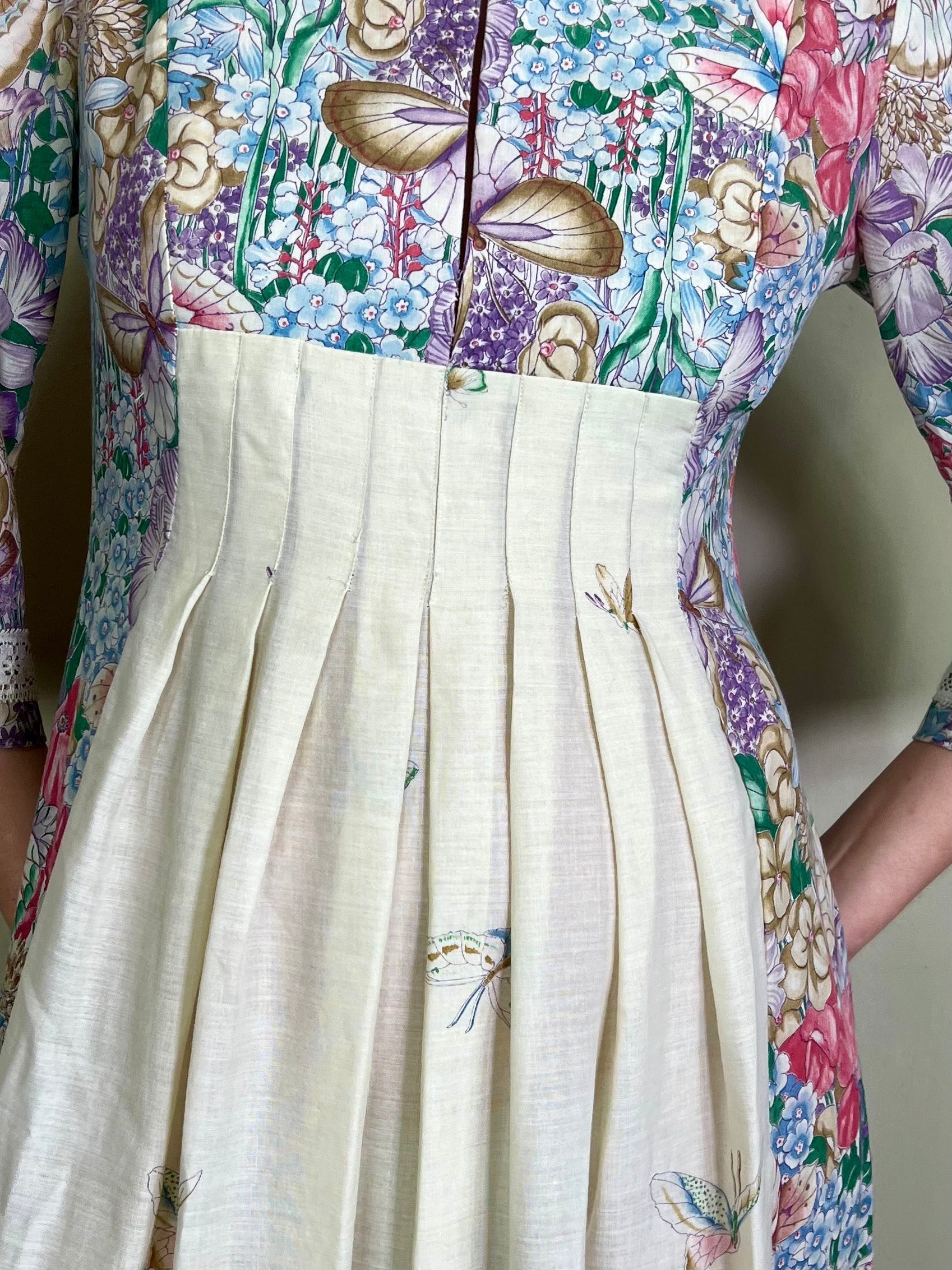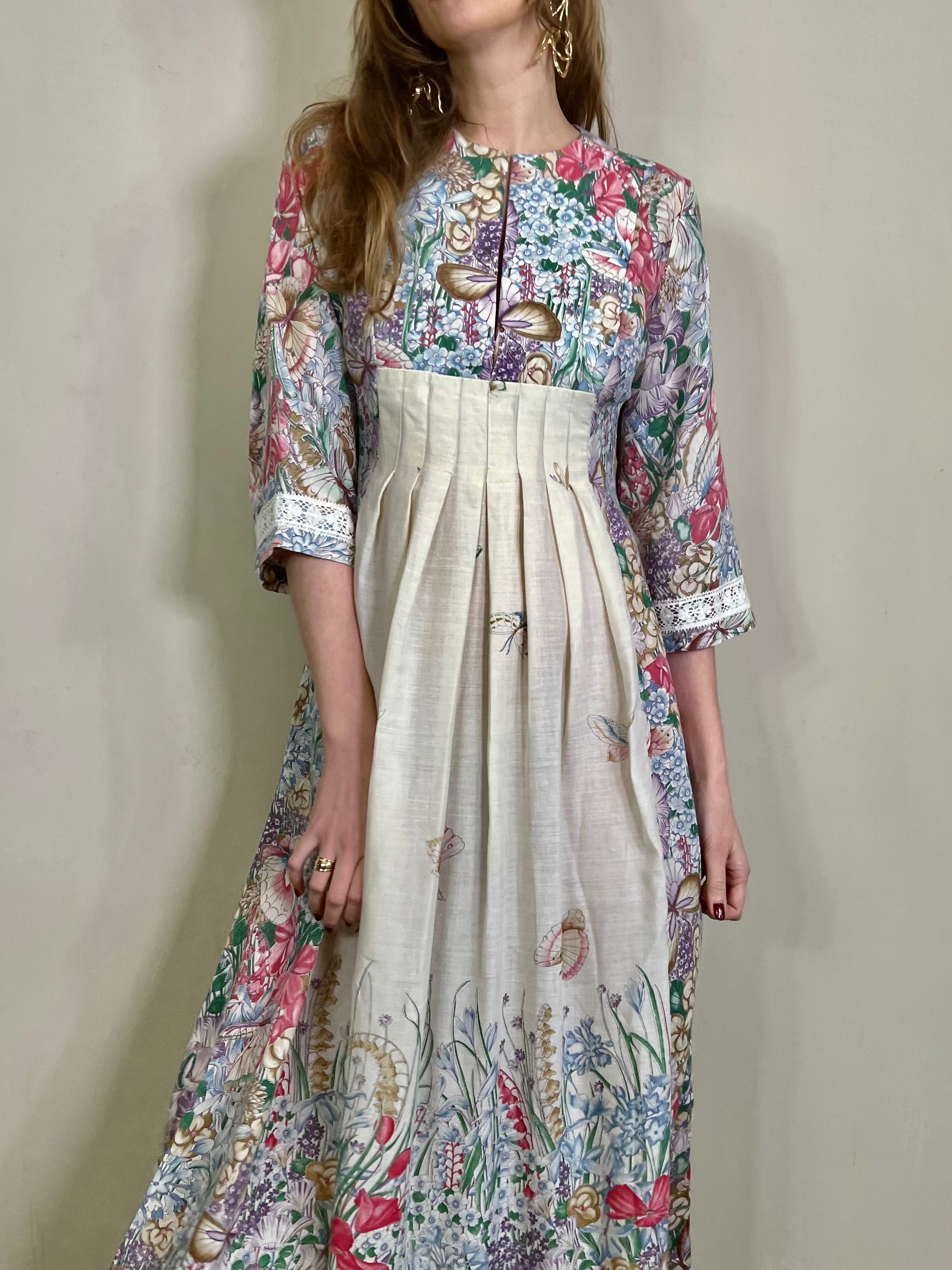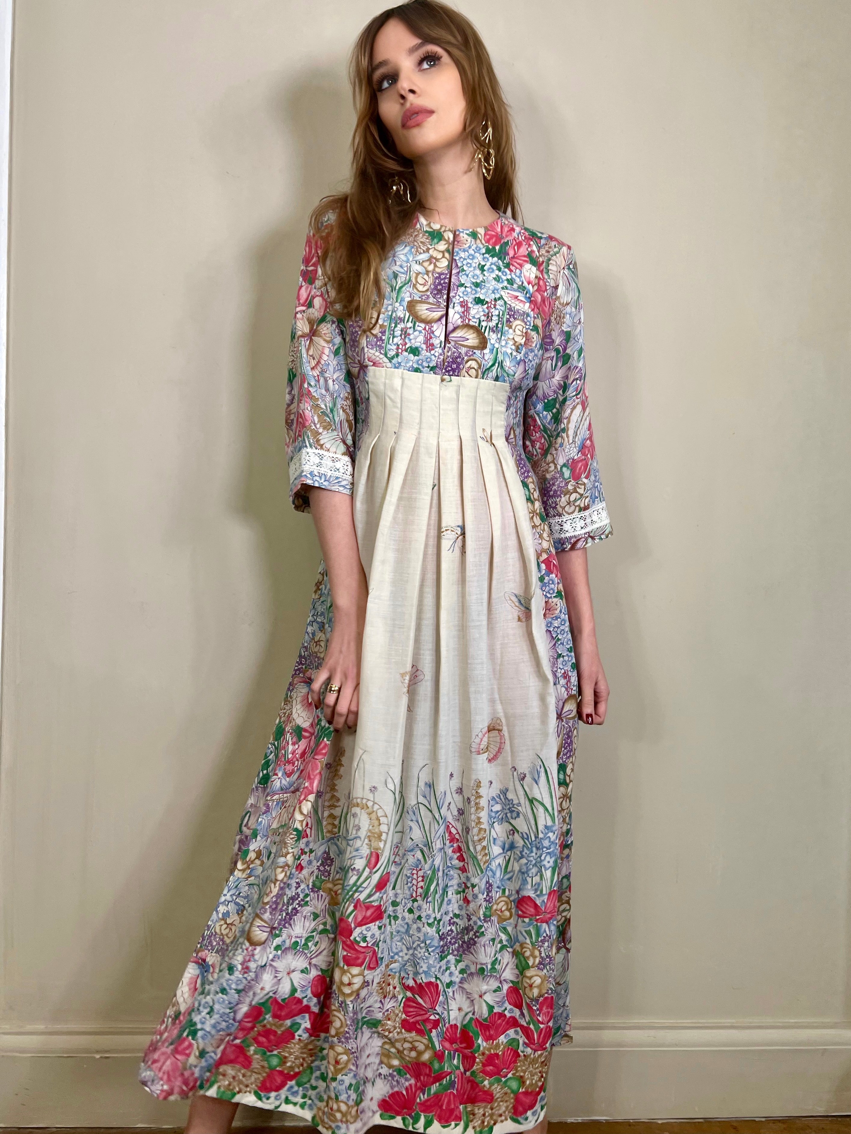 Incredible 70s cotton dress in the most glorious placement of floral print I've ever seen. Has a dense floral print bust, full back and bottom hem, slowly blooming up the front of the dress. Really quite something depicting a magic garden with flying butterflies. Has 3/4 length sleeves. The fit is snug on the bust and waist with a sewn down pleated design on the front. Zips on the back and falls to the floor.