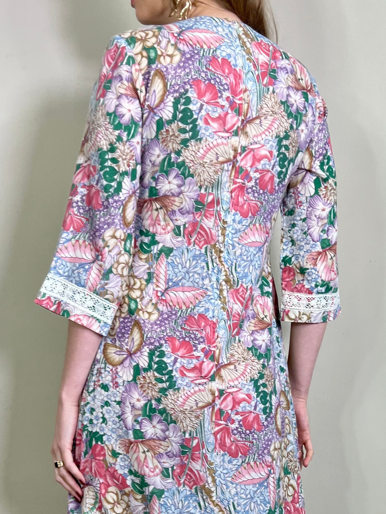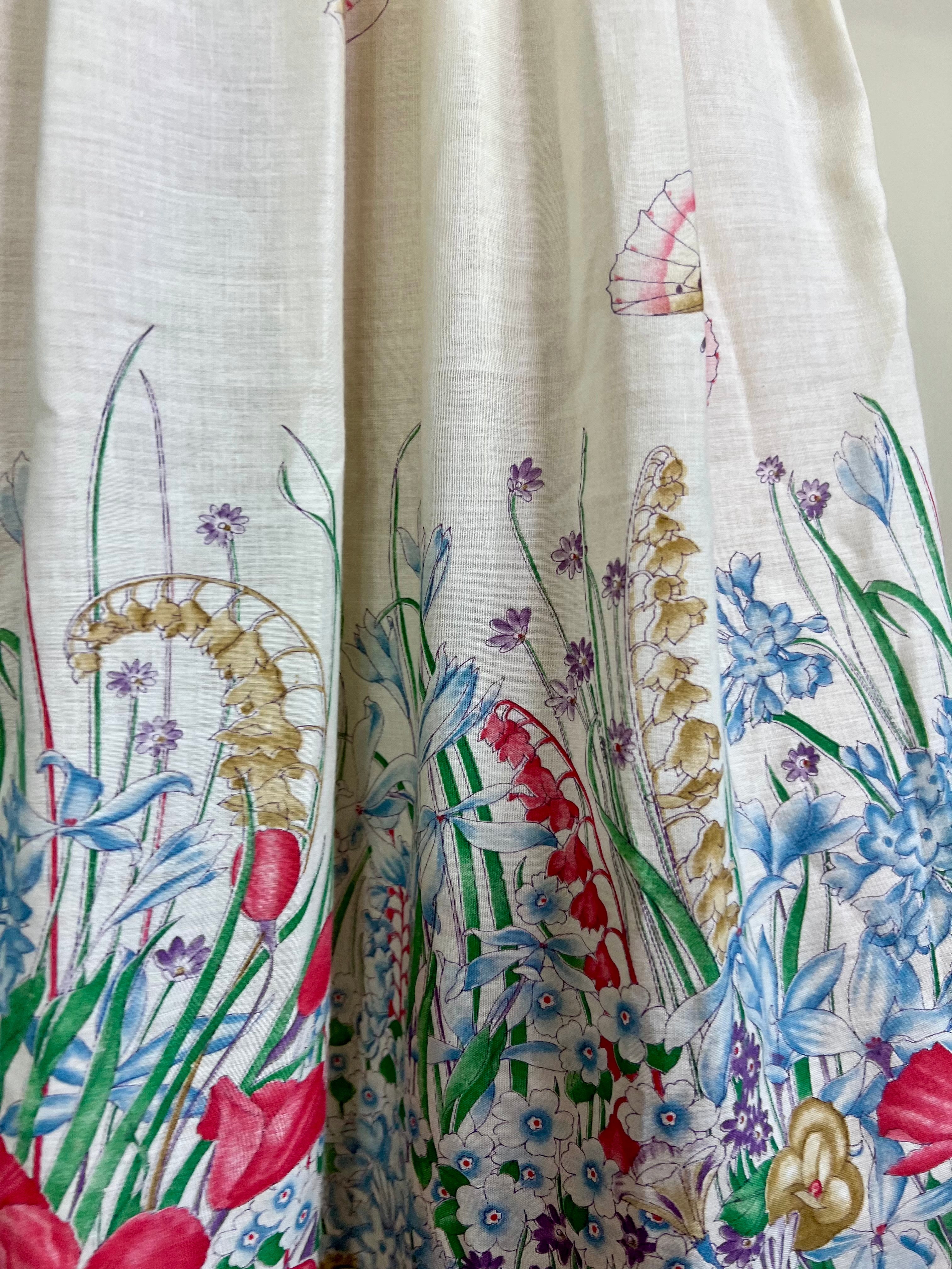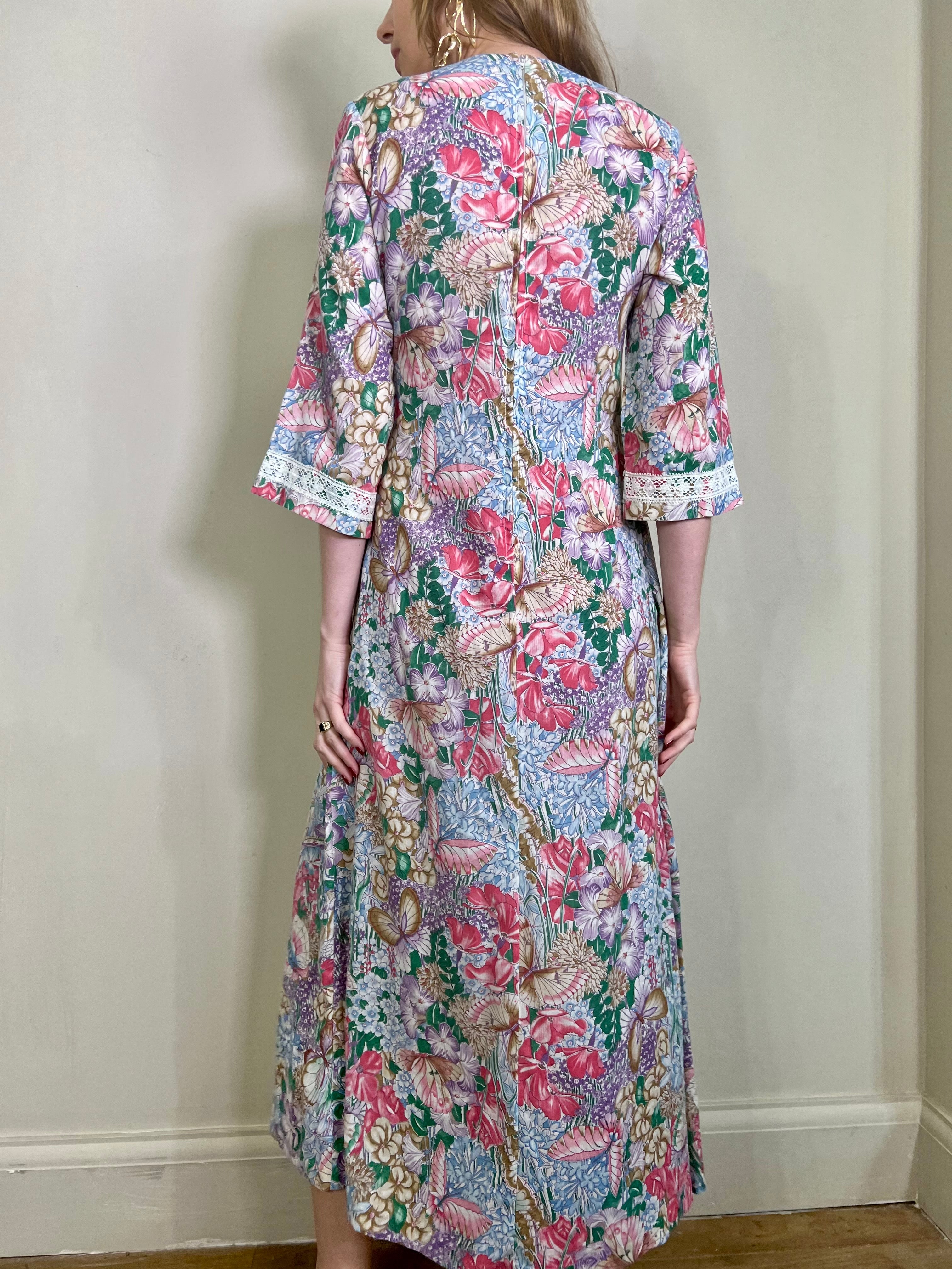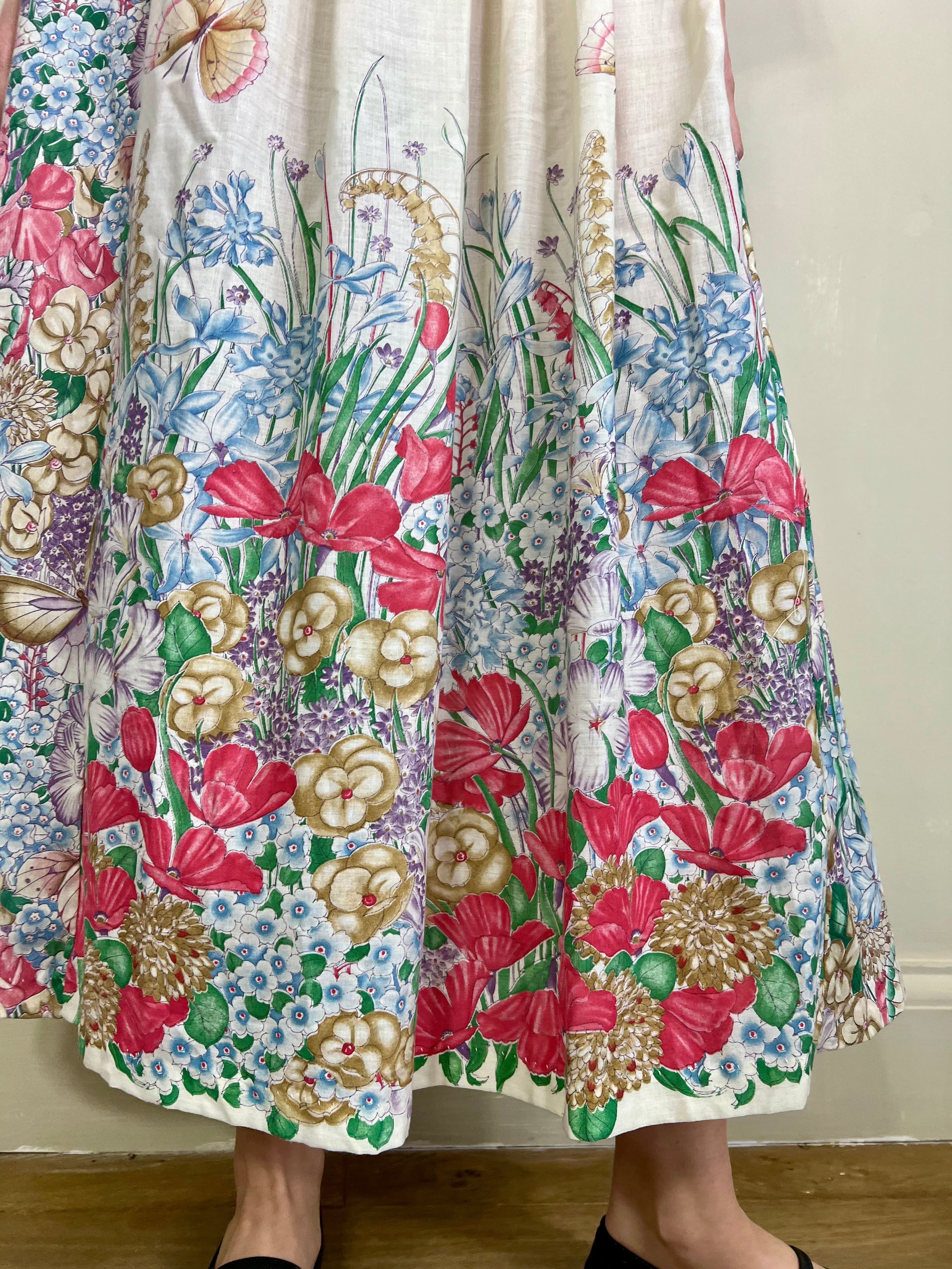 Incredible 70s cotton dress in the most glorious placement of floral print I've ever seen. Has a dense floral print bust, full back and bottom hem, slowly blooming up the front of the dress. Really quite something depicting a magic garden with flying butterflies. Has 3/4 length sleeves. The fit is snug on the bust and waist with a sewn down pleated design on the front. Zips on the back and falls to the floor.