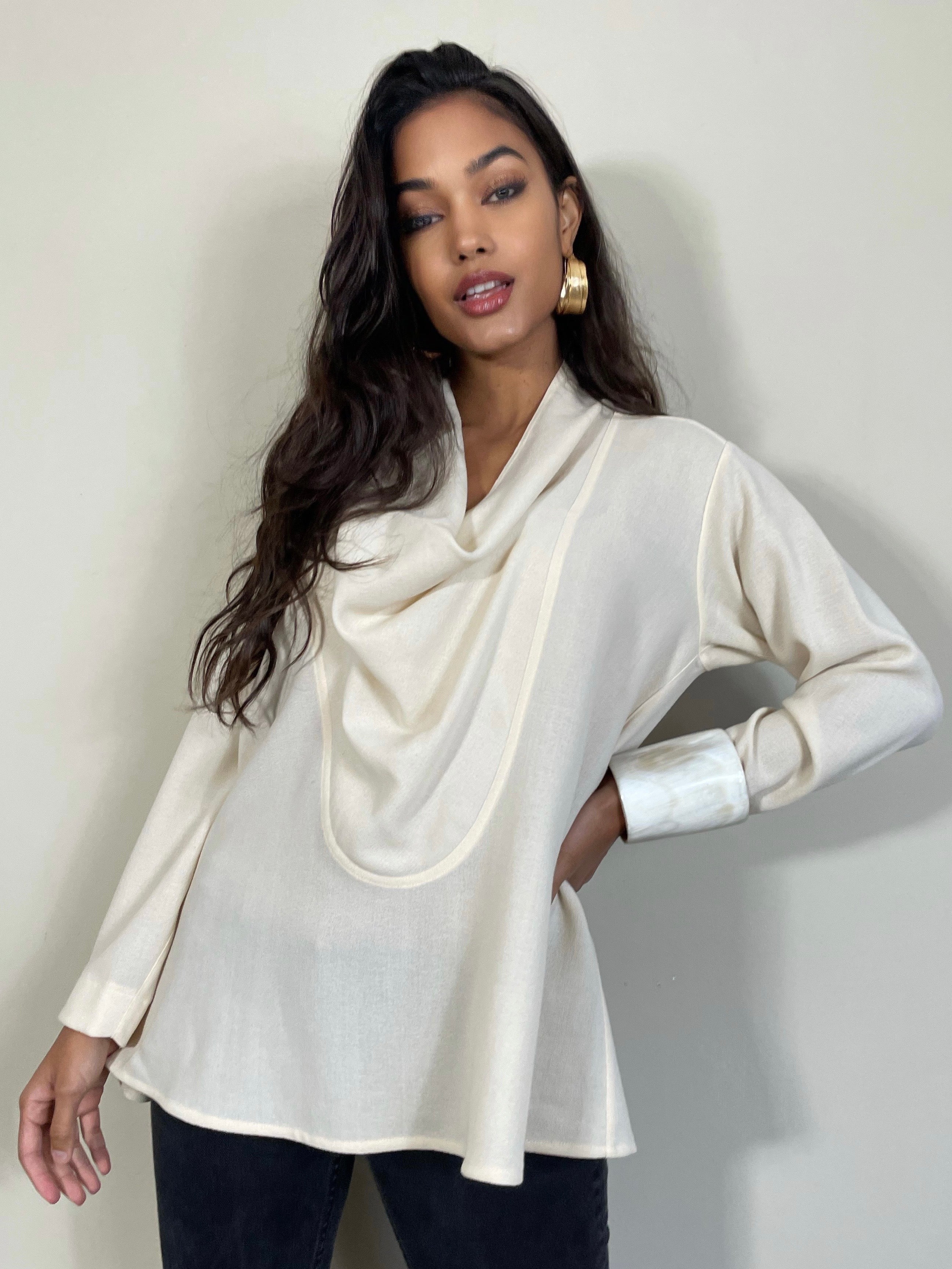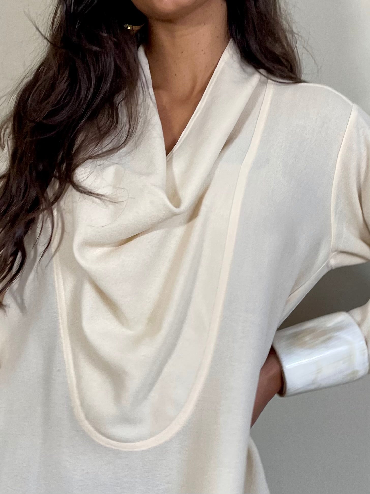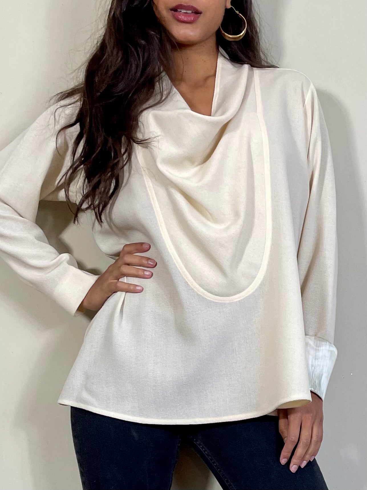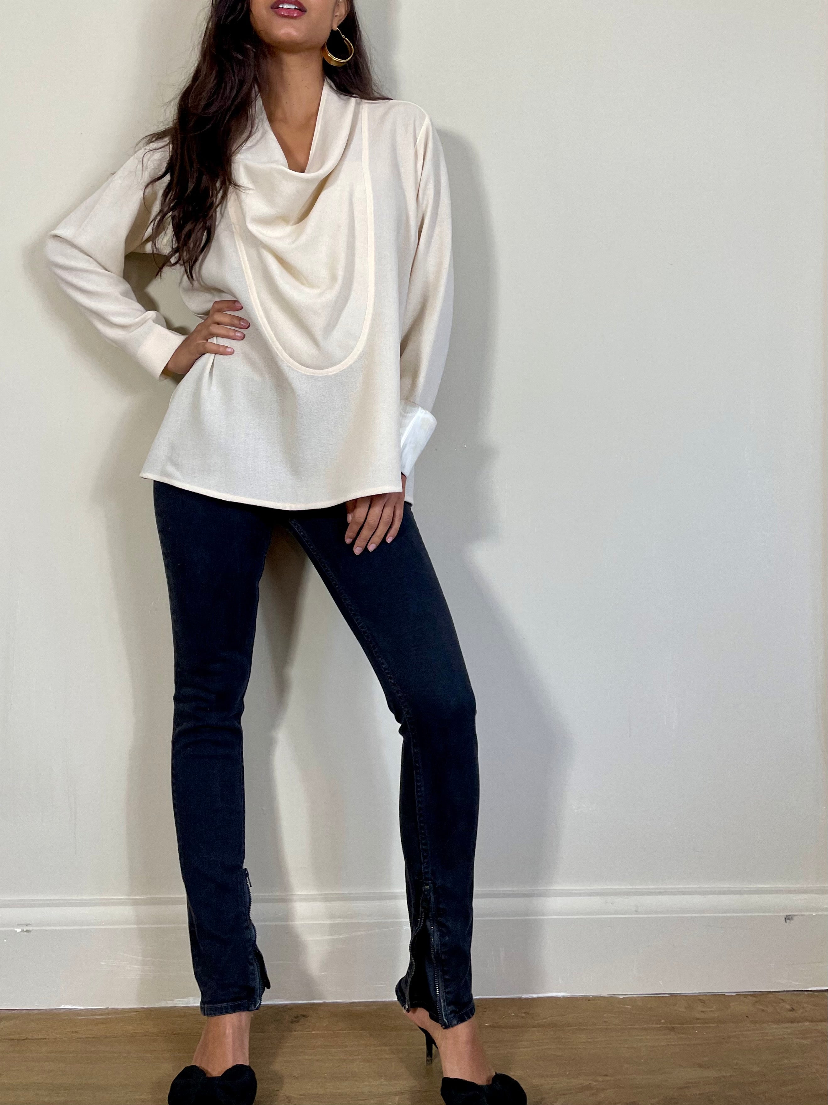 one of the chicest vintage blouses I've come across. Modern and versatile top made from a soft crepe. Has an A line fit with a cowl neck detail on front. A wonderful layering piece with flair and easy to dress up with heels or boots.