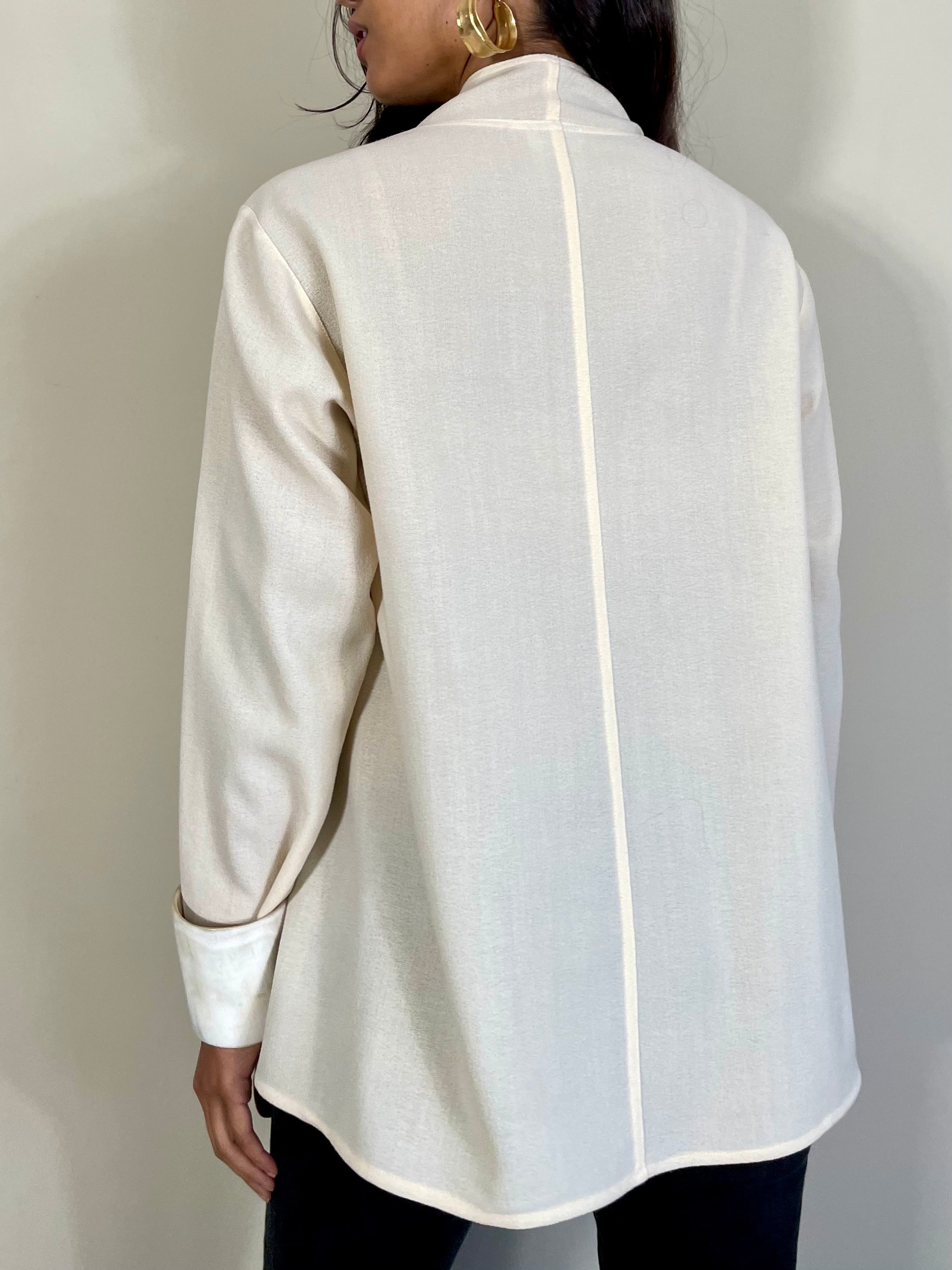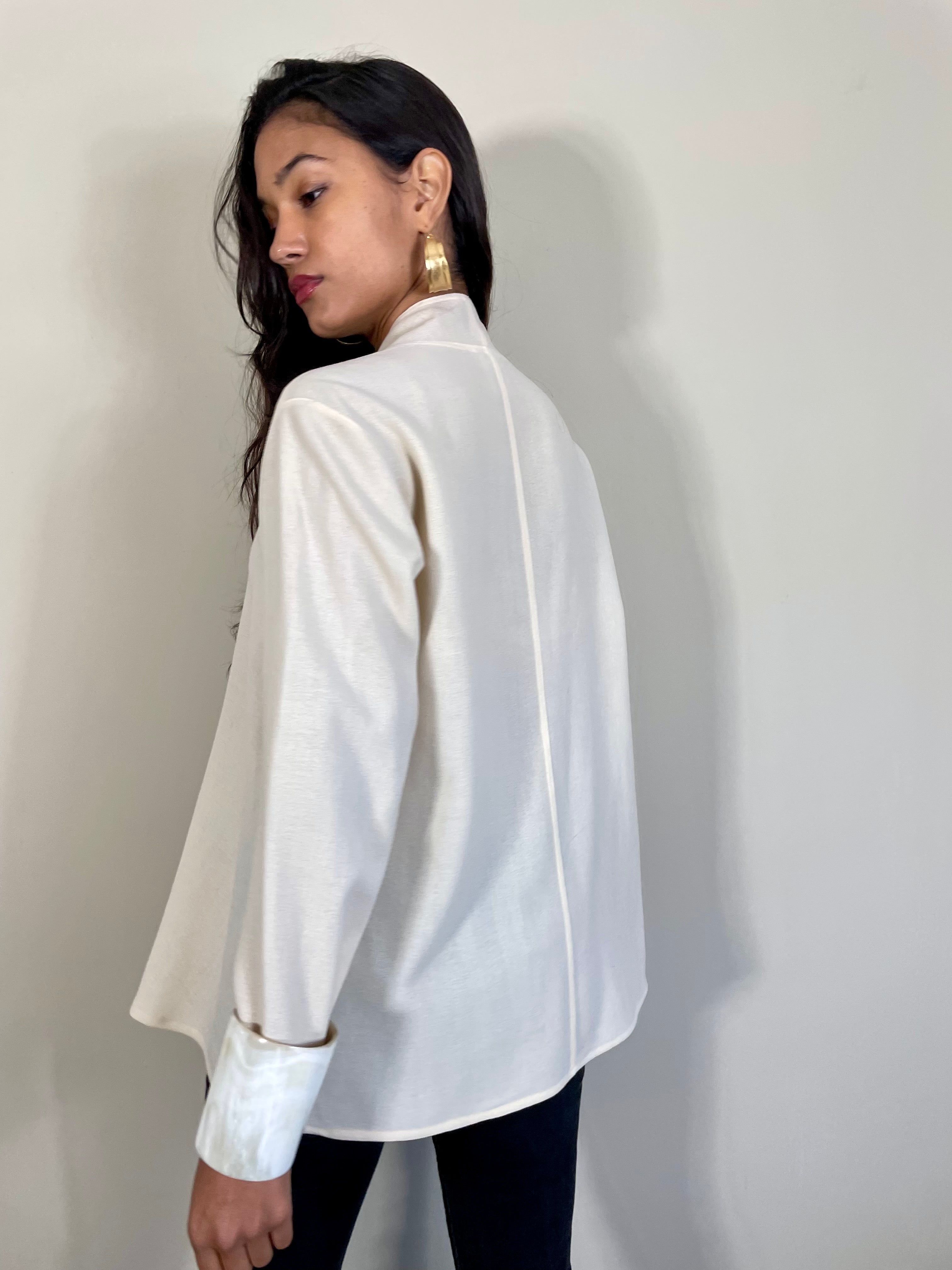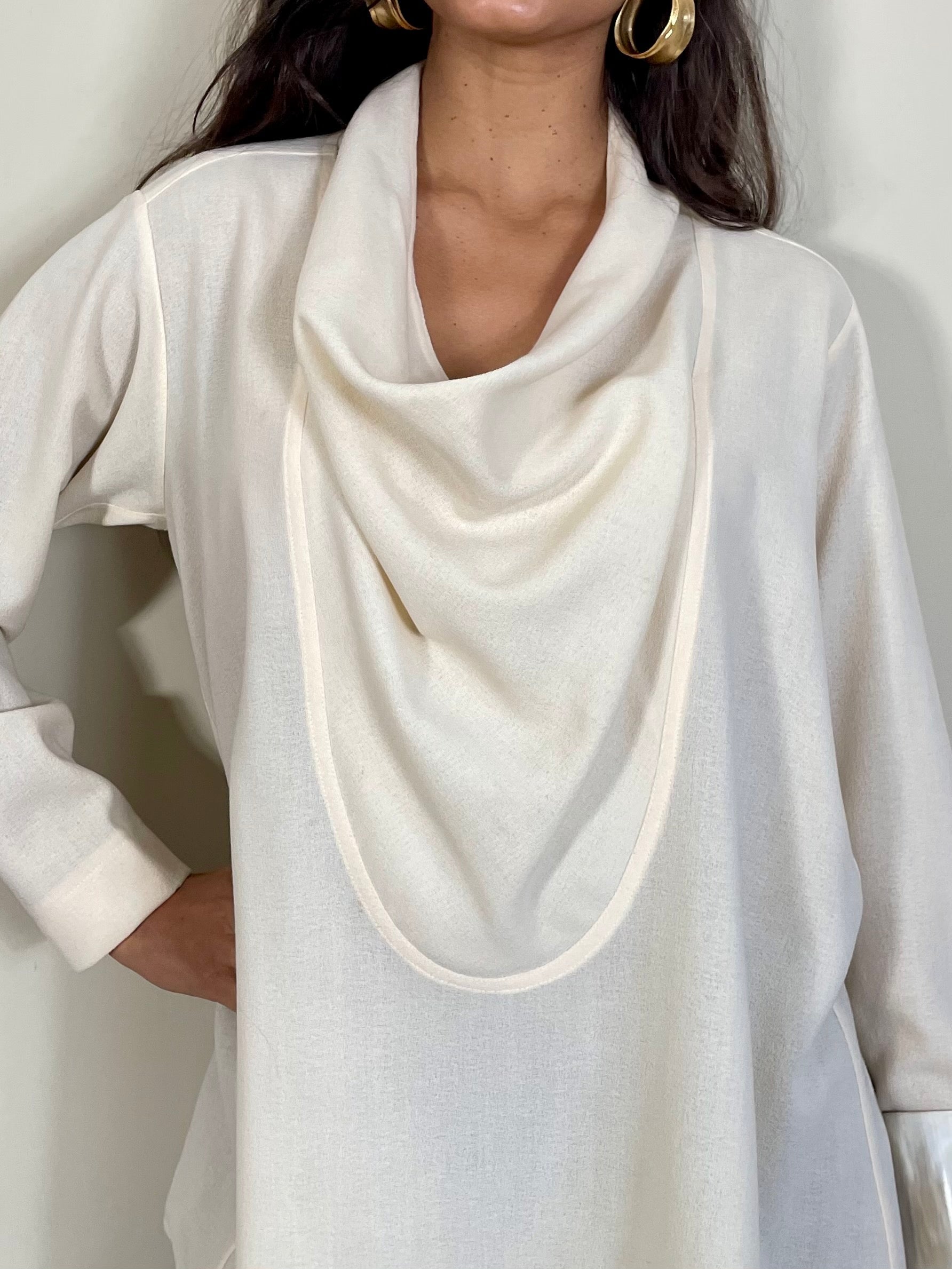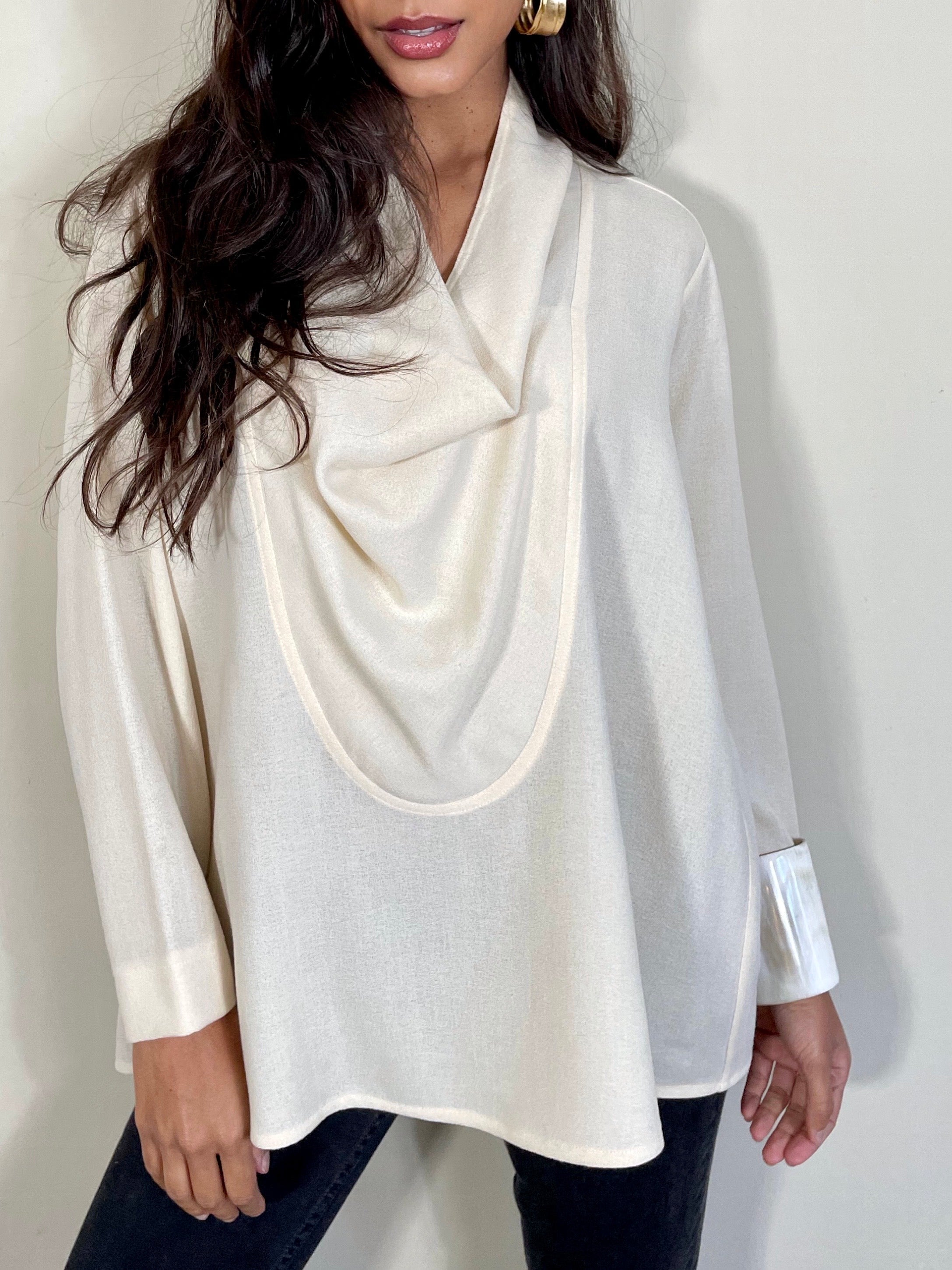 one of the chicest vintage blouses I've come across. Modern and versatile top made from a soft crepe. Has an A line fit with a cowl neck detail on front. A wonderful layering piece with flair and easy to dress up with heels or boots.