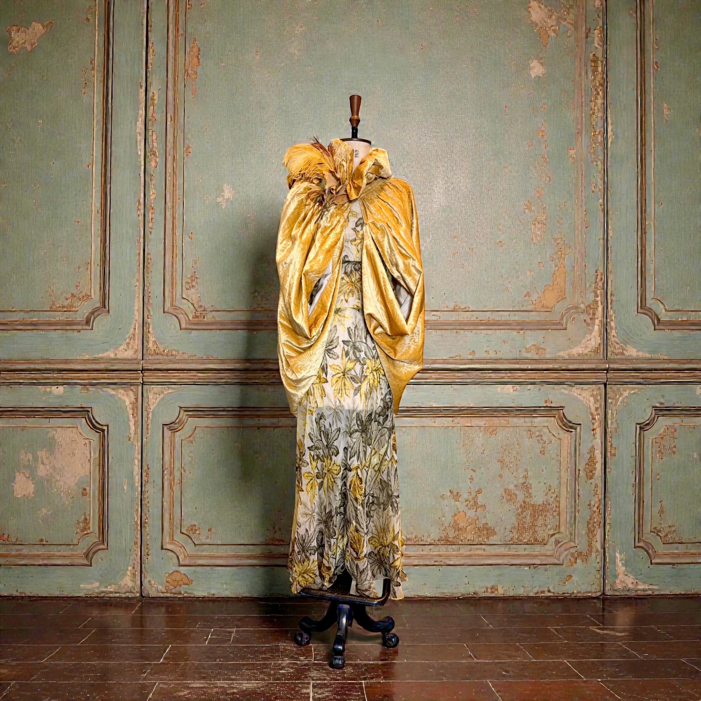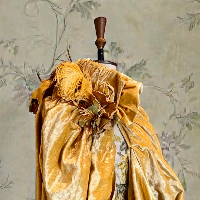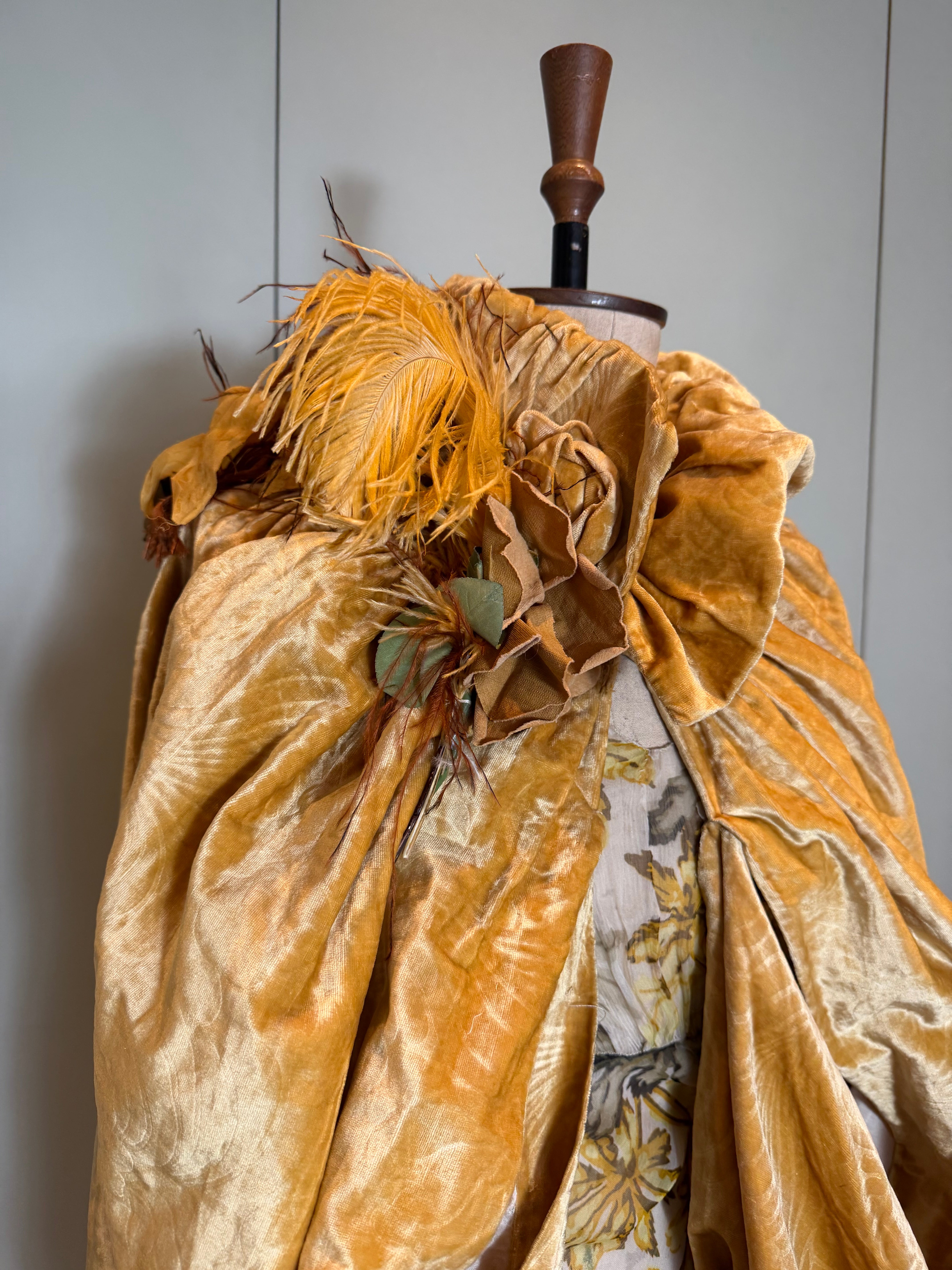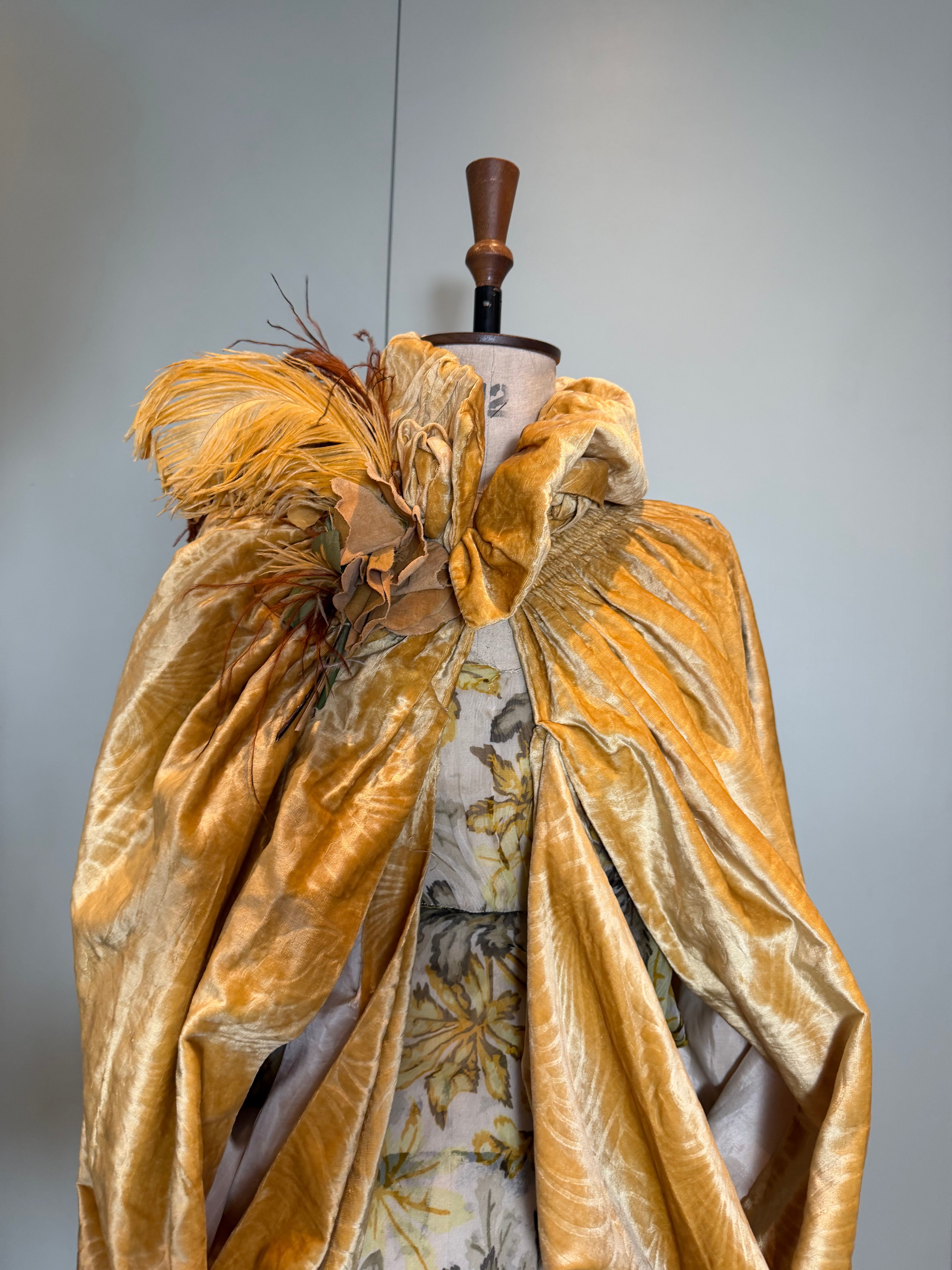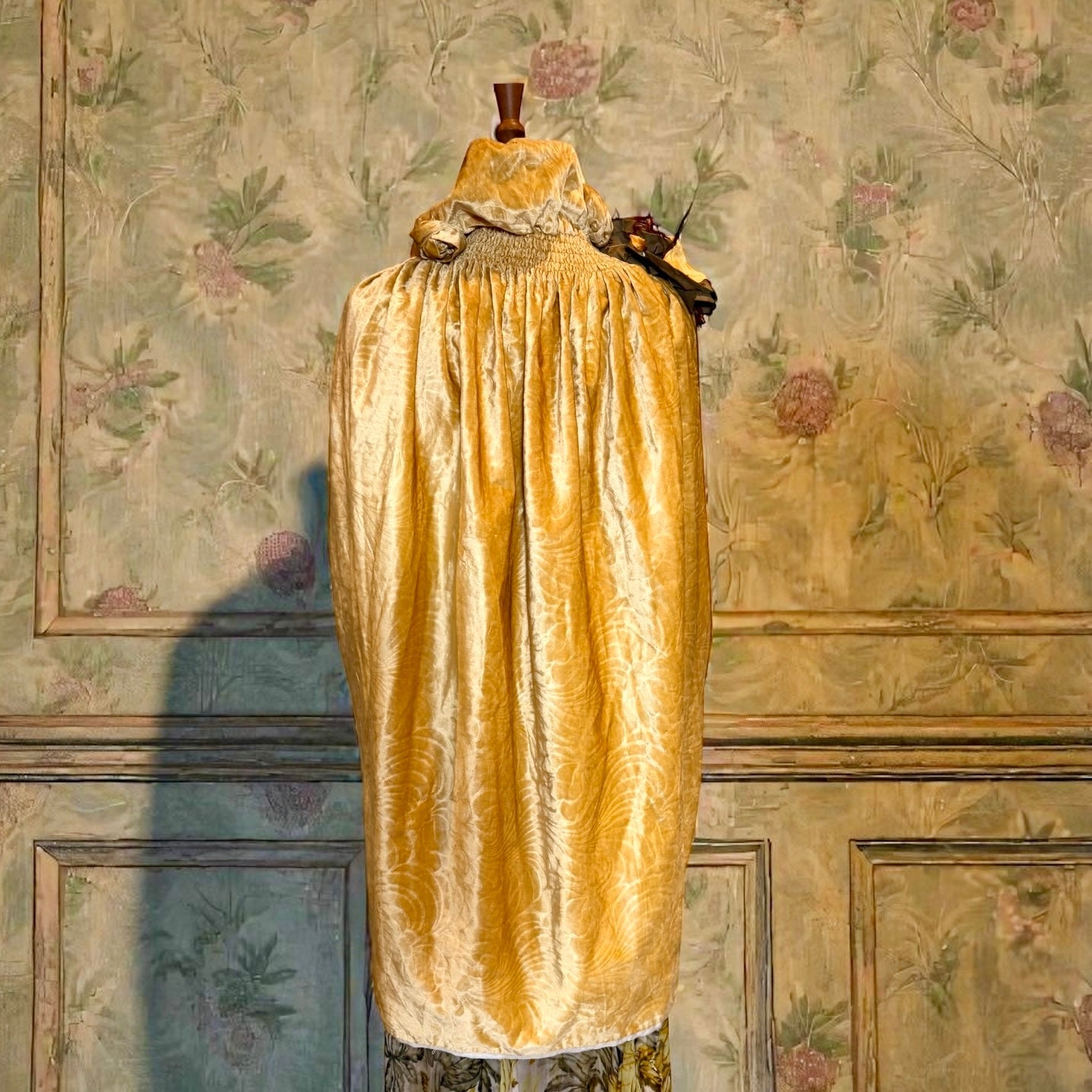 This original 1920s butter yellow velour jacket exemplifies historical craftsmanship, featuring a high neck collar with hooks and intricate smocking details on the shoulders. The sleeved cape design enhances elegance and comfort, while the double feather motif and handmade rosettes around the neckline add unique flair. An exceptional heirloom piece for collectors and enthusiasts.