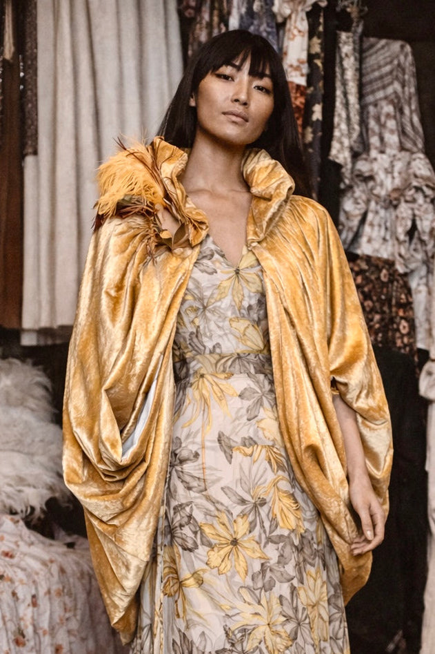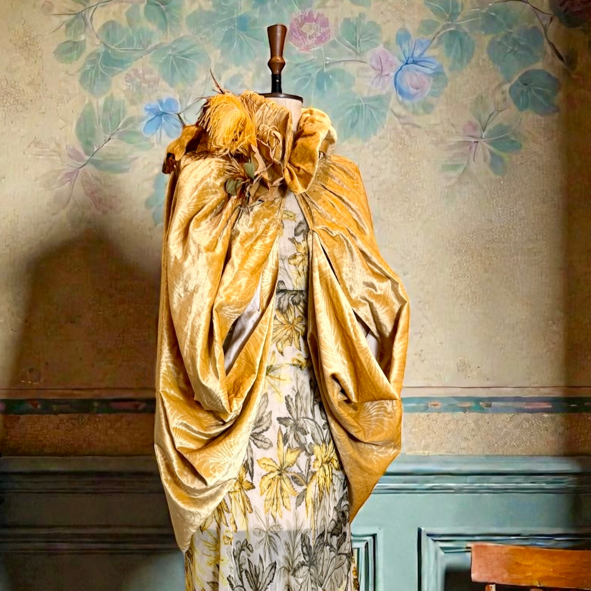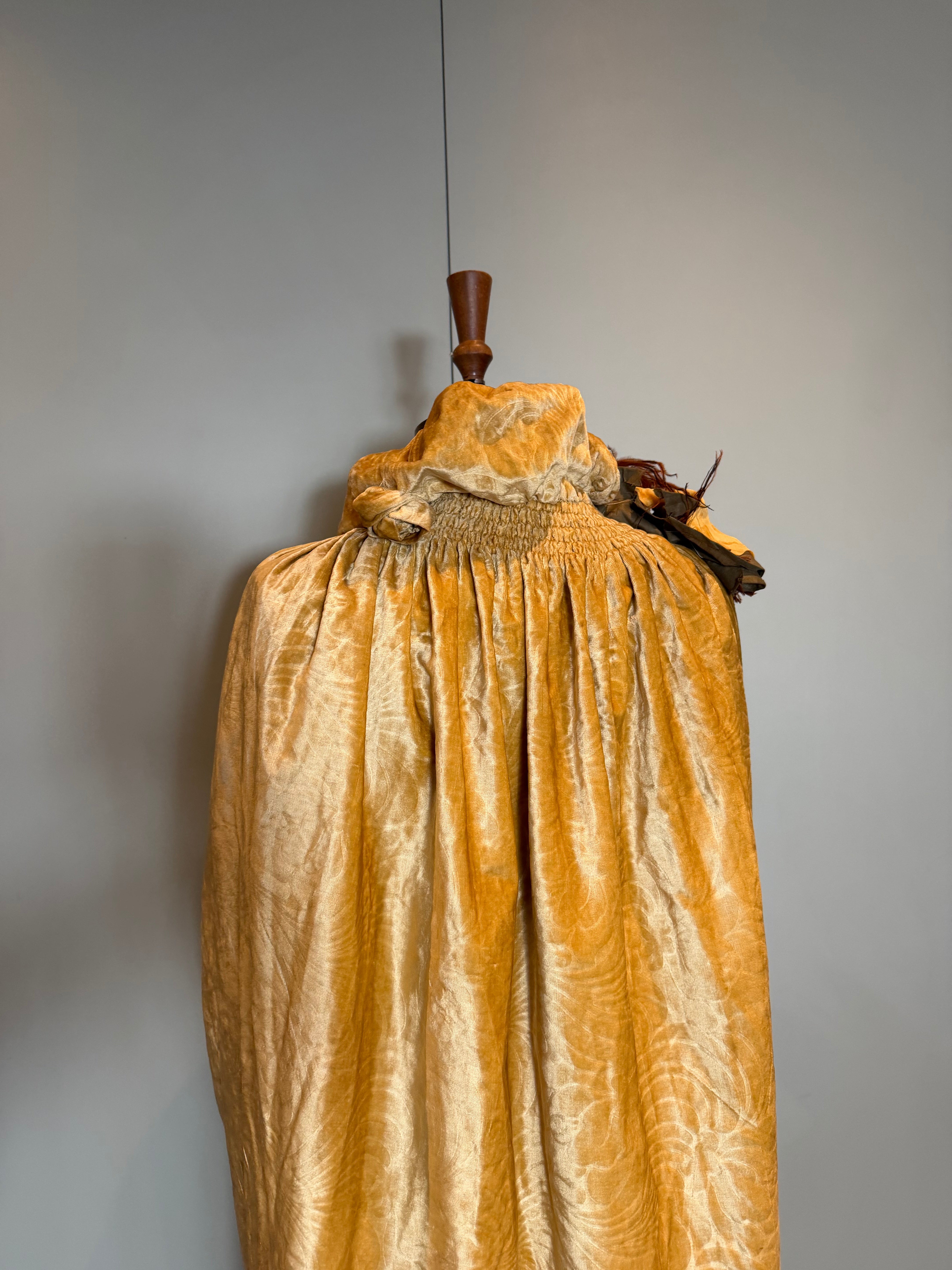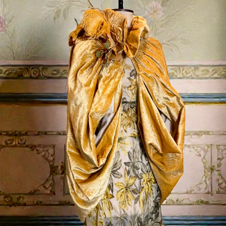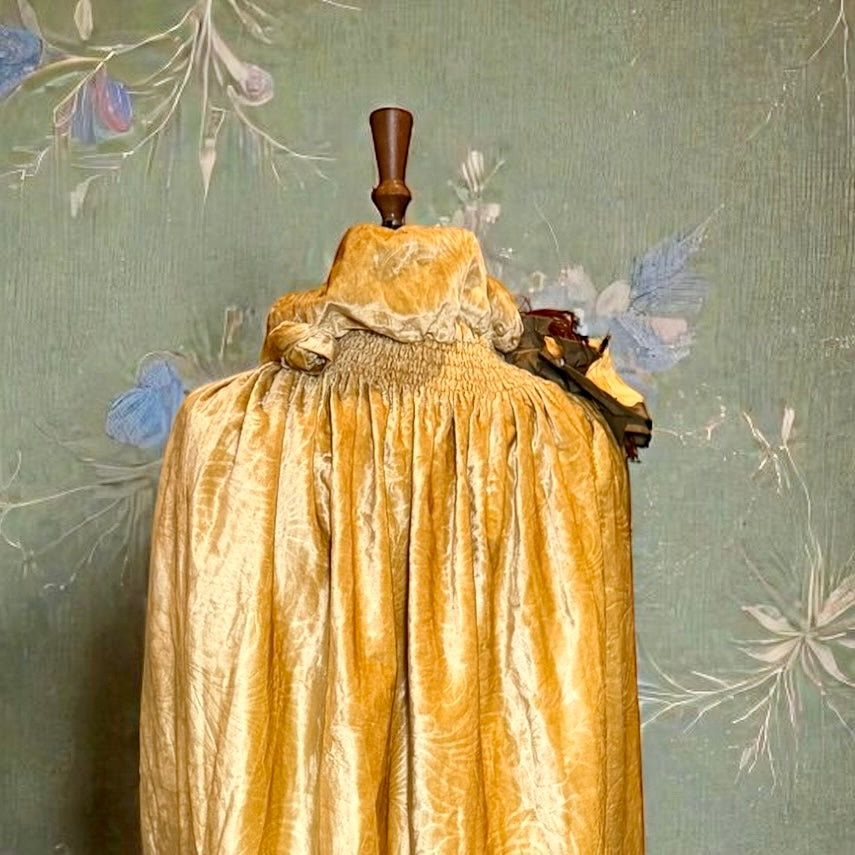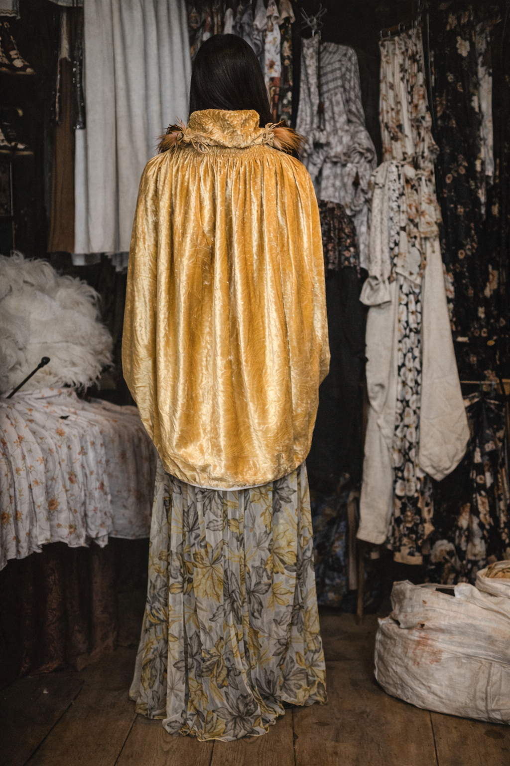This original 1920s butter yellow velour jacket exemplifies historical craftsmanship, featuring a high neck collar with hooks and intricate smocking details on the shoulders. The sleeved cape design enhances elegance and comfort, while the double feather motif and handmade rosettes around the neckline add unique flair. An exceptional heirloom piece for collectors and enthusiasts.