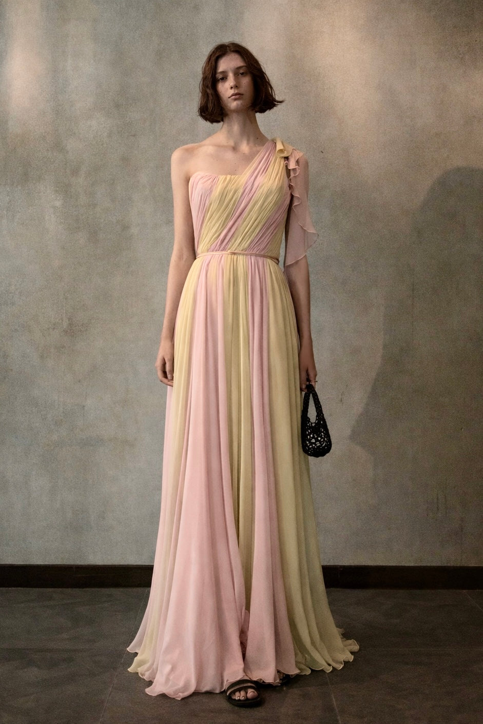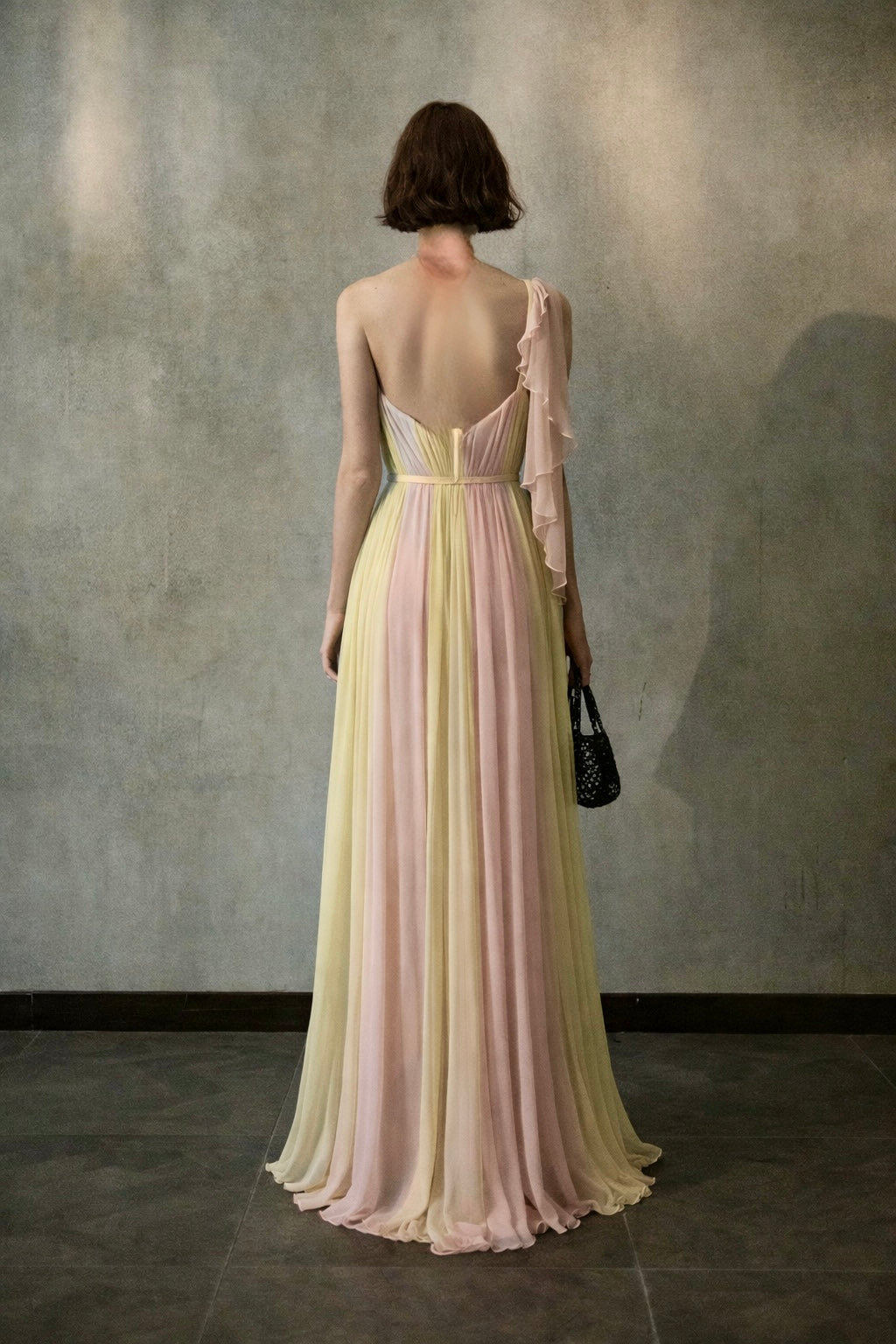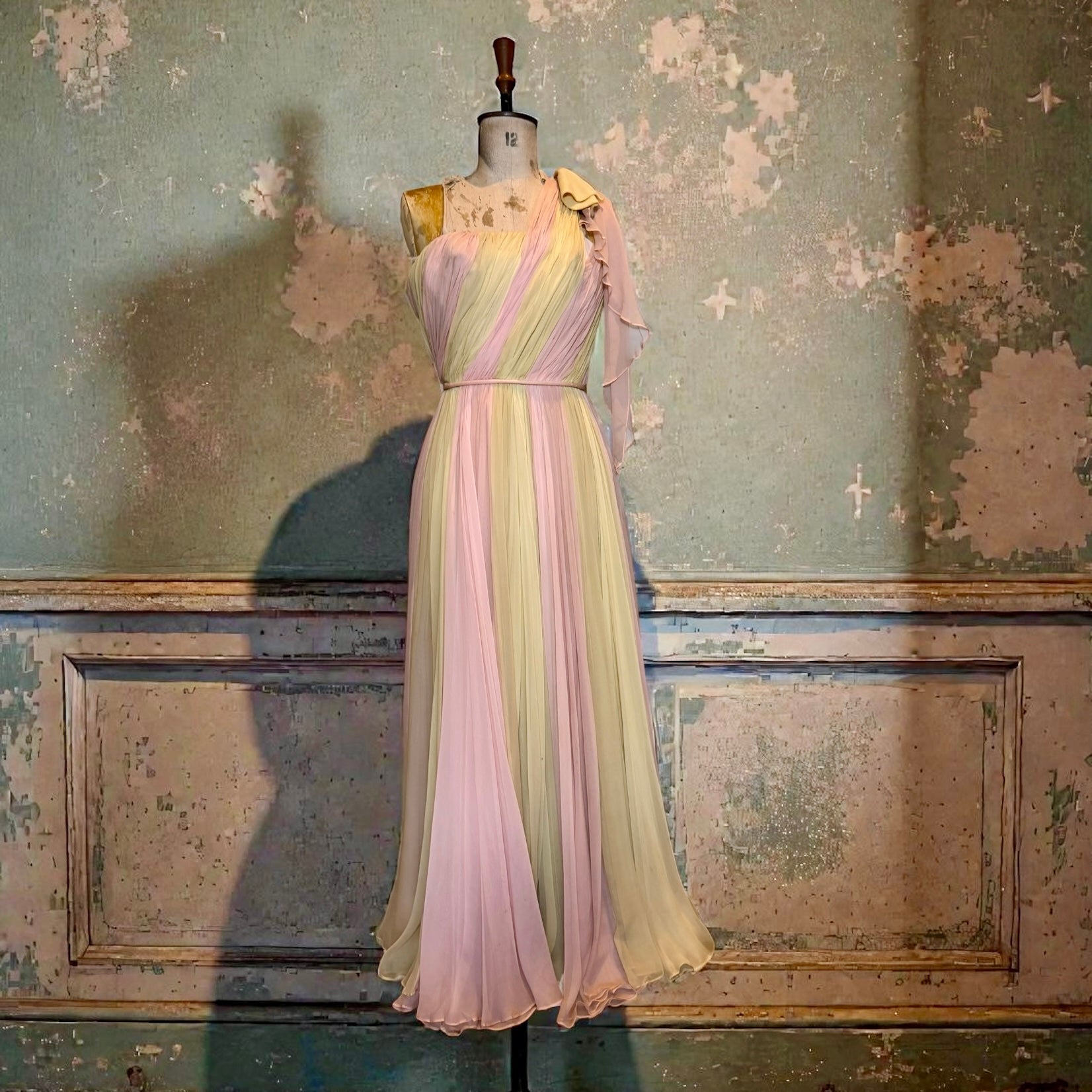 Timeless and rare original 60s couture chiffon pleated dress. Adorned in delicate layers of blush pink and butter yellow silk chiffon, this exquisite piece features a very well constructed boned bustier bodice and a graceful one-shoulder tie design. The striking pleated skirt cascades to the floor, creating an enchanting silhouette that transforms any summer soirée into a captivating affair.