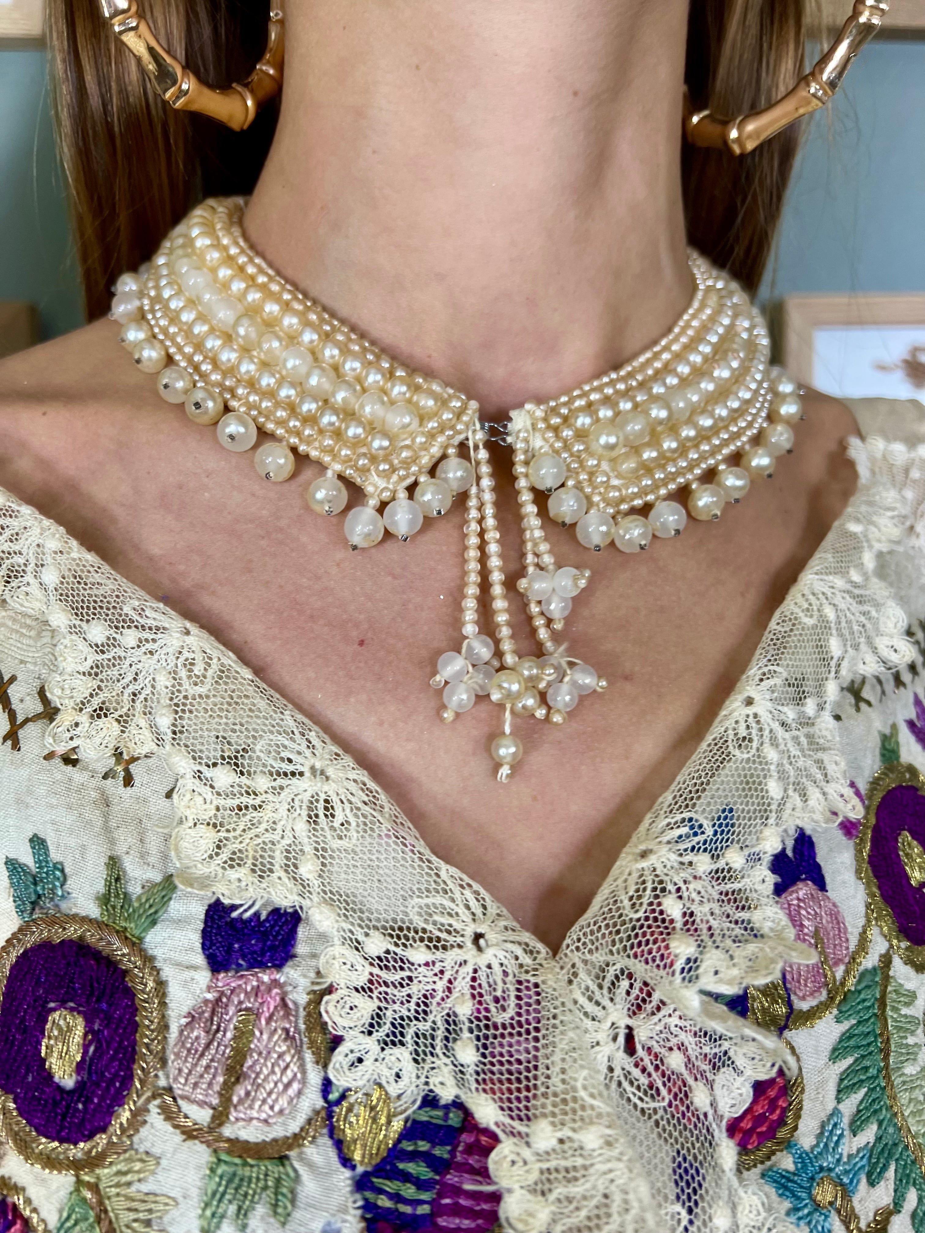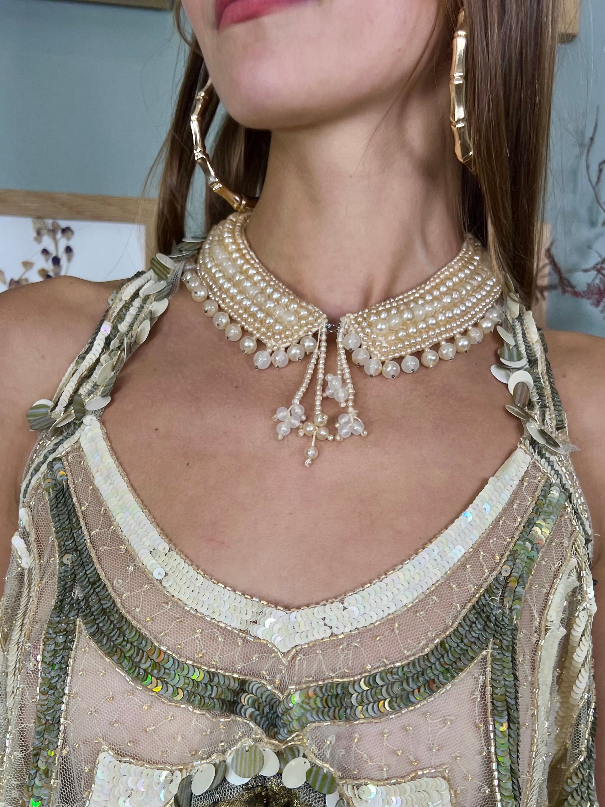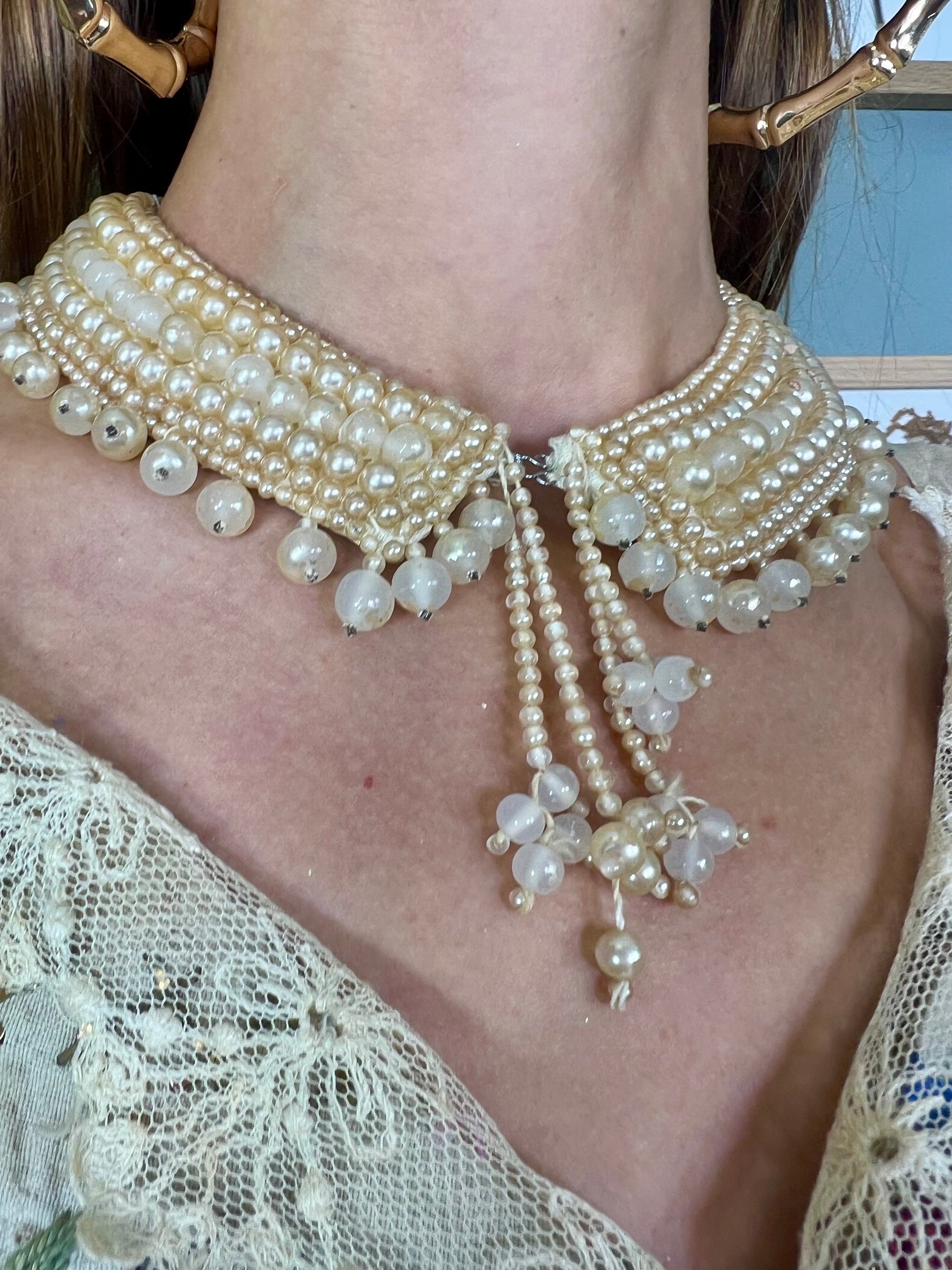 The prettiest little thing to have and to cherish, 20s faux pearl collar. Has a front hook and beaded tassels with a dangly pearl rim. lined in cream silk.