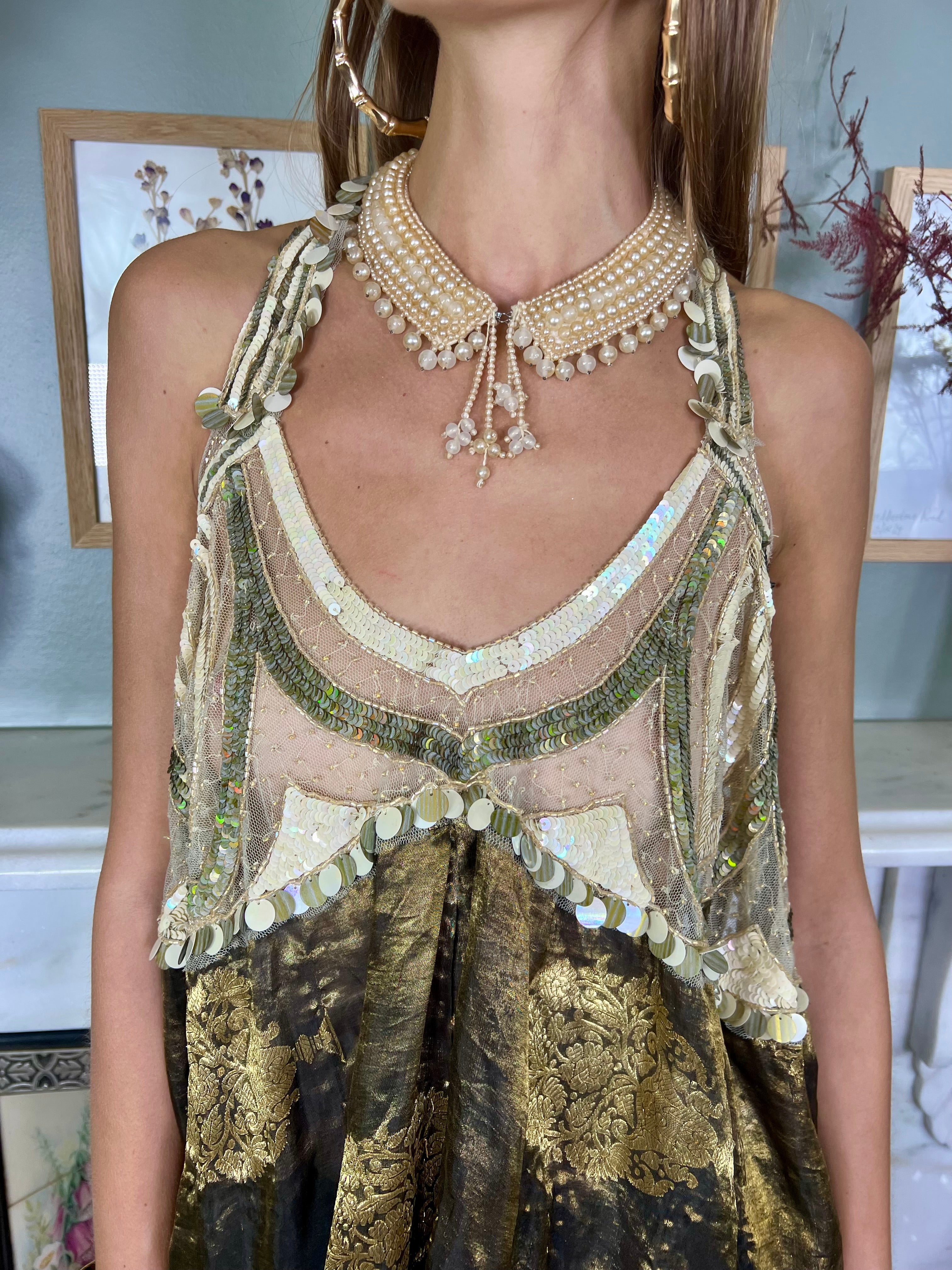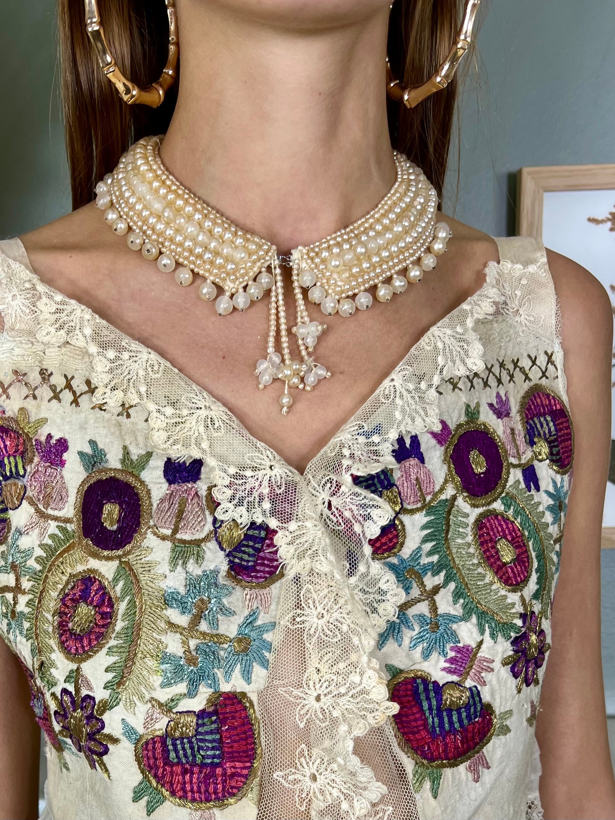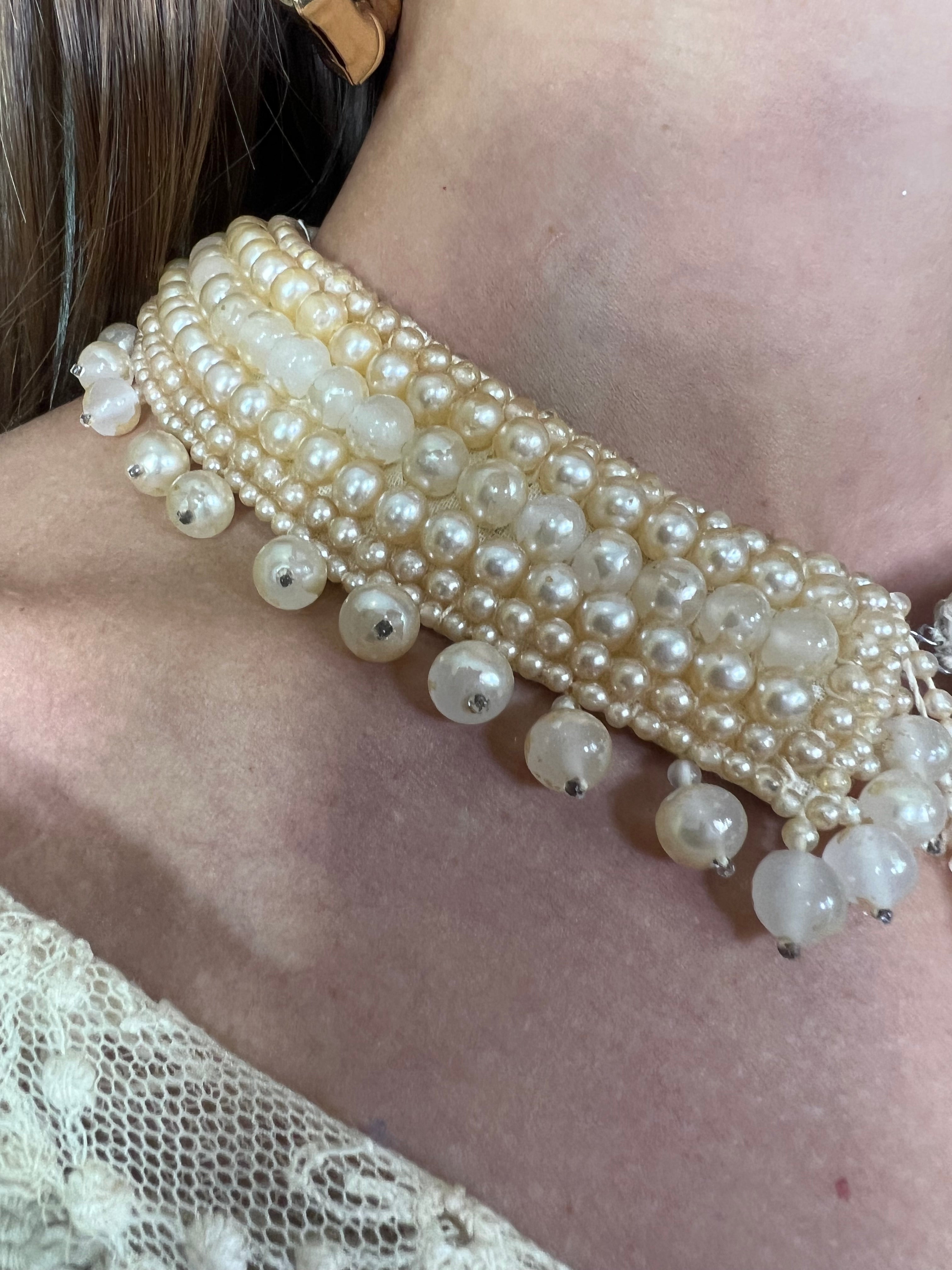 The prettiest little thing to have and to cherish, 20s faux pearl collar. Has a front hook and beaded tassels with a dangly pearl rim. lined in cream silk.