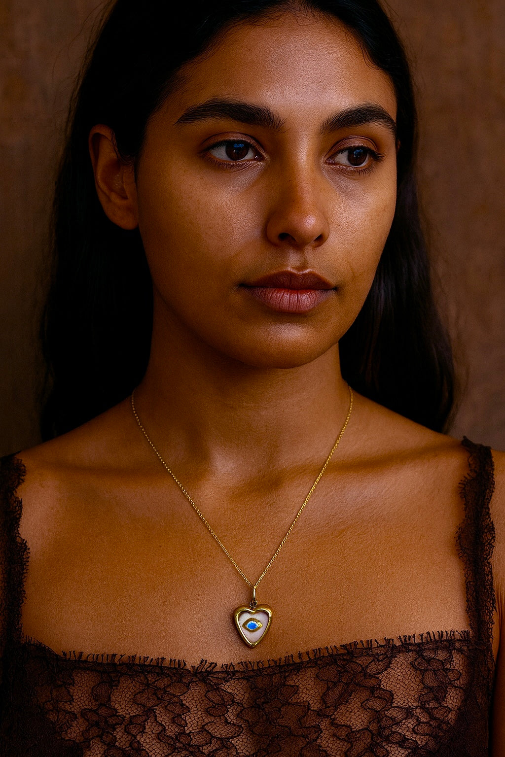 This exquisite pendant features a handpicked, vintage ceramic eye charm known for its symbolic protection. The intricately hand-painted design is set on a 14 carat gold heart frame with an adjustable chain. A perfect addition to your stacking necklaces or a heartfelt gift.