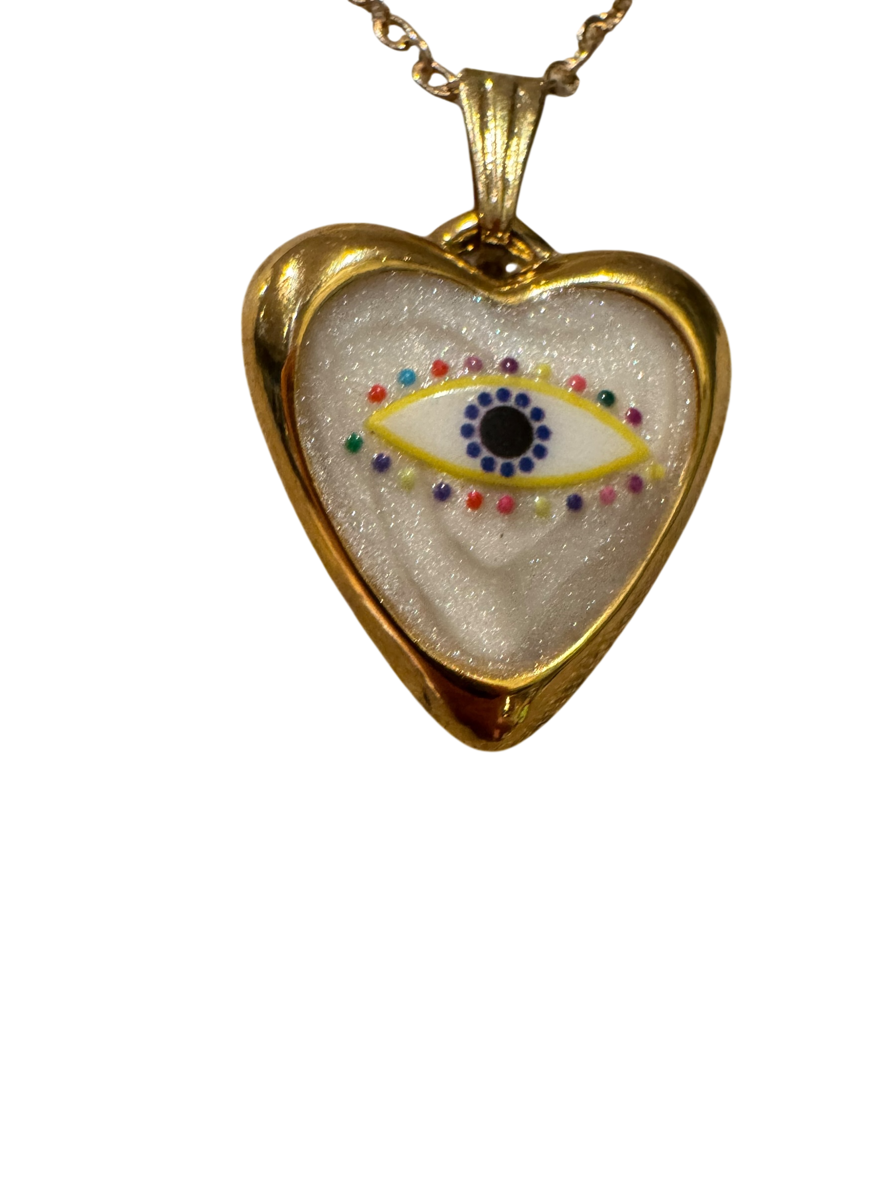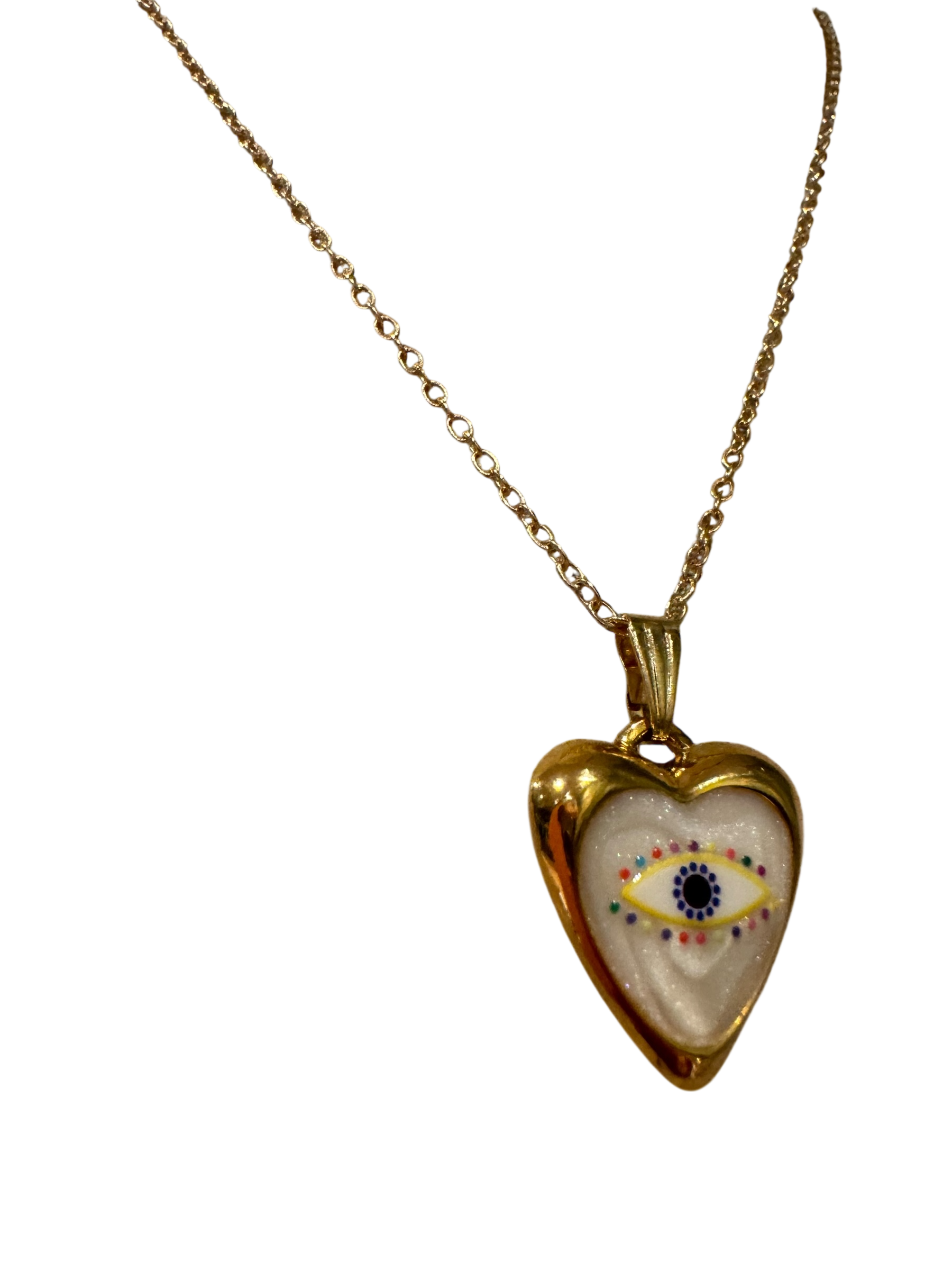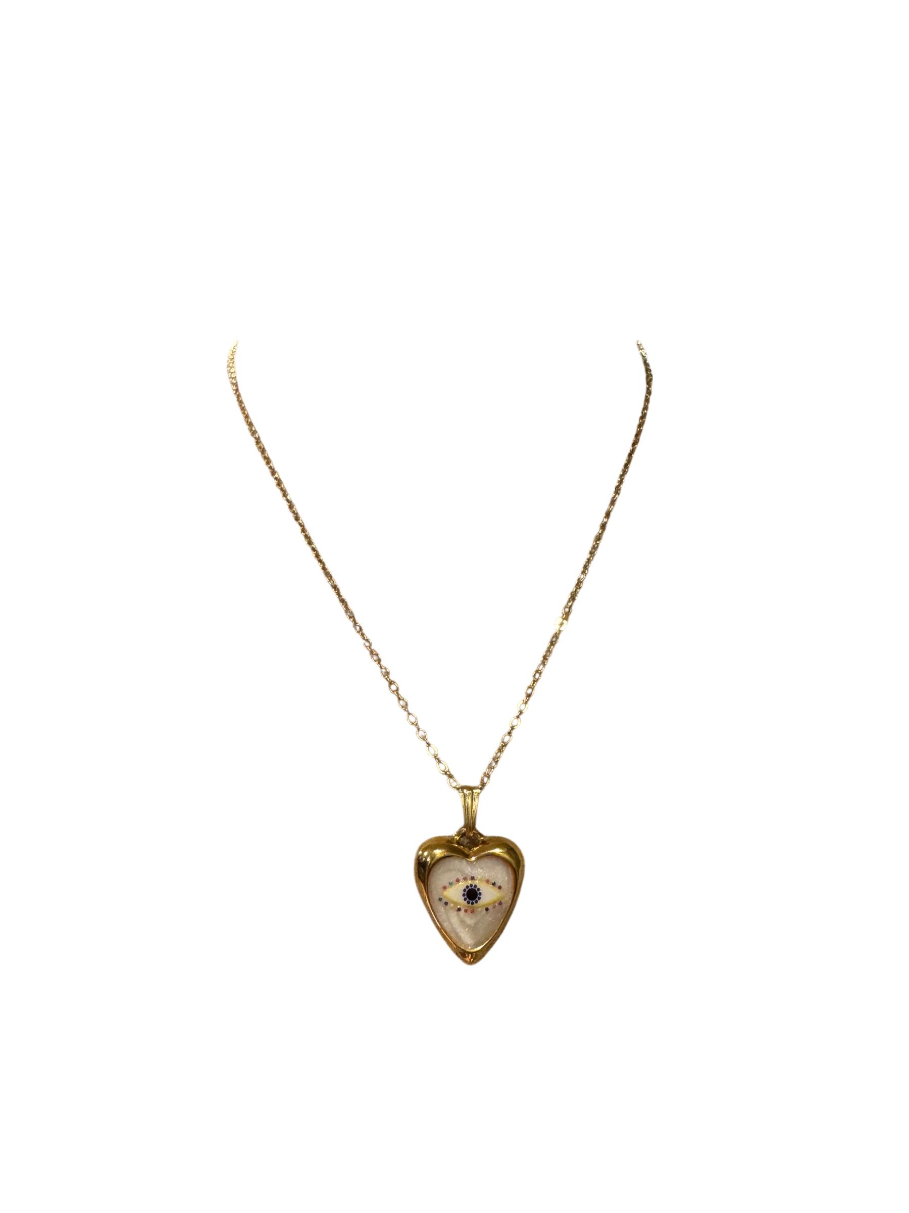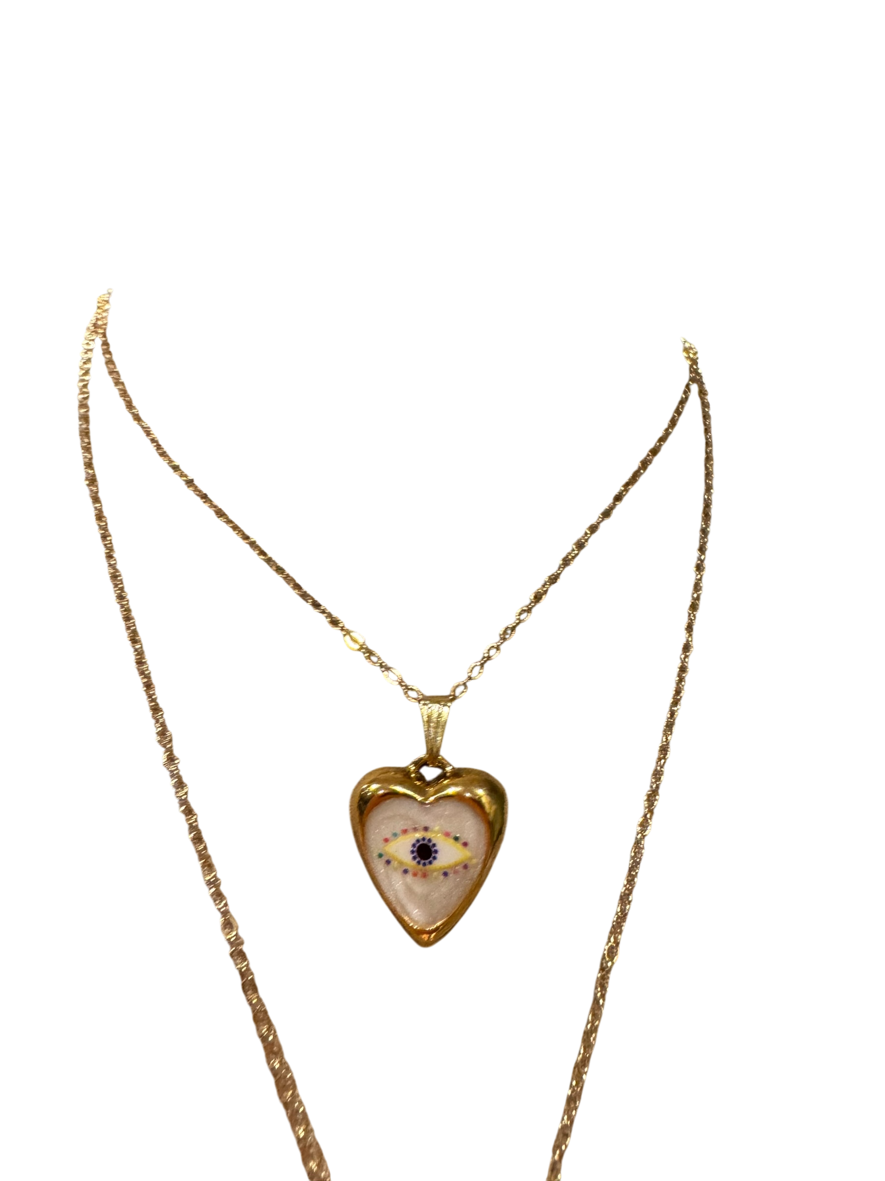Erin, vintage heart shape ceramic eye charm and 14 c gold pendant and chain