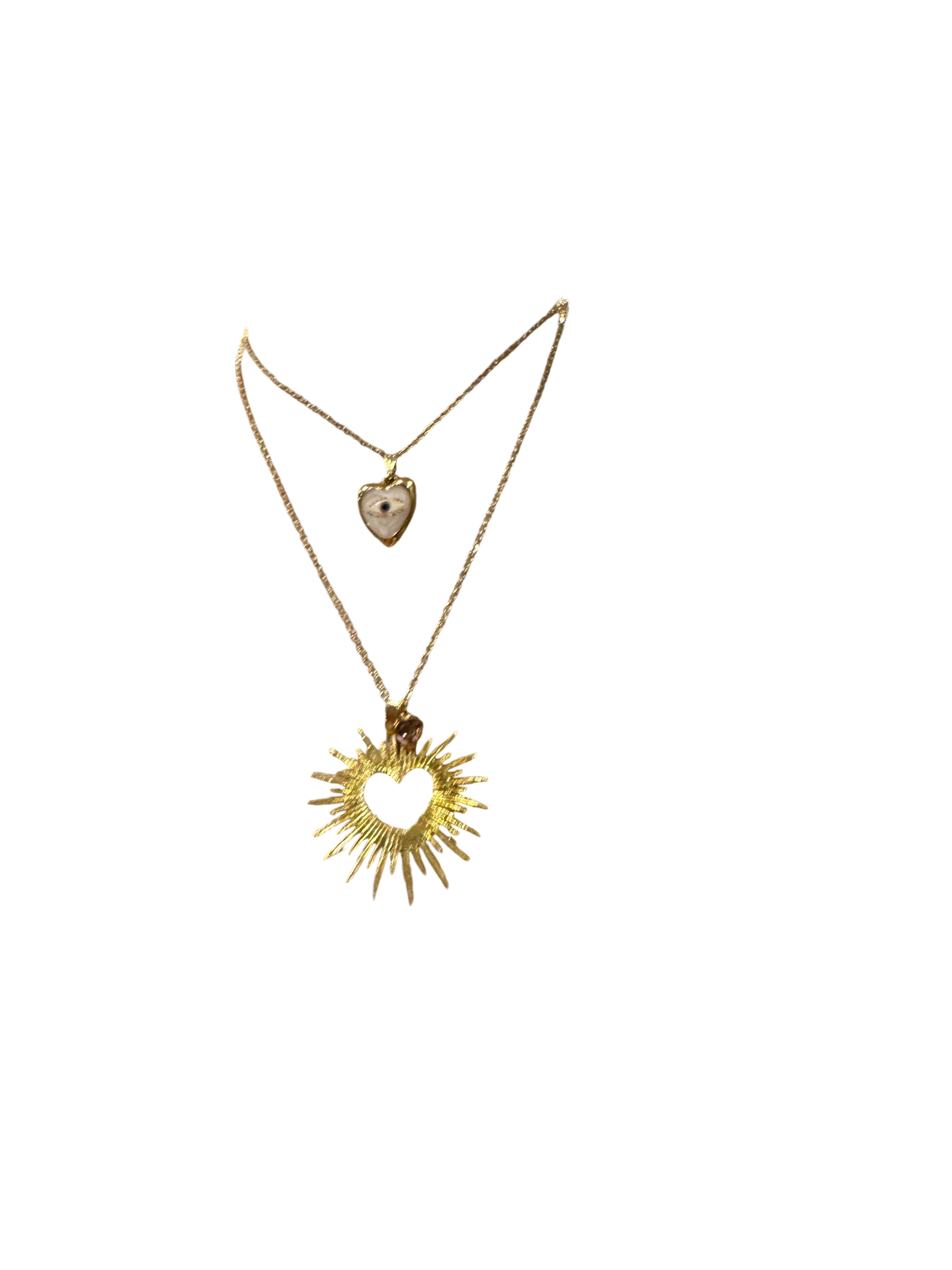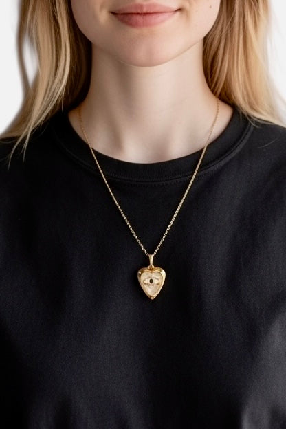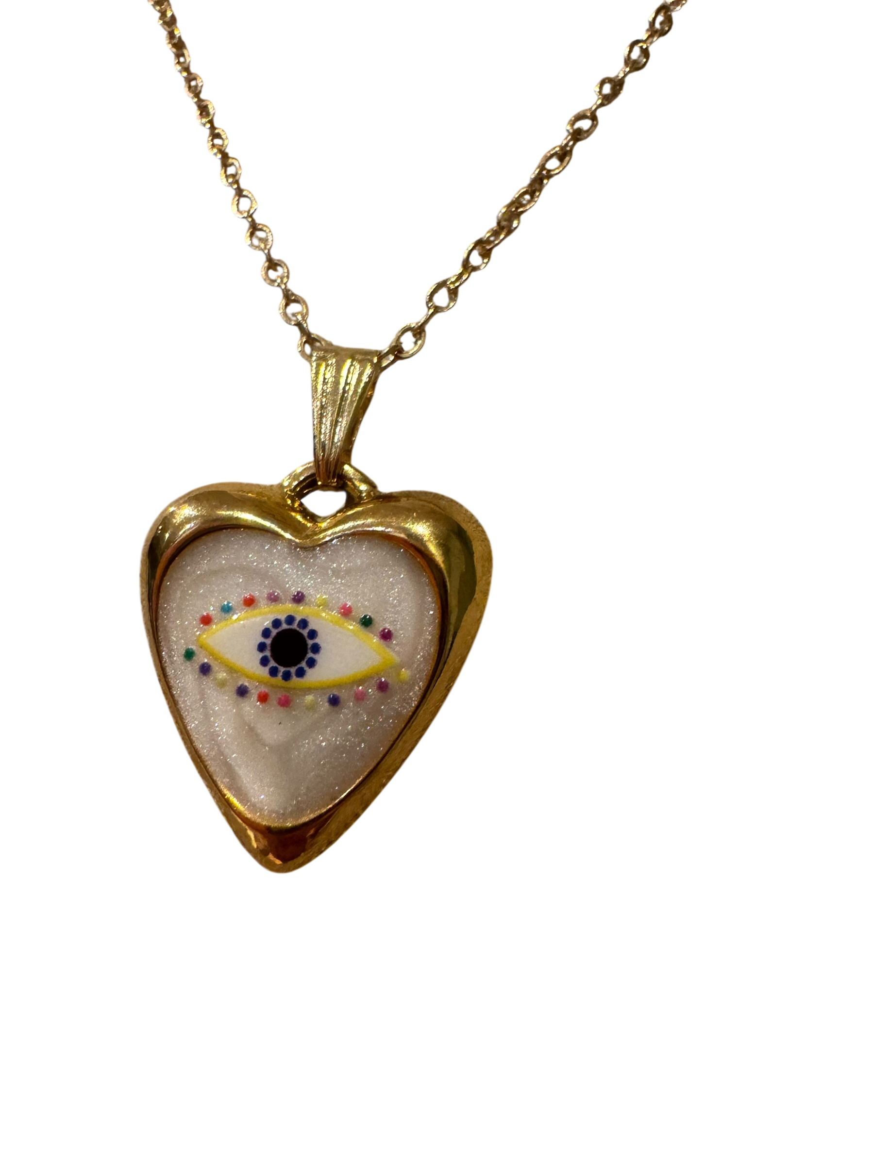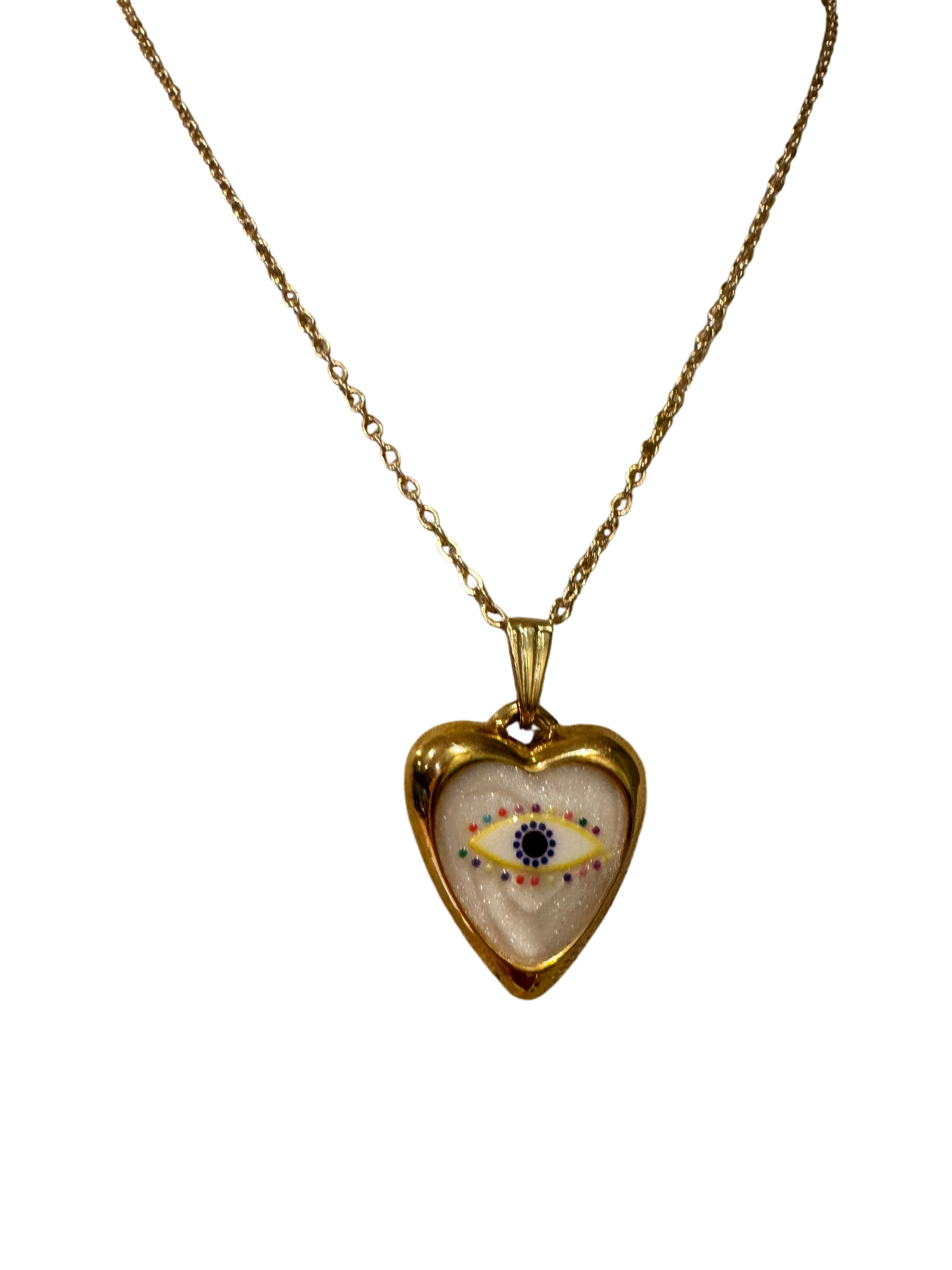 Erin, vintage heart shape ceramic eye charm and 14 c gold pendant and chain