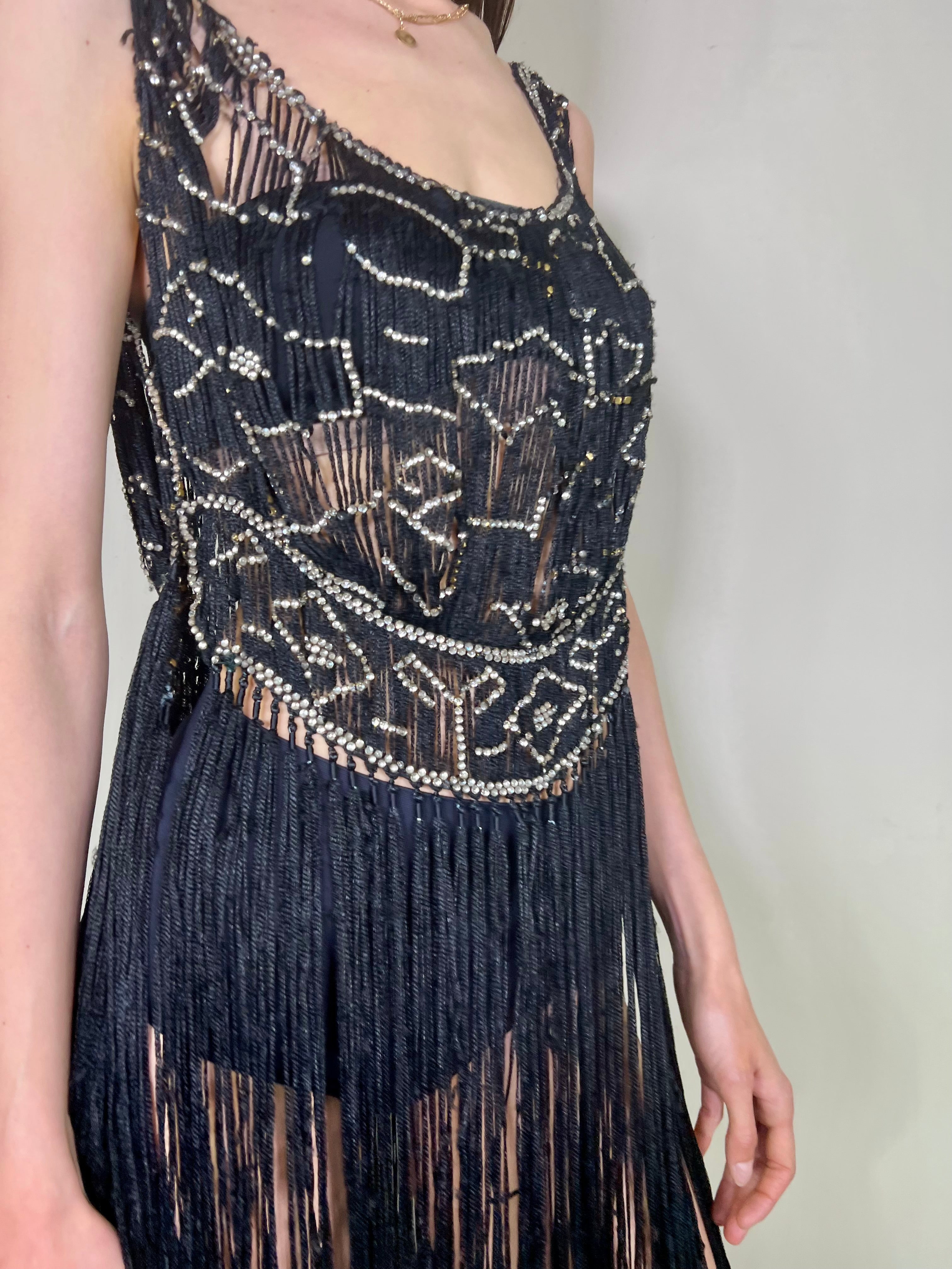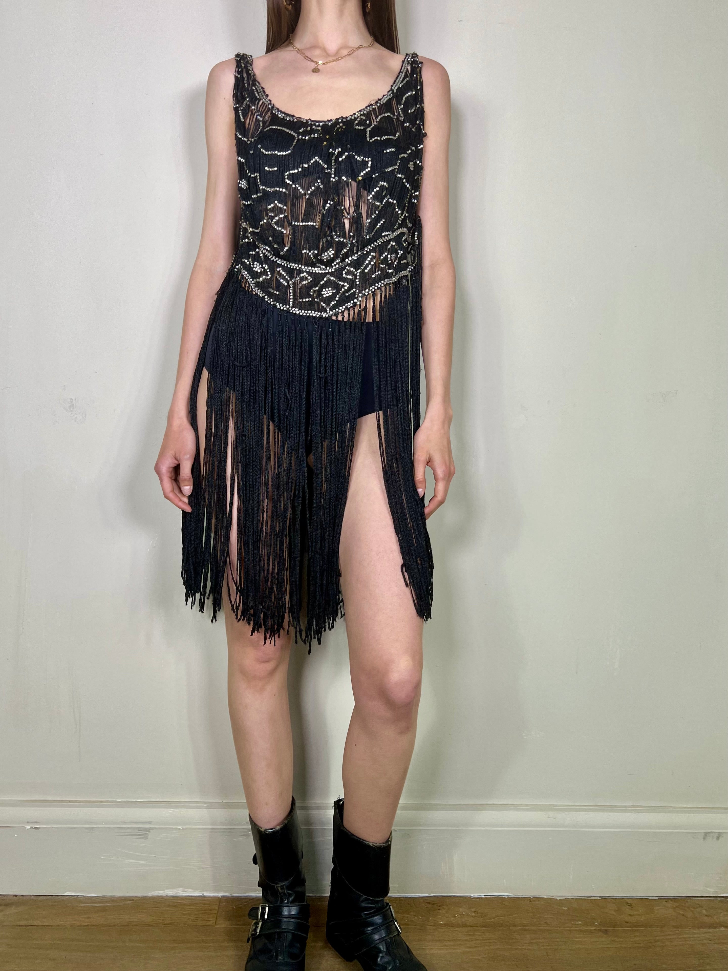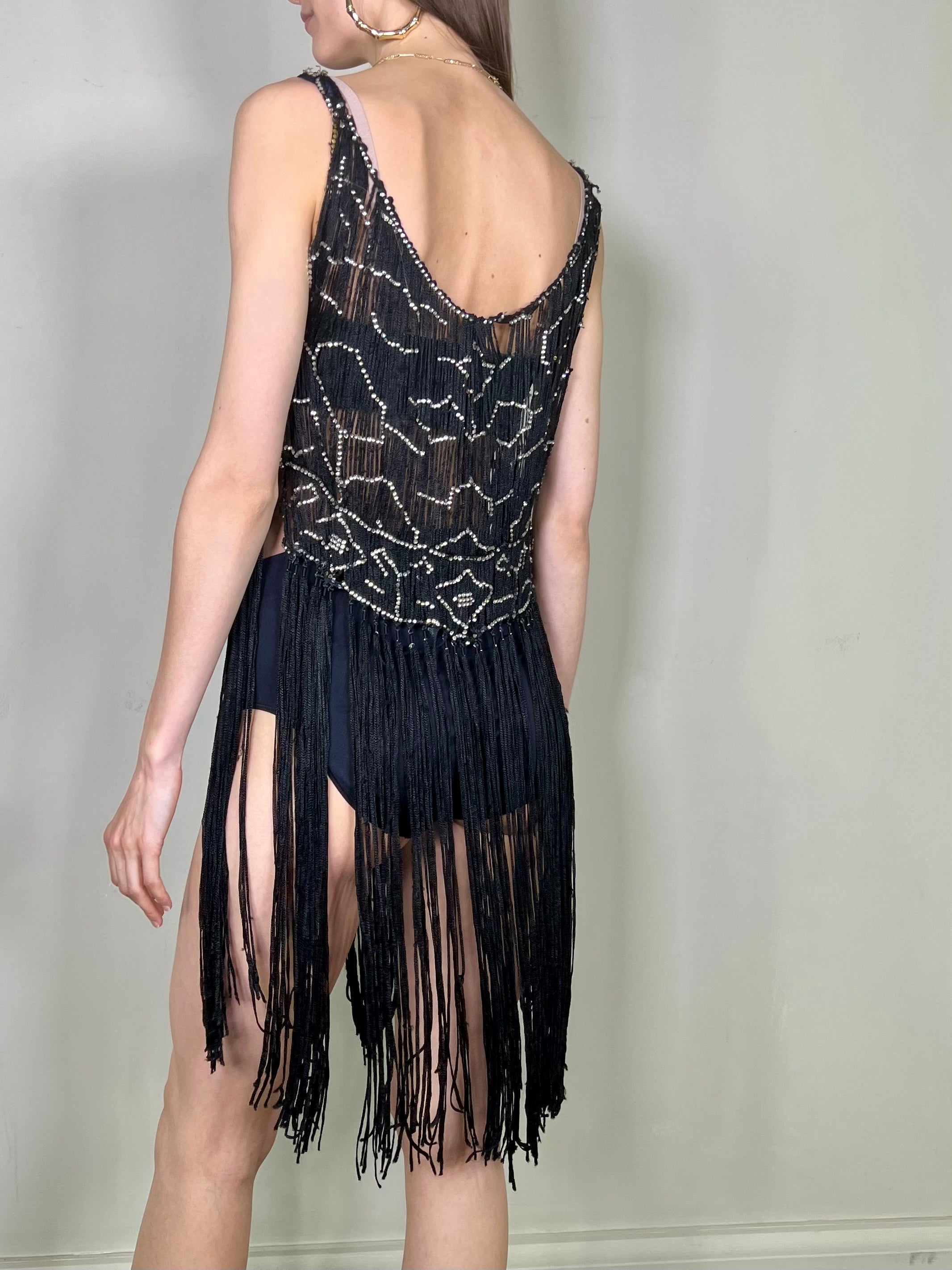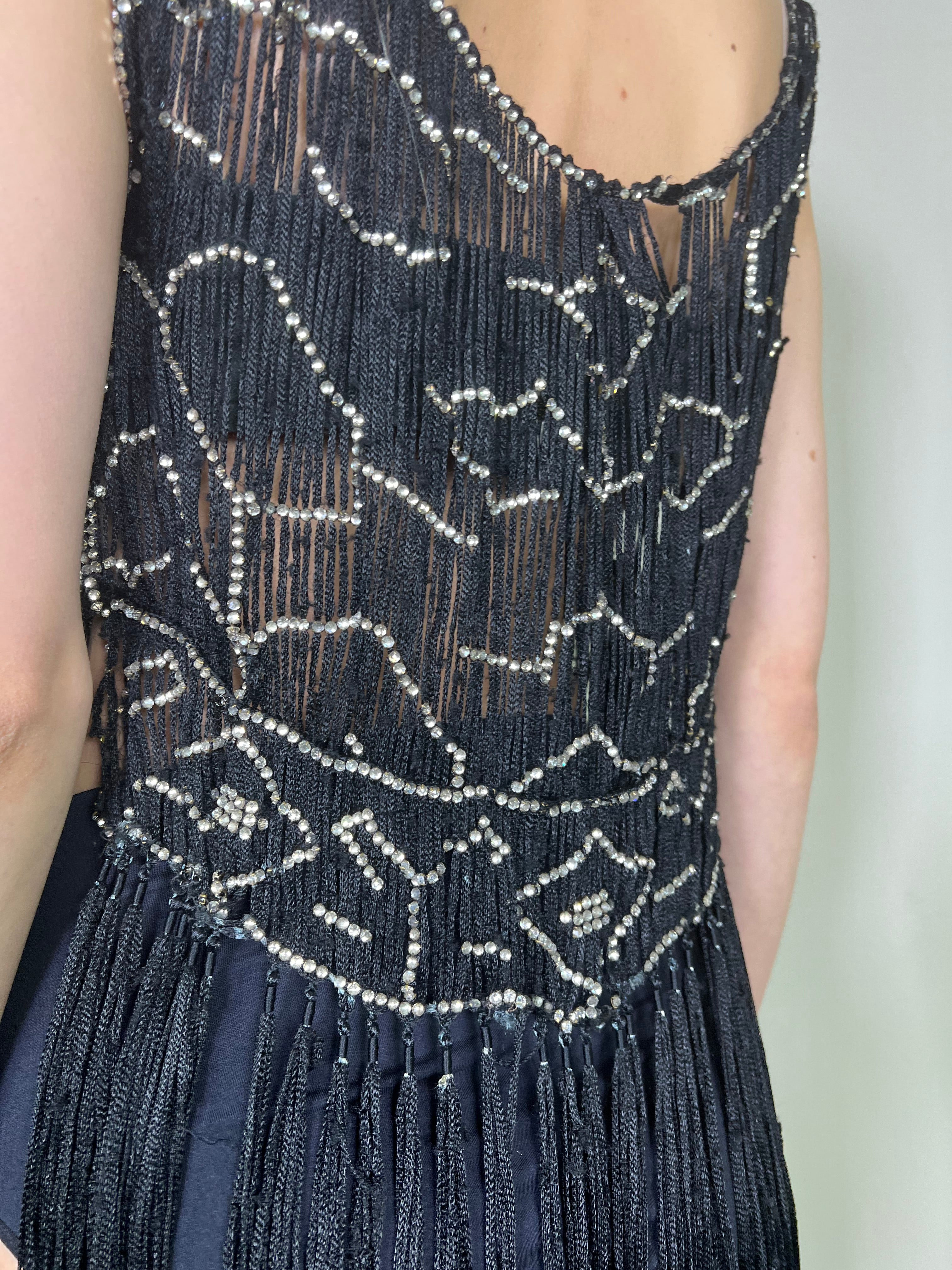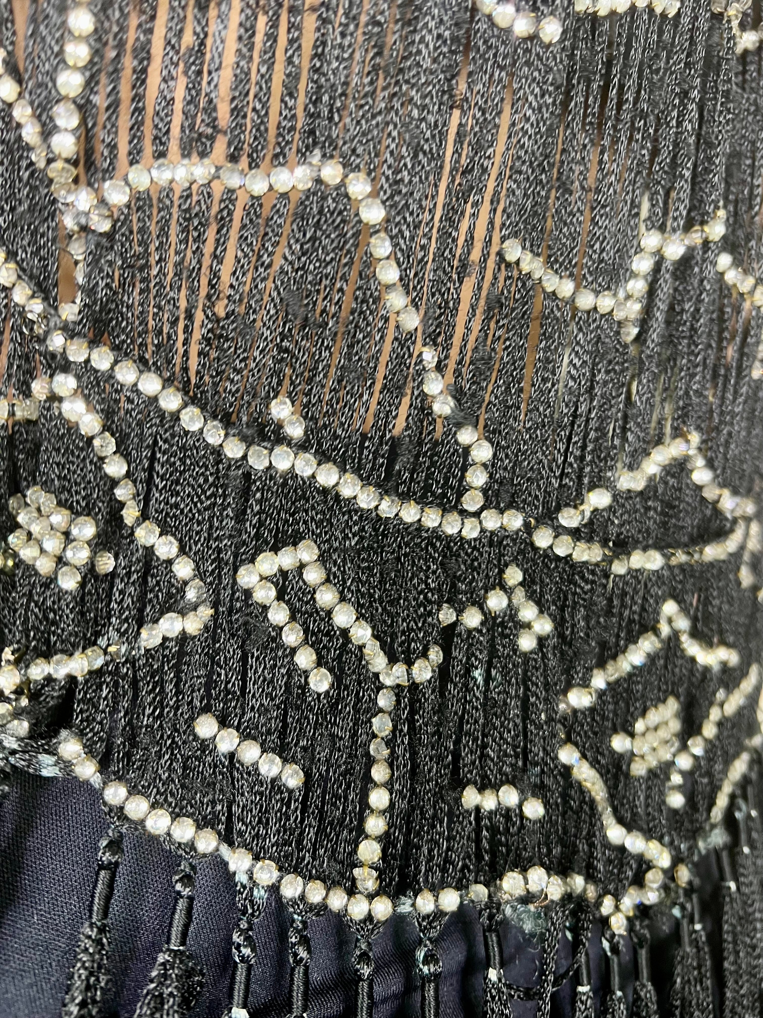 Fabulous 20s fringed black silk and diamanté tabard. This piece has just the right amount of sparkle and looks fab layered over any slip dress, shirt or simply over bikini. Fastens on the side with 2 hooks.