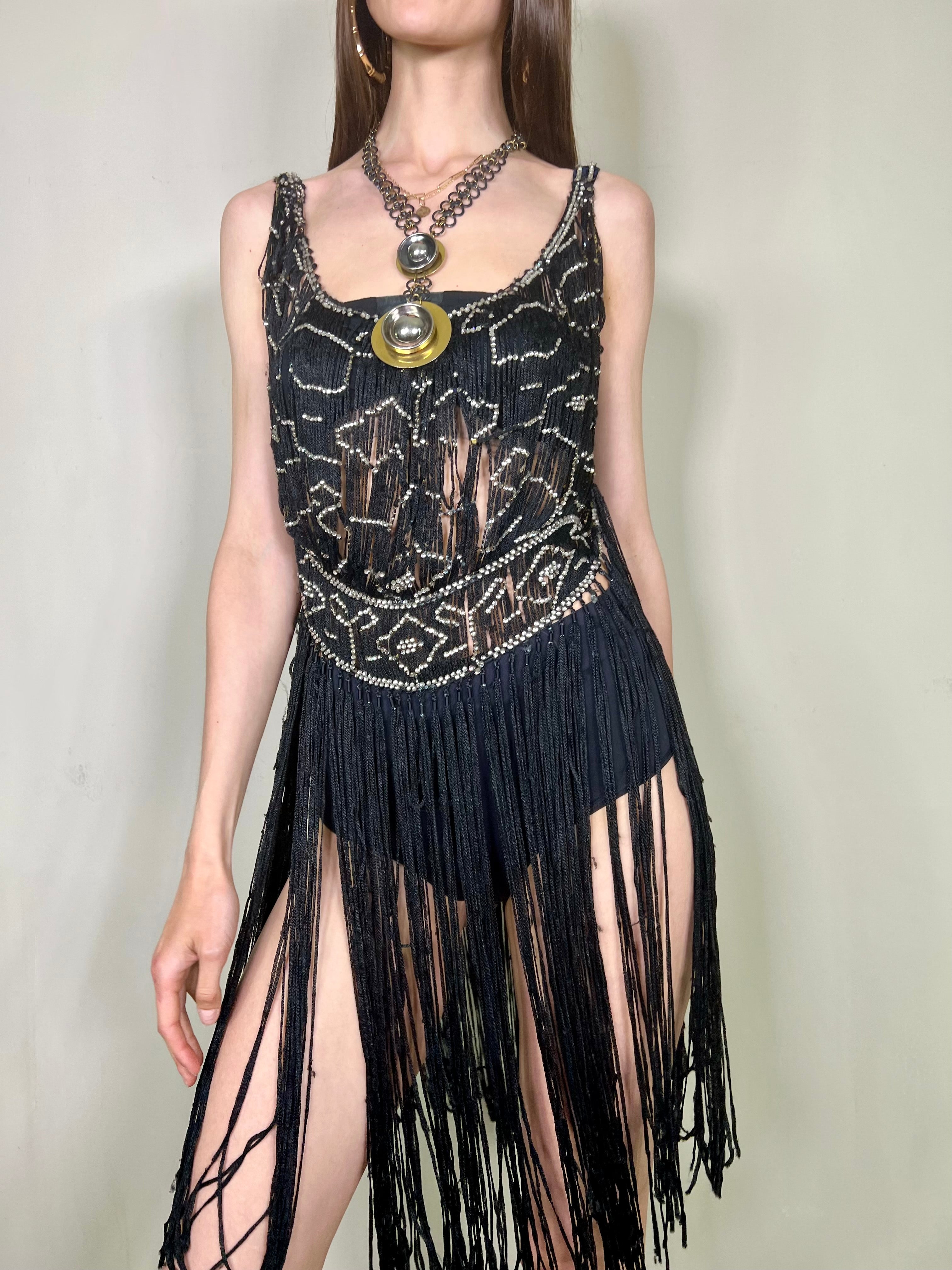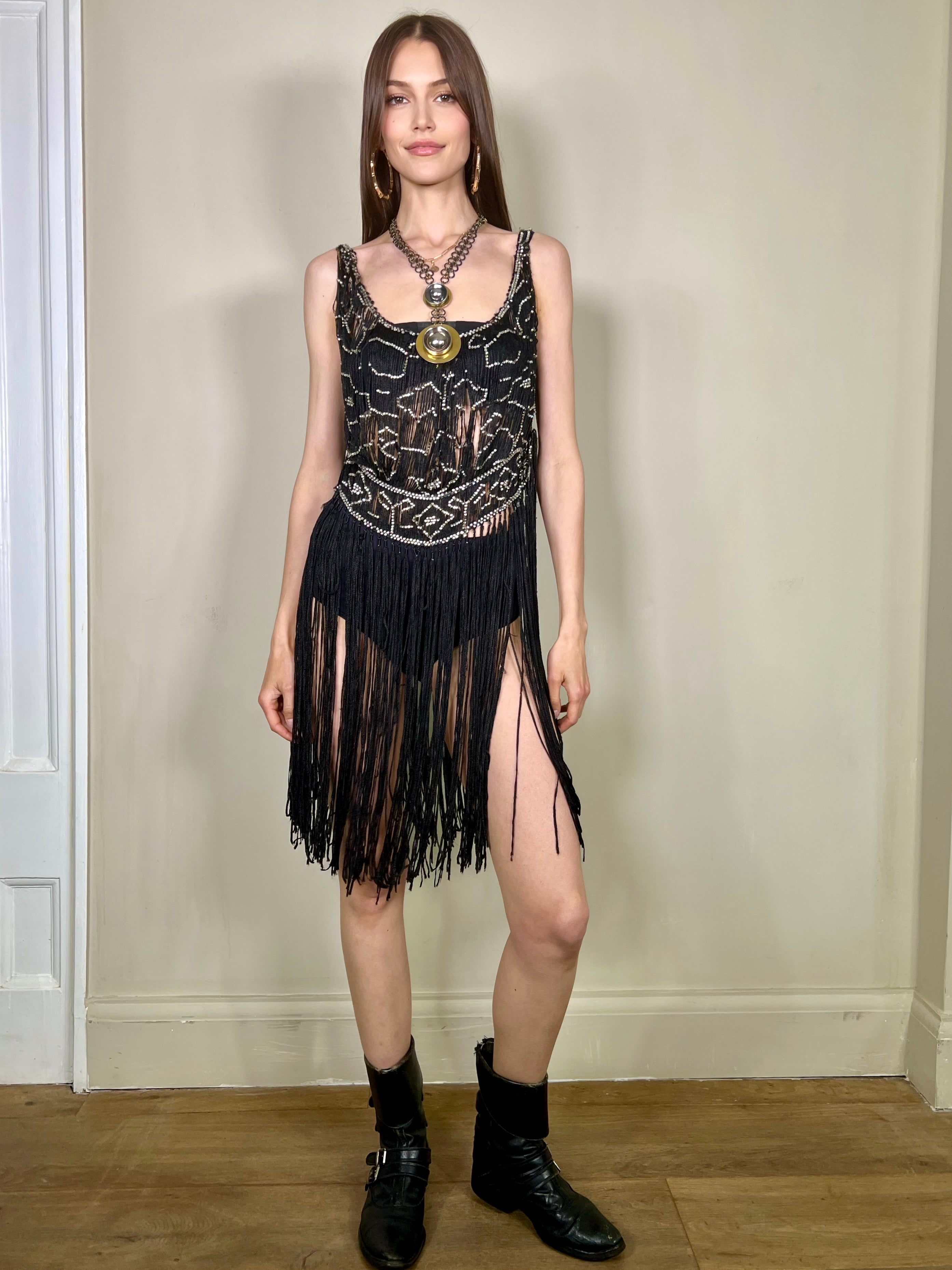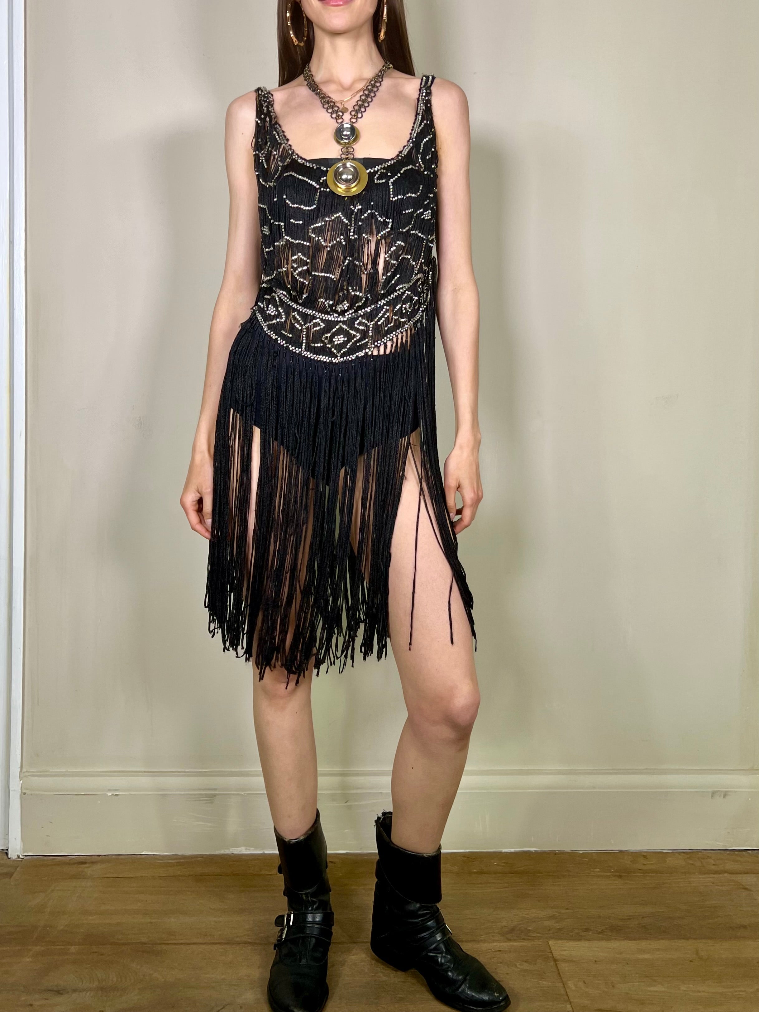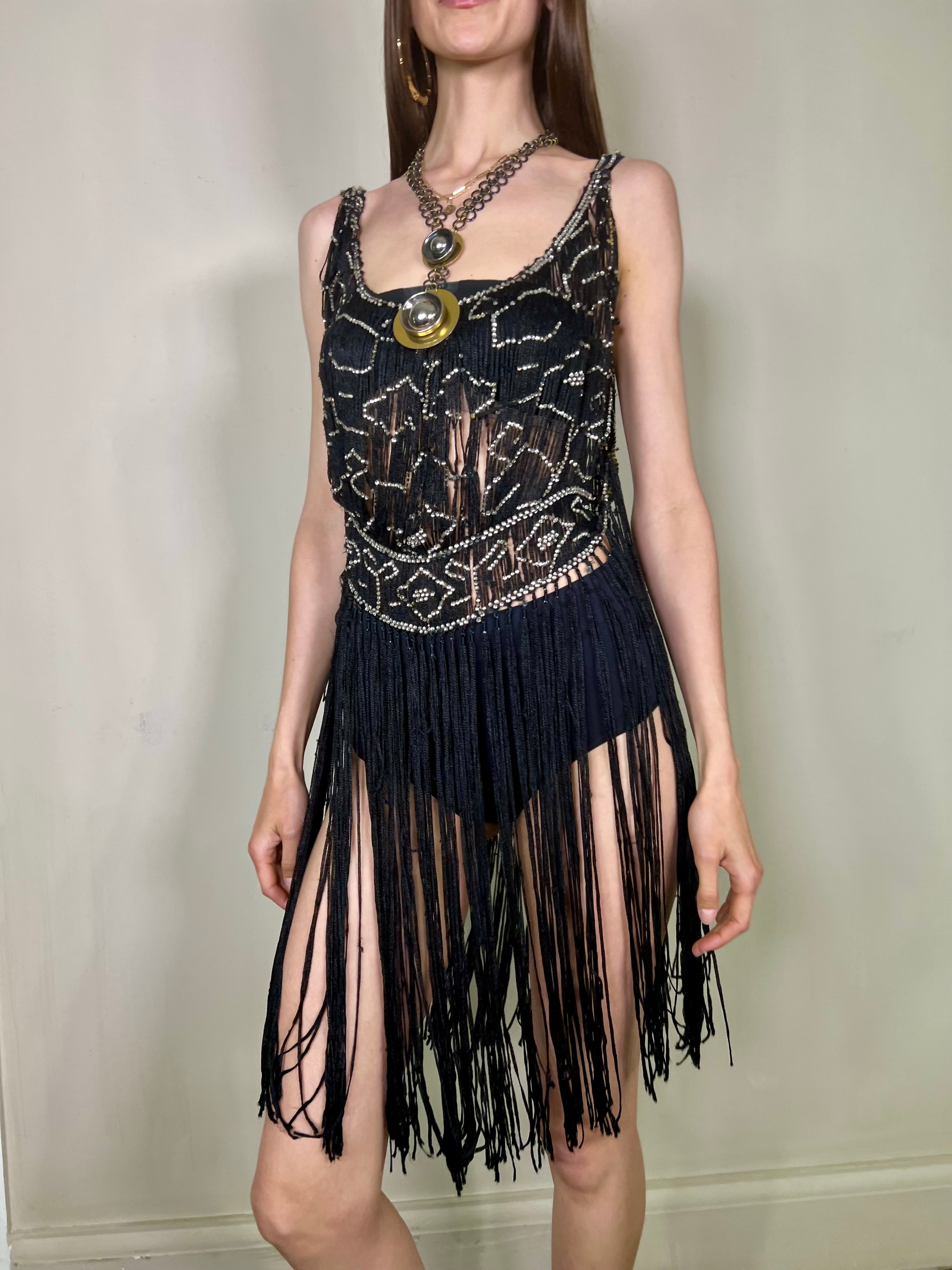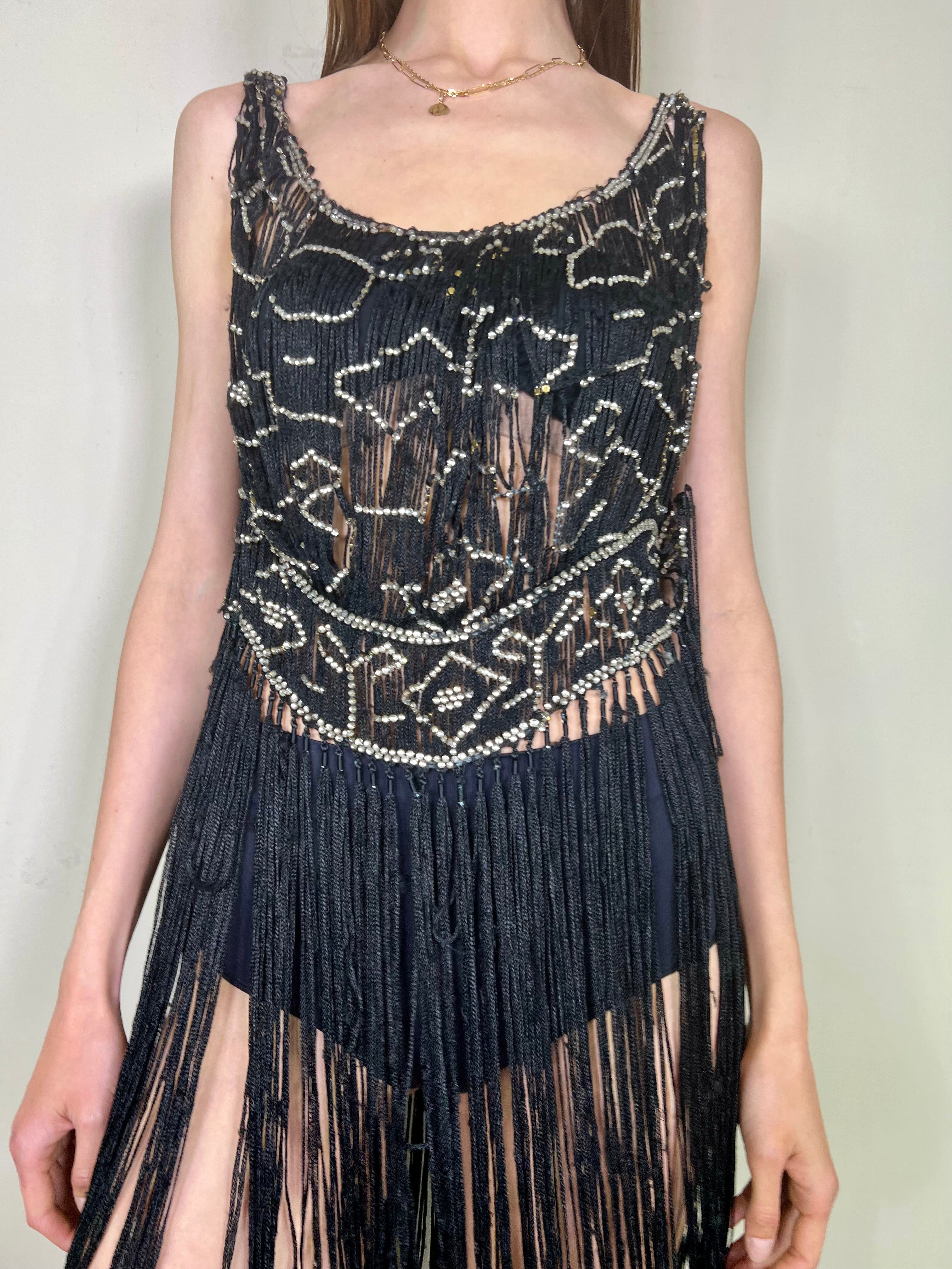 Fabulous 20s fringed black silk and diamanté tabard. This piece has just the right amount of sparkle and looks fab layered over any slip dress, shirt or simply over bikini. Fastens on the side with 2 hooks.