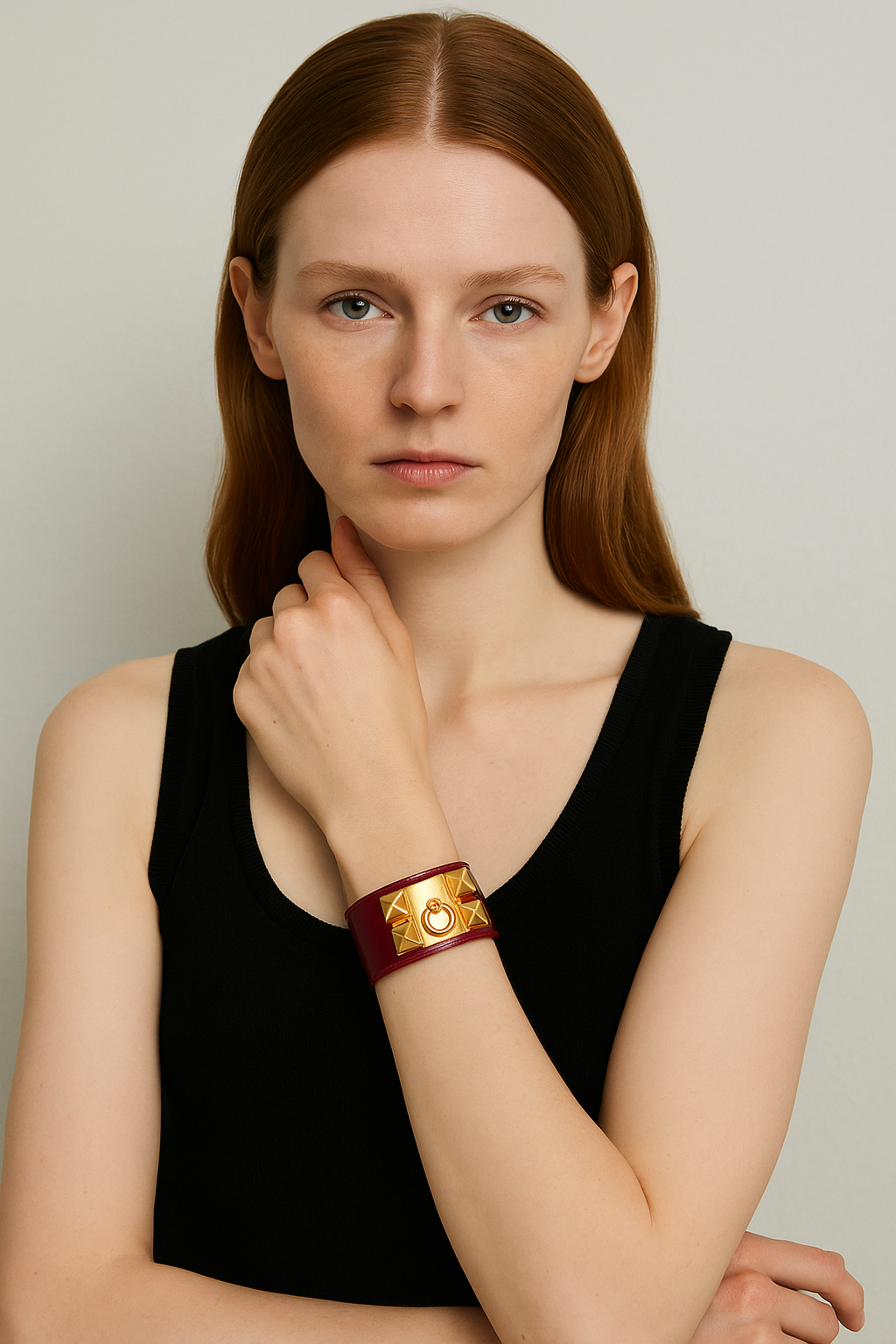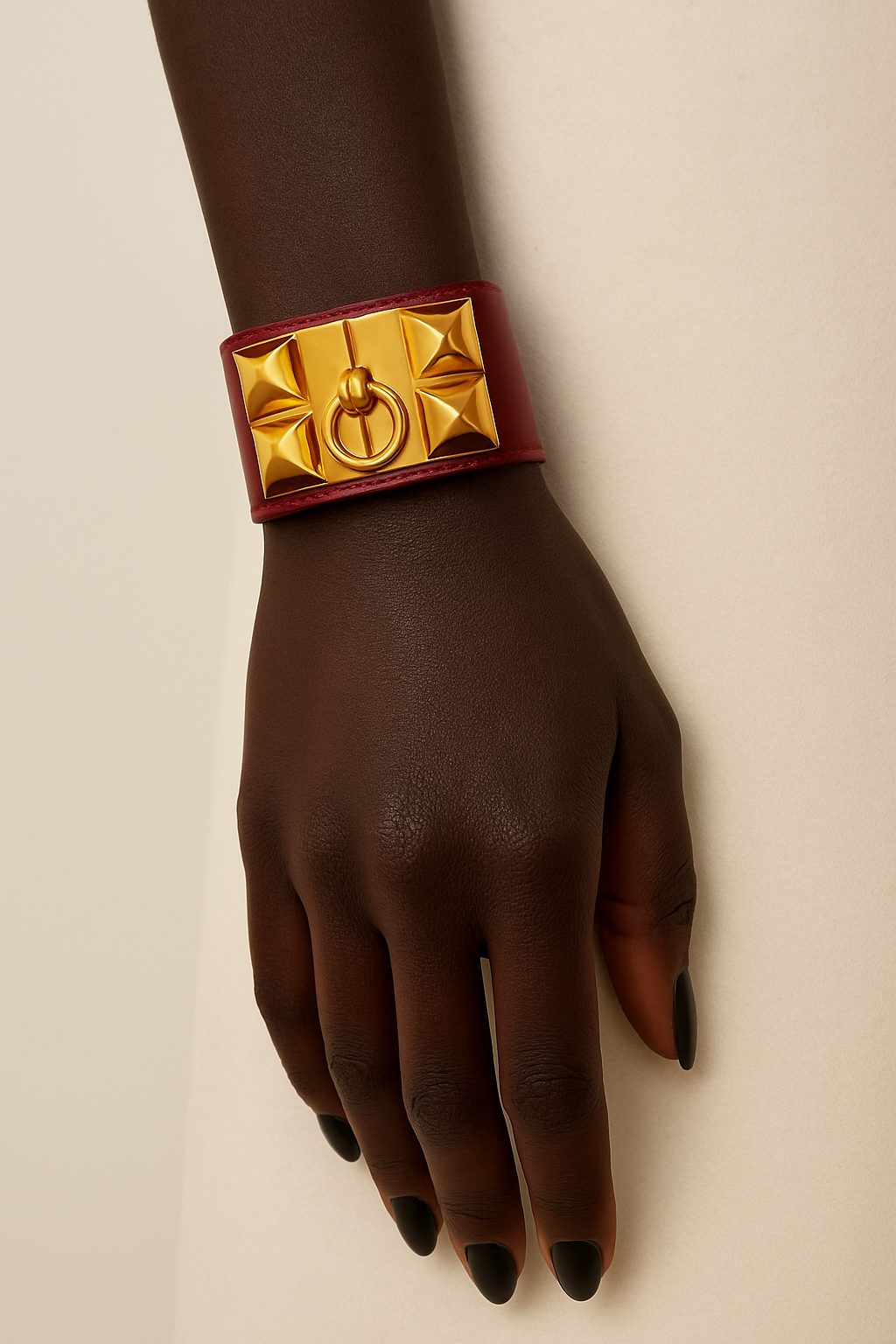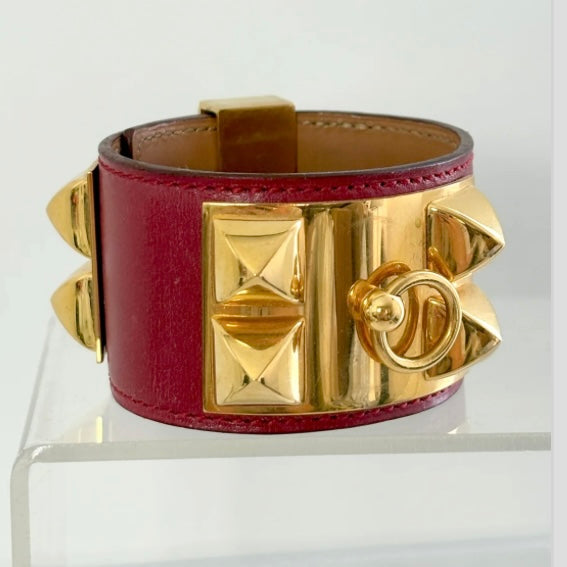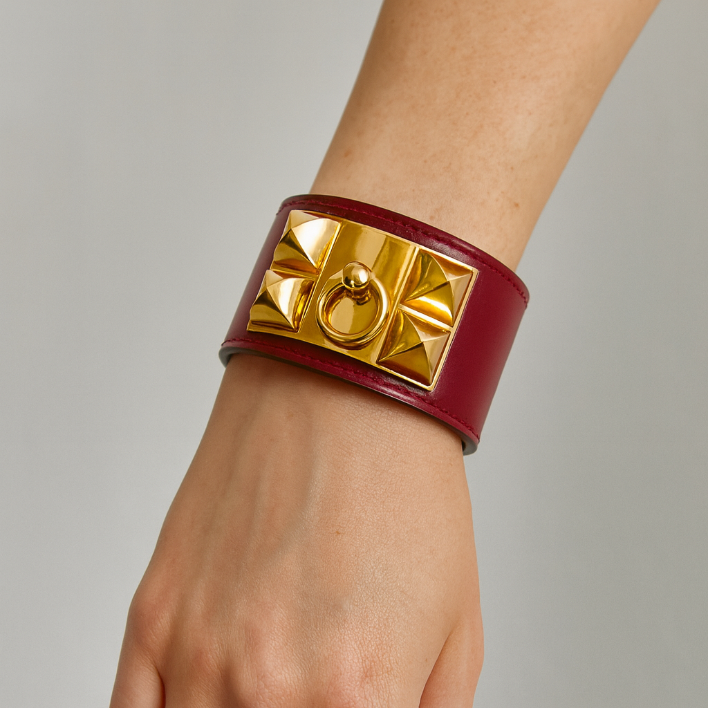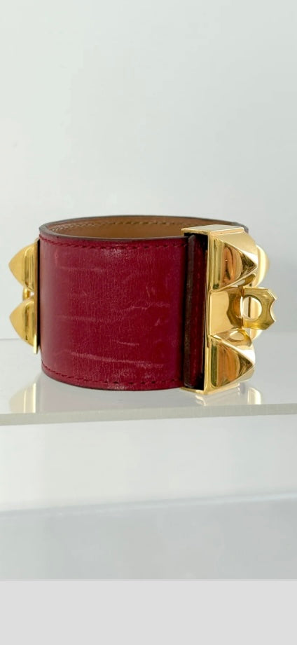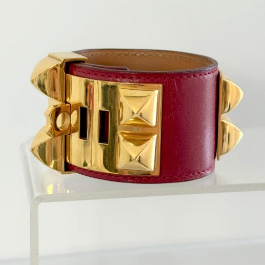 This Hermés Collier de Chien bracelet from the 1980s showcases luxurious burgundy nappy leather paired with iconic gold hardware, reflecting timeless vintage elegance. Renowned for its craftsmanship, the bracelet combines classic design with exceptional comfort, making it a distinguished accessory for collectors and connoisseurs of fine leather goods.