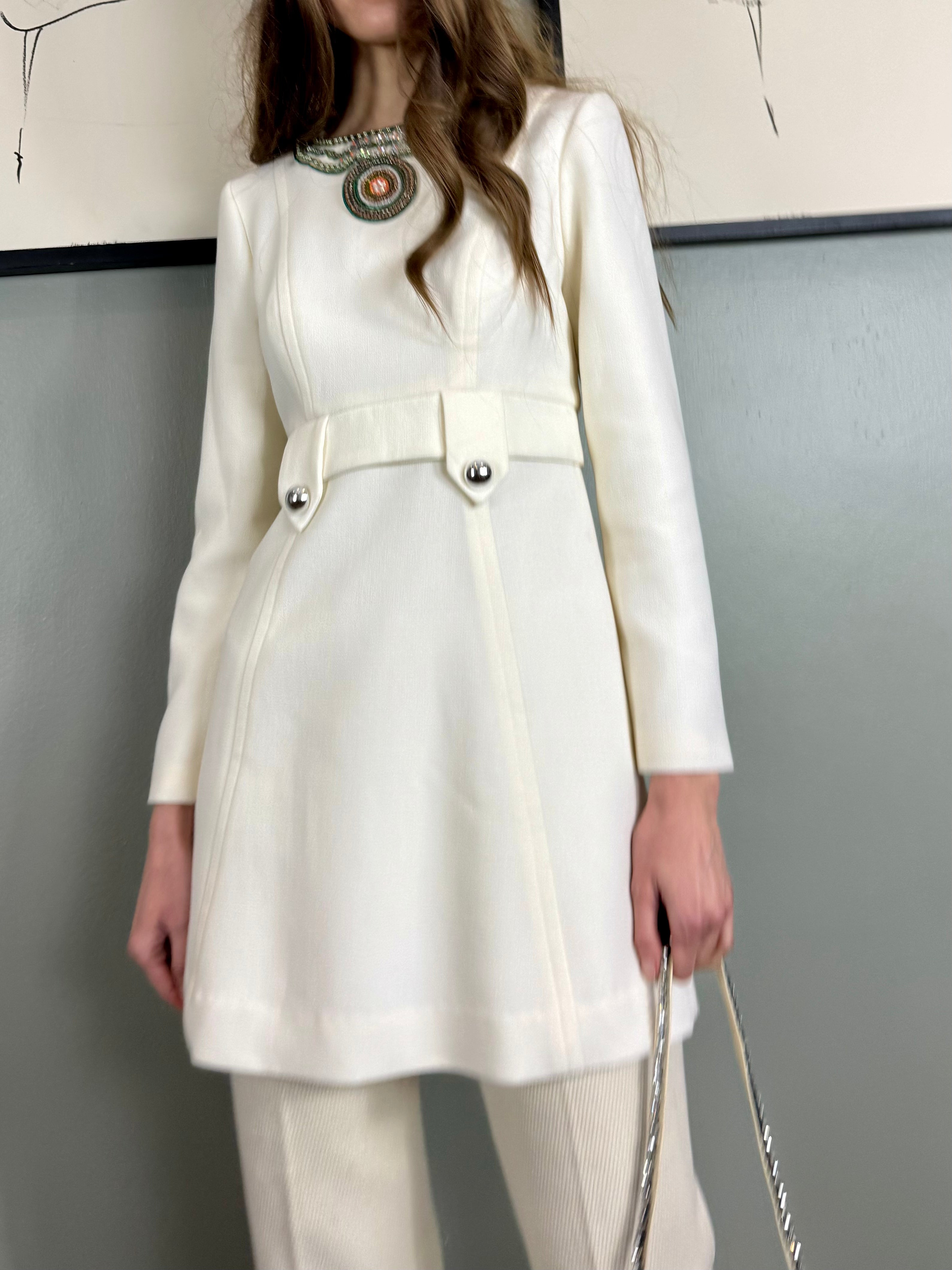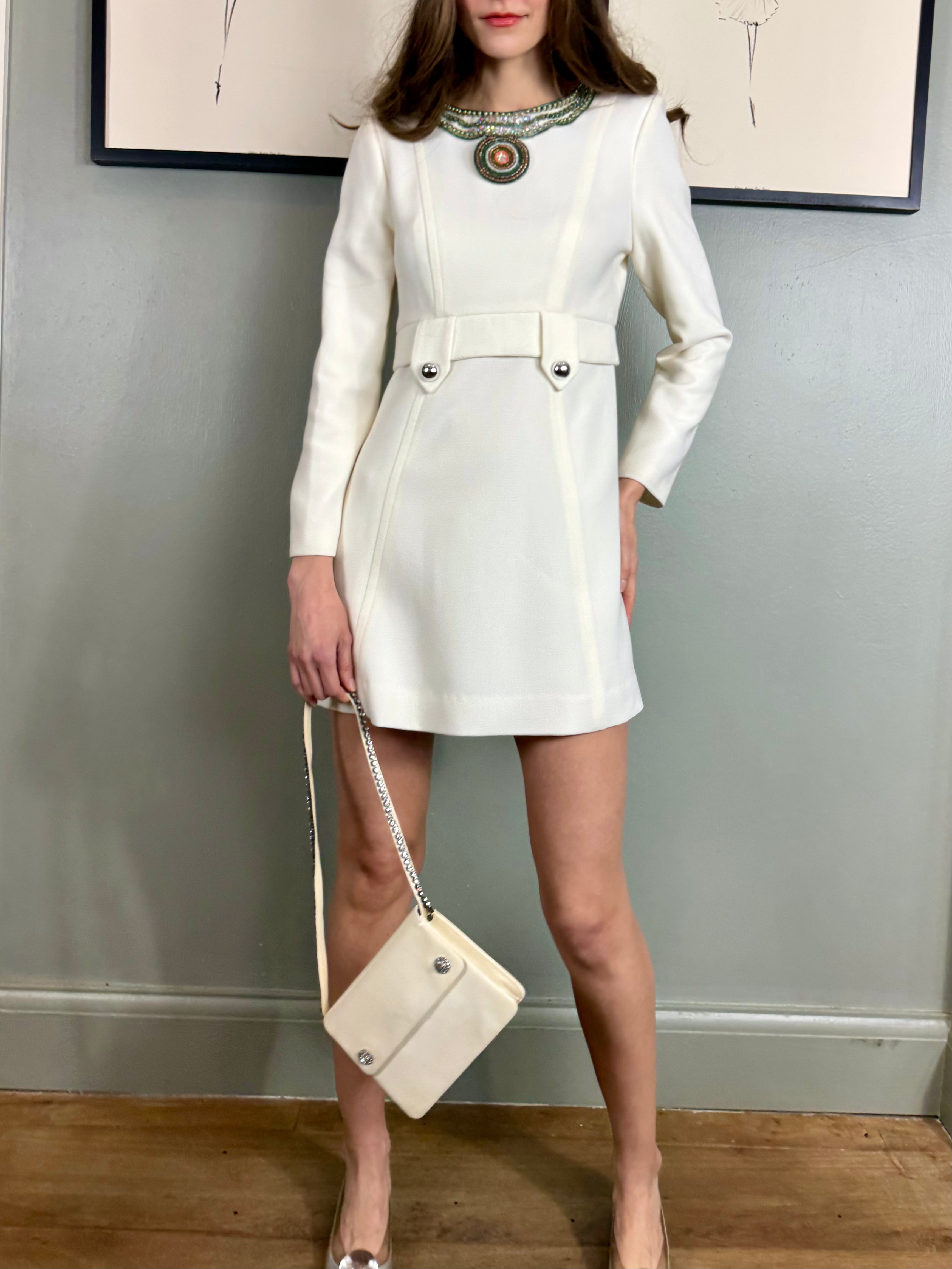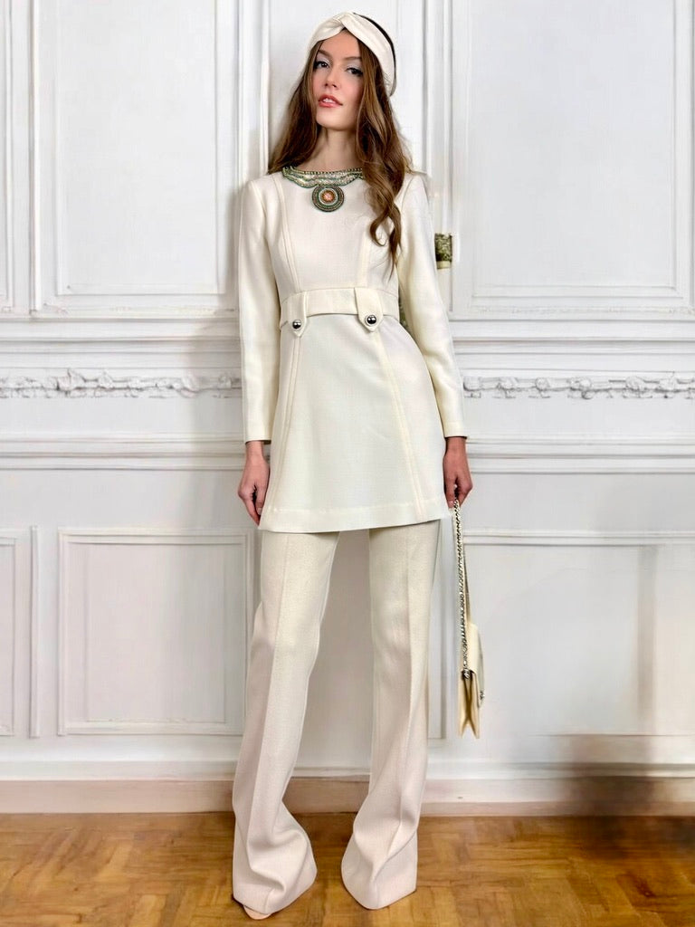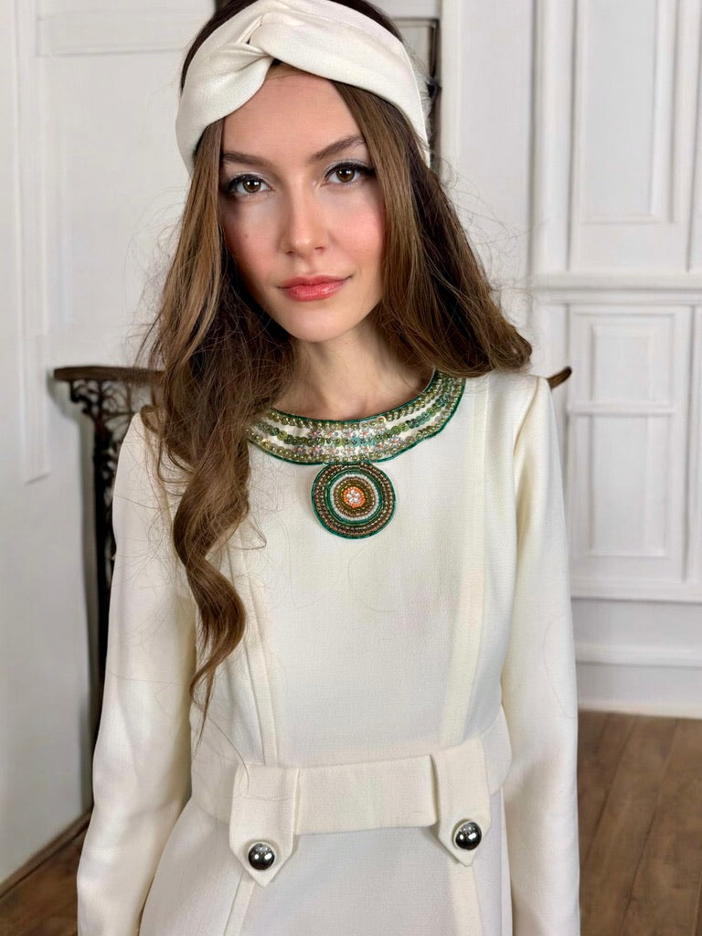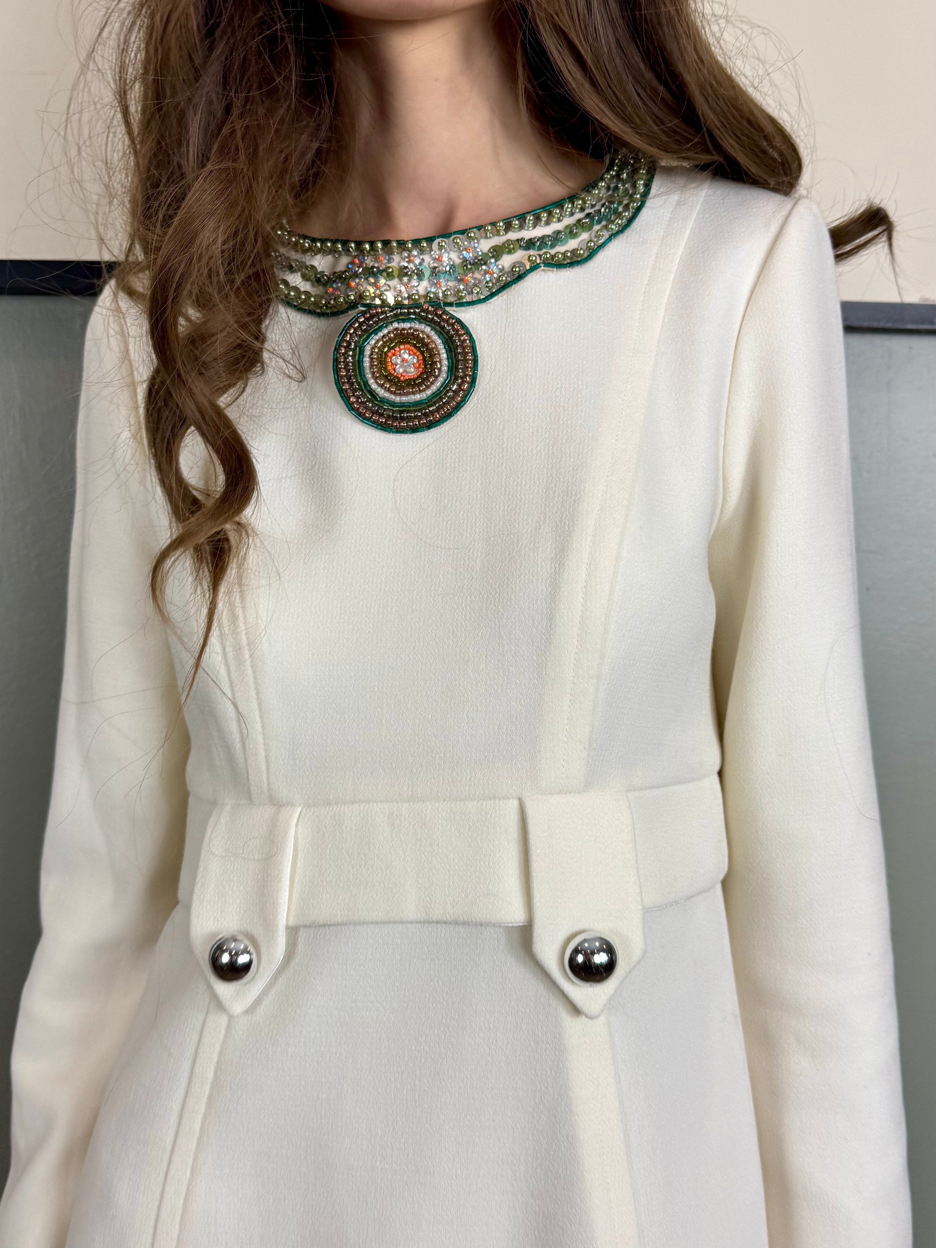 This charming retro dress by Jane Atelier and embellished by One Vintage features long sleeves and a belt design with buttons for a figure-flattering A-line silhouette. The 60s beaded collar and silver buttons add a touch of contemporary style to this classic piece. Looks fabulous paired with flair trousers too for a more modern look. Comes with a matching headband.