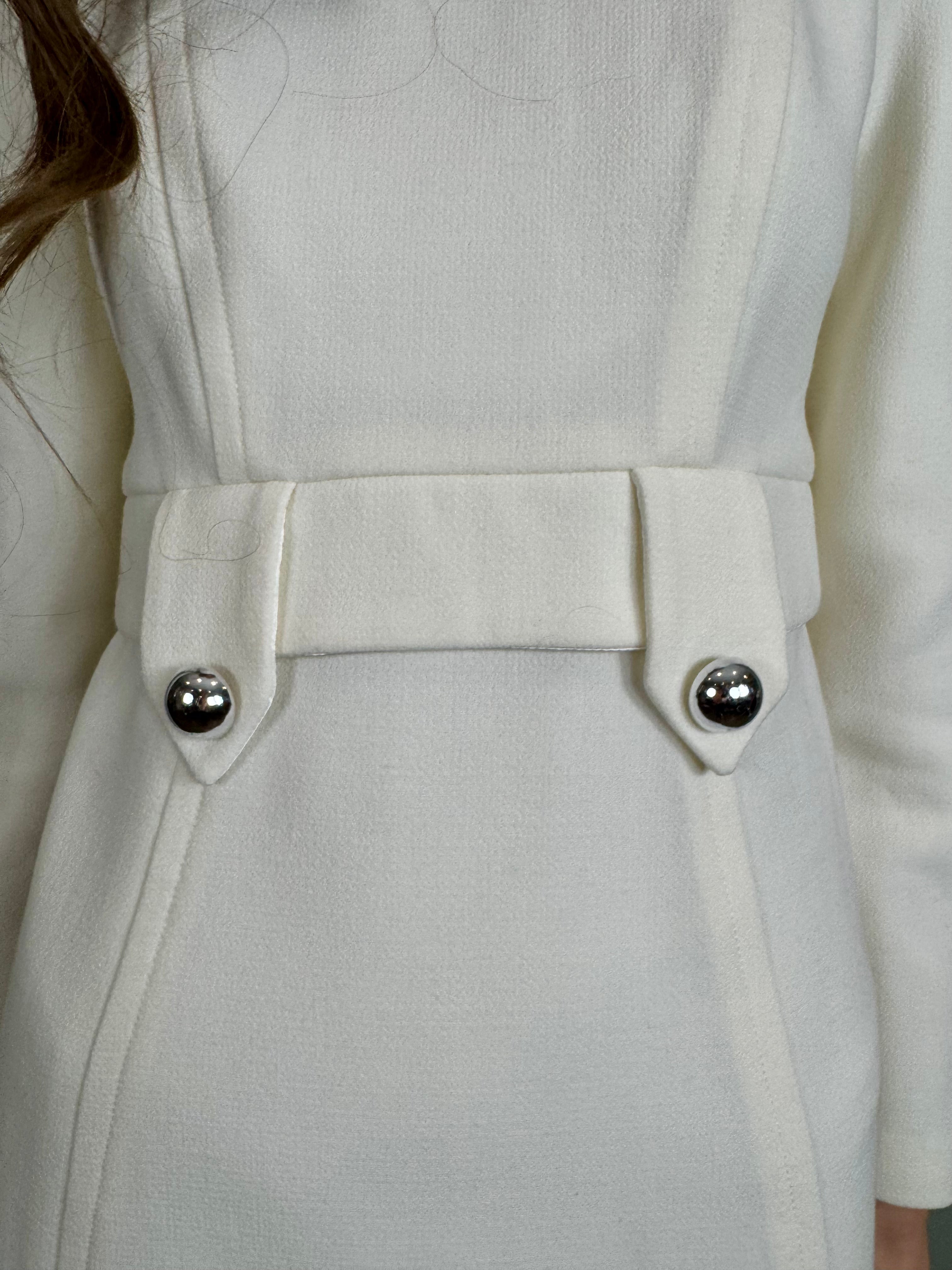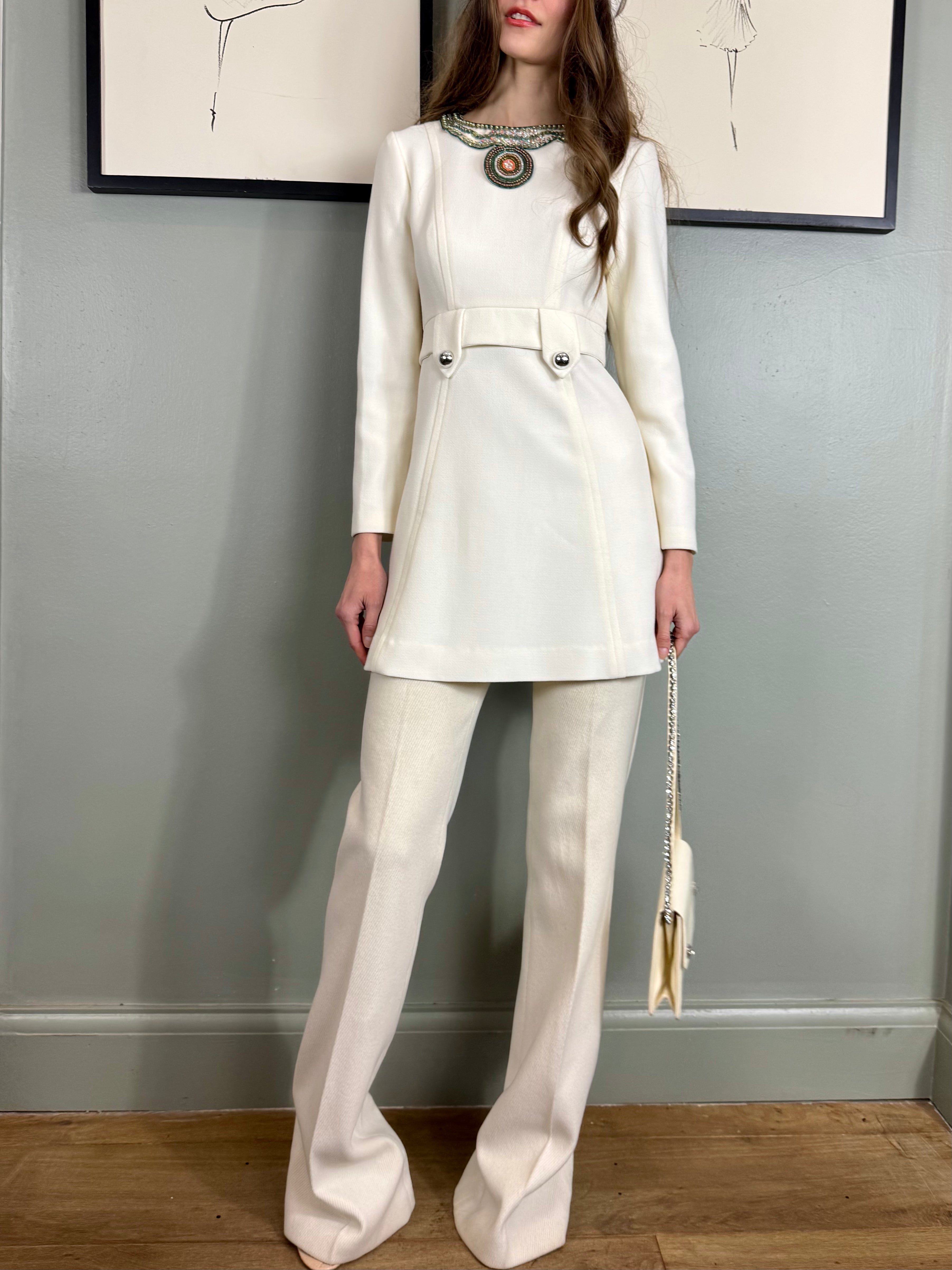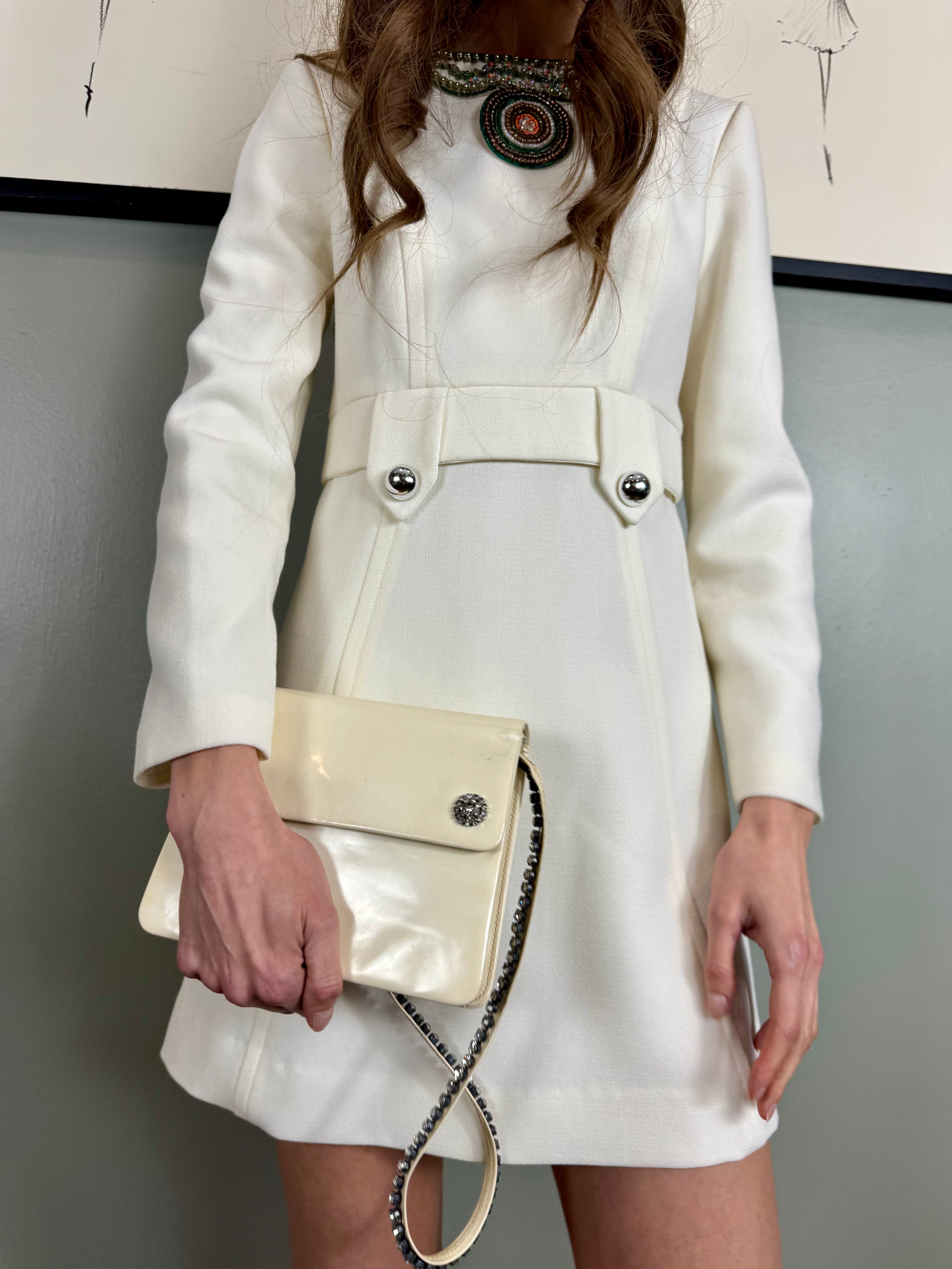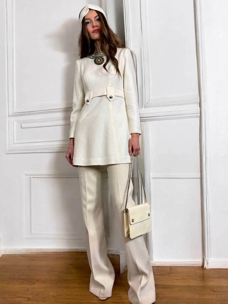 This charming retro dress by Jane Atelier and embellished by One Vintage features long sleeves and a belt design with buttons for a figure-flattering A-line silhouette. The 60s beaded collar and silver buttons add a touch of contemporary style to this classic piece. Looks fabulous paired with flair trousers too for a more modern look. Comes with a matching headband.