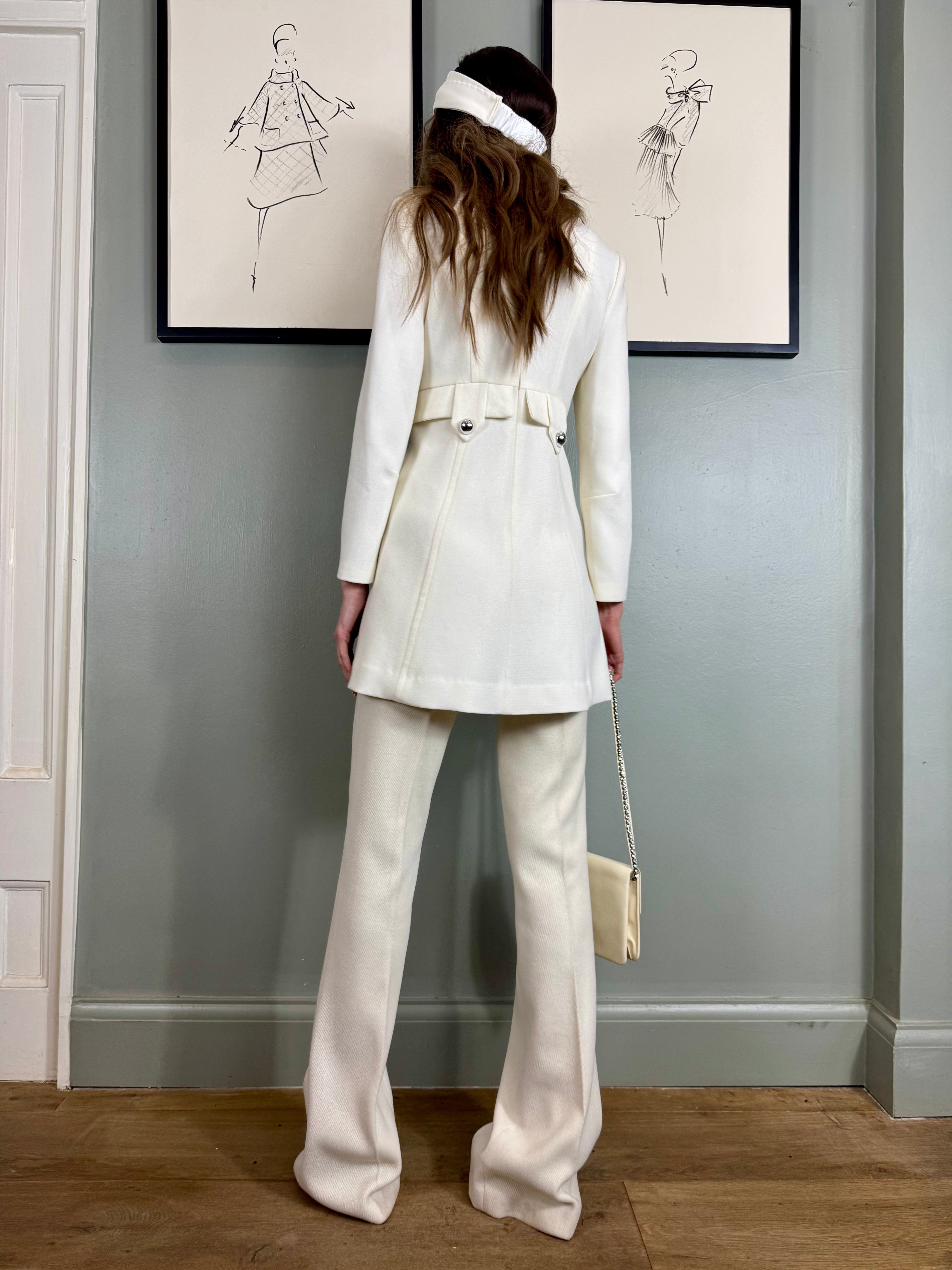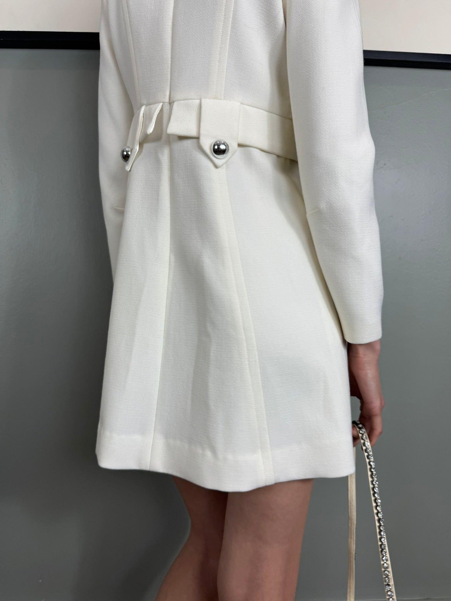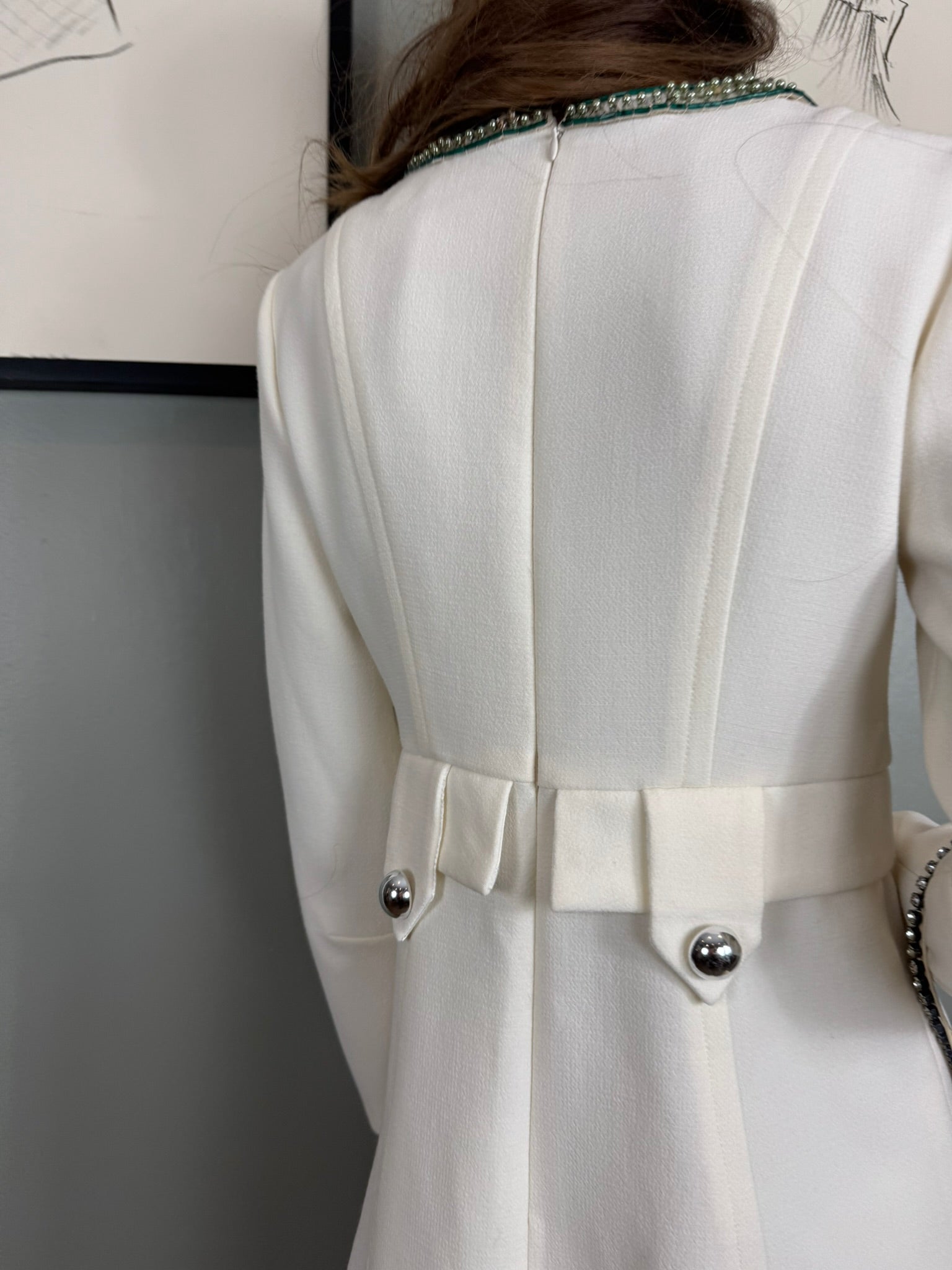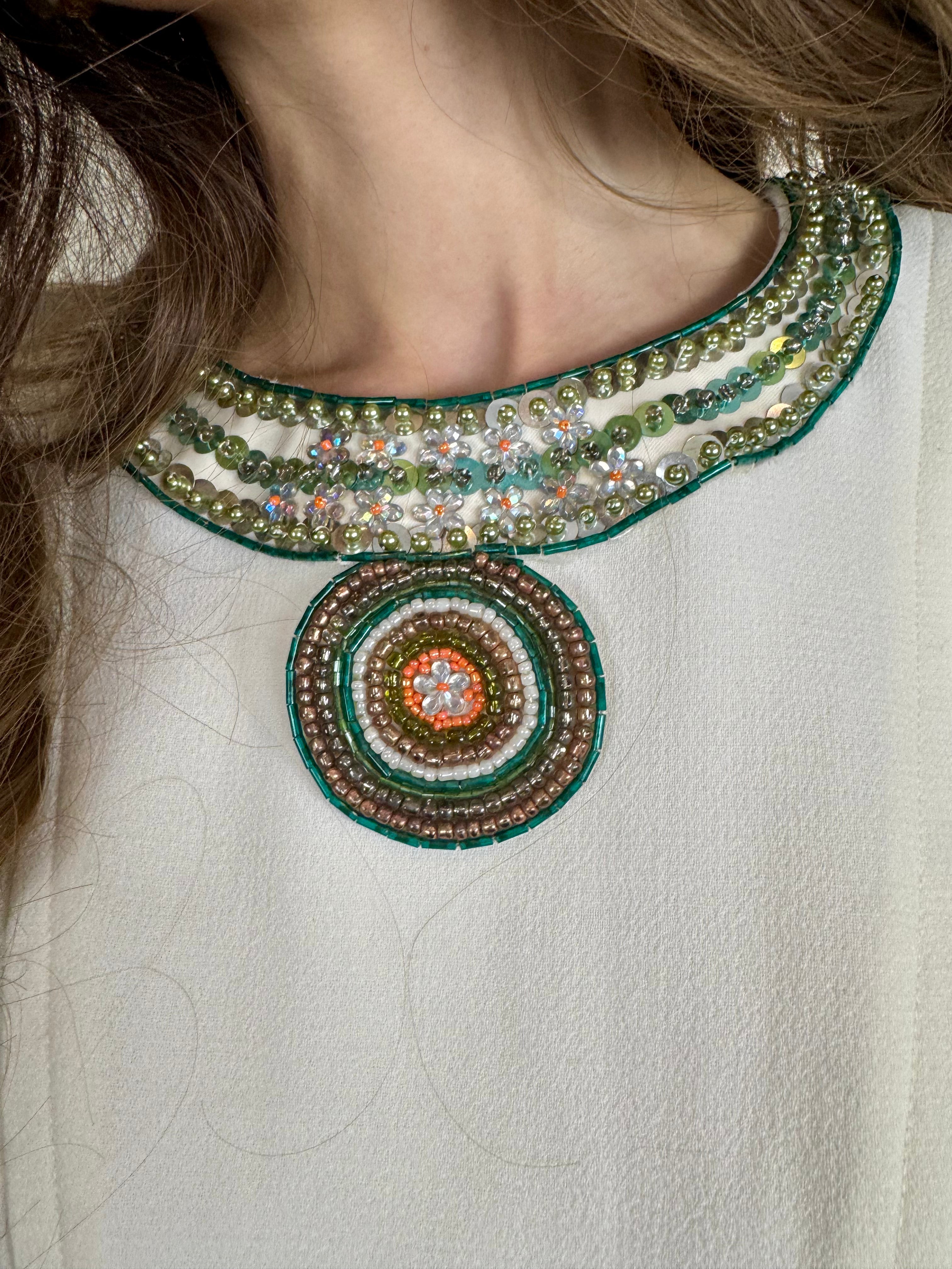 This charming retro dress by Jane Atelier and embellished by One Vintage features long sleeves and a belt design with buttons for a figure-flattering A-line silhouette. The 60s beaded collar and silver buttons add a touch of contemporary style to this classic piece. Looks fabulous paired with flair trousers too for a more modern look. Comes with a matching headband.