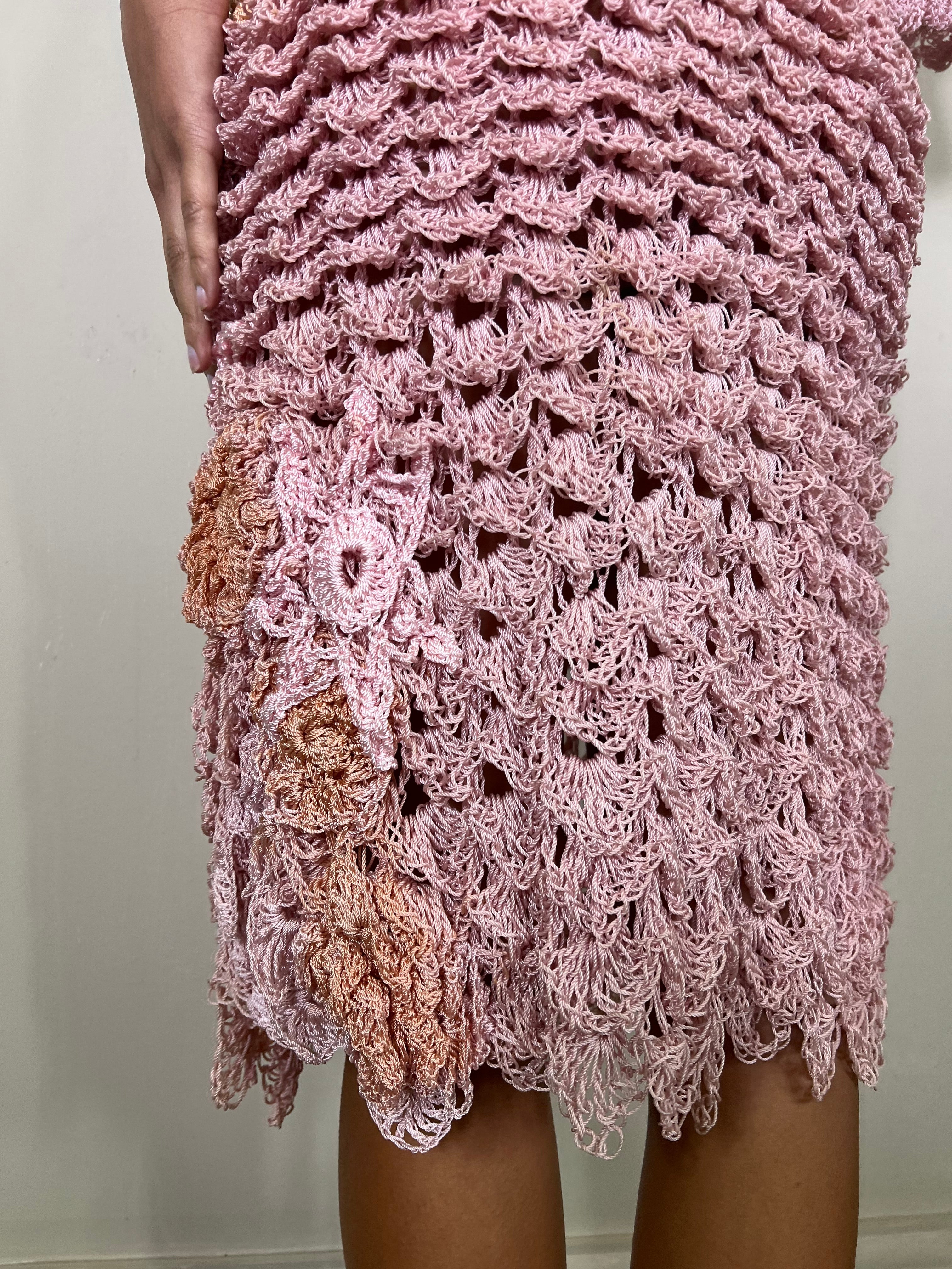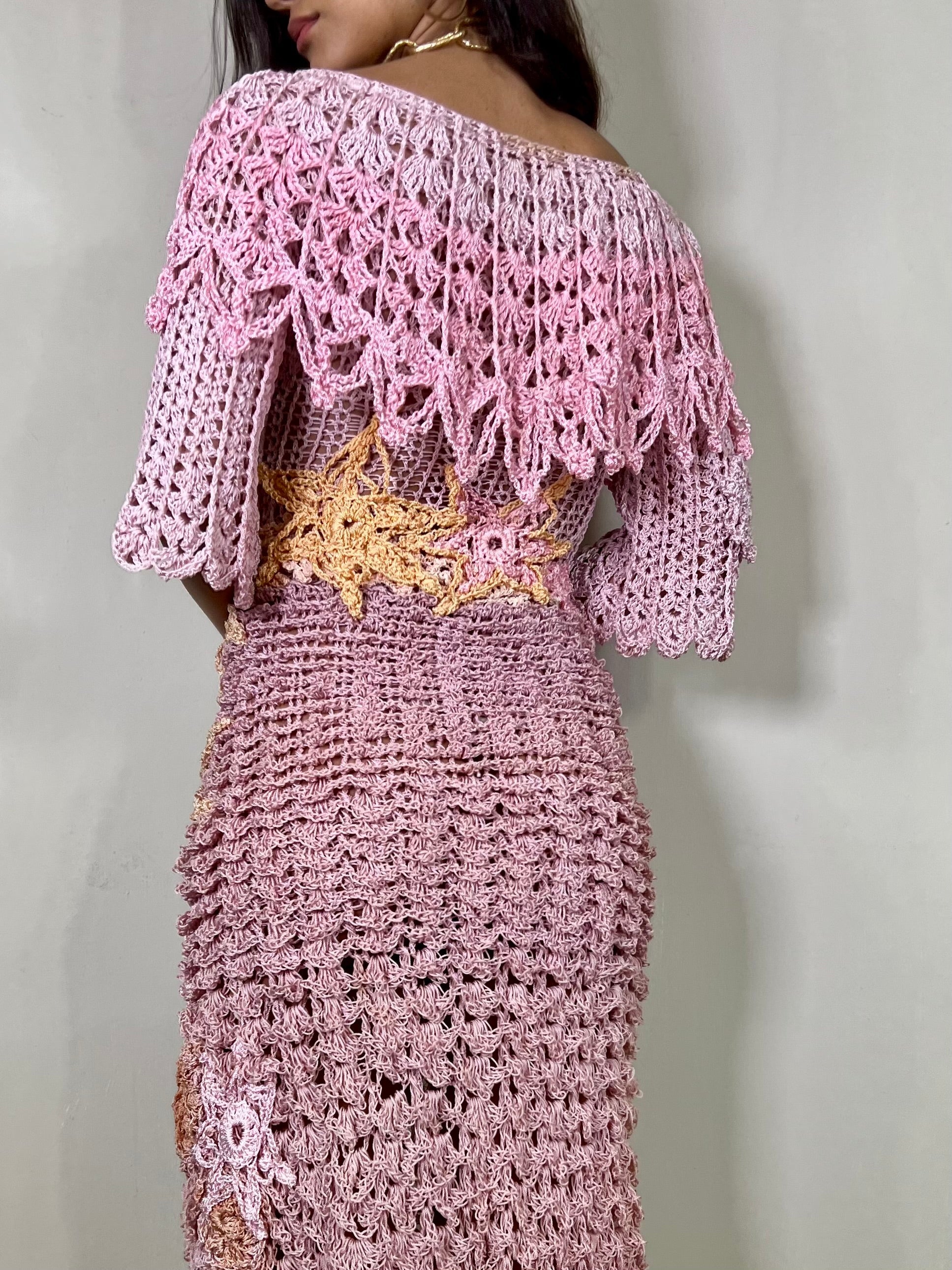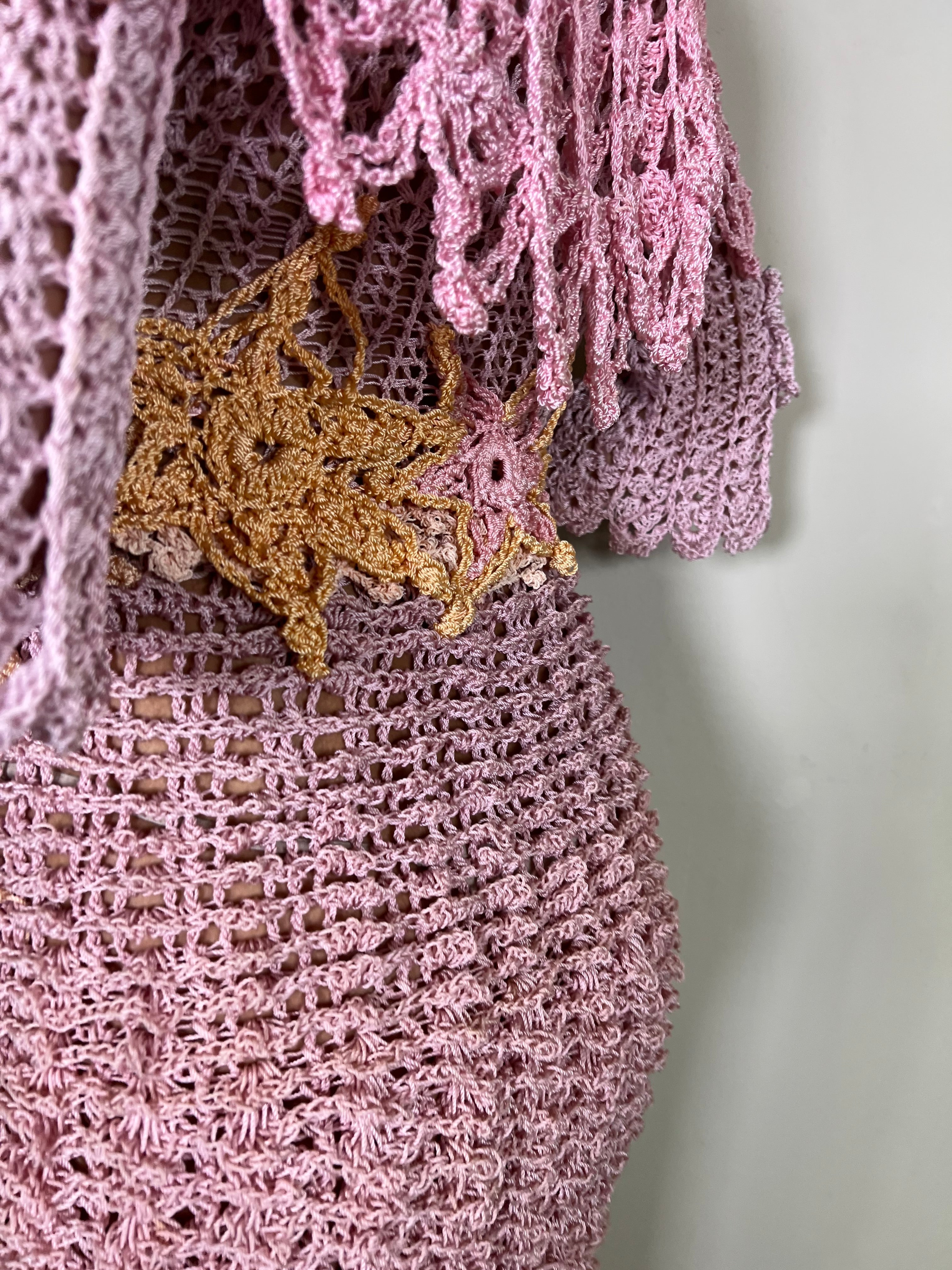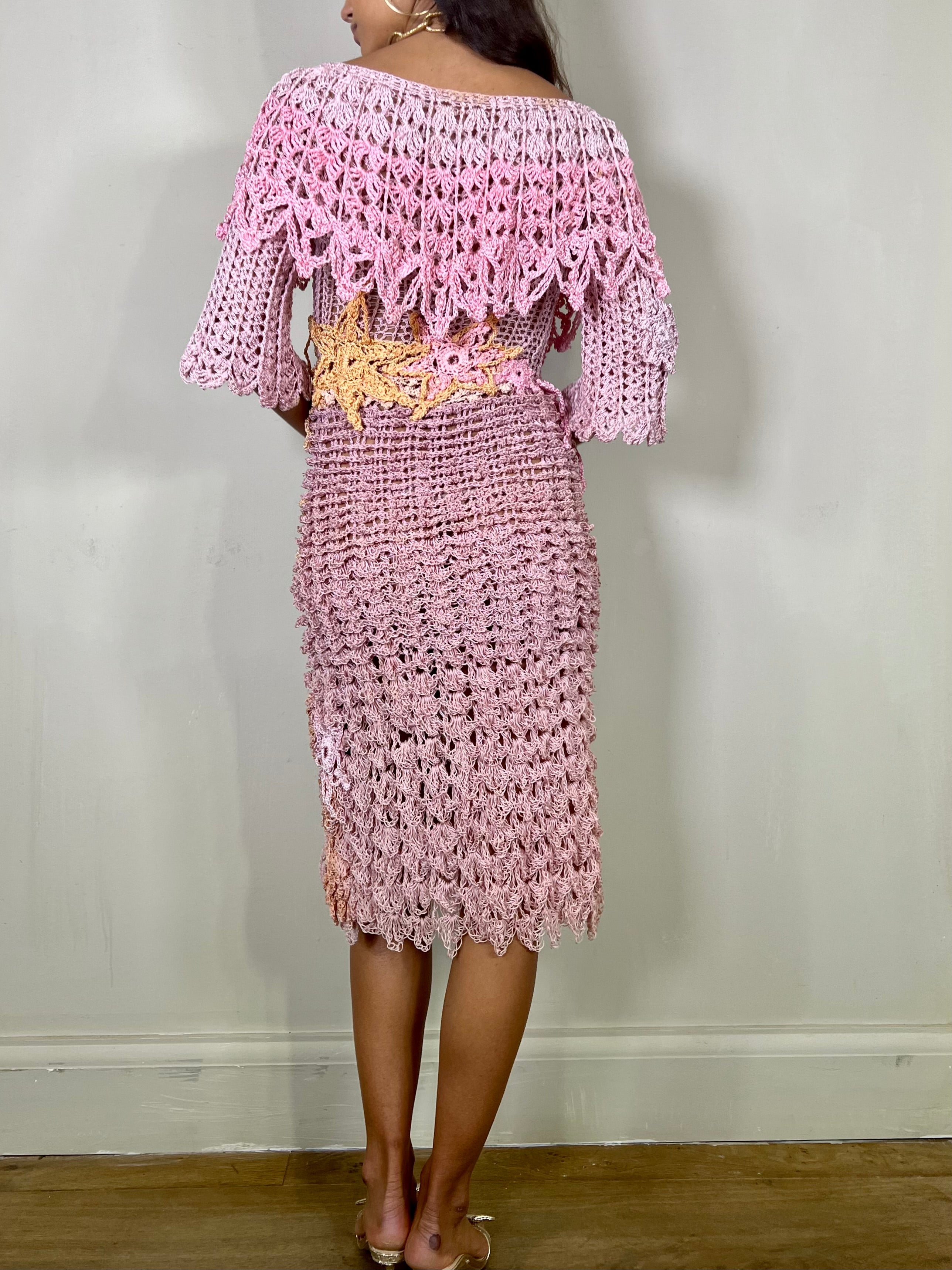 The most incredible 70s pink crochet dress I've ever come across. The fit is snug with almost 5 different types of stitches used to create this chain-mail like wonder! The top has a scoop neckline and mid length sleeves, the skirt has an almost fish scale texture and starfish crochet appliqués across the side. Doesn't have a fastening and expands to hug the body. Just remarkable workmanship. A real collector's piece for all crochet enthusiasts.