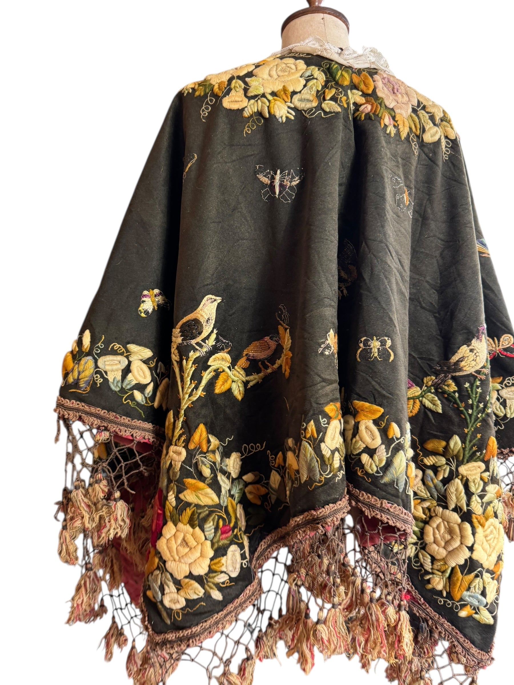 This exquisite 19th-century reworked dark brown cape showcases intricate hand embroidery of embossed flowers and delicate butterflies, highlighting rare craftsmanship. Featuring a refined French lace trim around the collar and neckline, it is completed with a tasteful tassel trim and a discreet neck hook, making it both elegant and wearable. A truly unique piece that blends historical artistry with thoughtful restoration.