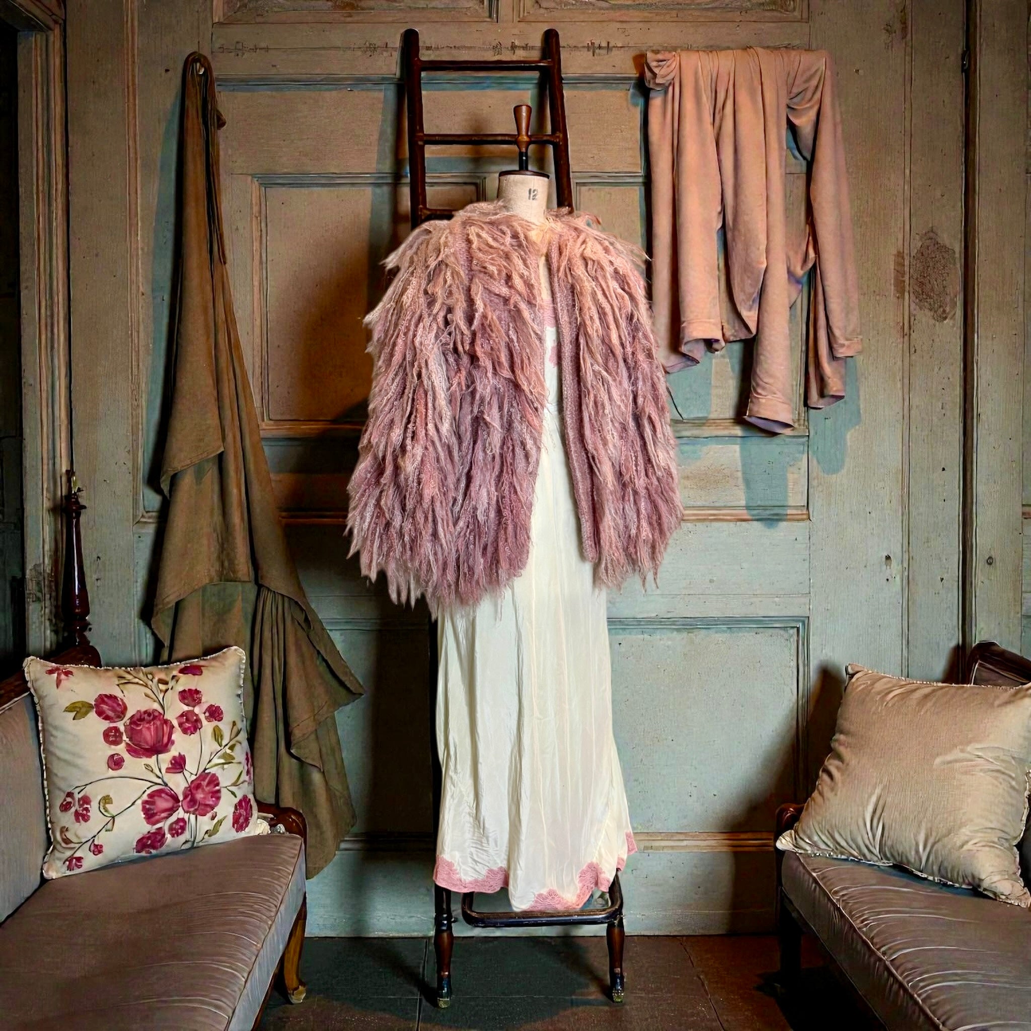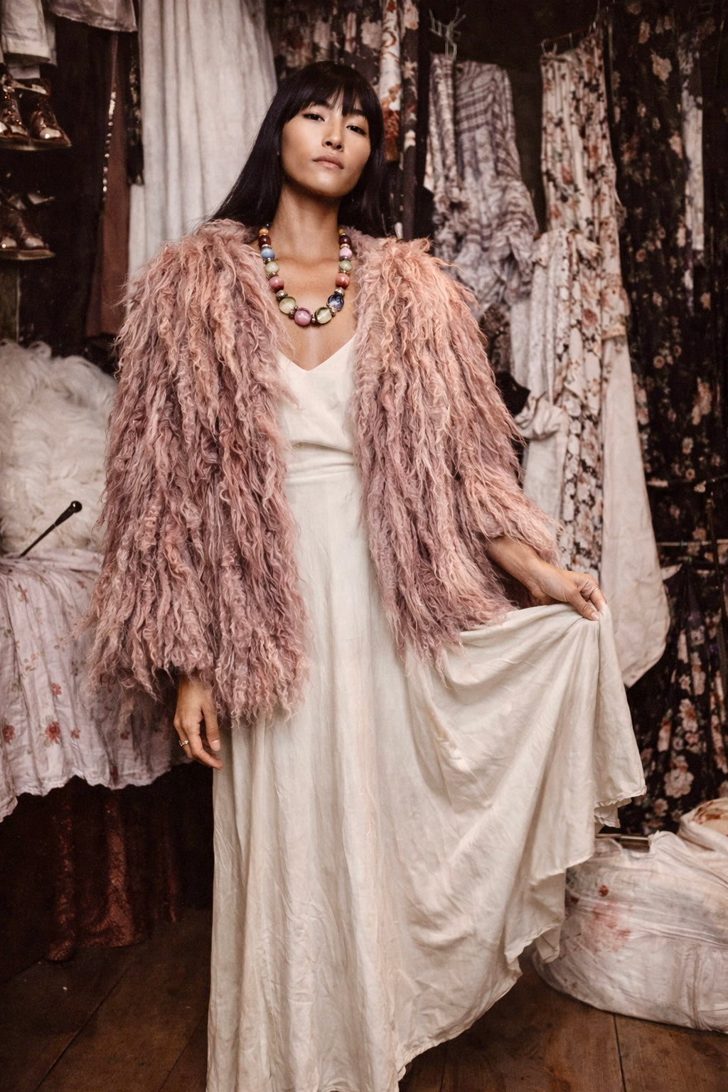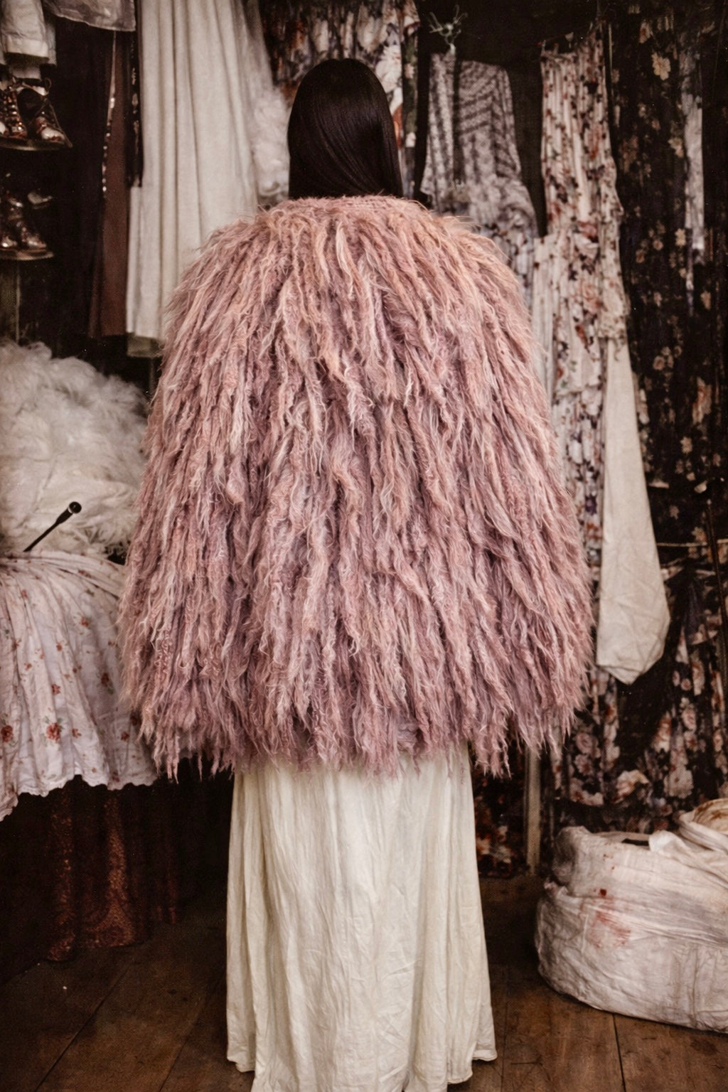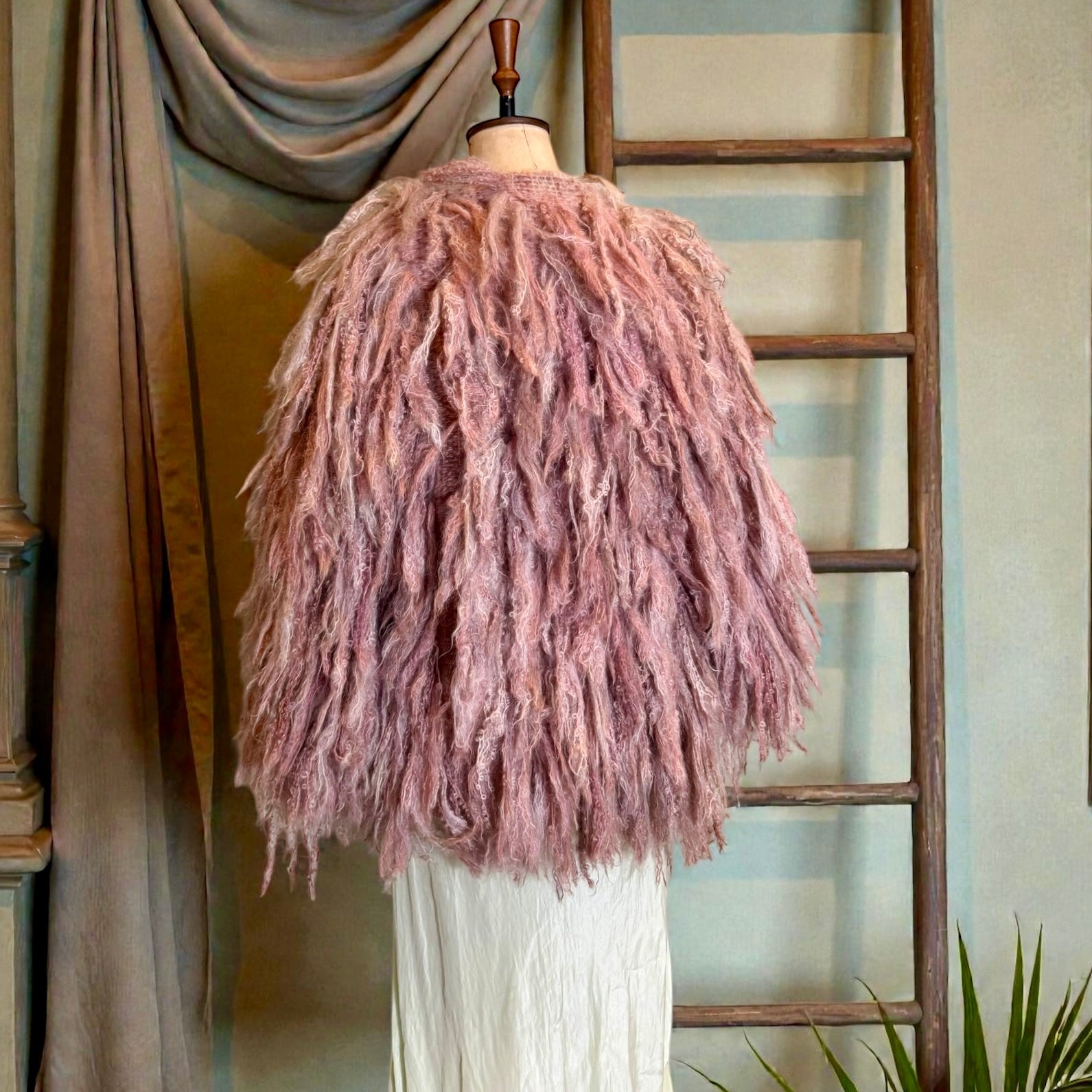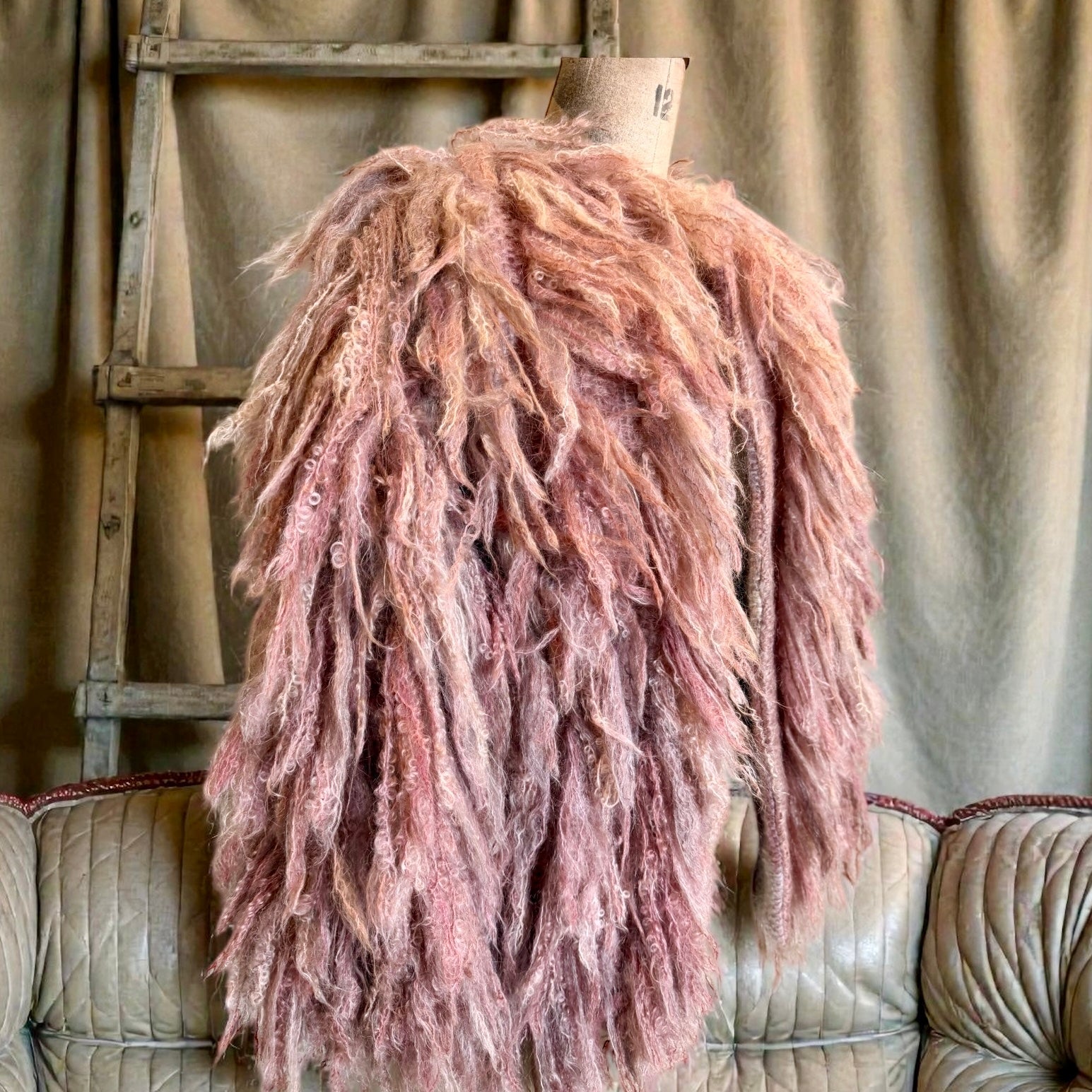 Embodying the essence of effortless cool and self expression of 1970s artistry. Crafted from luxurious luffy wool in an enchanting antique pink, this shaggy jacket features long sleeves and a graceful round neckline, complemented by a sumptuous silk lining. Its timeless loose silhouette promises effortless sophistication, harmonising beautifully with any ensemble. Comes lined in a matching pink silk.
