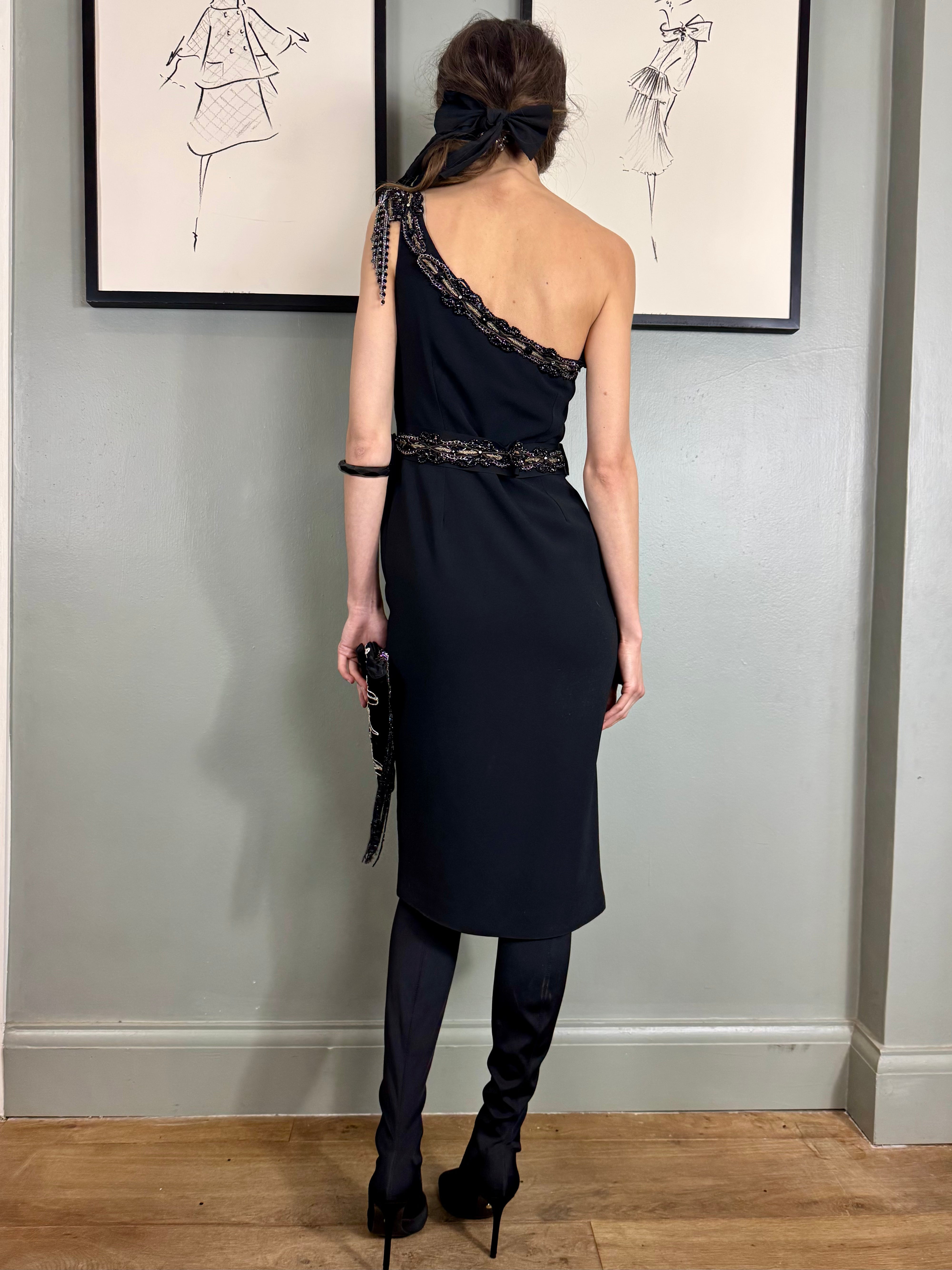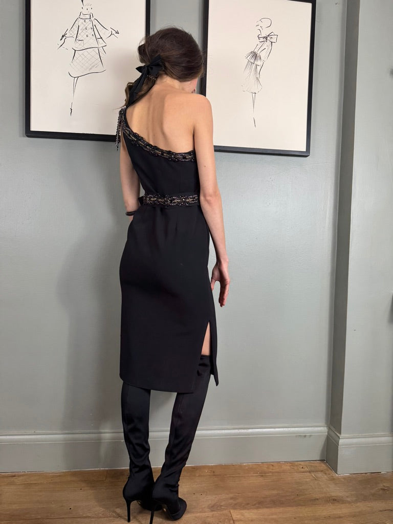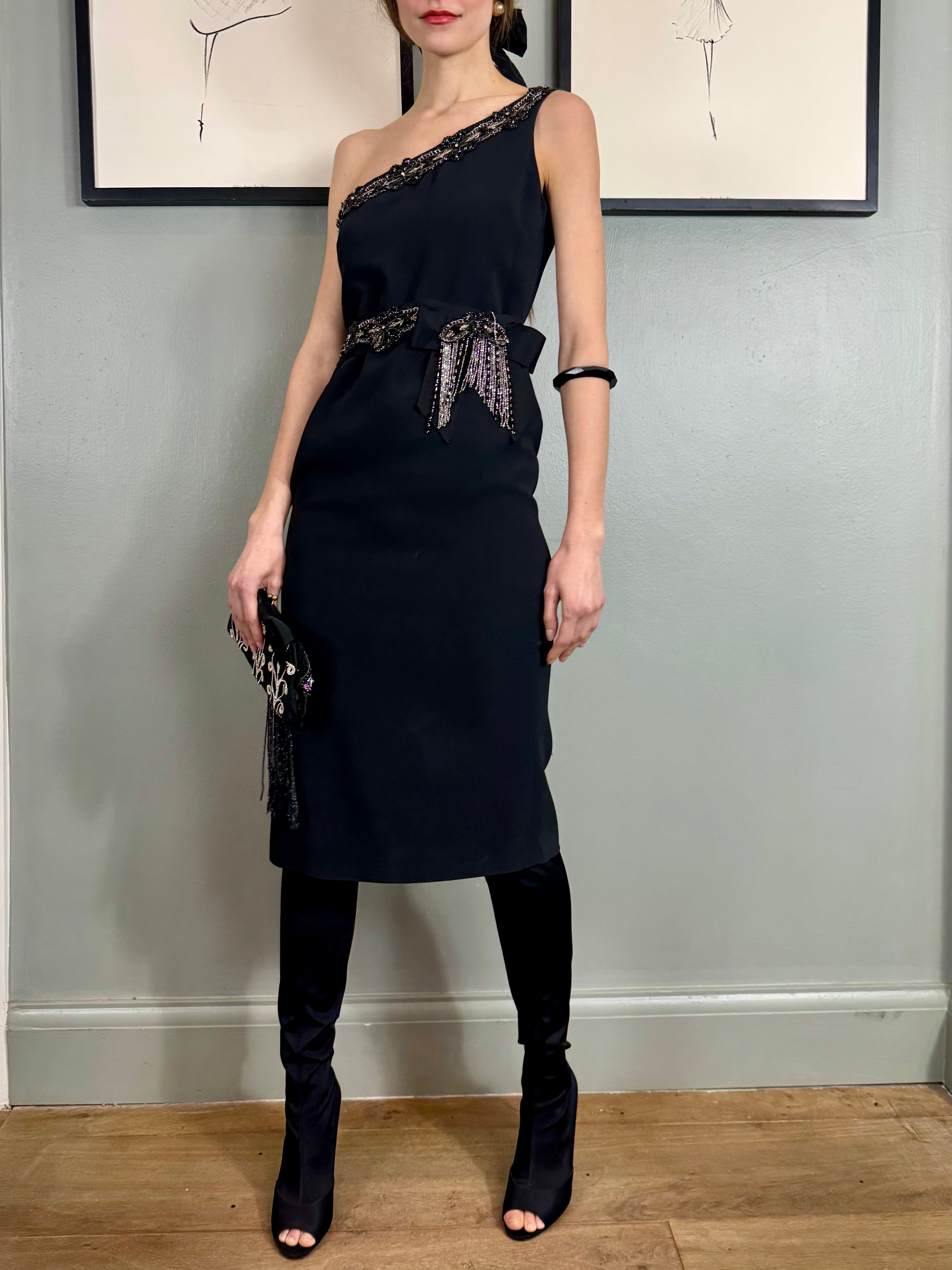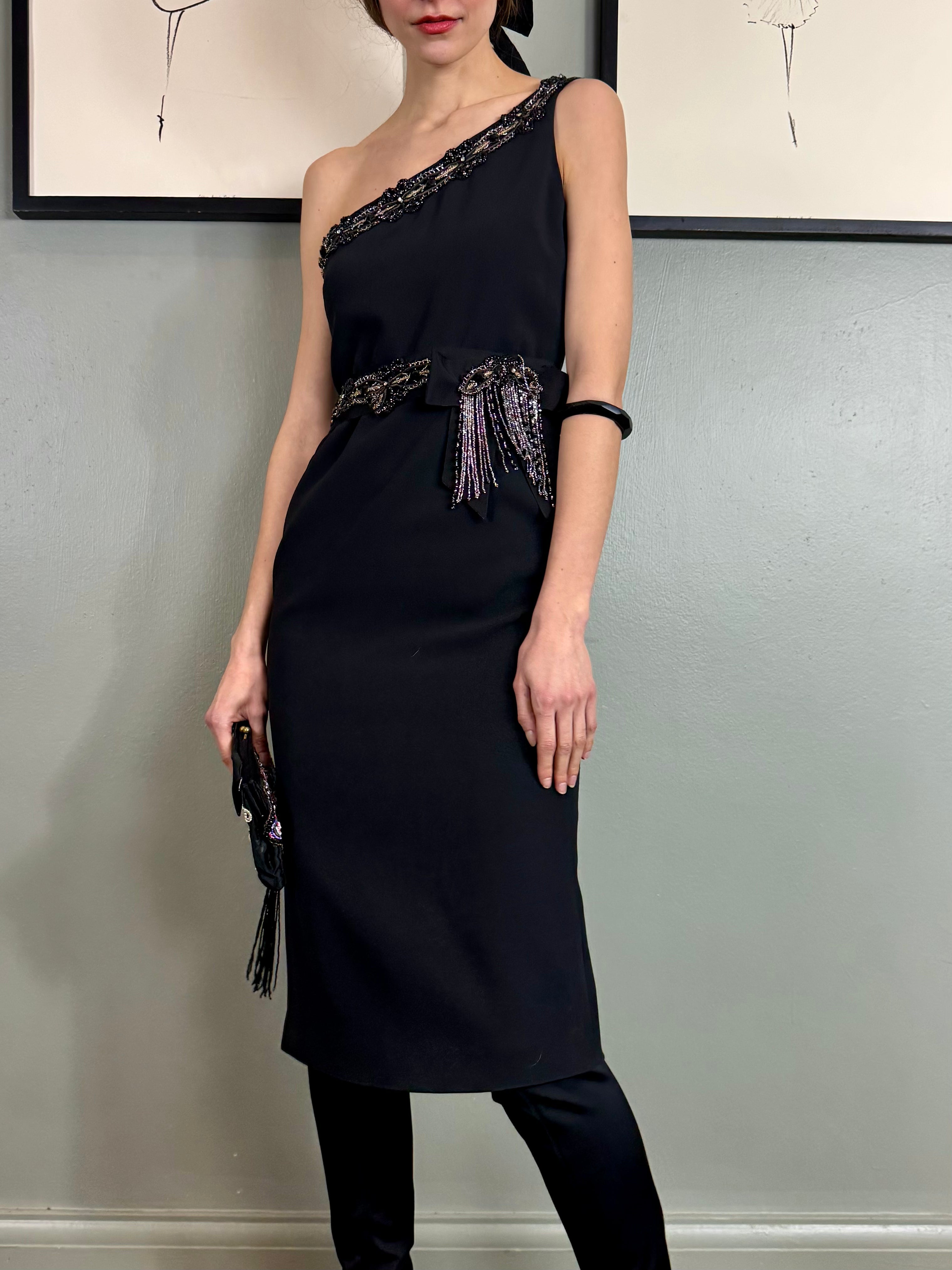 Experience timeless elegance with this chic Jane Atelier Dress embellished by One Vintage. This one shoulder design features a sleek pencil skirt silhouette and a belt detail for a flattering fit. Adorned with Victorian black jet and silver beading along the neckline and belt, featuring cascading fringing down the shoulder and bow. This dress is a flattering one-off classic reimagined.