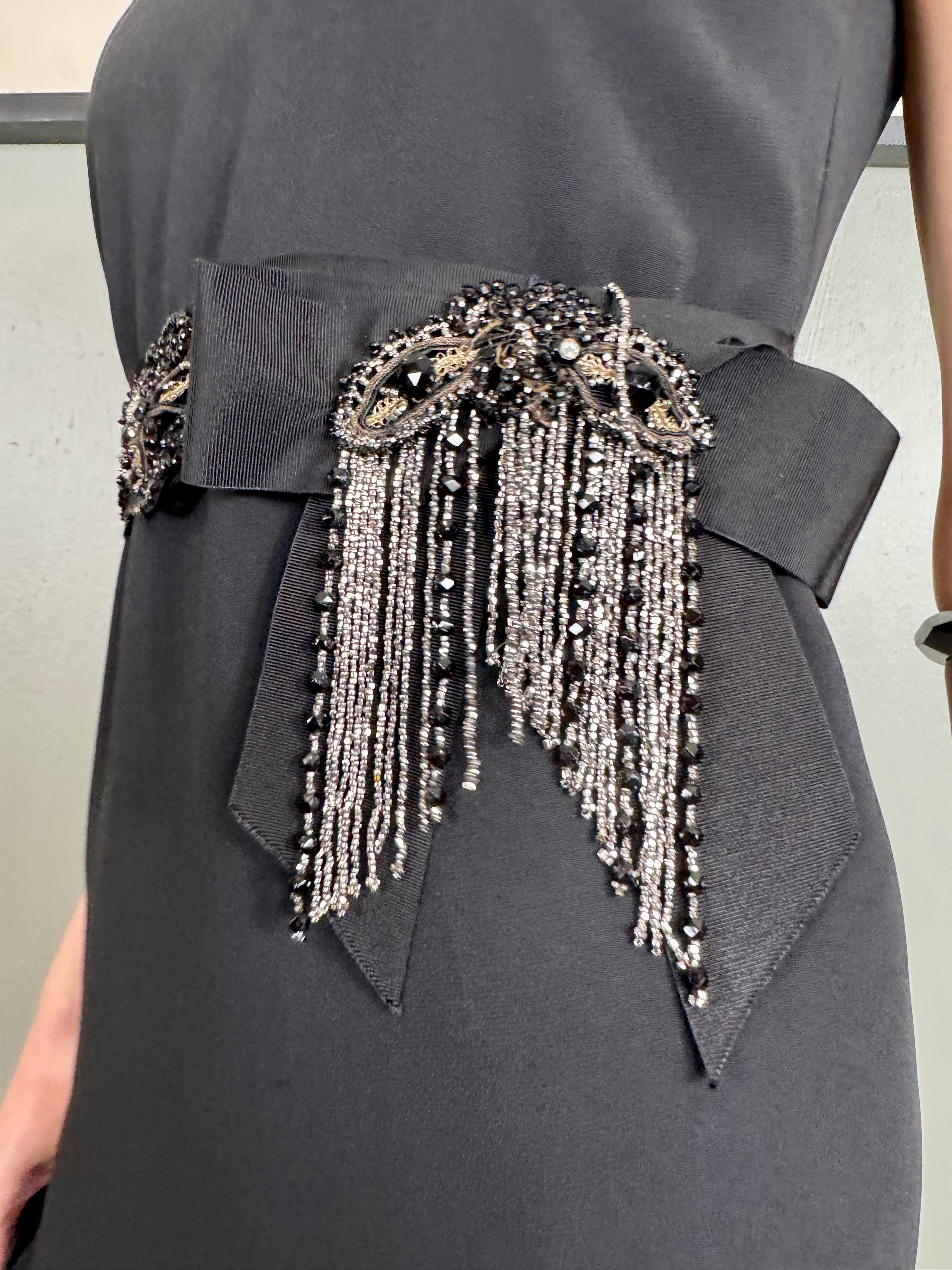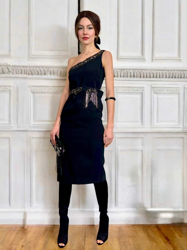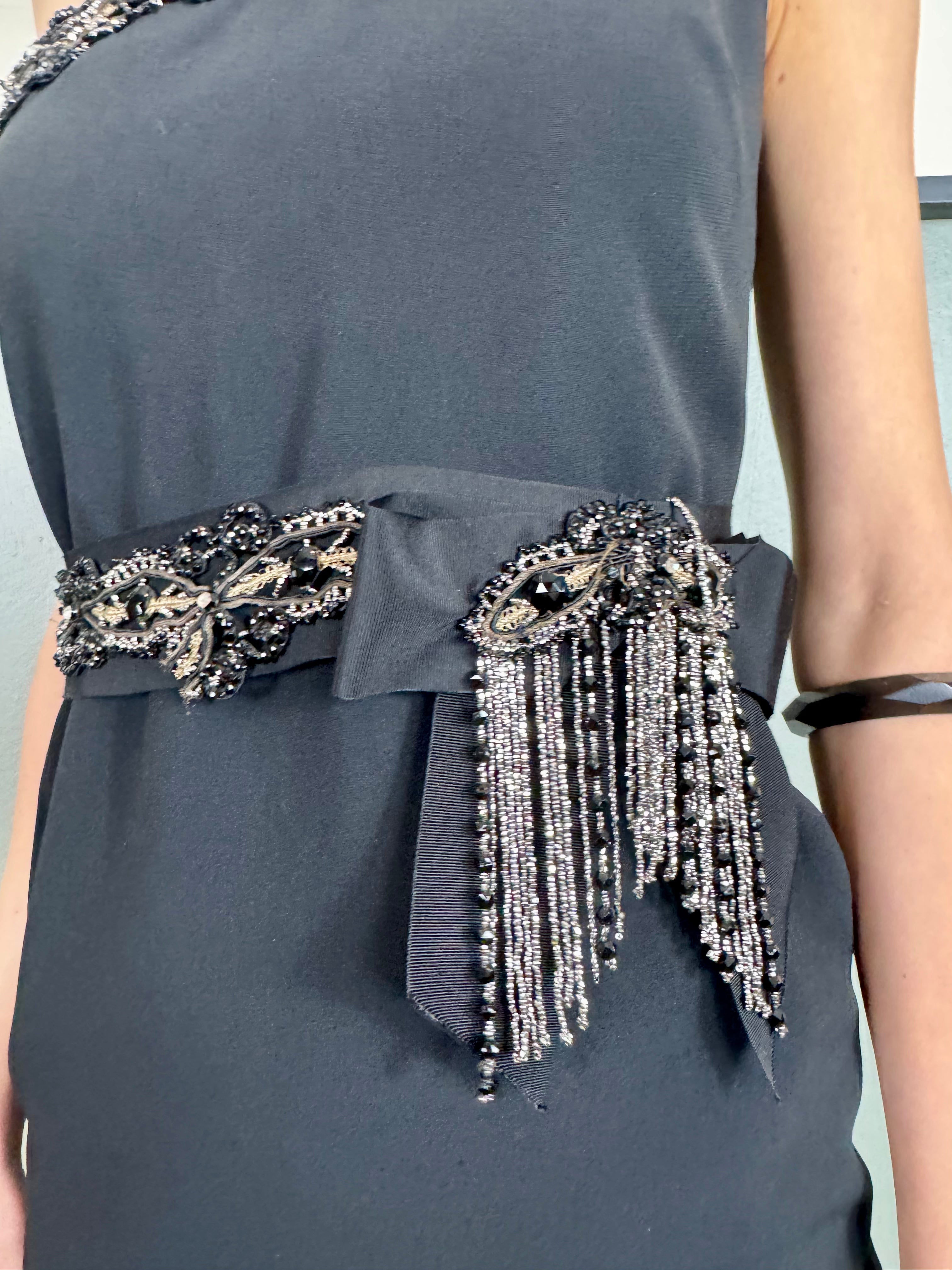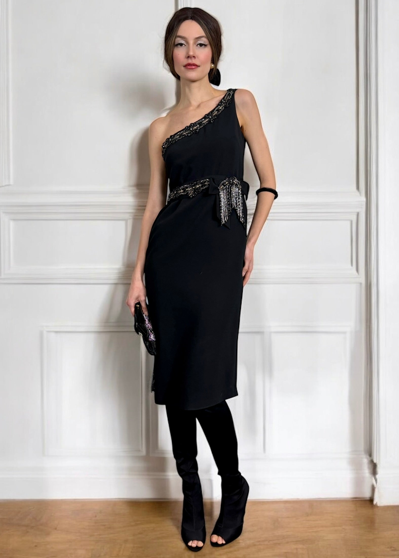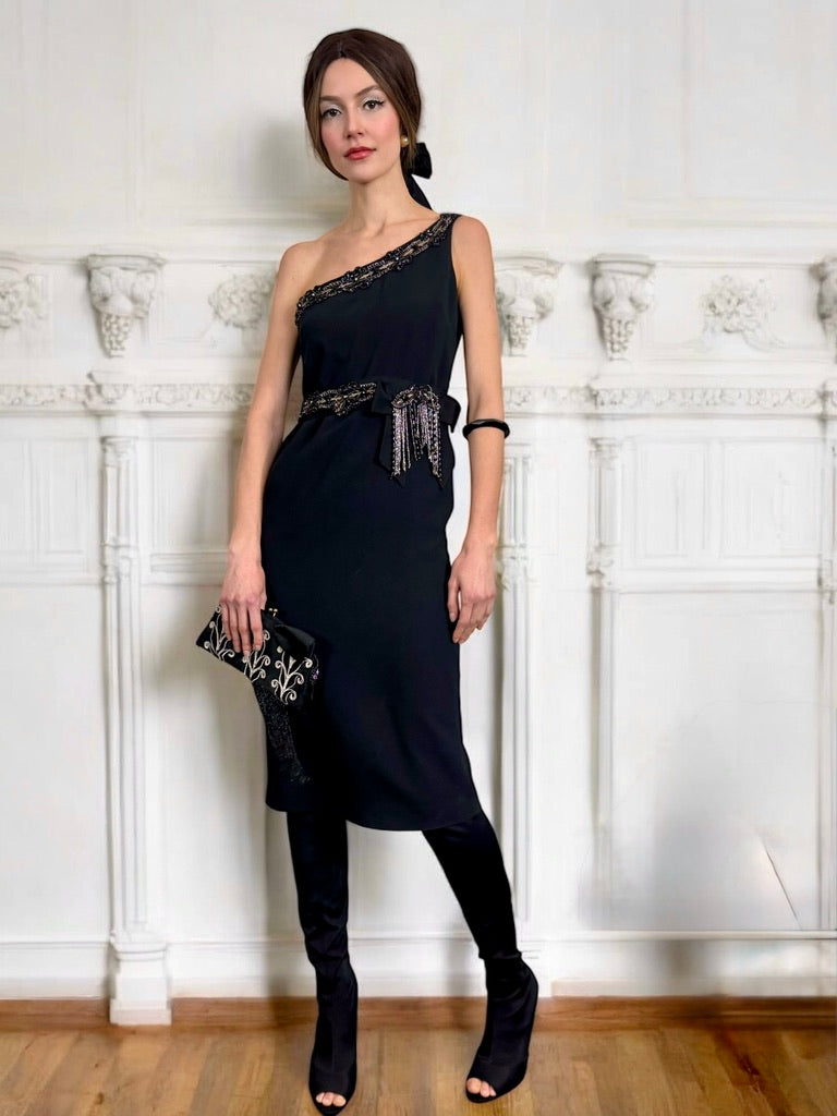 Experience timeless elegance with this chic Jane Atelier Dress embellished by One Vintage. This one shoulder design features a sleek pencil skirt silhouette and a belt detail for a flattering fit. Adorned with Victorian black jet and silver beading along the neckline and belt, featuring cascading fringing down the shoulder and bow. This dress is a flattering one-off classic reimagined.