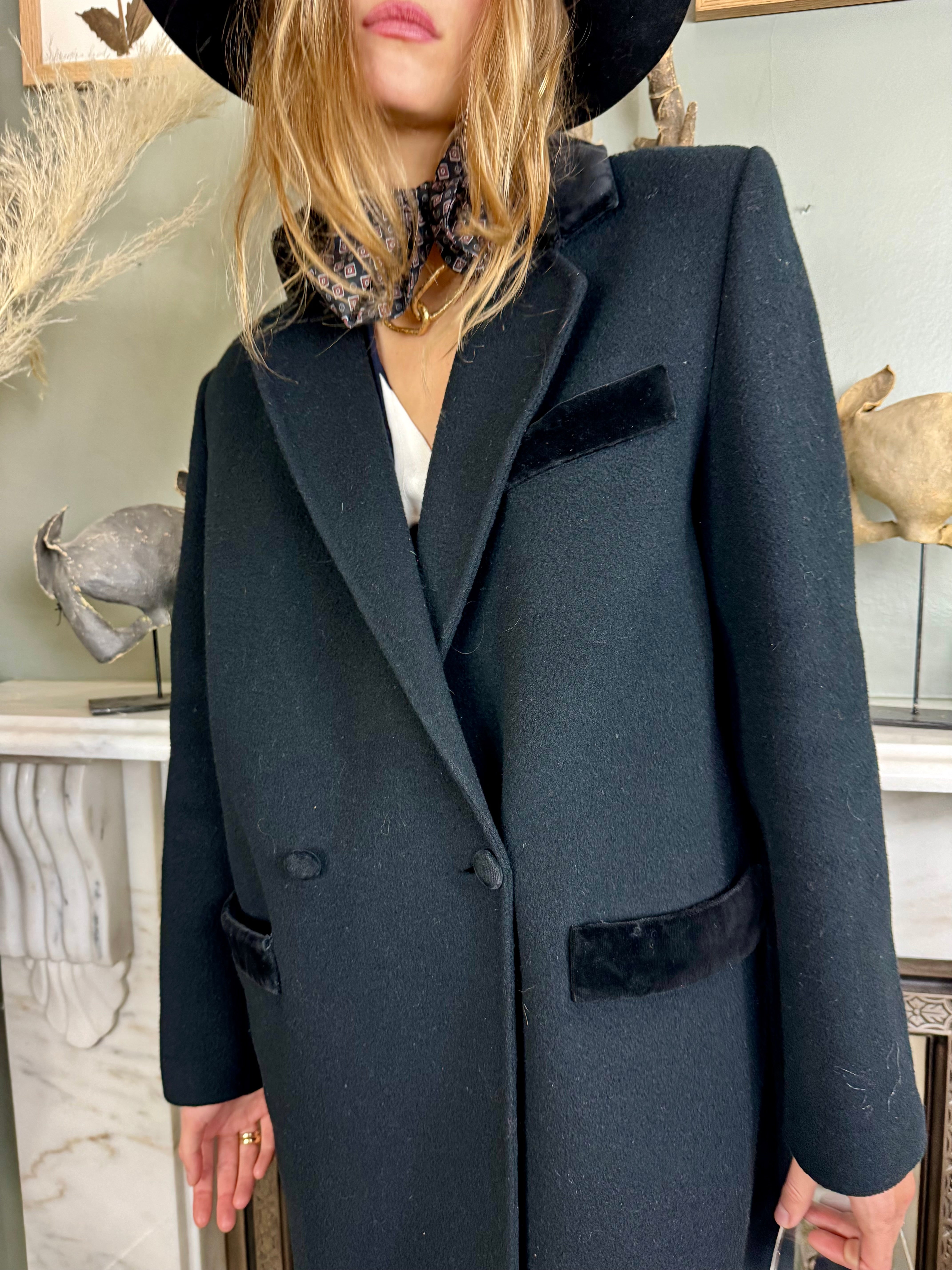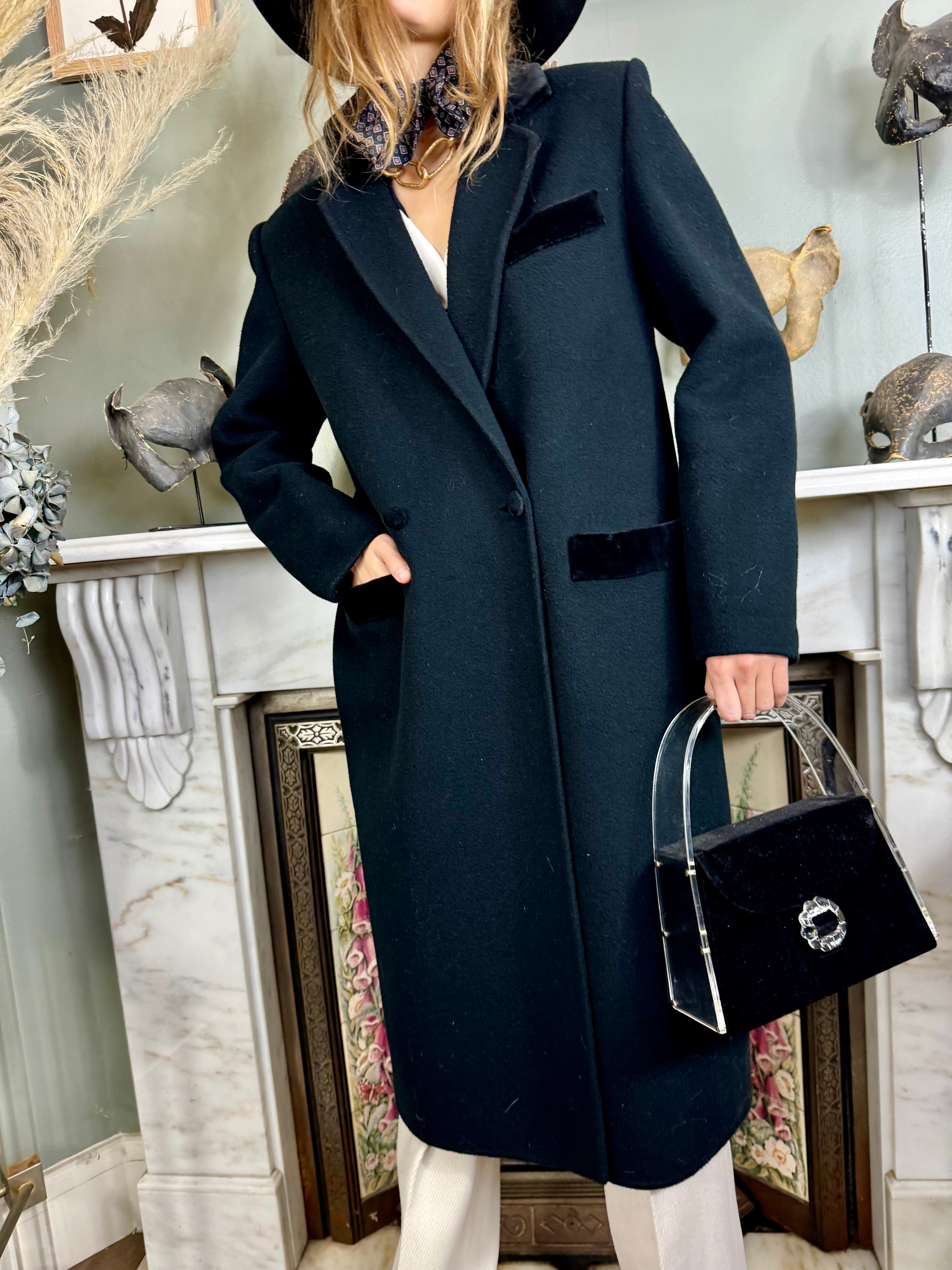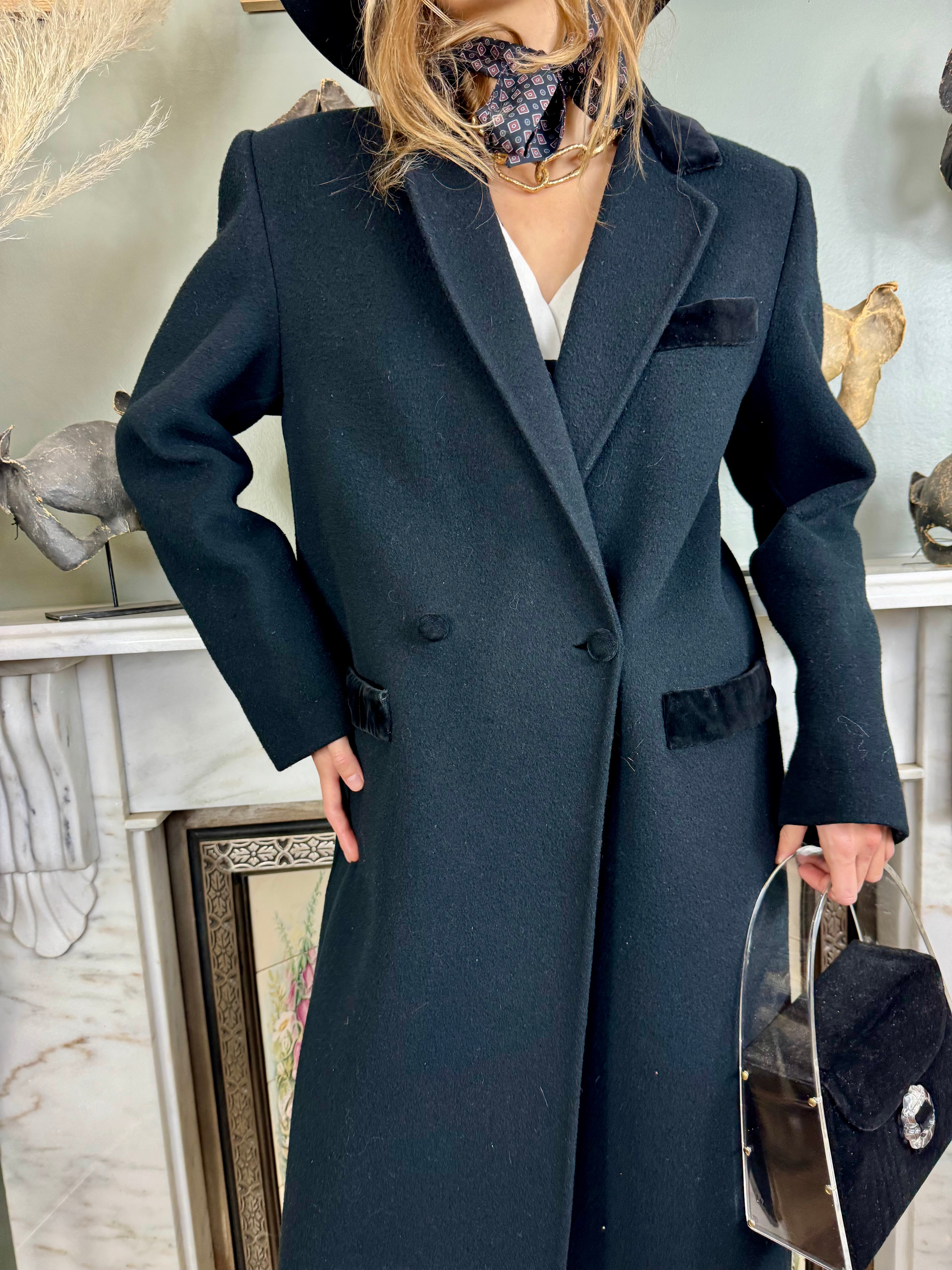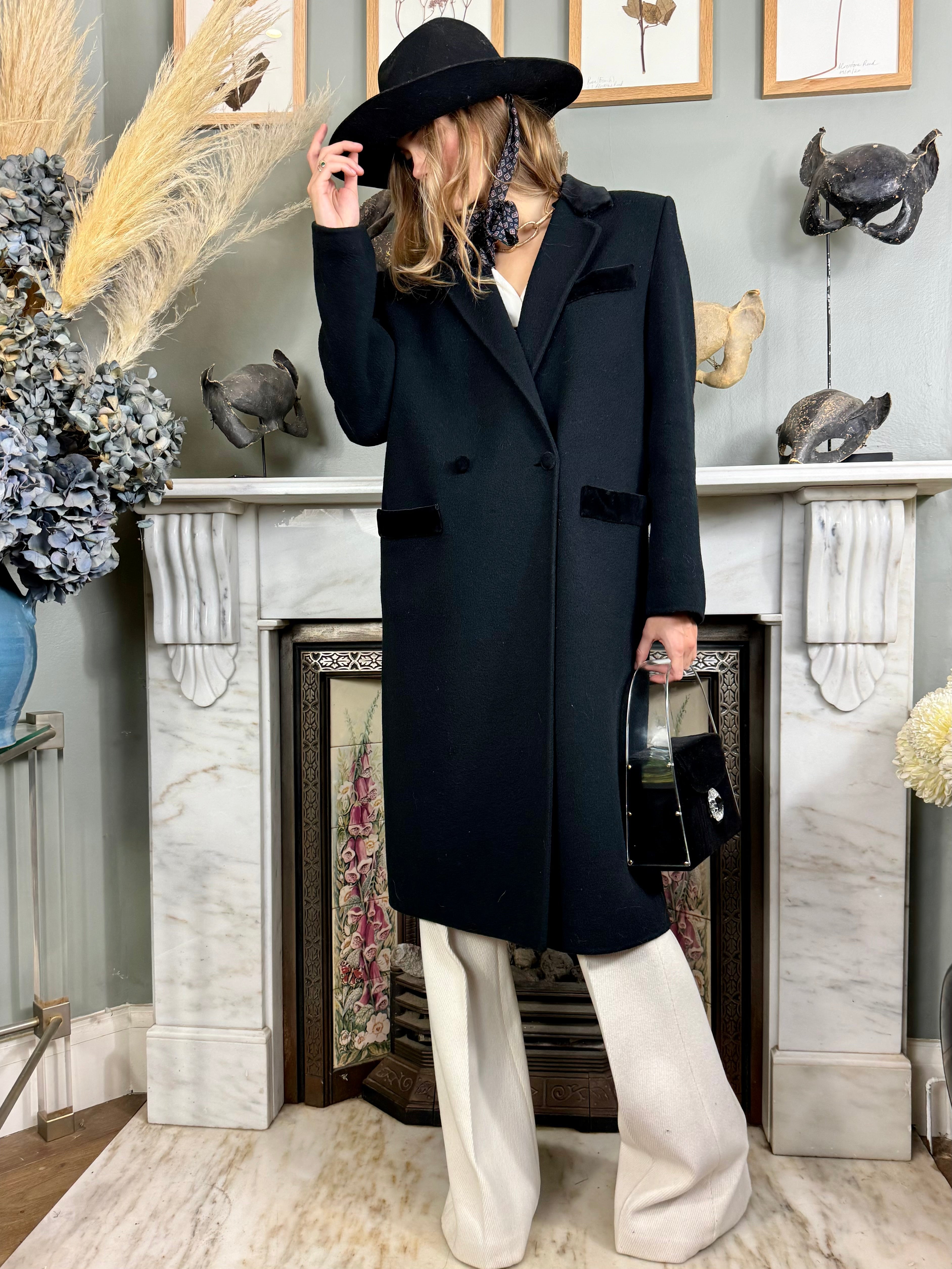 Indulge in timeless elegance with our Roula 80s black wool double breasted coat. Crafted with luxurious wool, this coat features velvet accents, long sleeves, and side pockets for added functionality.