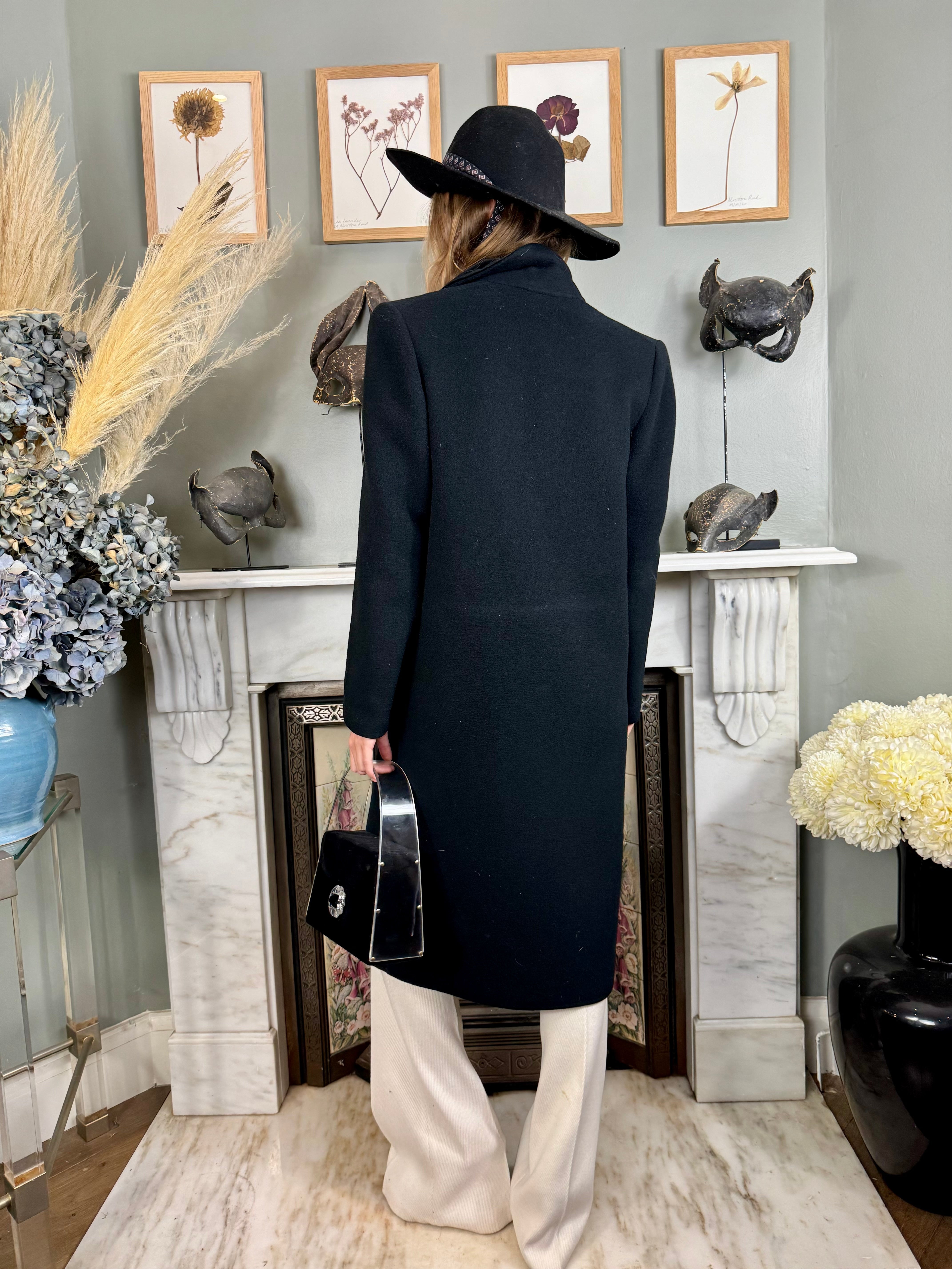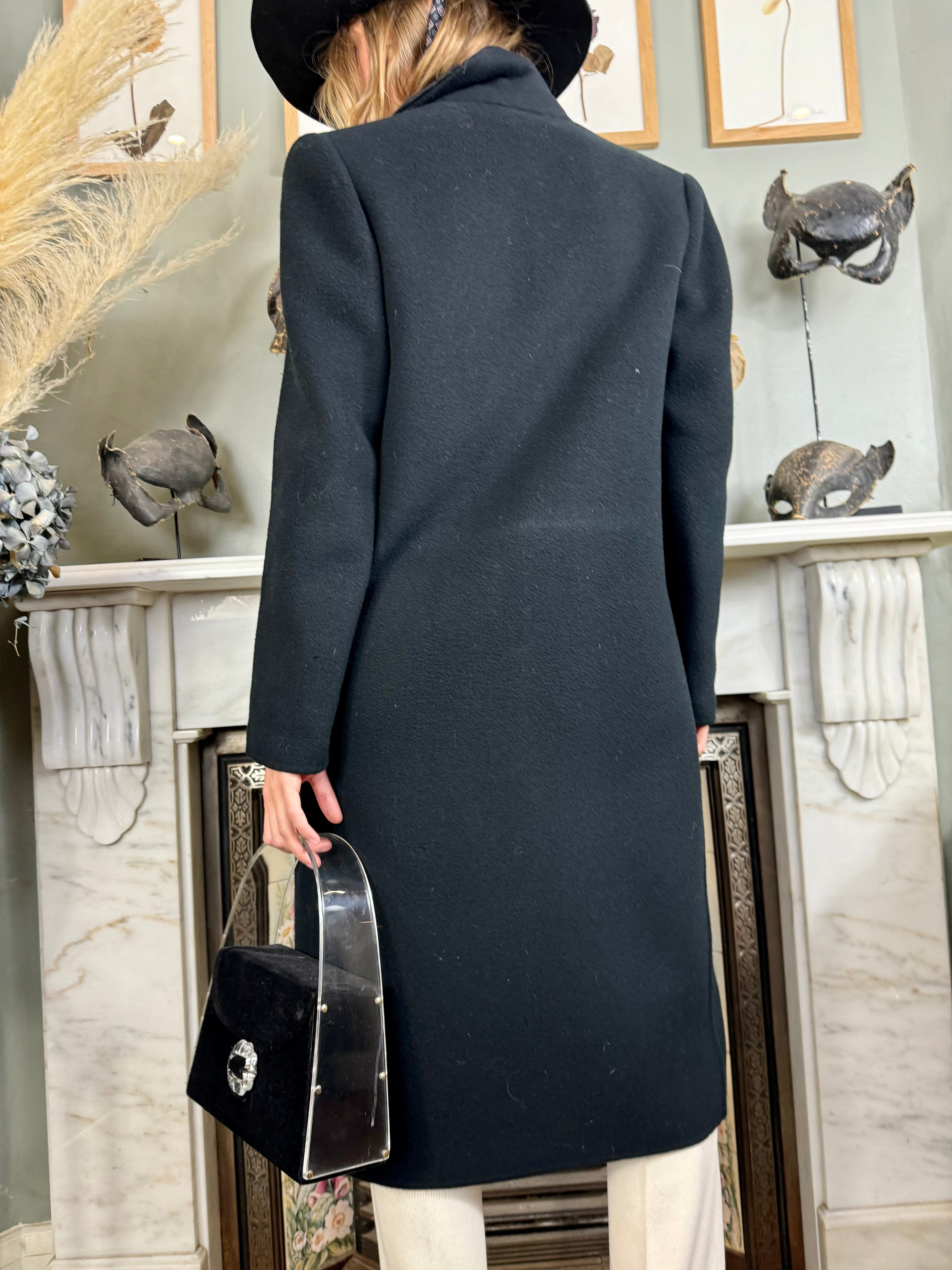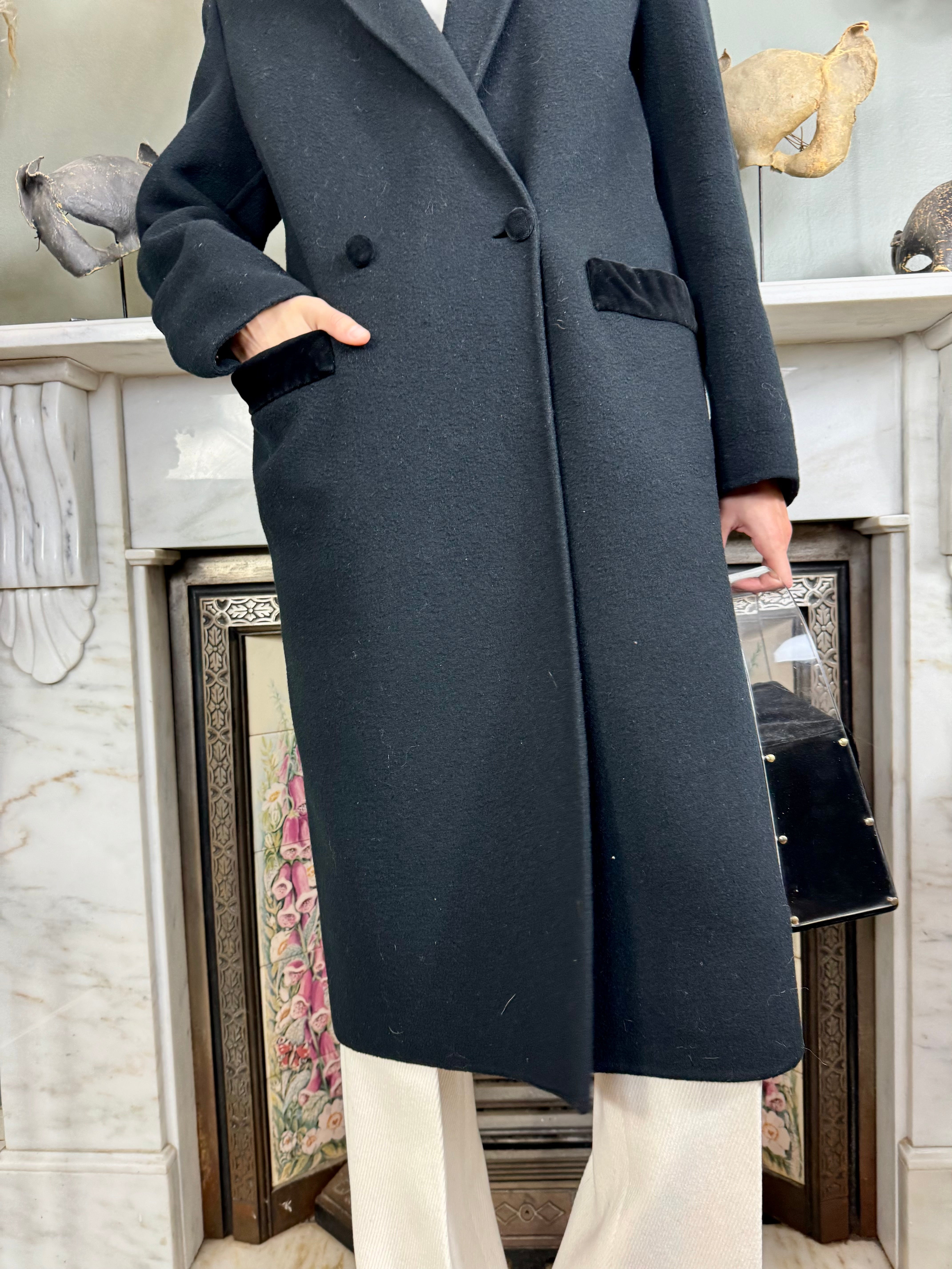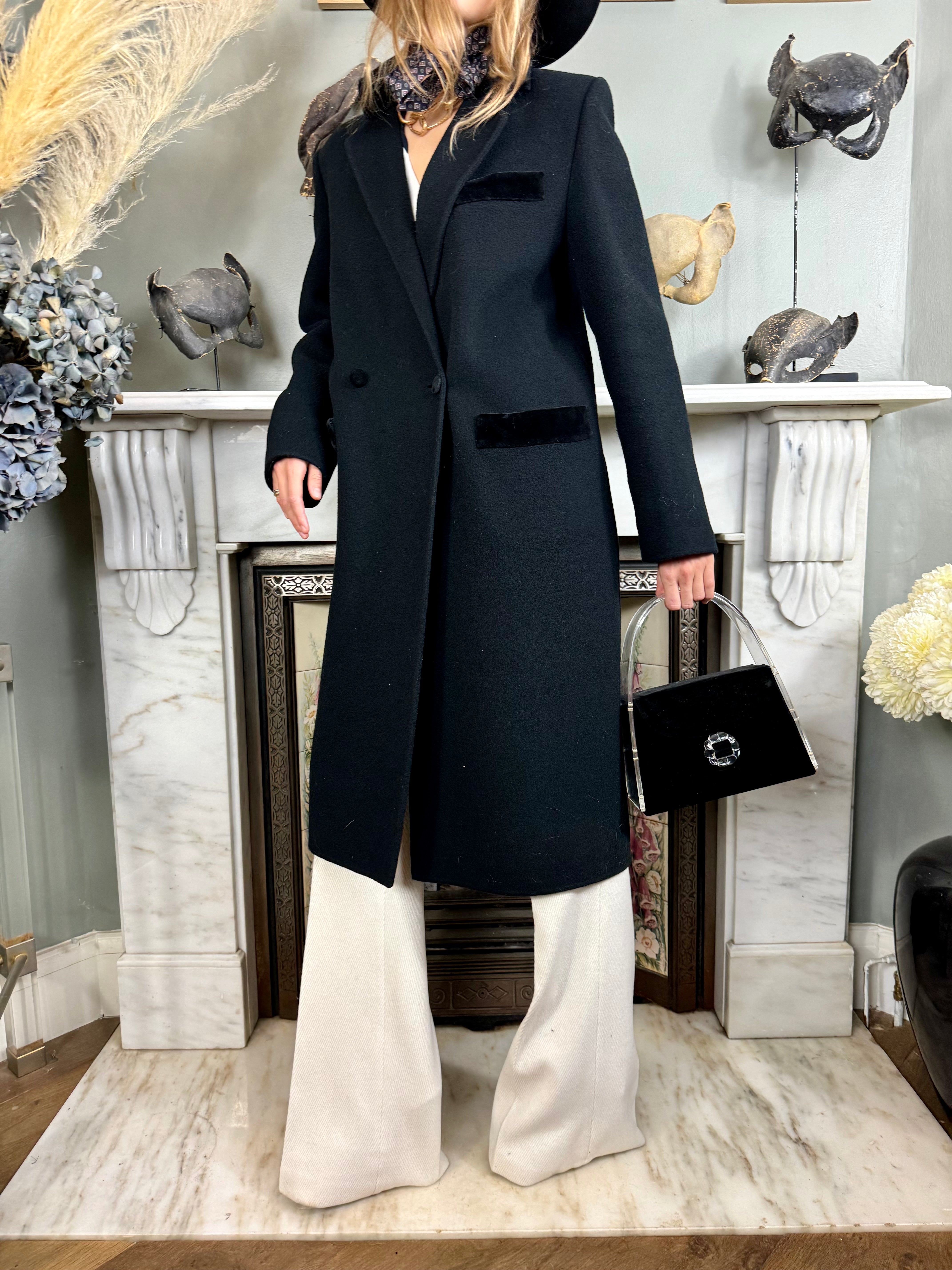 Indulge in timeless elegance with our Roula 80s black wool double breasted coat. Crafted with luxurious wool, this coat features velvet accents, long sleeves, and side pockets for added functionality.